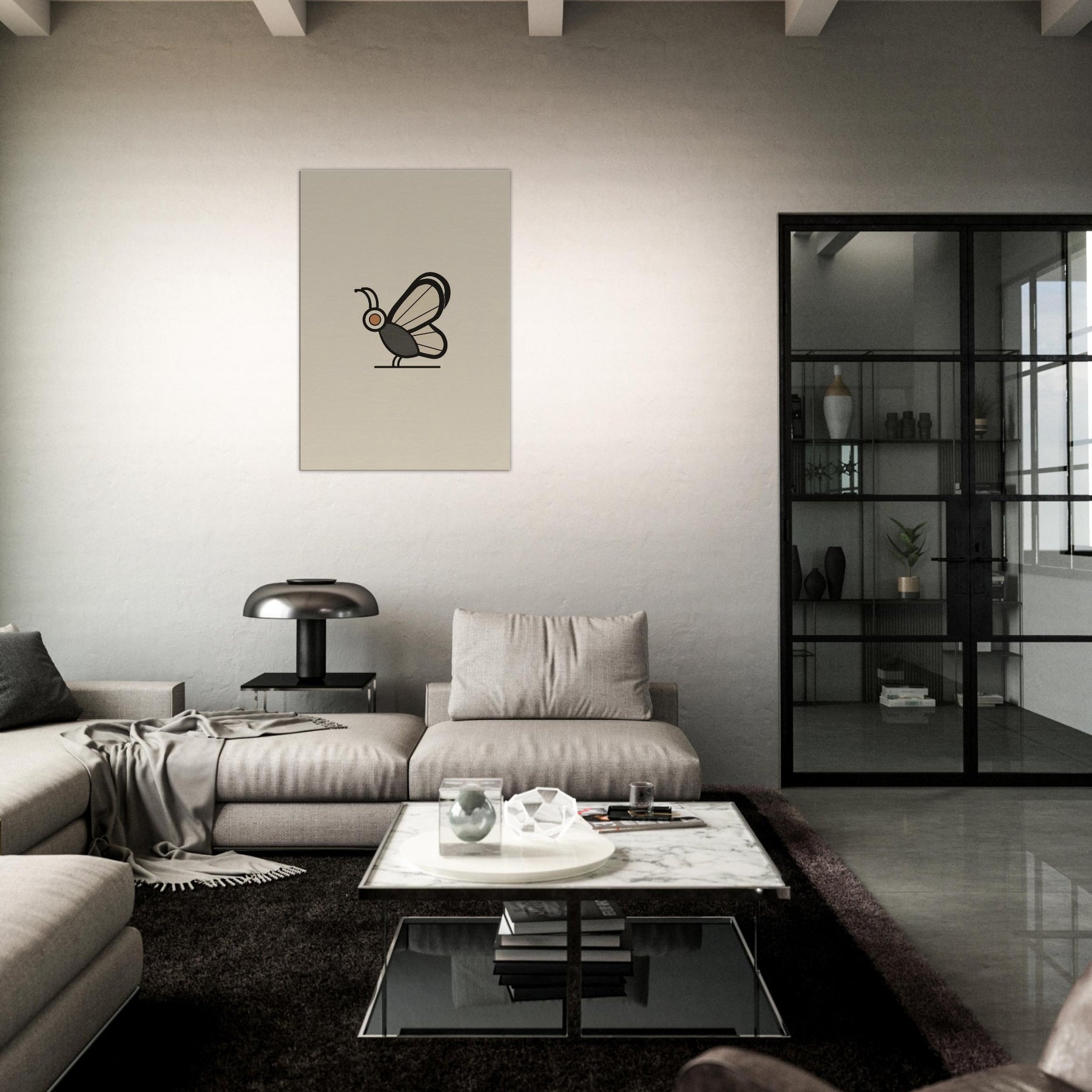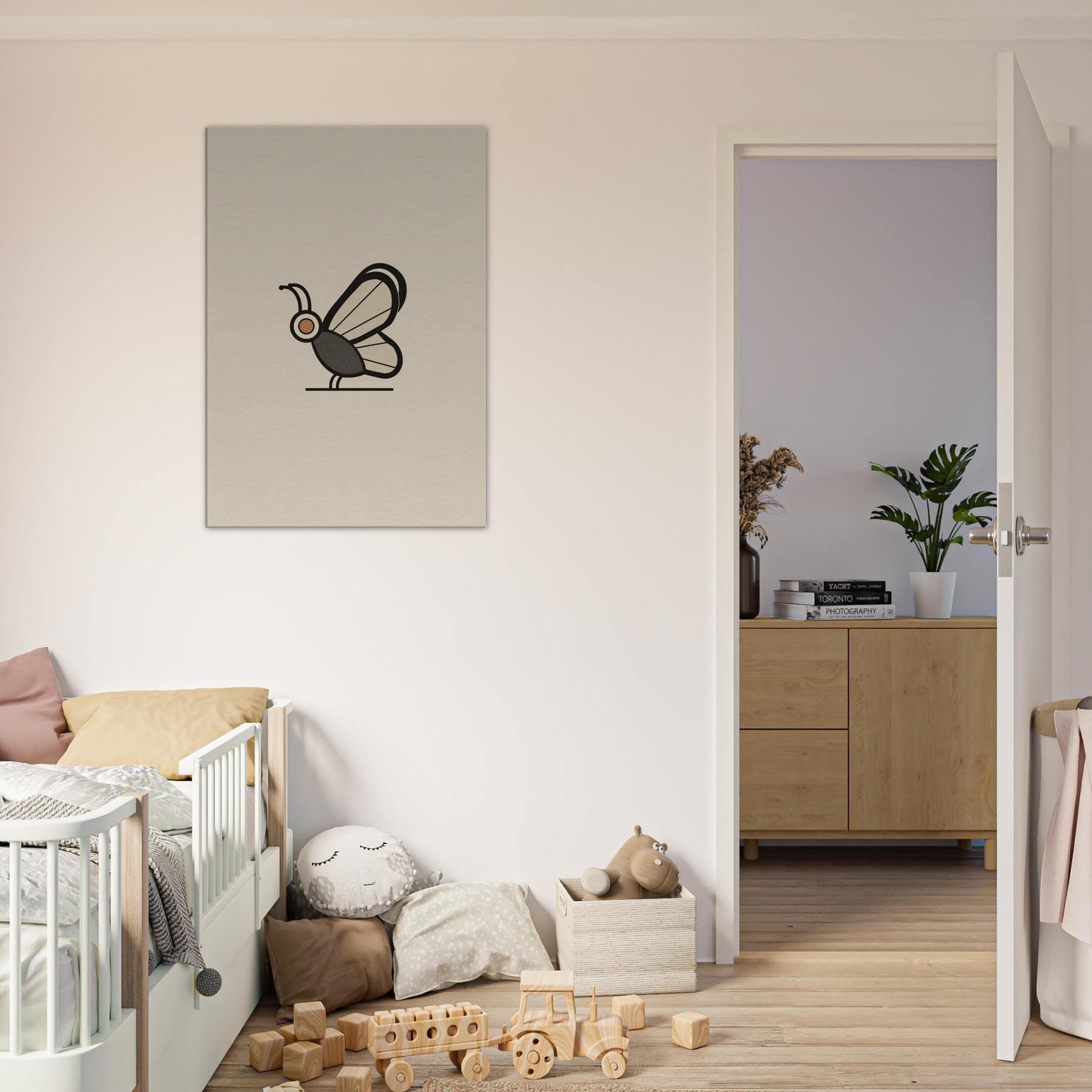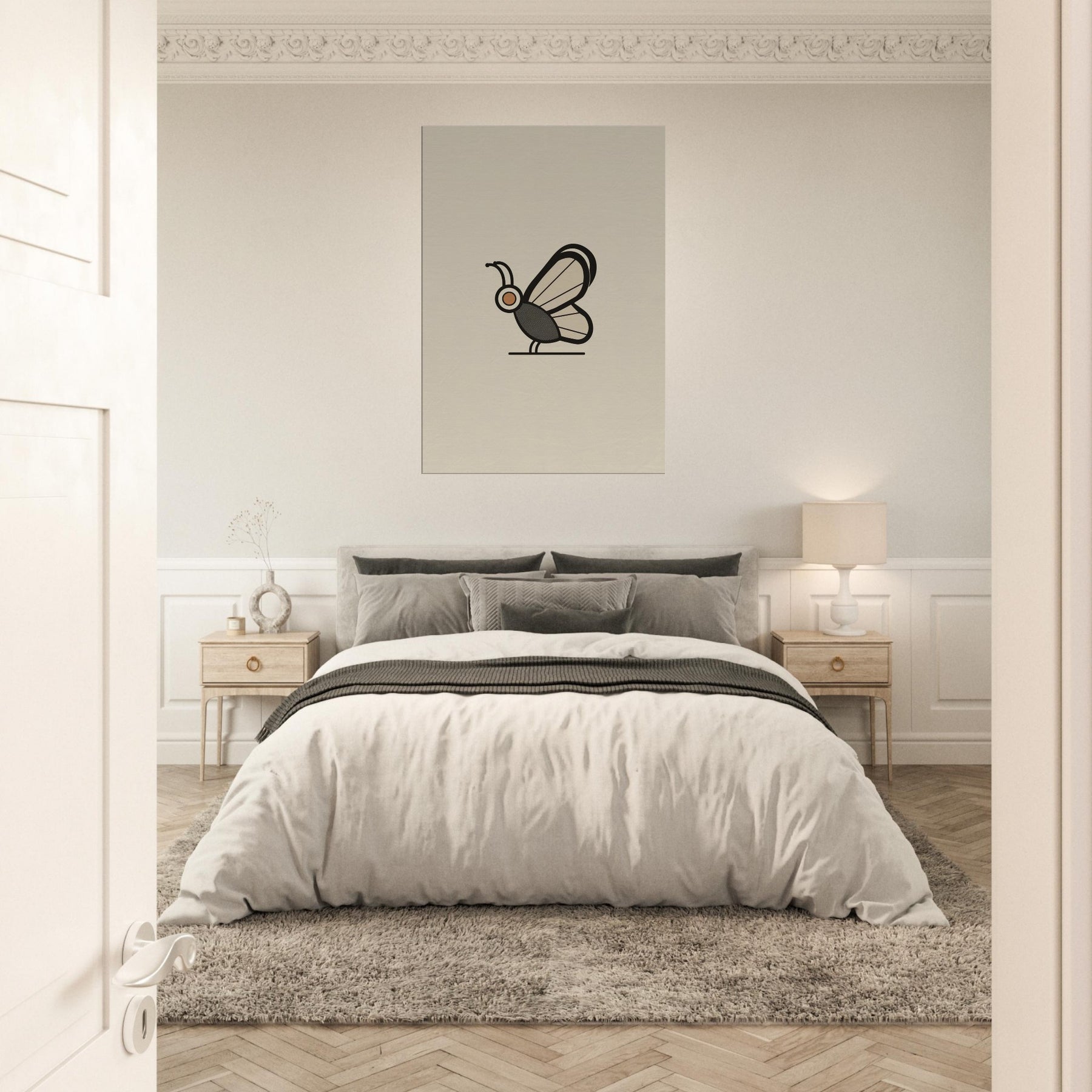 Butterfly becomes a quiet punctuation mark in a serene room. This minimalist study distills form into a single, confident line and a gentle palette that feels like dawn. The Butterfly, the primary subject, glides on still air, inviting contemplation without shouting. Soft light plays across the wall, turning daily spaces into calm sanctuaries. The restrained elegance pairs effortlessly with a range of interiors, from clean mid century to contemporary, enriching atmosphere with grace and restraint.