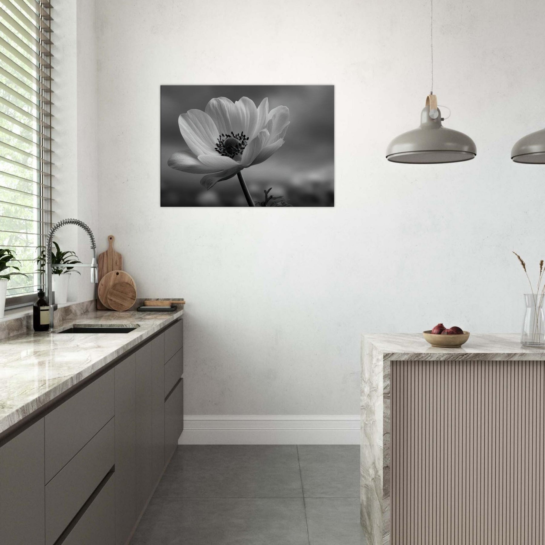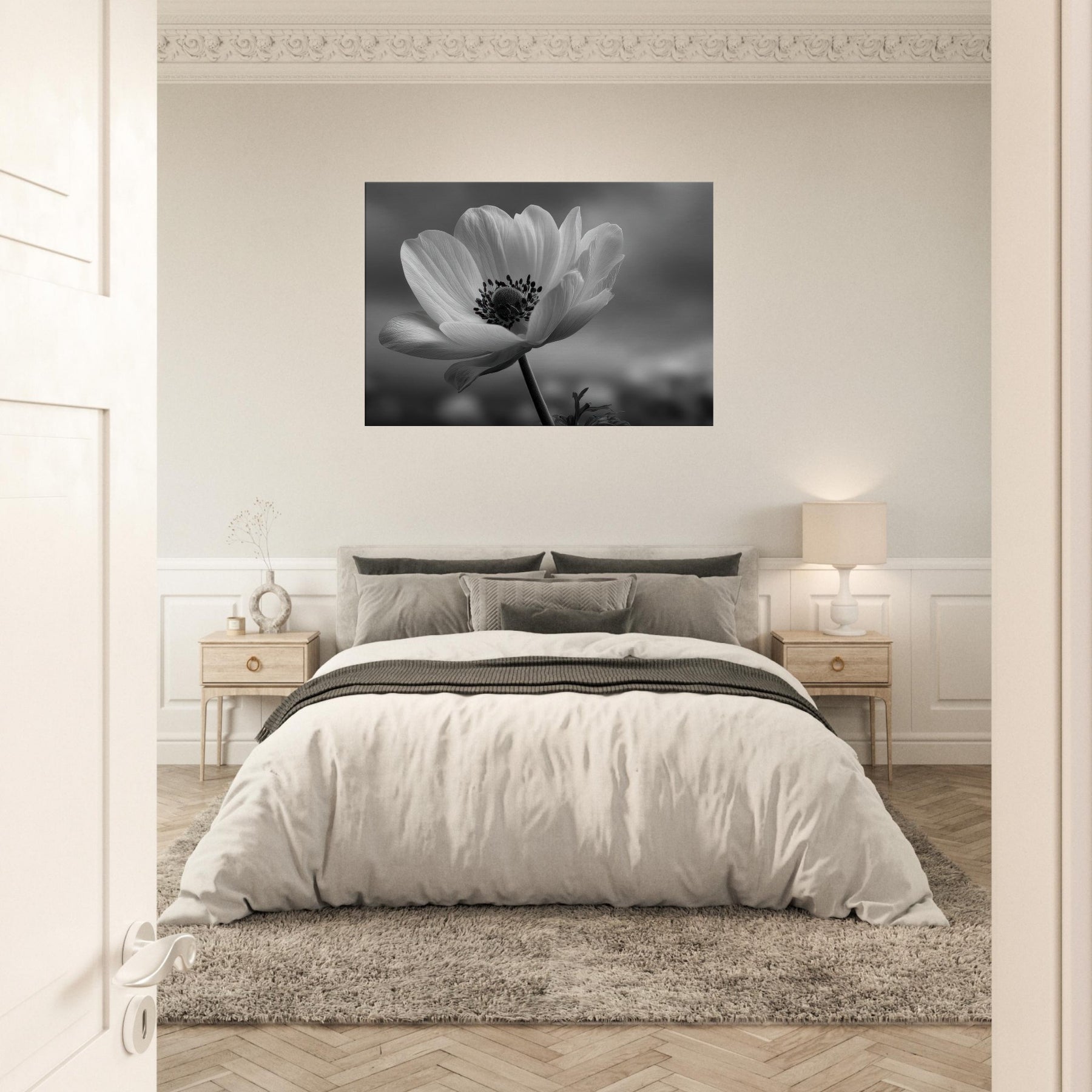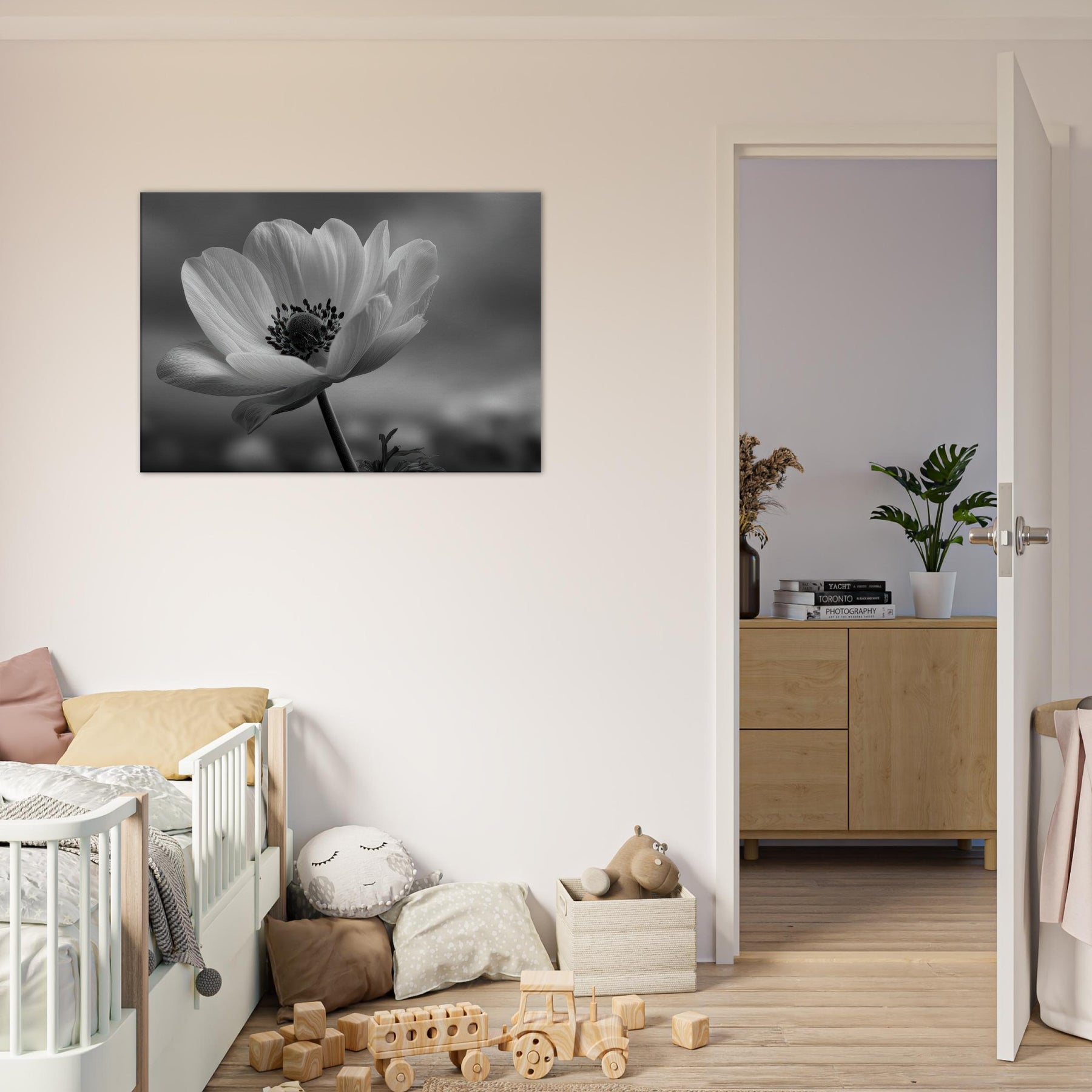 This black and white image brings restraint and elegance to any space, turning a wall into a window of stillness. Place it above a sofa or in a corridor to summon gentleness that harmonizes with metal, wood, and glass. A timeless focal point that elevates the mood and atmosphere of everyday living.