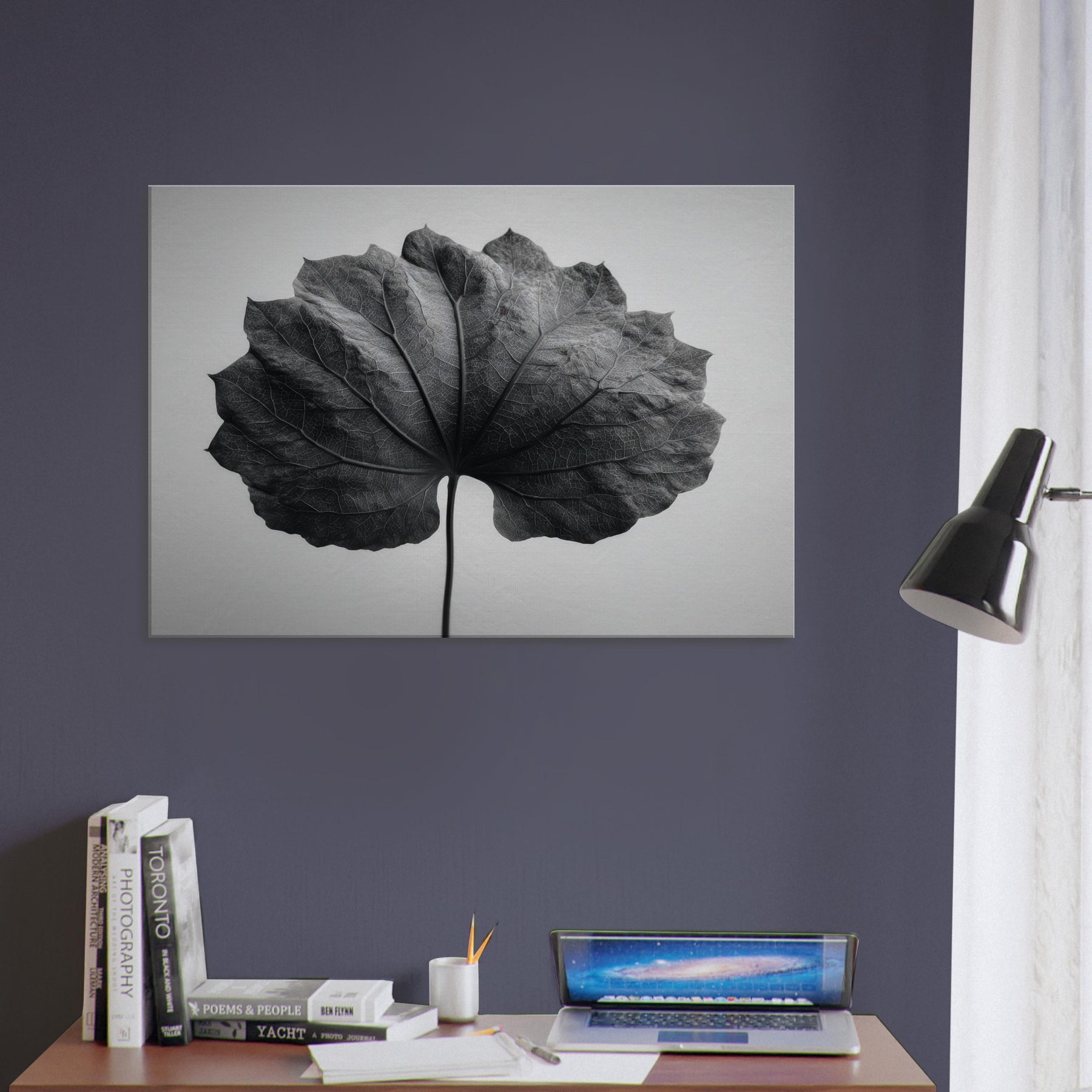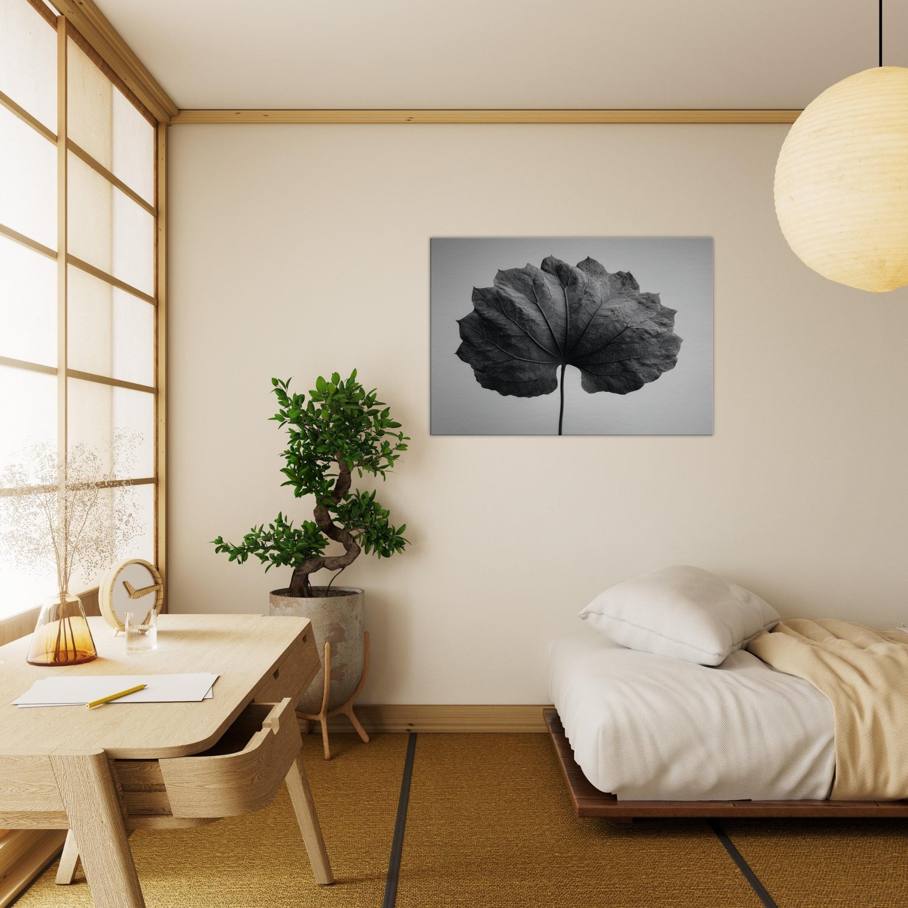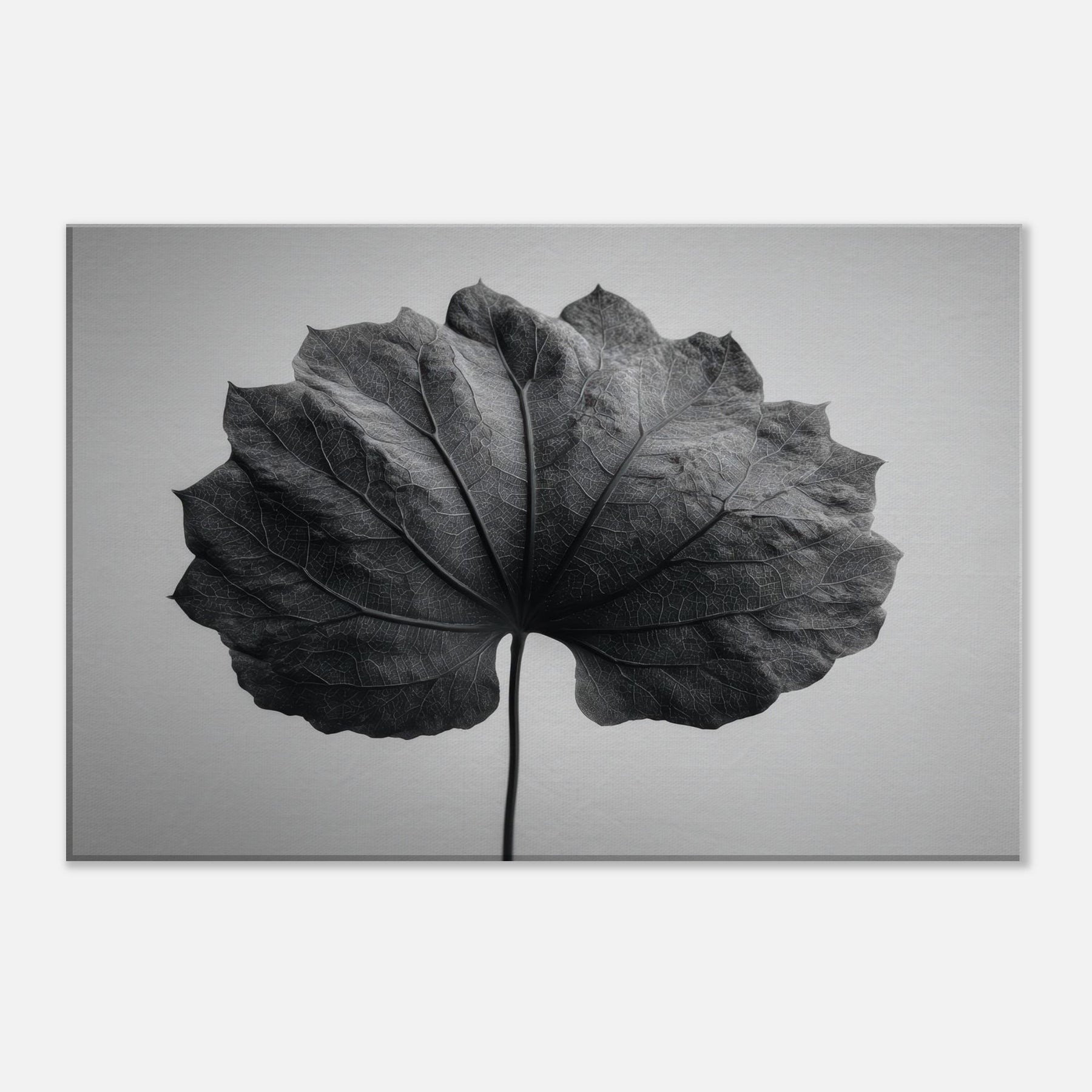 Bathed in stark black and white, this Bodhi Leaf invites a quiet, meditative presence to any room. The delicate veins become a cathedral of light and shadow, drawing the eye along a single, patient spine. It exudes a mystical calm that softens sharp edges and echoes across clean surfaces, turning a wall into a mist of contemplation. Perfect above a sofa, in a hallway nook, or beside a desk, it anchors a serene, attentive mood without overpowering the space.