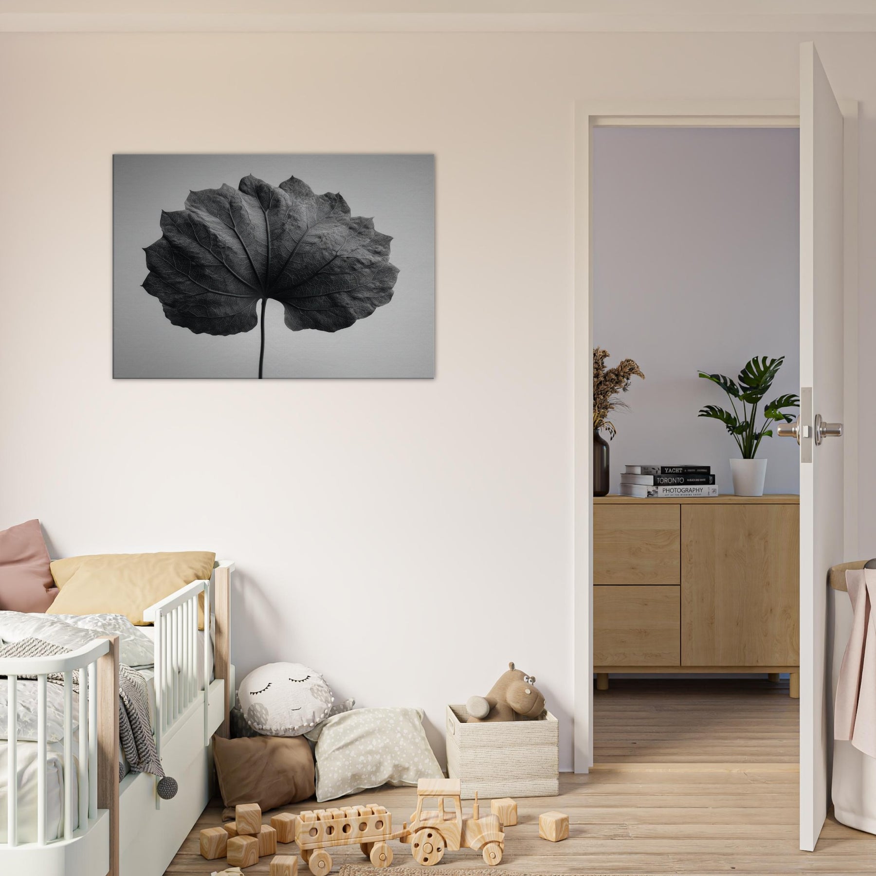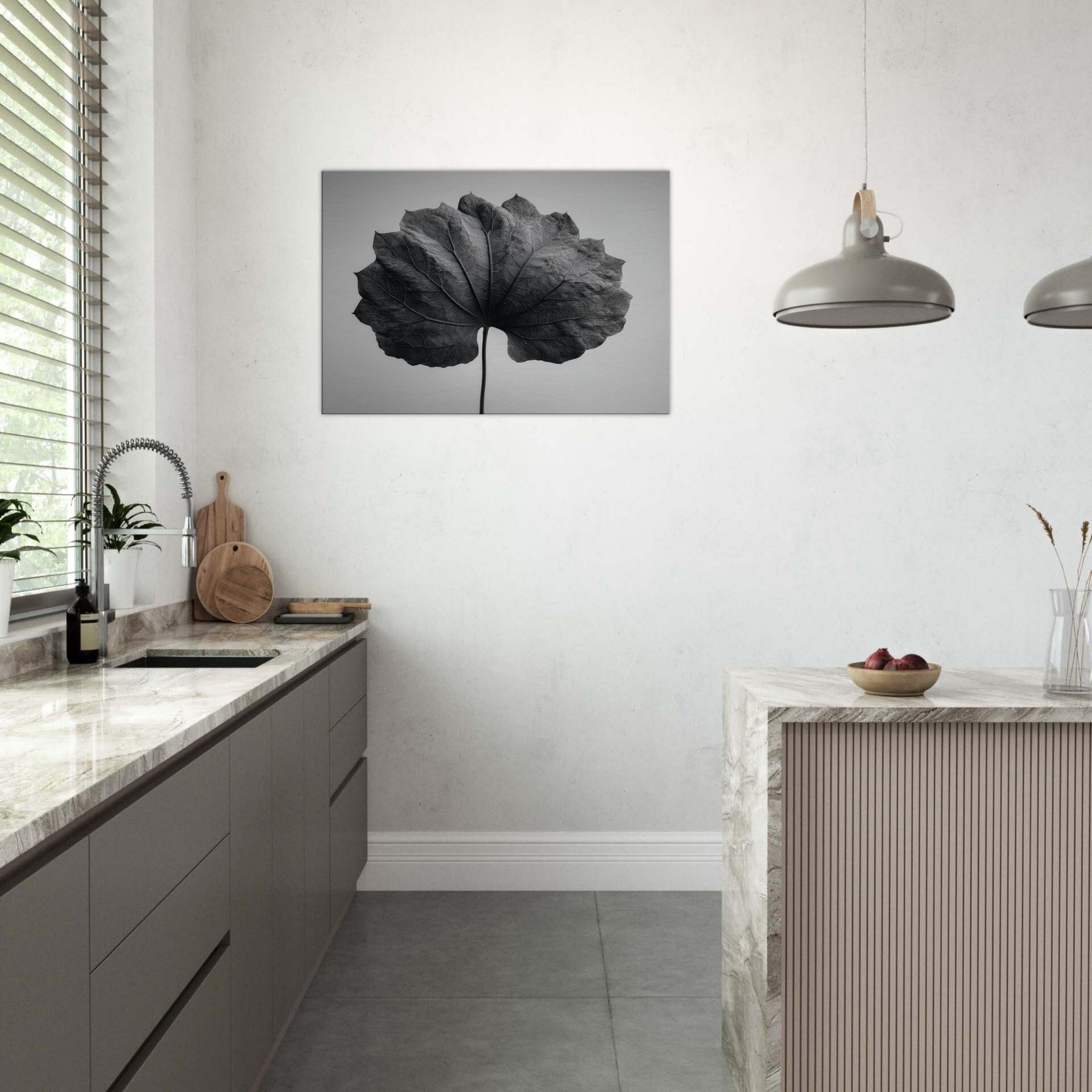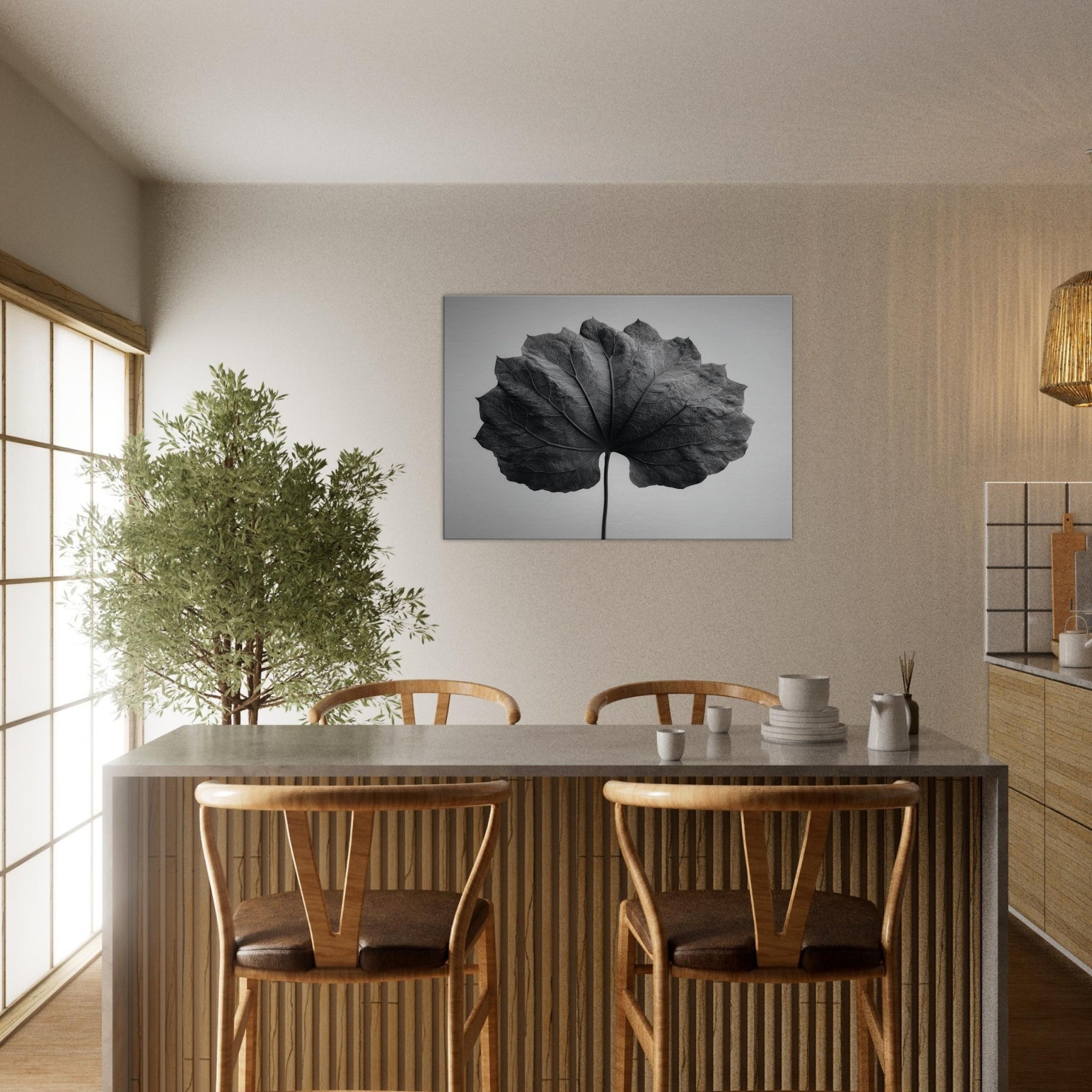 Bathed in stark black and white, this Bodhi Leaf invites a quiet, meditative presence to any room. The delicate veins become a cathedral of light and shadow, drawing the eye along a single, patient spine. It exudes a mystical calm that softens sharp edges and echoes across clean surfaces, turning a wall into a mist of contemplation. Perfect above a sofa, in a hallway nook, or beside a desk, it anchors a serene, attentive mood without overpowering the space.