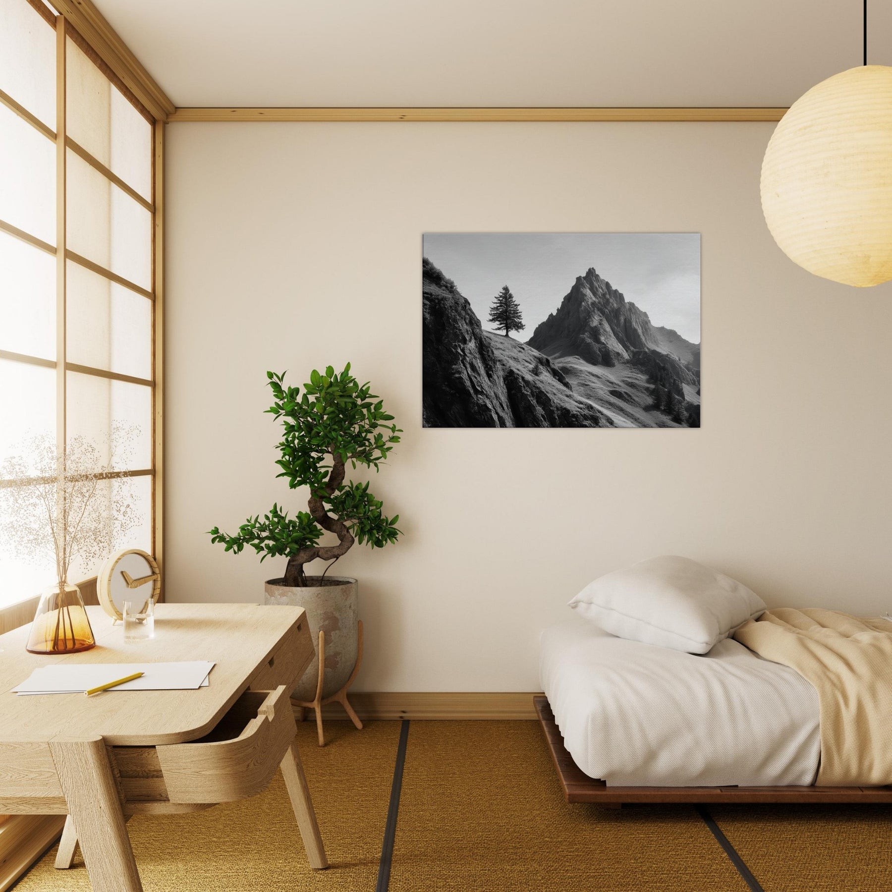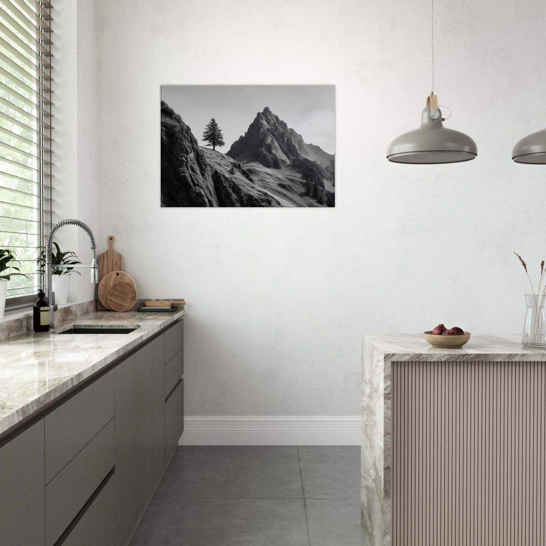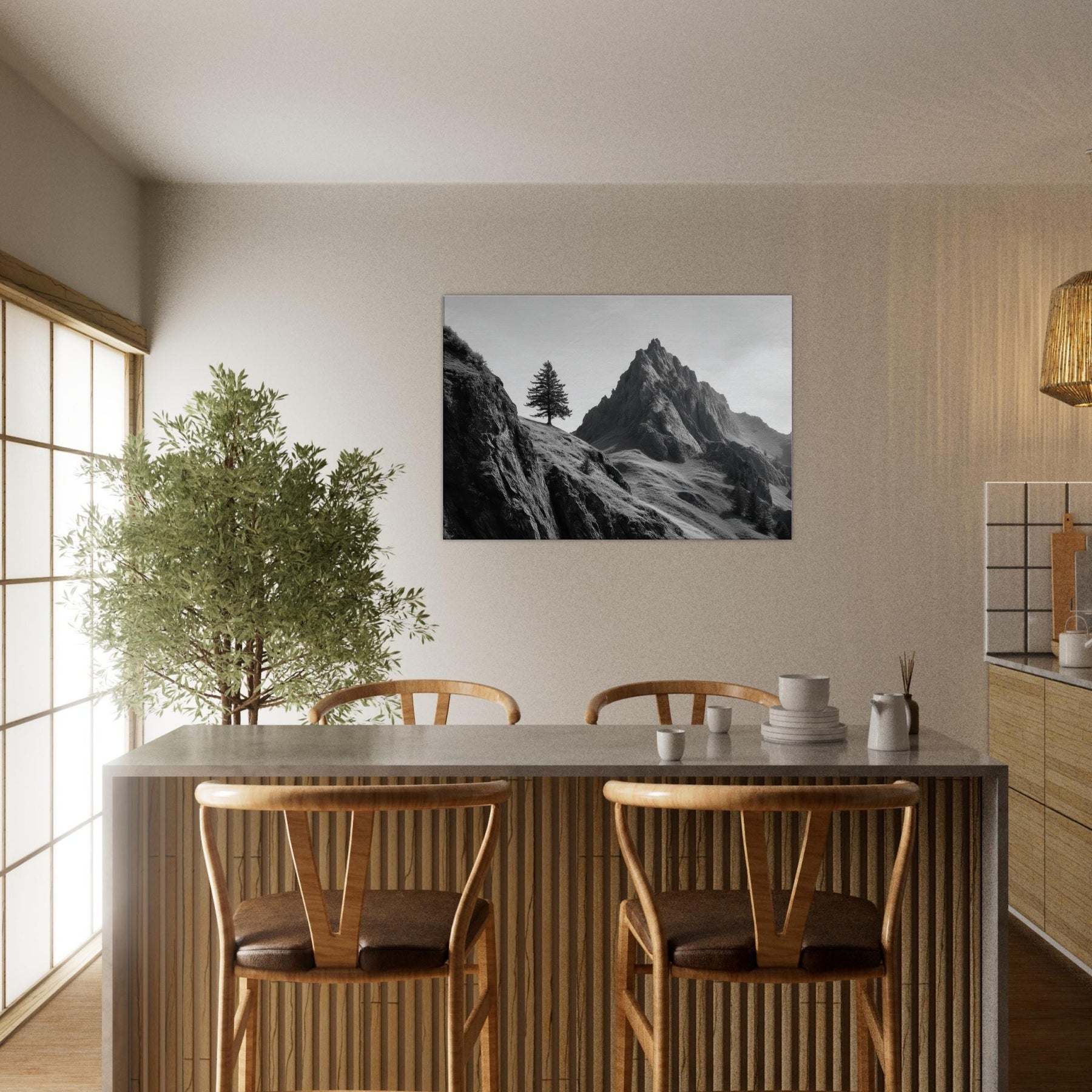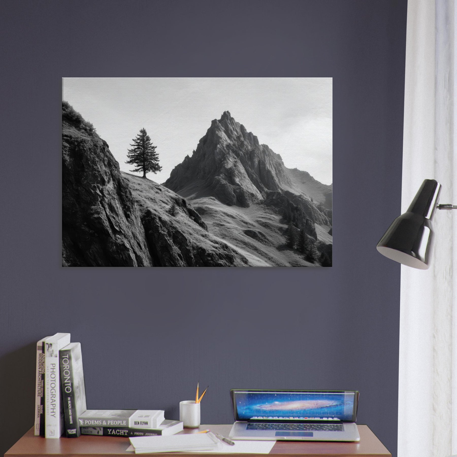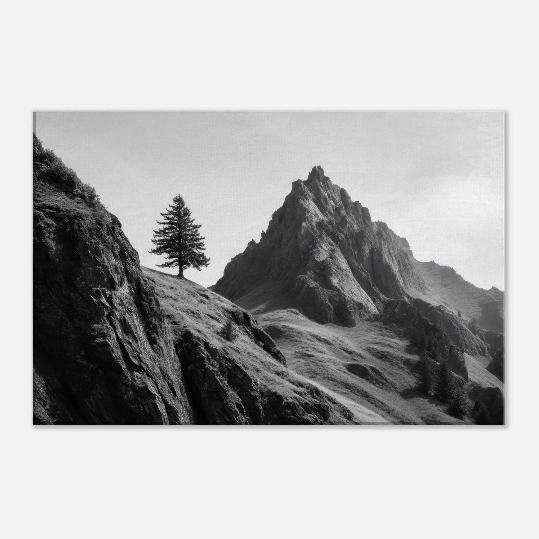 On this stark ascent, a lone tree clings to a windswept slope beside towering cliffs, captured in luminous grayscale.