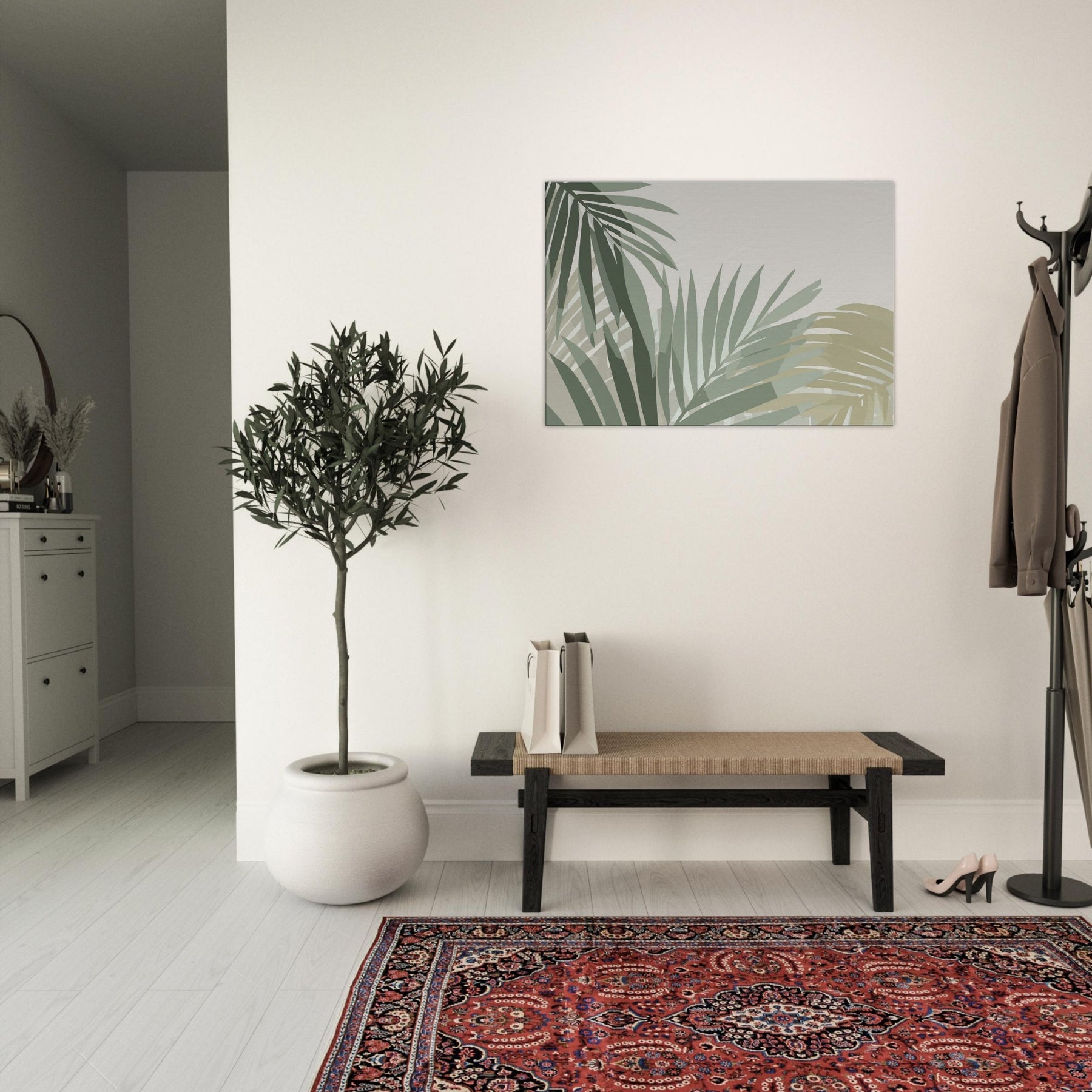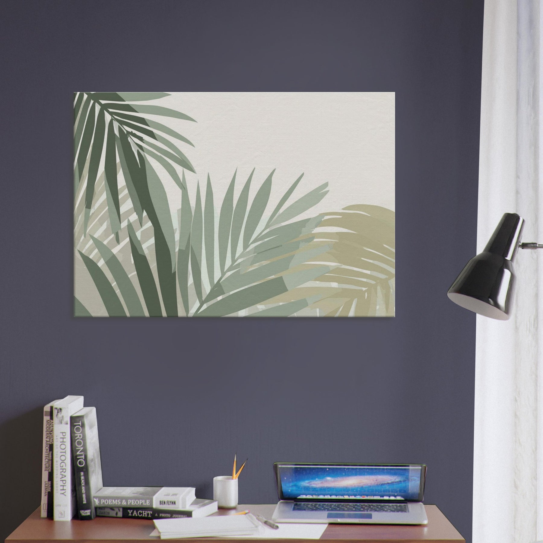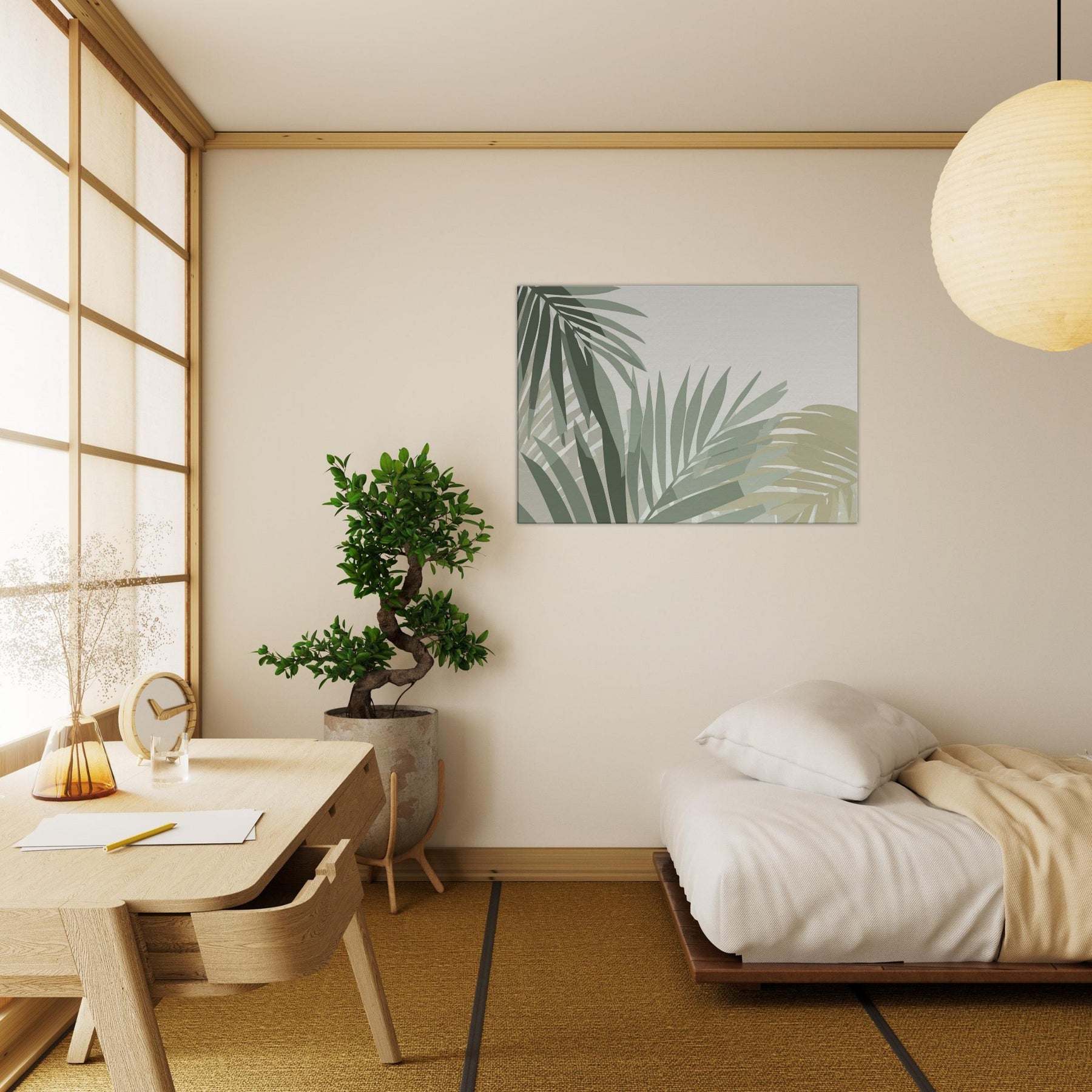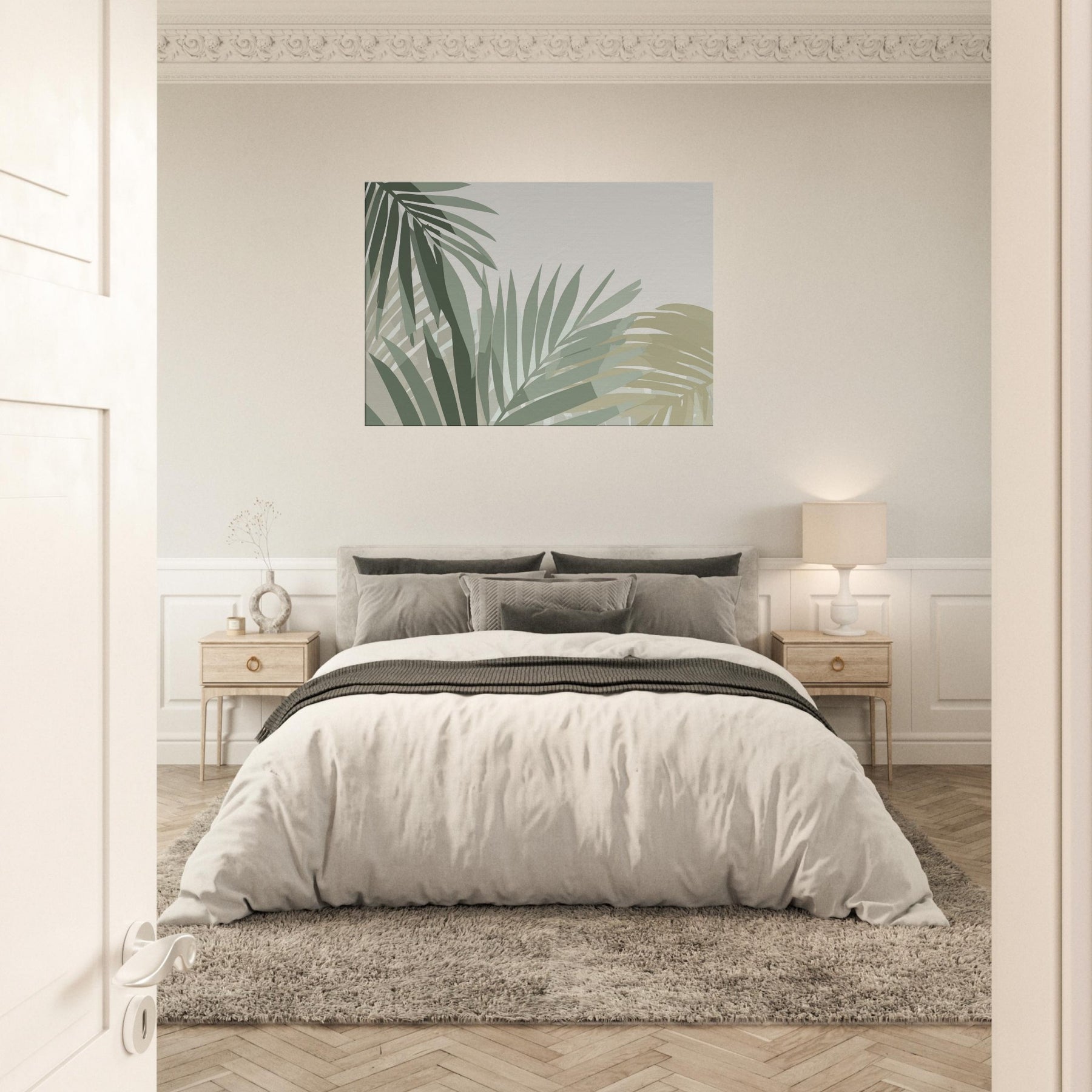 An understated meditation in light and form, this piece explores the quiet elegance of Palm Leaves through soft, overlapping silhouettes. The gentle palette sage, seafoam, and sand evokes early morning light and the hush of a sunlit terrace. With its minimalist composition, it invites breath and balance into a living room or bedroom, adding a breathable calm that pairs with linen textures and natural wood. Hang it where you want space to breathe, and let the Palm Leaves inspire subtle, everyday serenity.