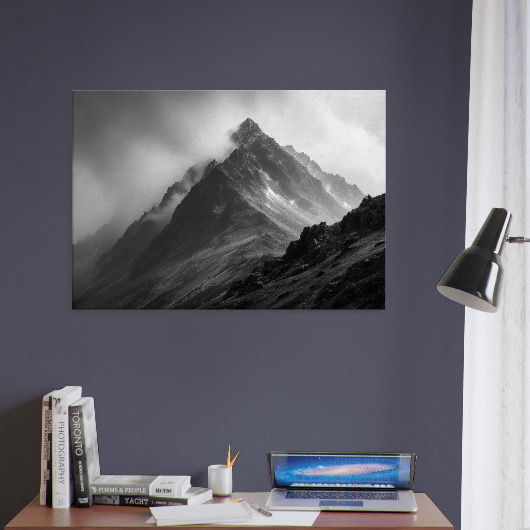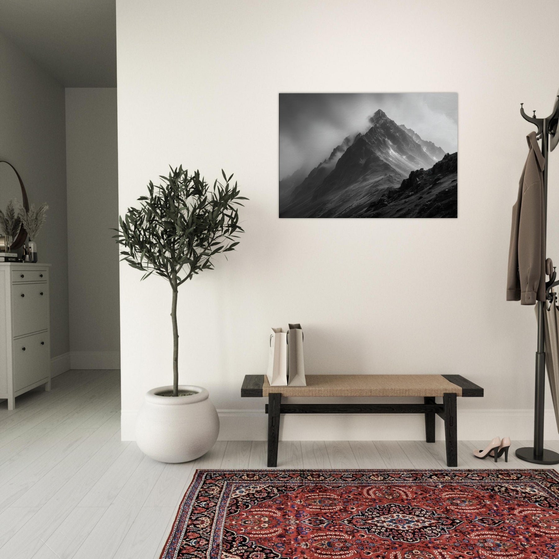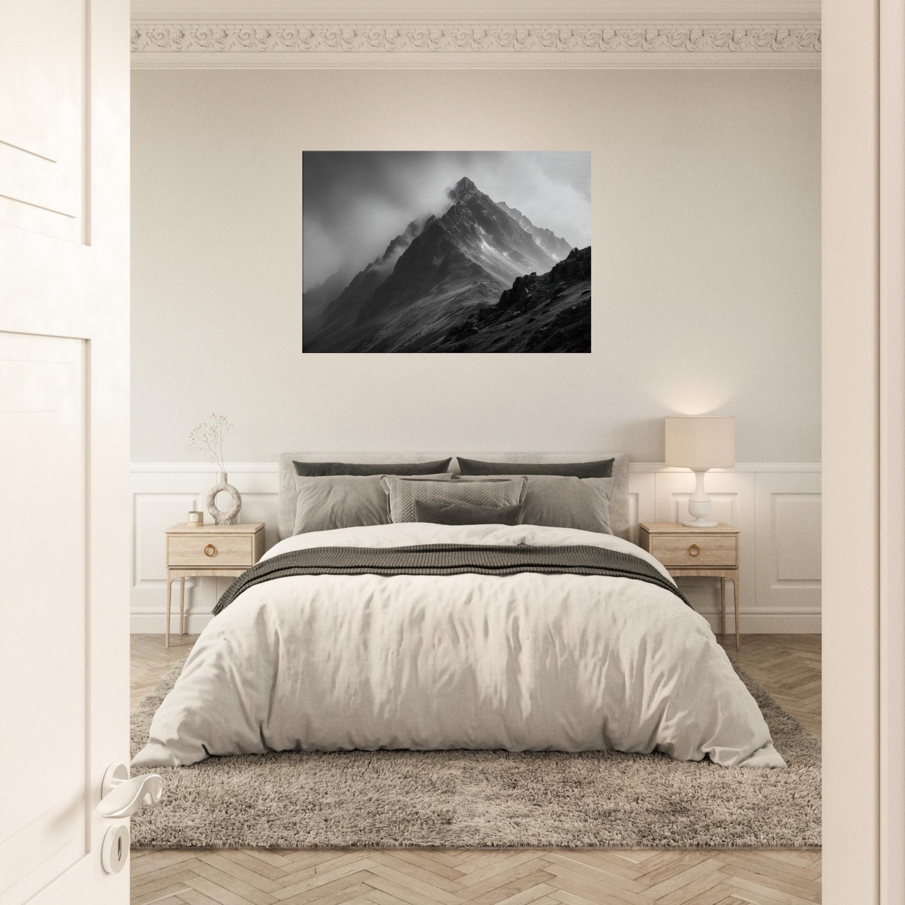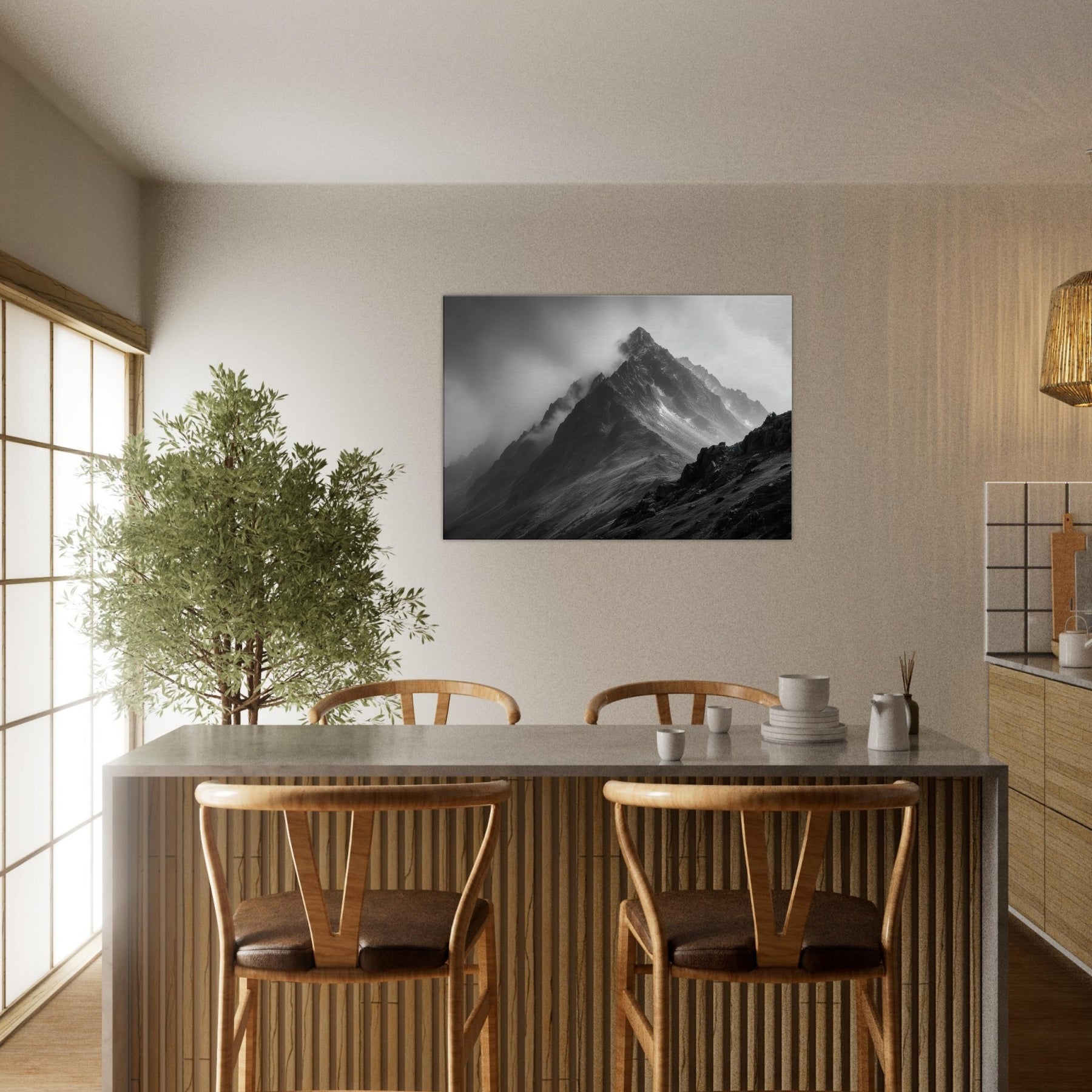 An arresting black and white portrayal of mountains rising through mist, this wall art invites quiet reflection. The stark contrast and softened textures evoke wind, shadow, and drifting clouds, wrapping a room in calm drama. Perfect for a living room, study, or entryway, it anchors seating with a natural focal point and effortlessly complements modern decor. The Mountains become a timeless backdrop for everyday moments and thoughtful conversation, a serene, cinematic accent that heightens atmosphere without overpowering the space.
