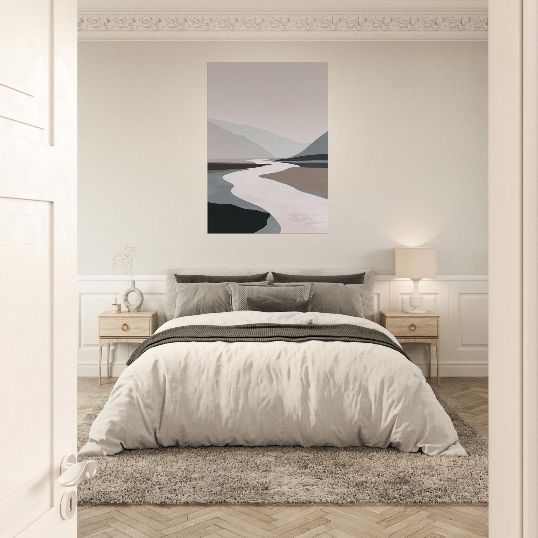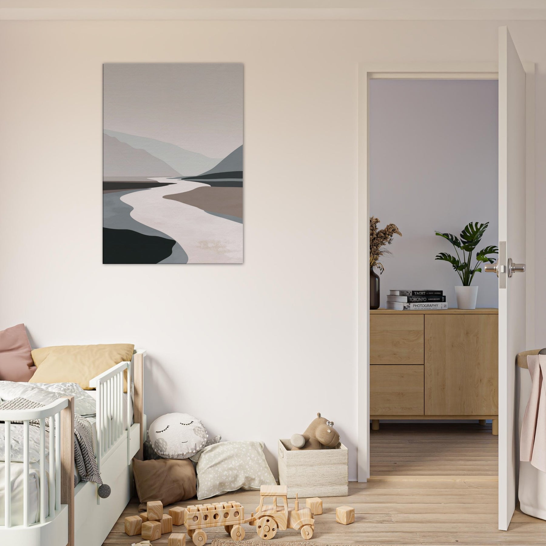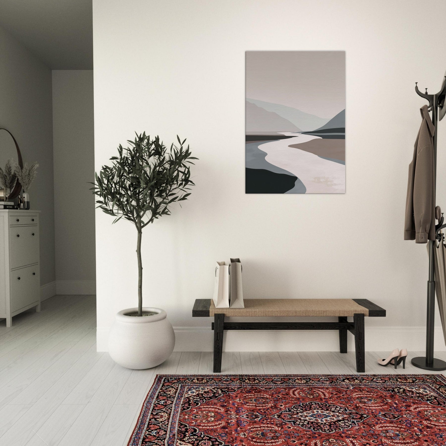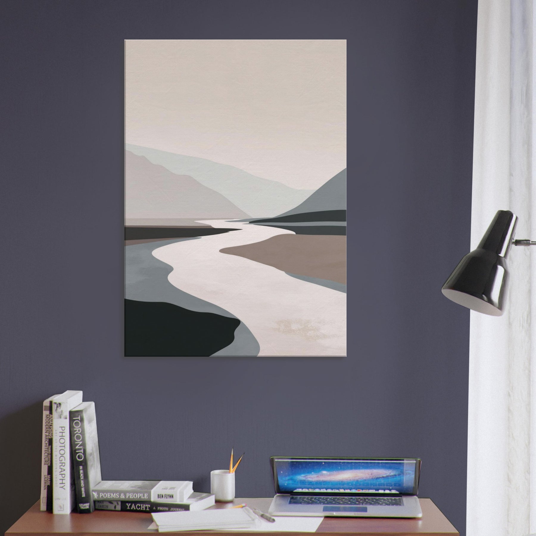Immerse your room in a quiet where the River becomes a meditative accent. This minimalist composition reveals the power of restraint: a whispered palette of sand, slate, and pale rose that glides along the canvas like light on water. The soft, curving river breaks the stillness with gentle rhythm, inviting contemplation without overpowering the room. Hang it to create a serene focal point a subtle, everyday escape that enhances living spaces with calm, clarity, and a touch of nature’s expansive horizon.