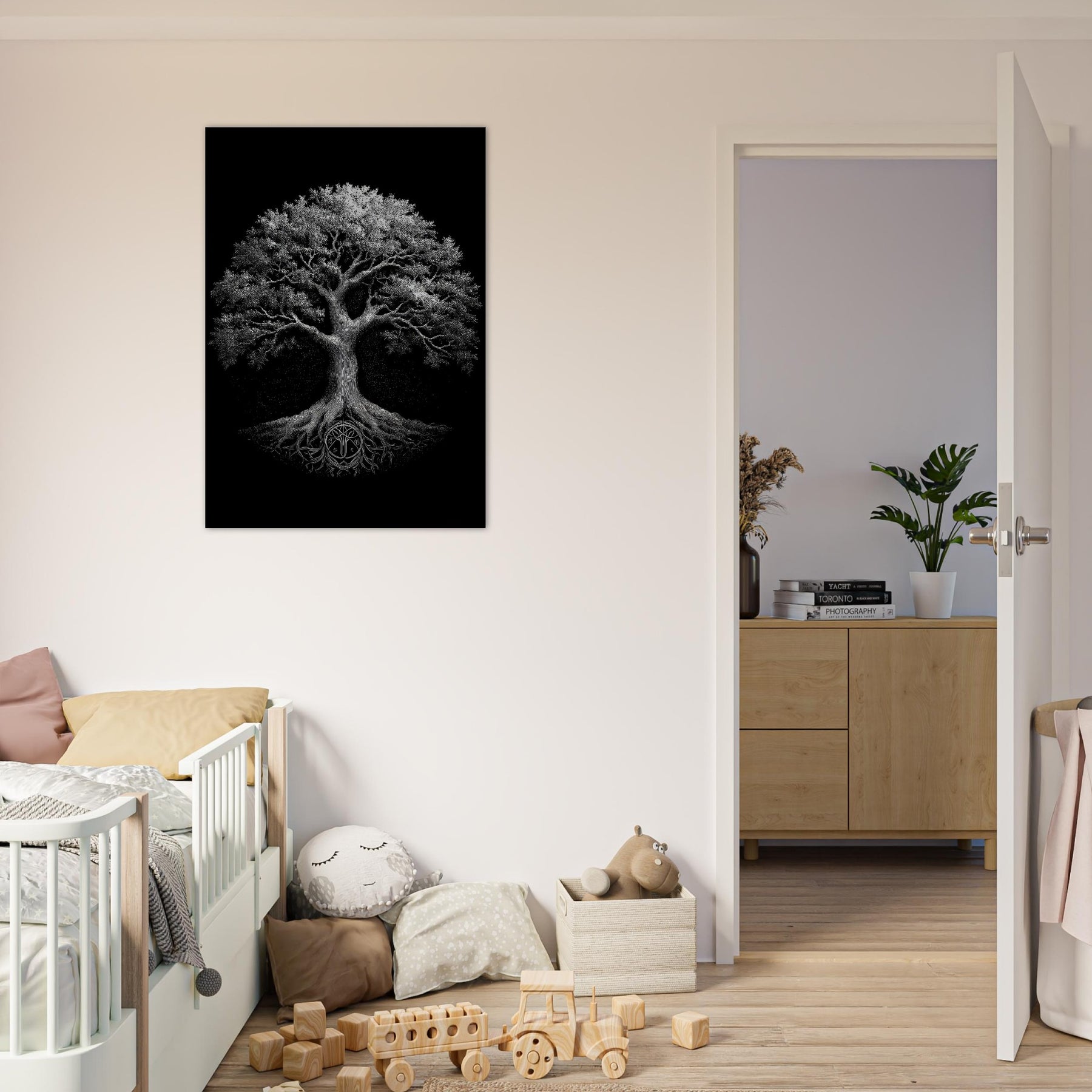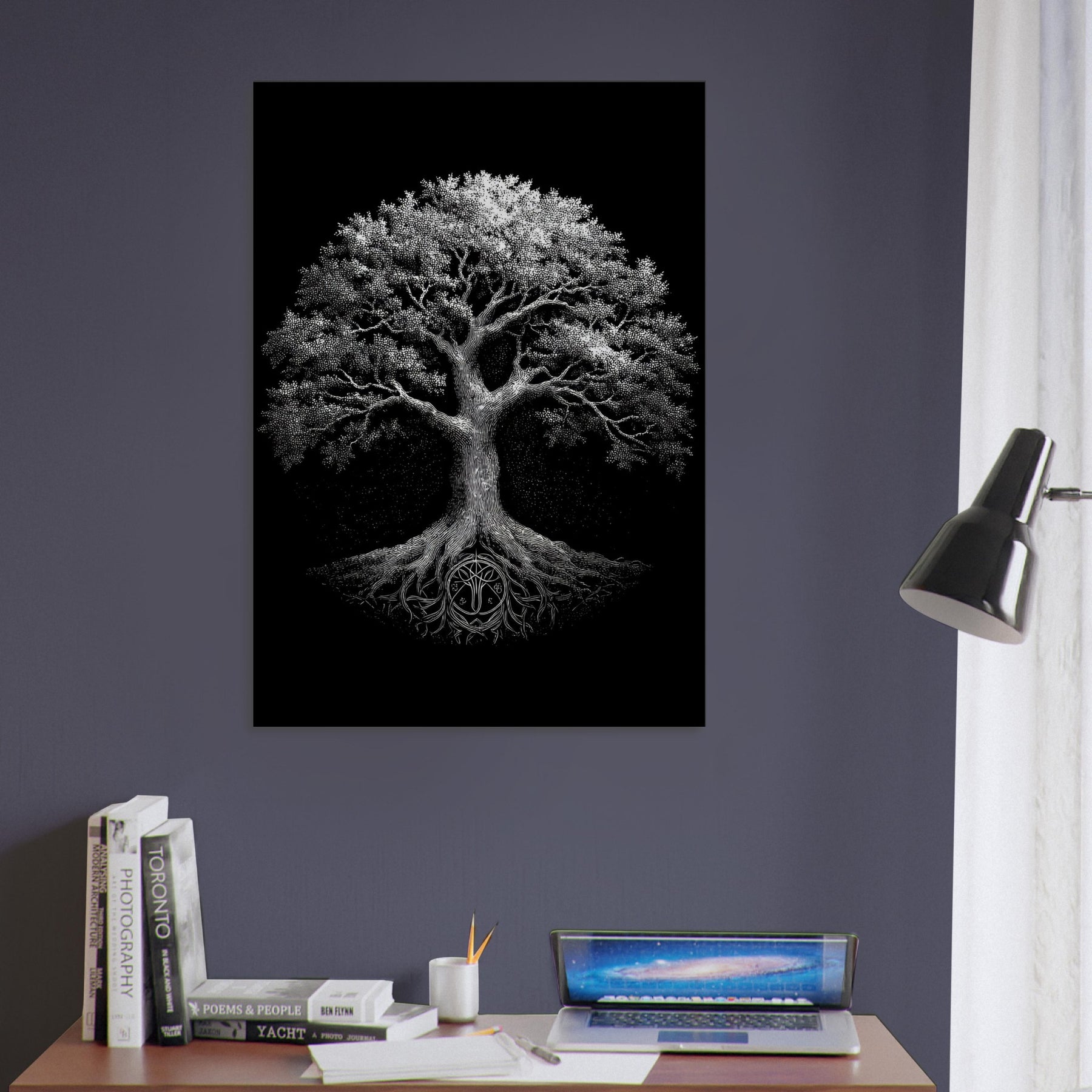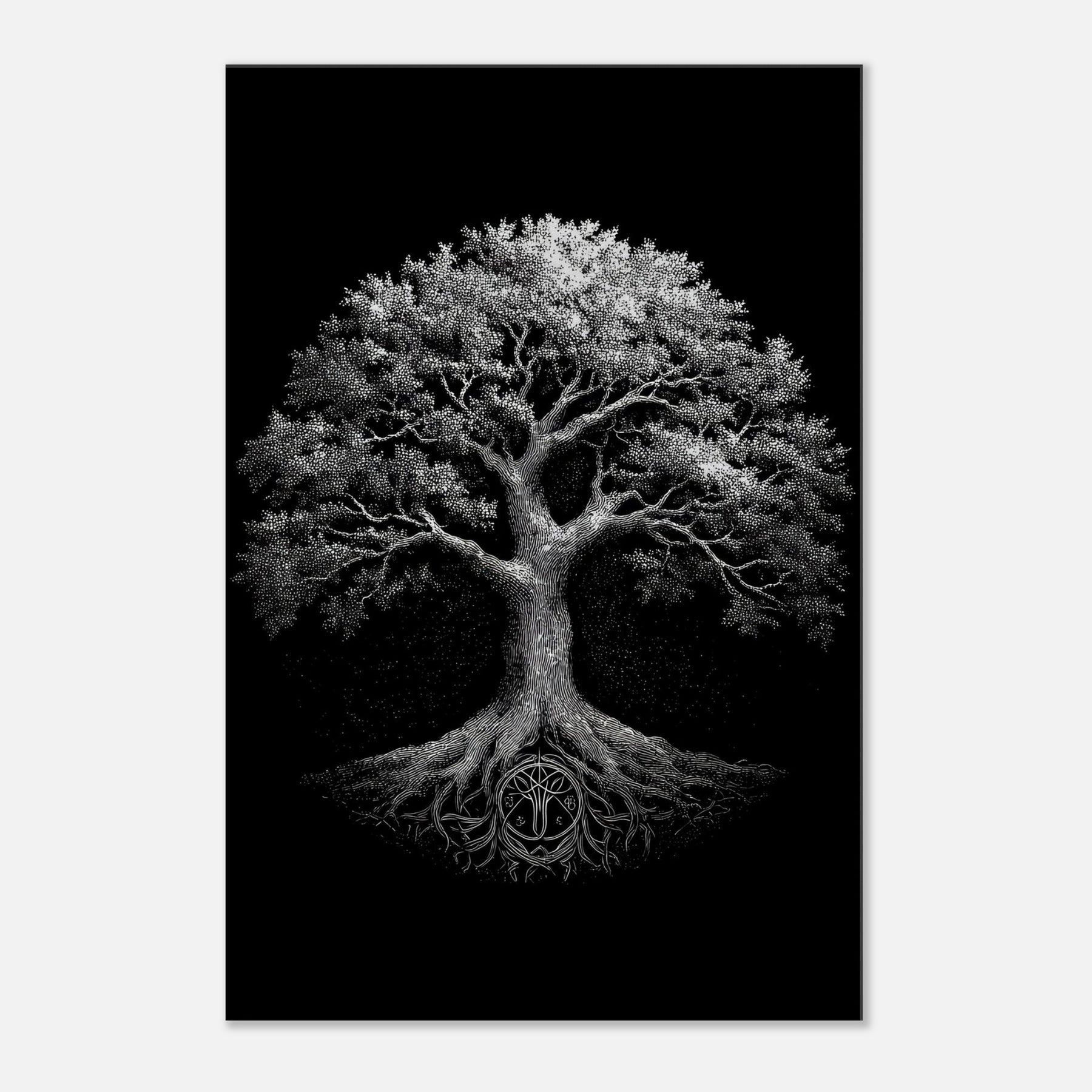 Tree Of Life rises in stark monochrome, a mystical centerpiece that invites quiet reflection. The branches unfurl with meticulous detail, while the roots ground the image in primal earth. This black and white piece breathes through contrast, revealing light in negative space and depth in texture. Placed in a calm living space, it brings a meditative presence enhancing atmosphere, guiding the eye, and pairing beautifully with minimalist decor. A timeless reminder of connection and growth, it elevates any wall with quiet, luminous dignity.