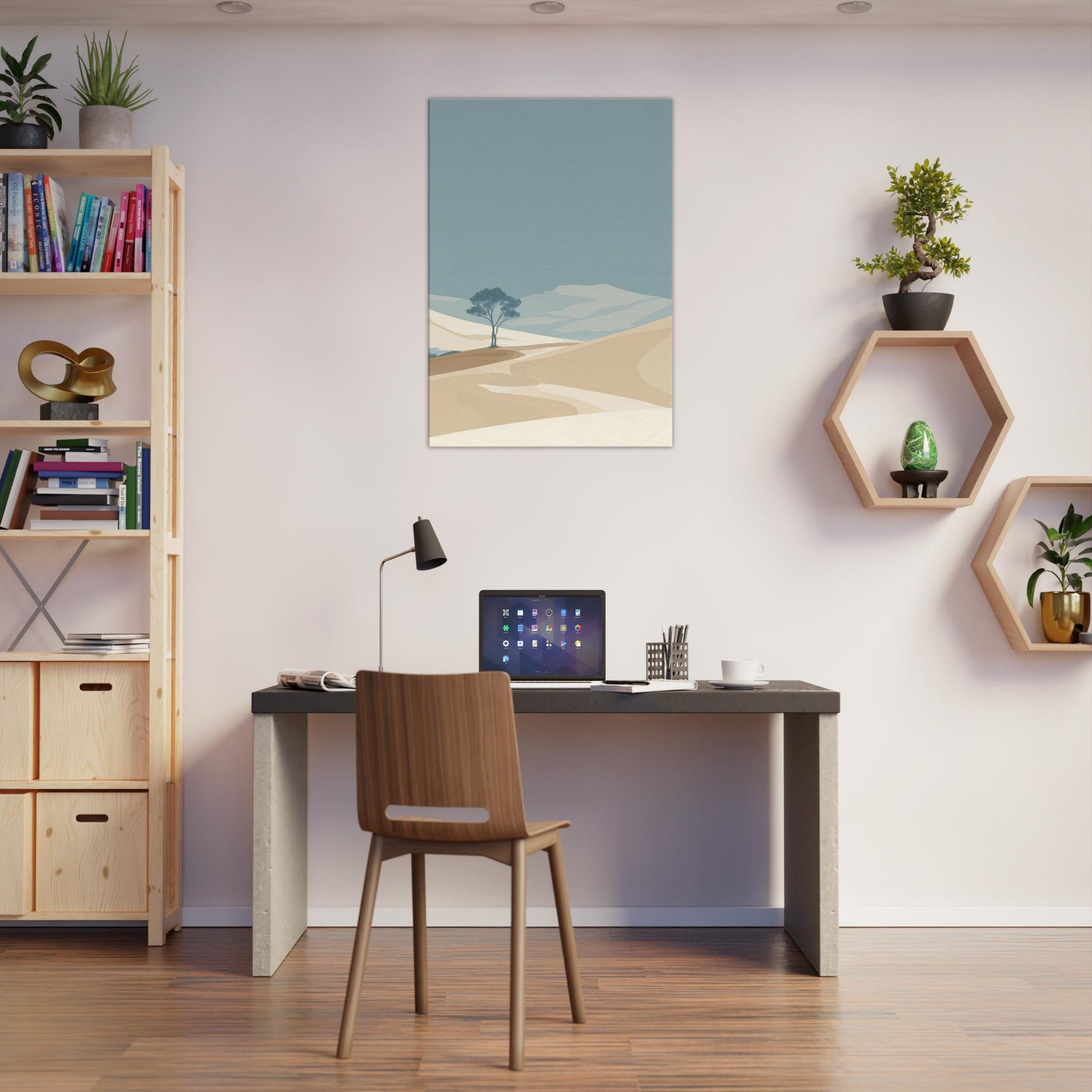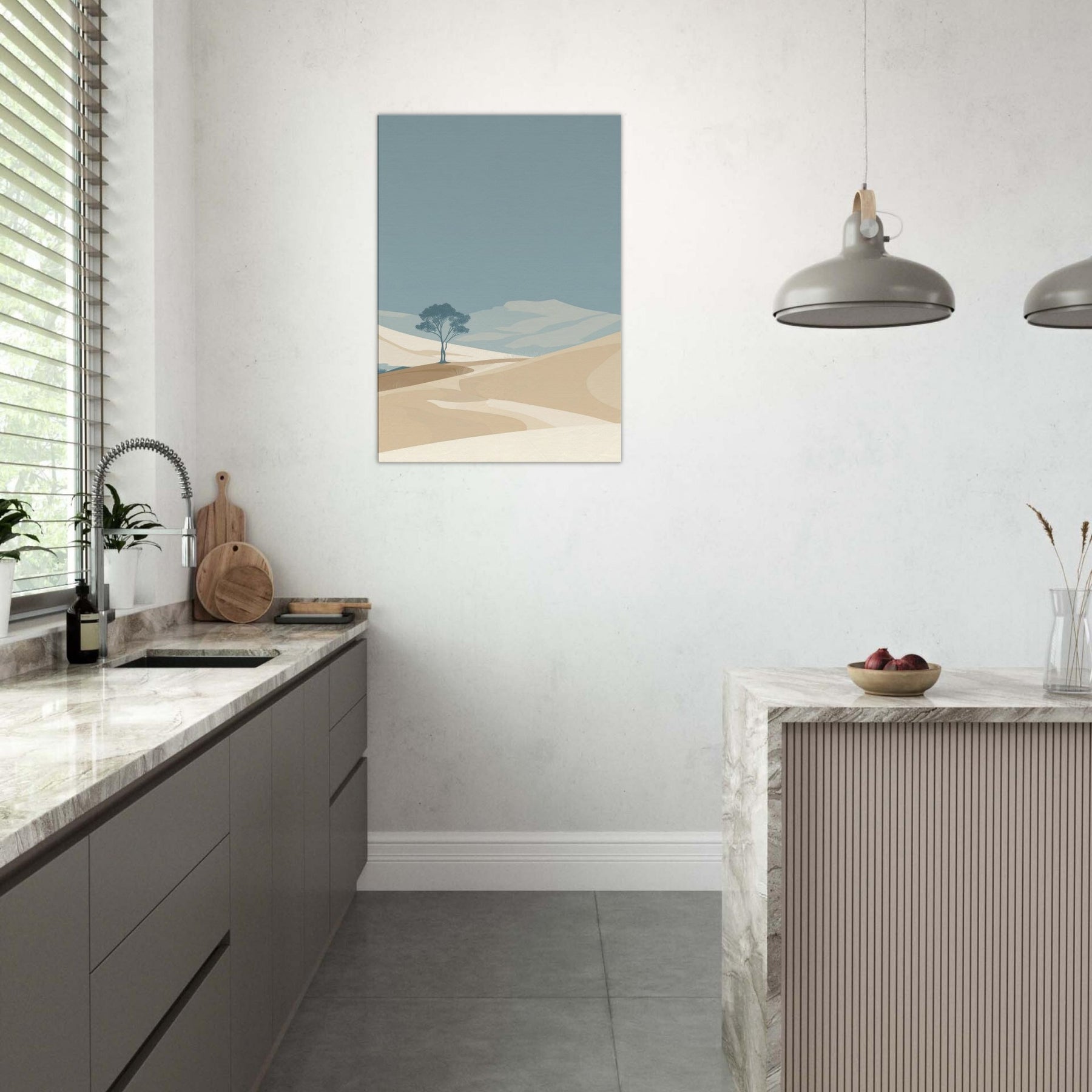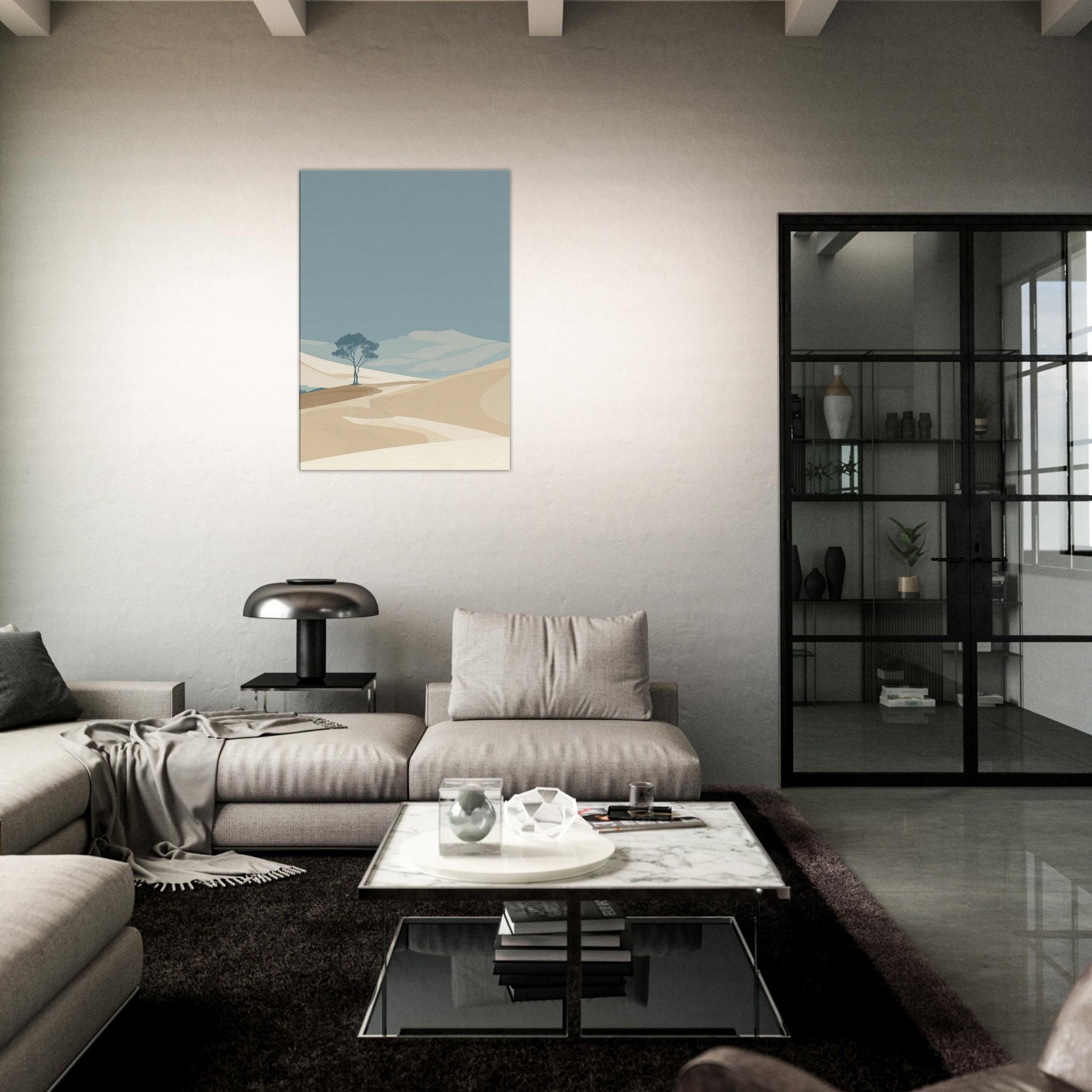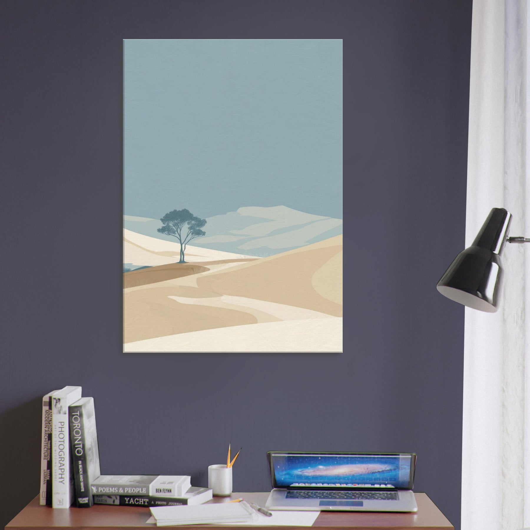 A solitary tree stands against the sweep of wind sculpted dunes, inviting the mind to breathe with the desert's quiet tempo. This Sandstorm minimalist piece encircles you with cool blues and warm sands, layering atmosphere over form until the room feels tempered by wind and light. The composition emphasizes spaciousness, encouraging a serene, contemplative mood in any living space while the Primary Subject Sandstorm echoes through the stillness as if a breeze is just beyond the frame.