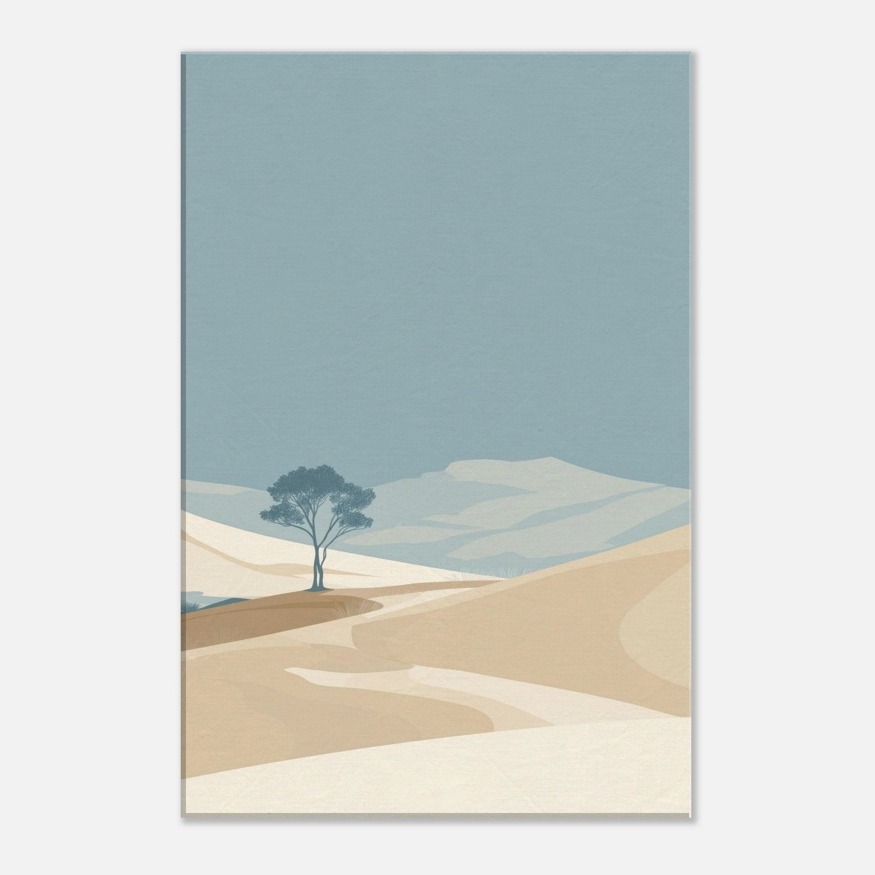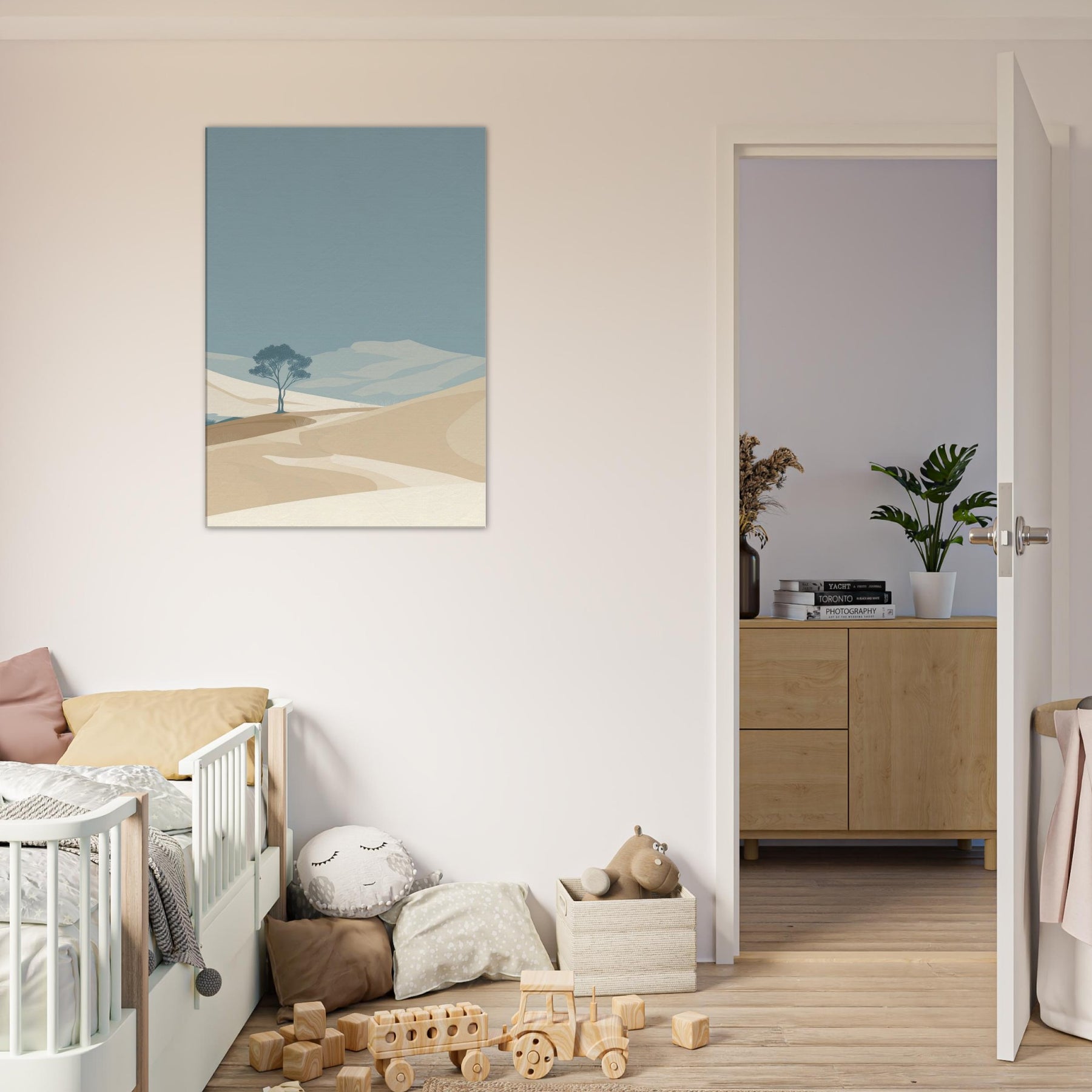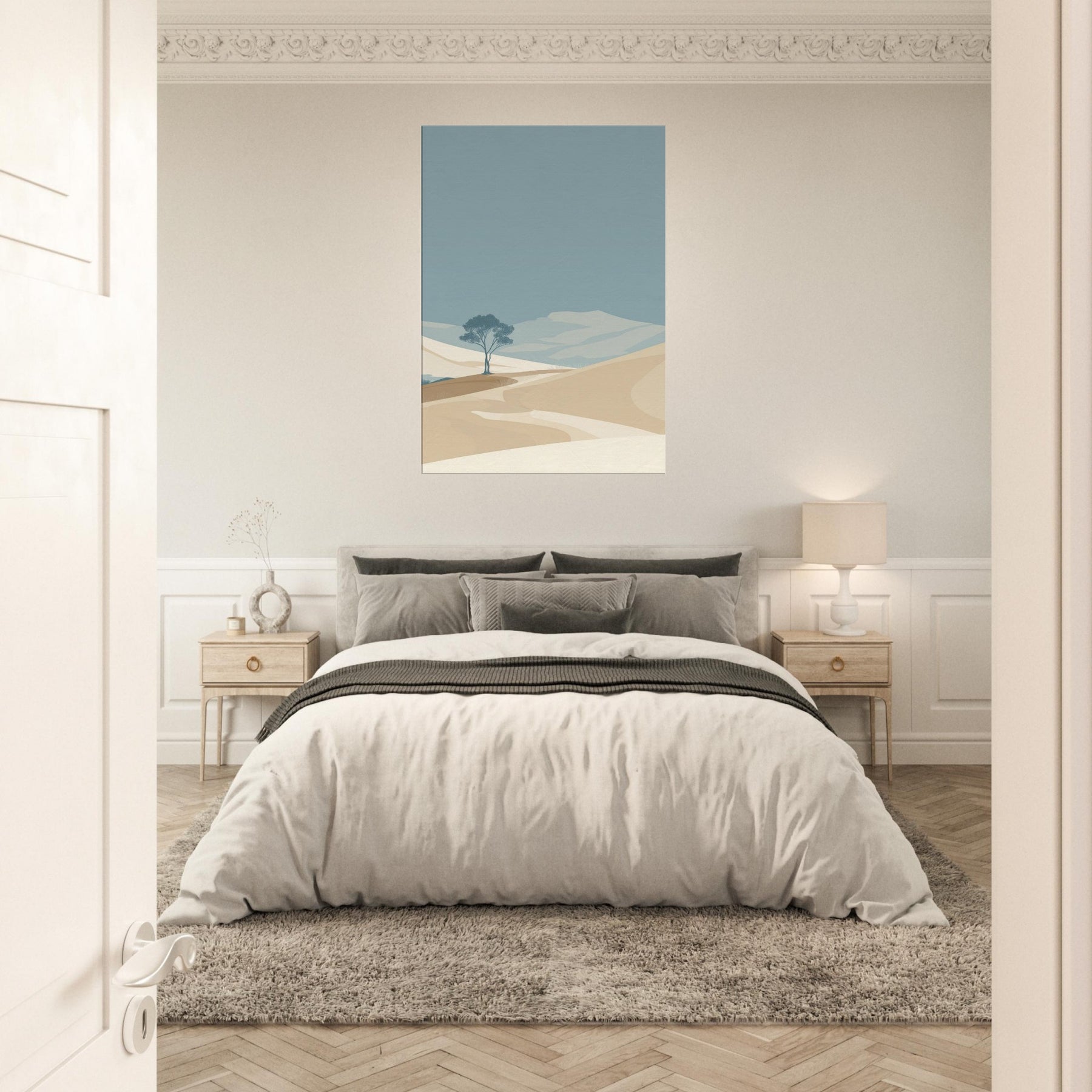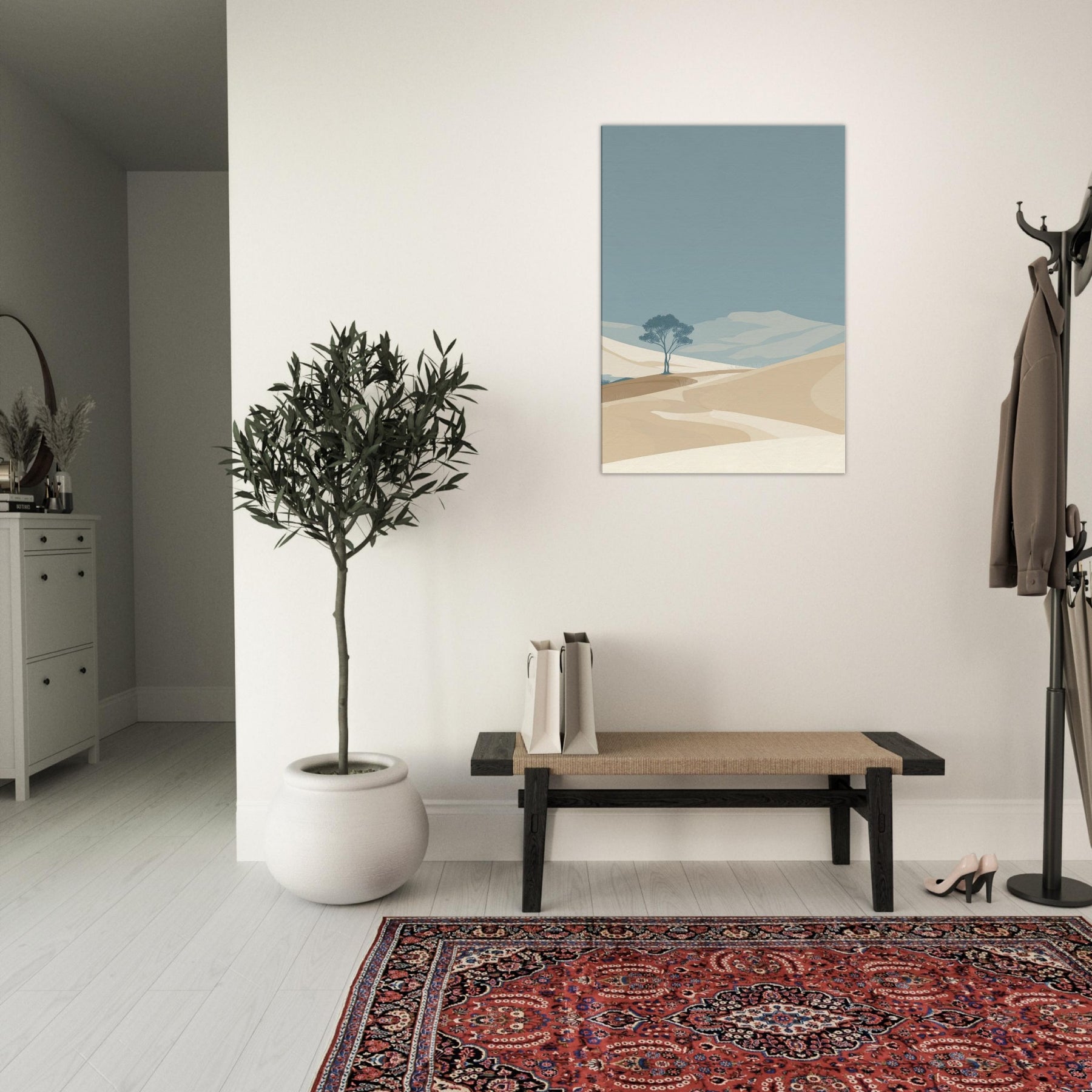 A solitary tree stands against the sweep of wind sculpted dunes, inviting the mind to breathe with the desert's quiet tempo. This Sandstorm minimalist piece encircles you with cool blues and warm sands, layering atmosphere over form until the room feels tempered by wind and light. The composition emphasizes spaciousness, encouraging a serene, contemplative mood in any living space while the Primary Subject Sandstorm echoes through the stillness as if a breeze is just beyond the frame.