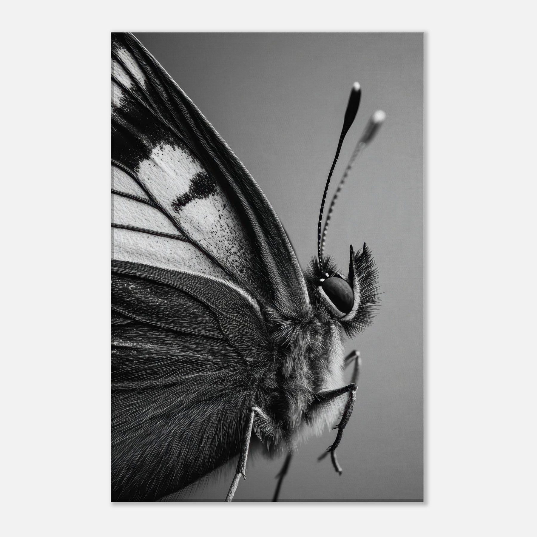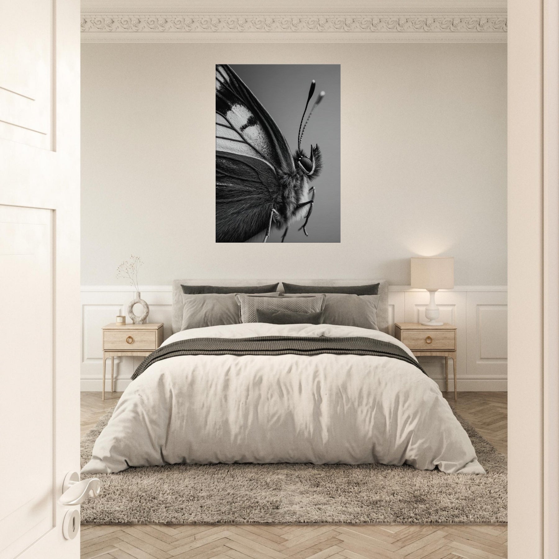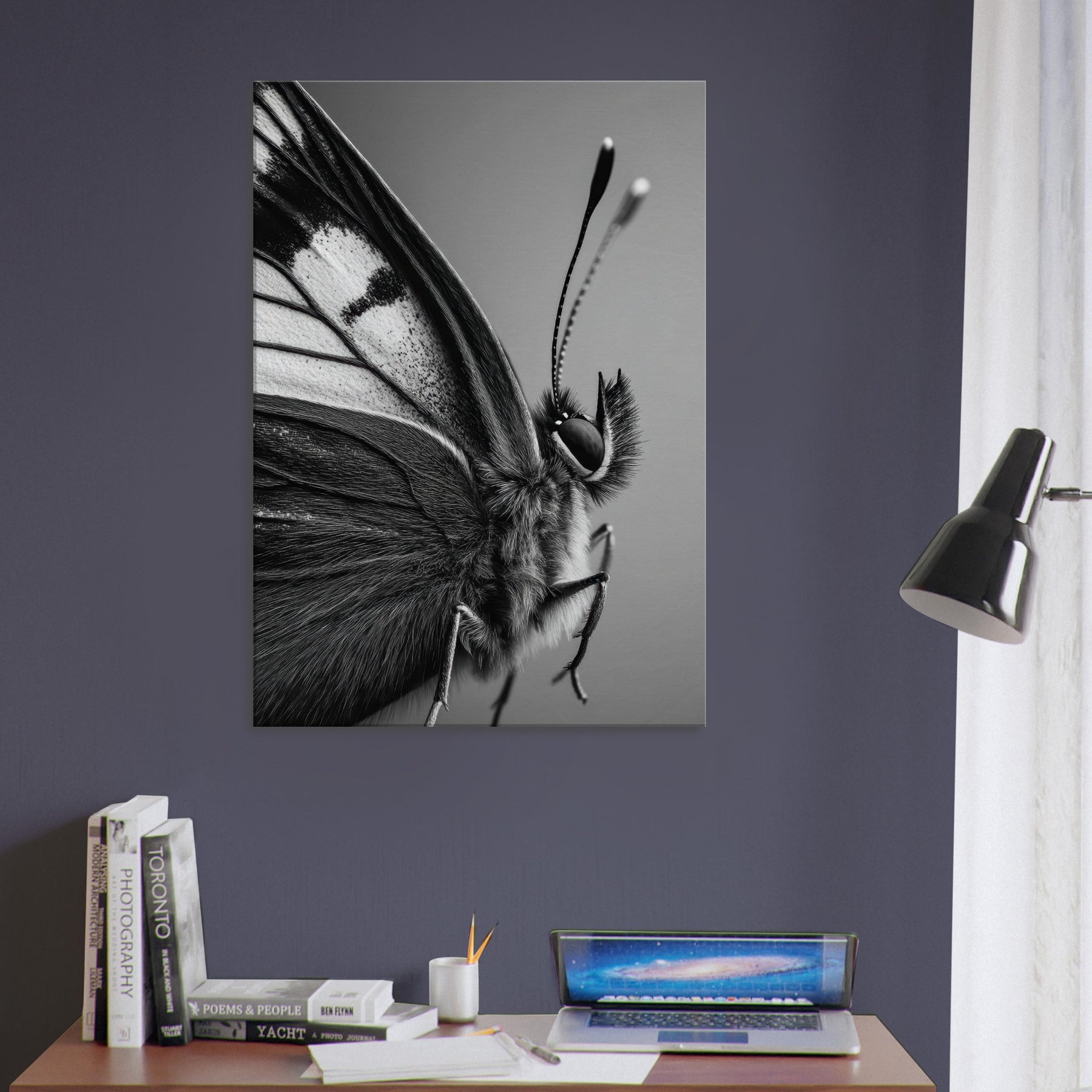 Rendered in stark black and white, this butterfly is a quiet study in contrast and grace. The delicate anatomy thin antennae, folded wings, and soft fur like textures transforms a small creature into a thesis on presence and motion. In a living room, it invites a moment of breath and wonder, turning everyday light into a stage for stillness. Place near a window or on a gallery wall to echo the room’s rhythm, balancing bold lines with subtle tenderness.