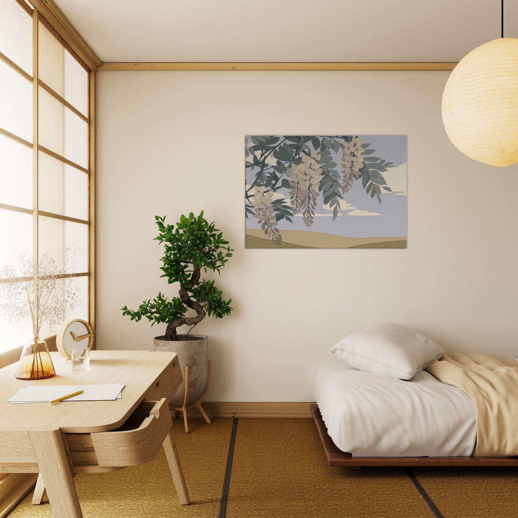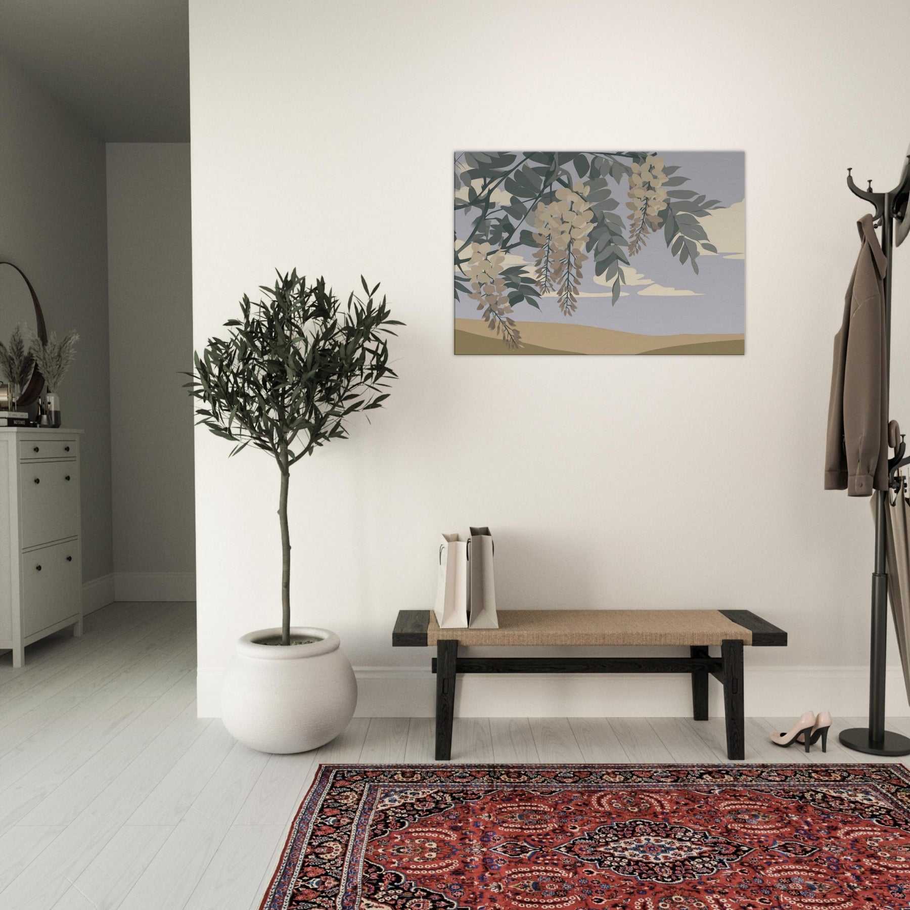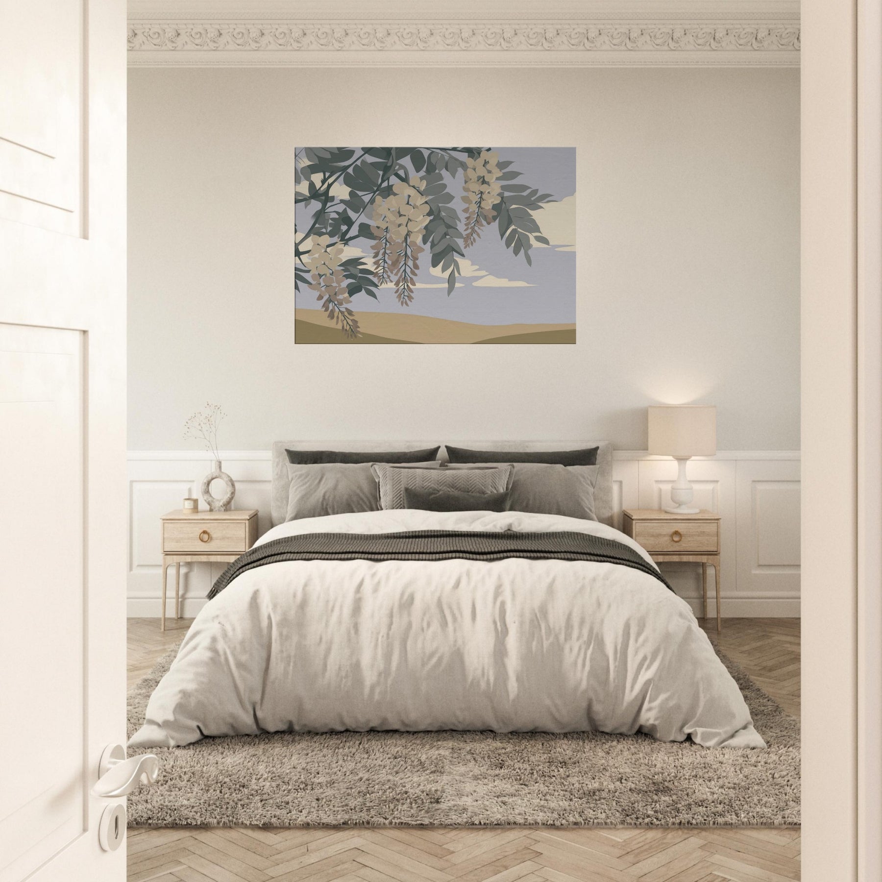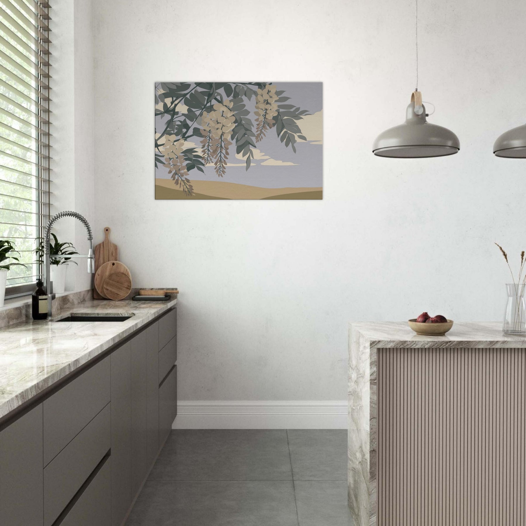 Let Wisteria cascade in soft, restrained grace across your room. This minimalist study of nature invites gentle light and quiet air, a tranquil counterpoint to busy days. The pale blossoms and restrained palette kindle a sense of calm, while the hanging clusters draw the eye upward, widening ceilings and easing transitions between spaces. Ideal above a sofa or in a serene corridor, it fosters contemplative moments and turns any living space into a quiet garden.