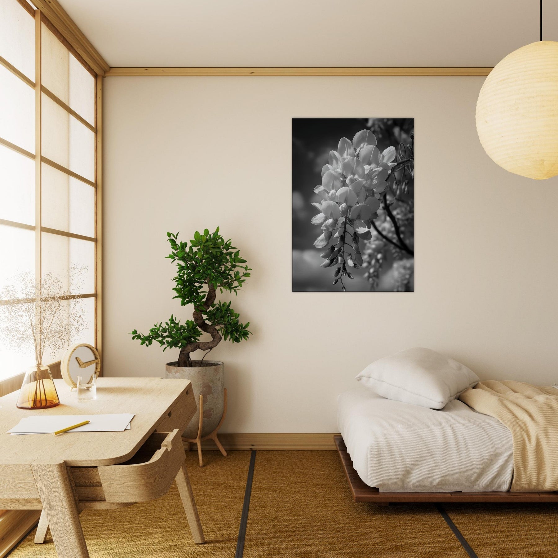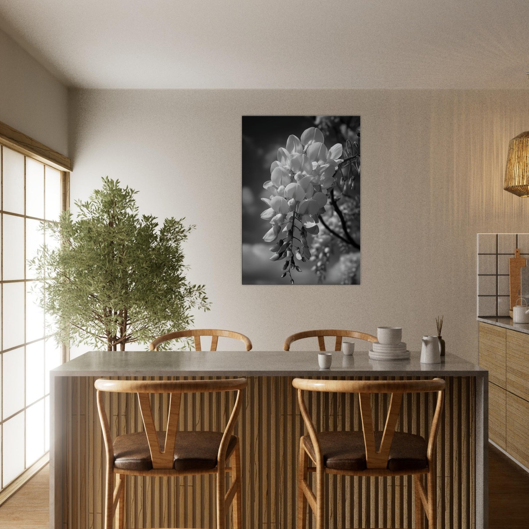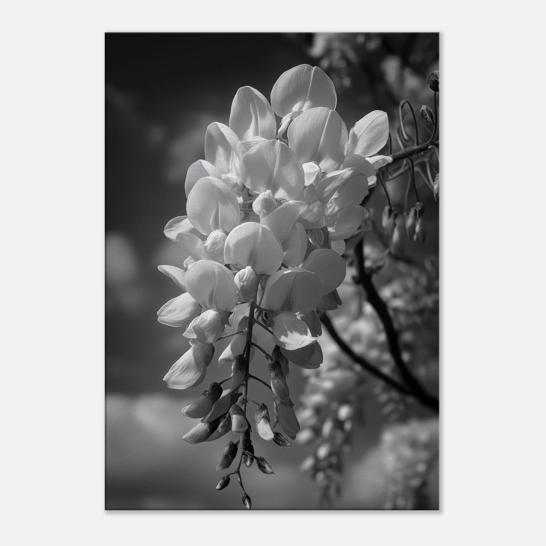 Let the Wisteria cascade in monochrome serenity, where each bloom becomes a lantern suspended in soft air. The grayscale study strips away color to reveal texture, curve, and quiet motion, turning a garden into a meditative backdrop for daily life.