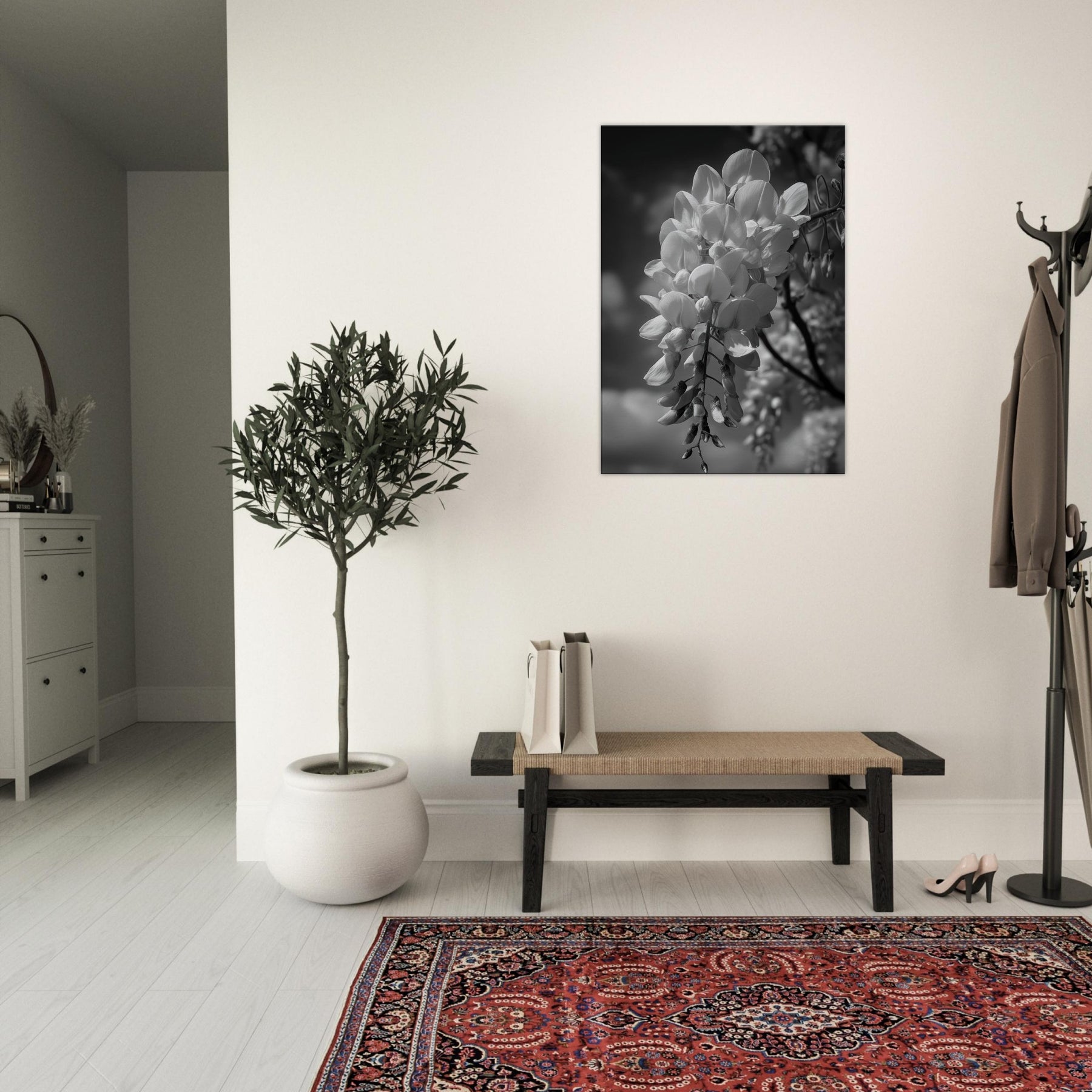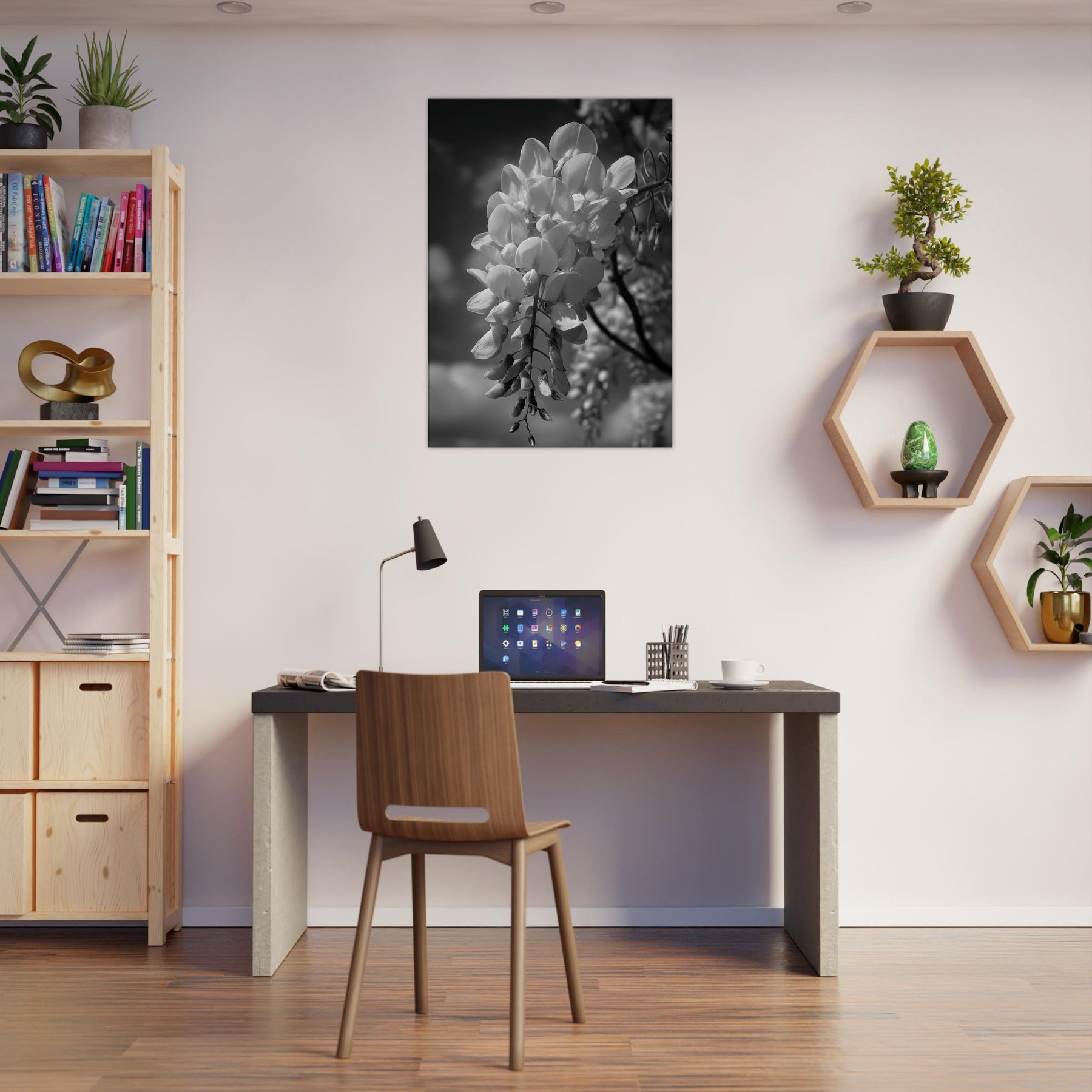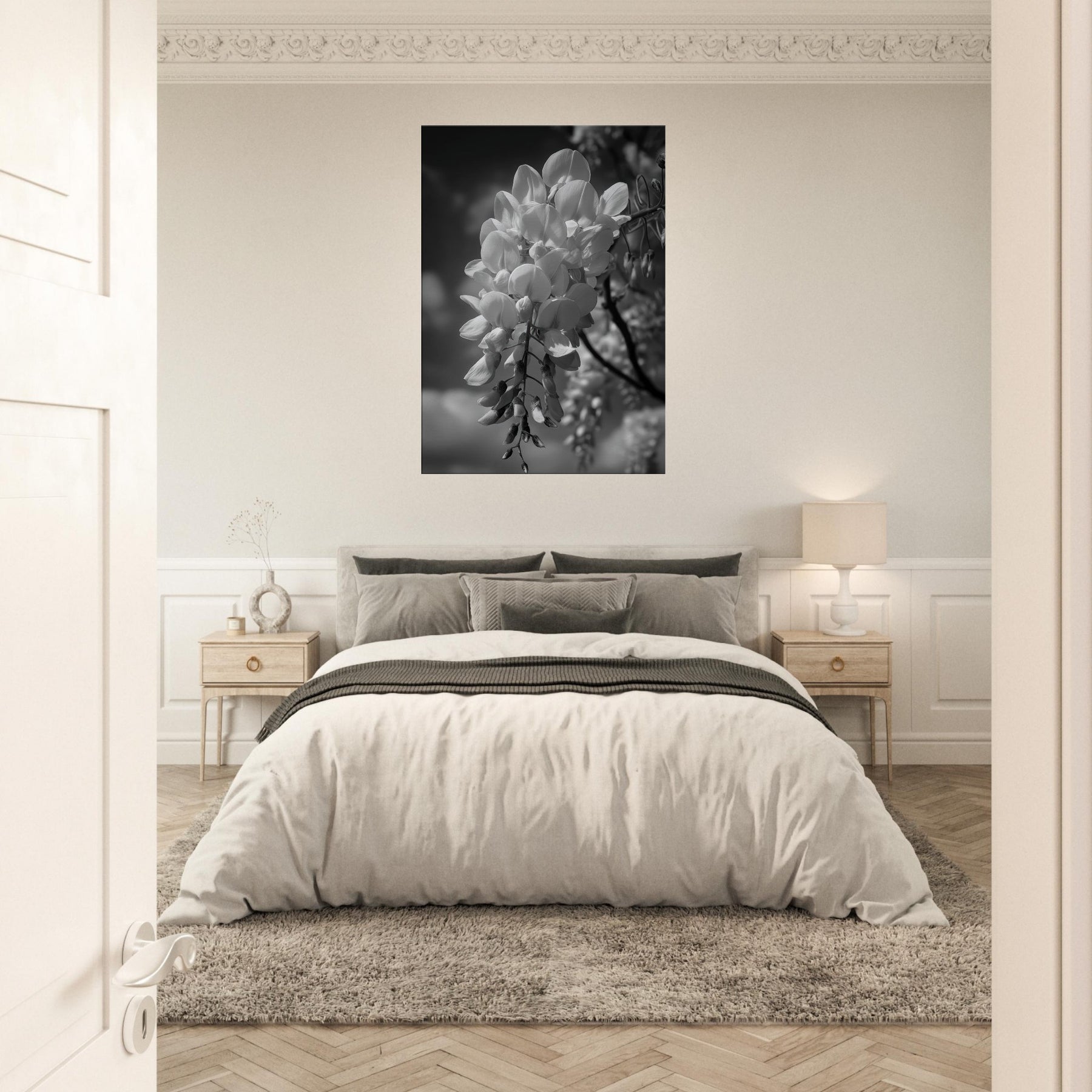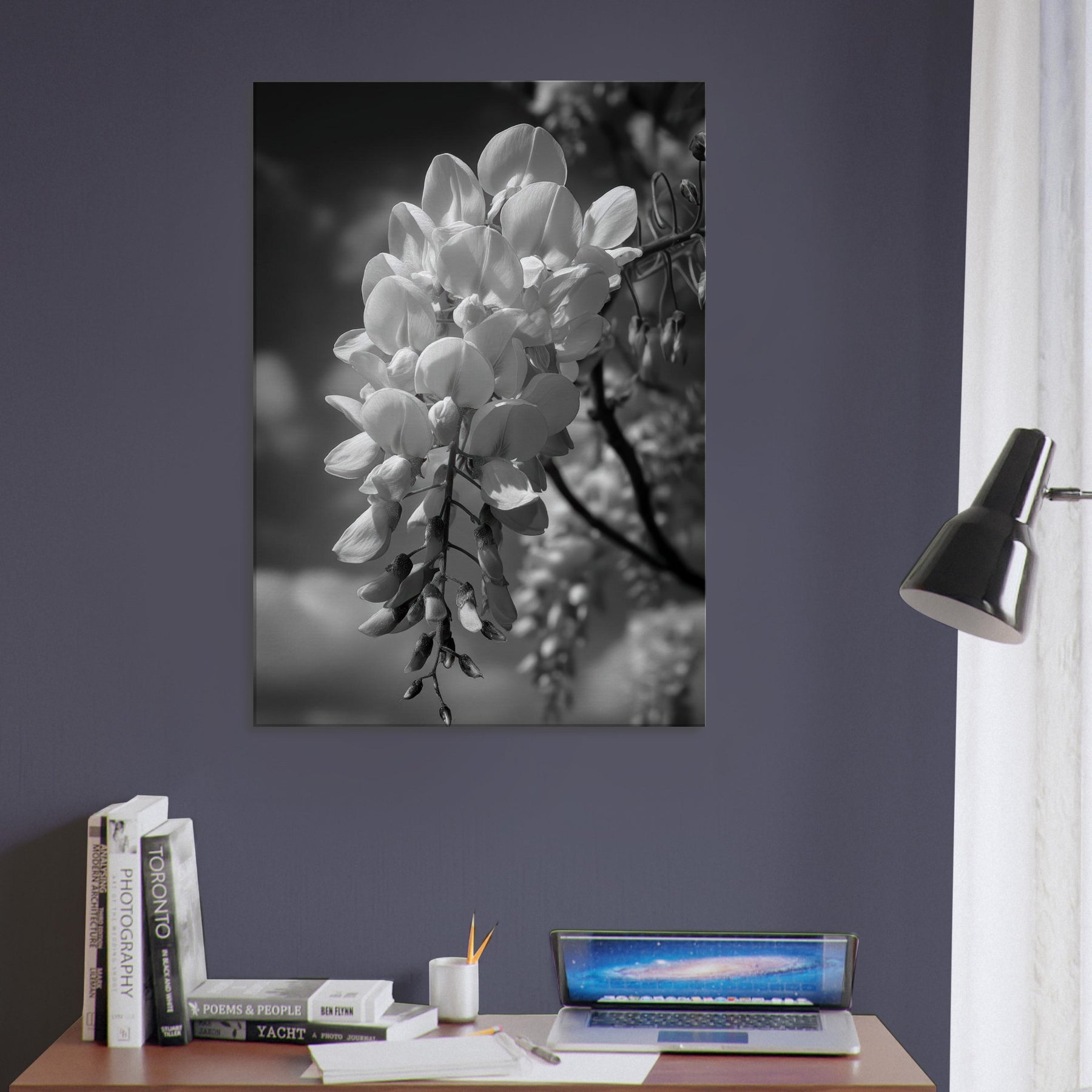 Let the Wisteria cascade in monochrome serenity, where each bloom becomes a lantern suspended in soft air. The grayscale study strips away color to reveal texture, curve, and quiet motion, turning a garden into a meditative backdrop for daily life.
