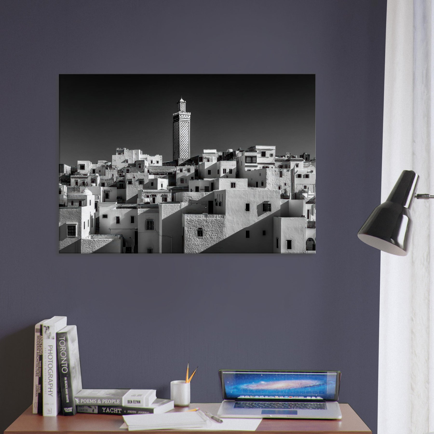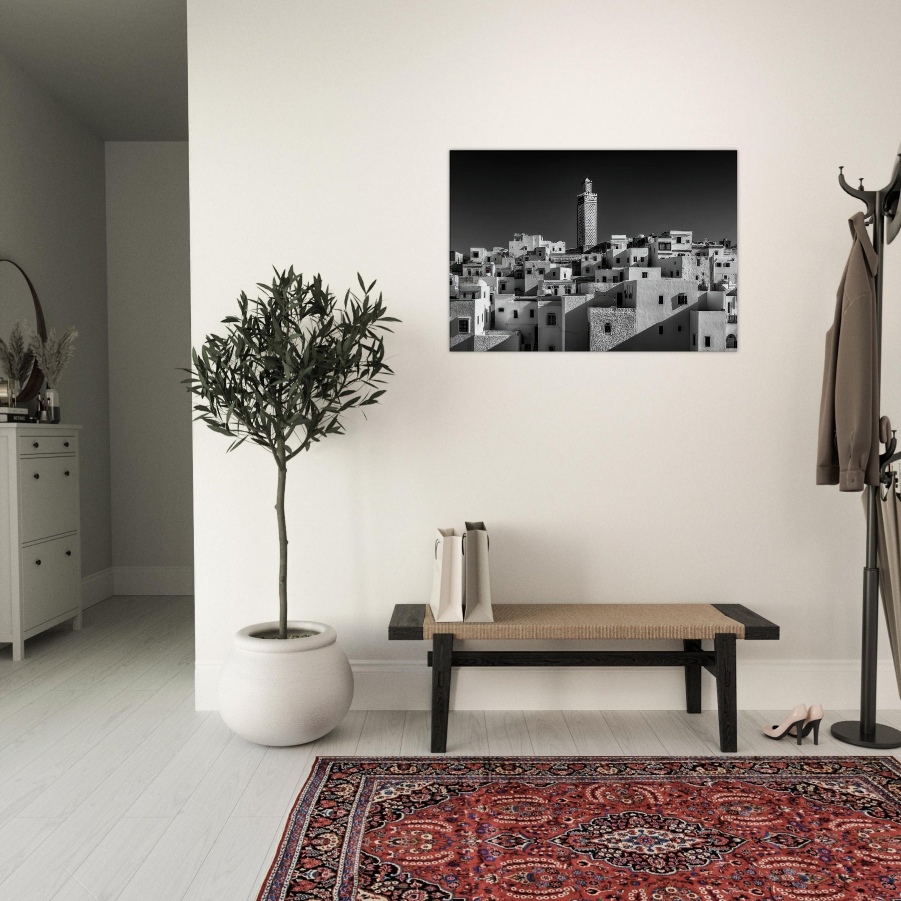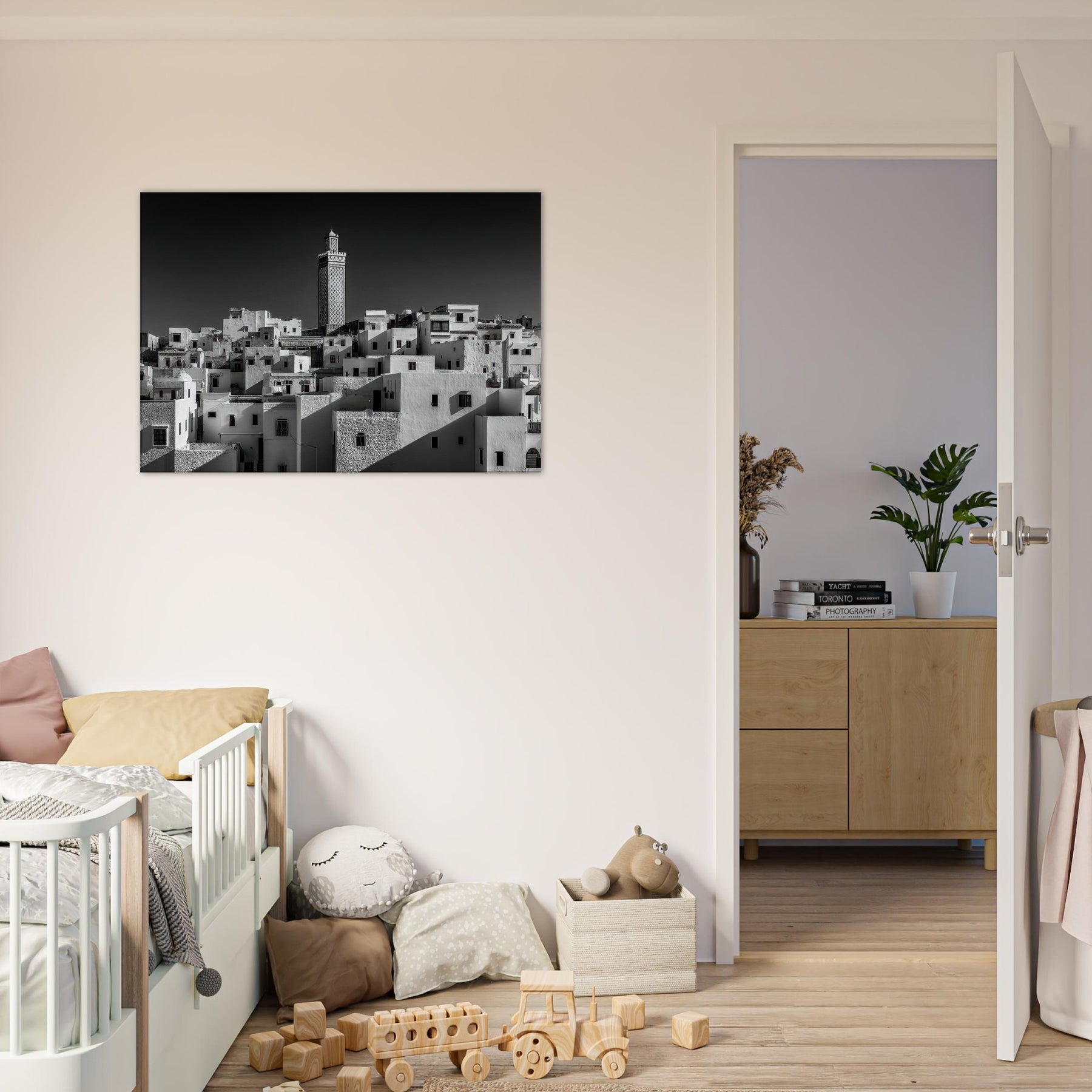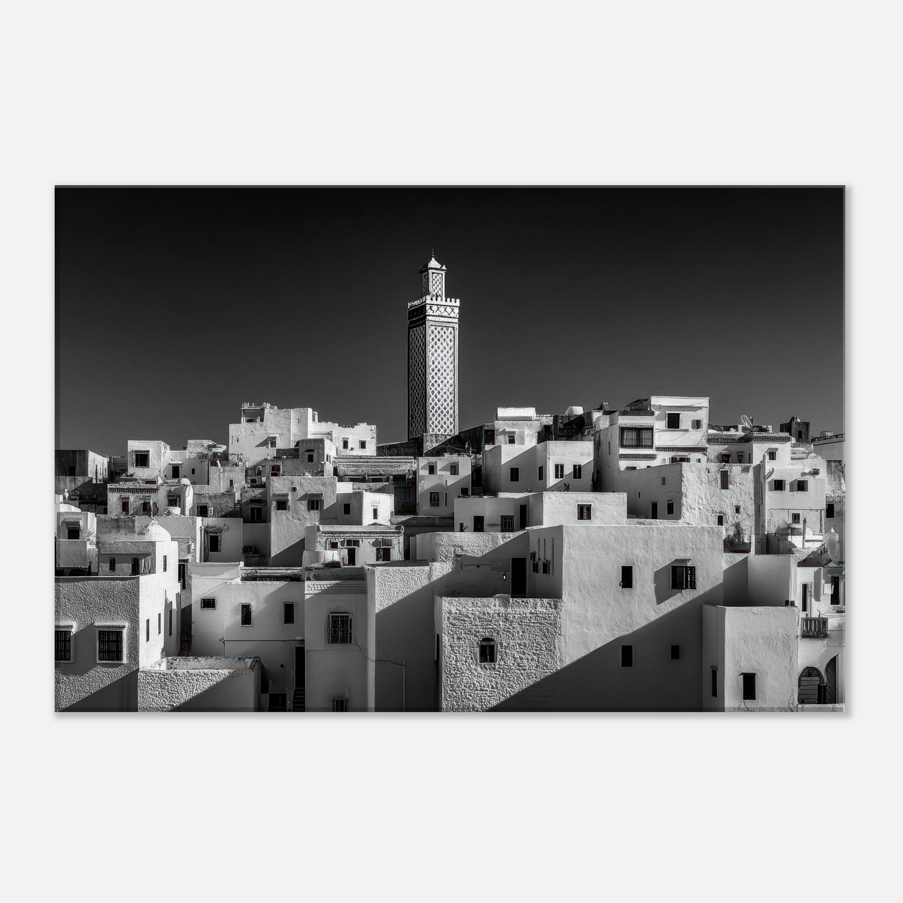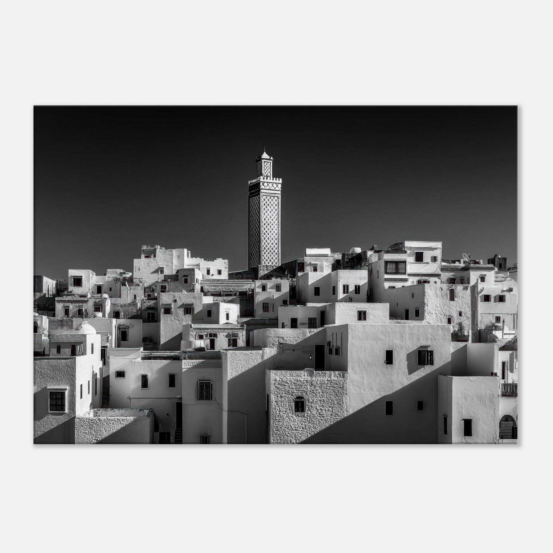 From Marrakech, a hillside tapestry of white cubic homes stacks toward a single carved minaret, rendered in stark black and white. The scene breathes with sunlit shadows, the texture of plaster, and the hush of narrow streets waking at dusk.