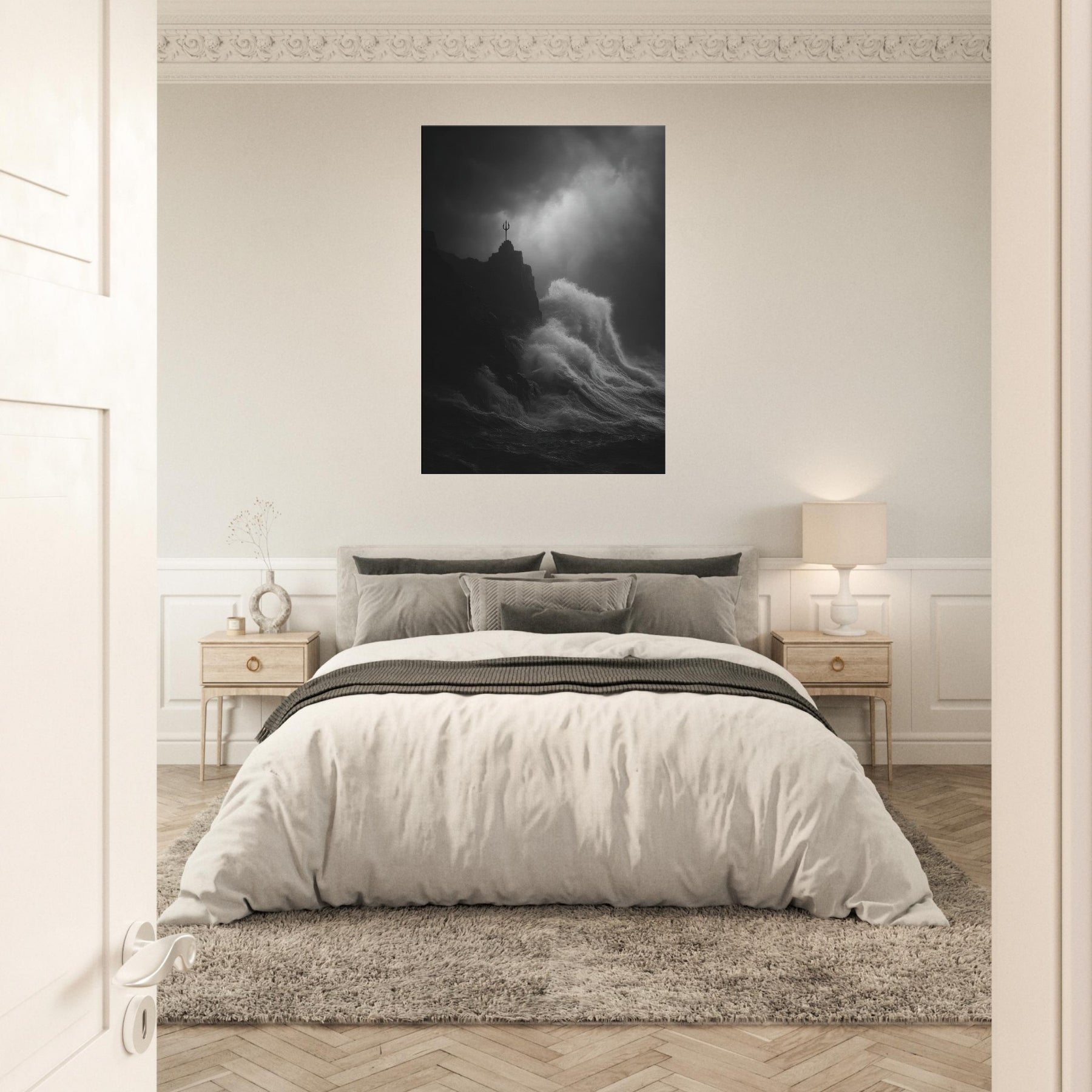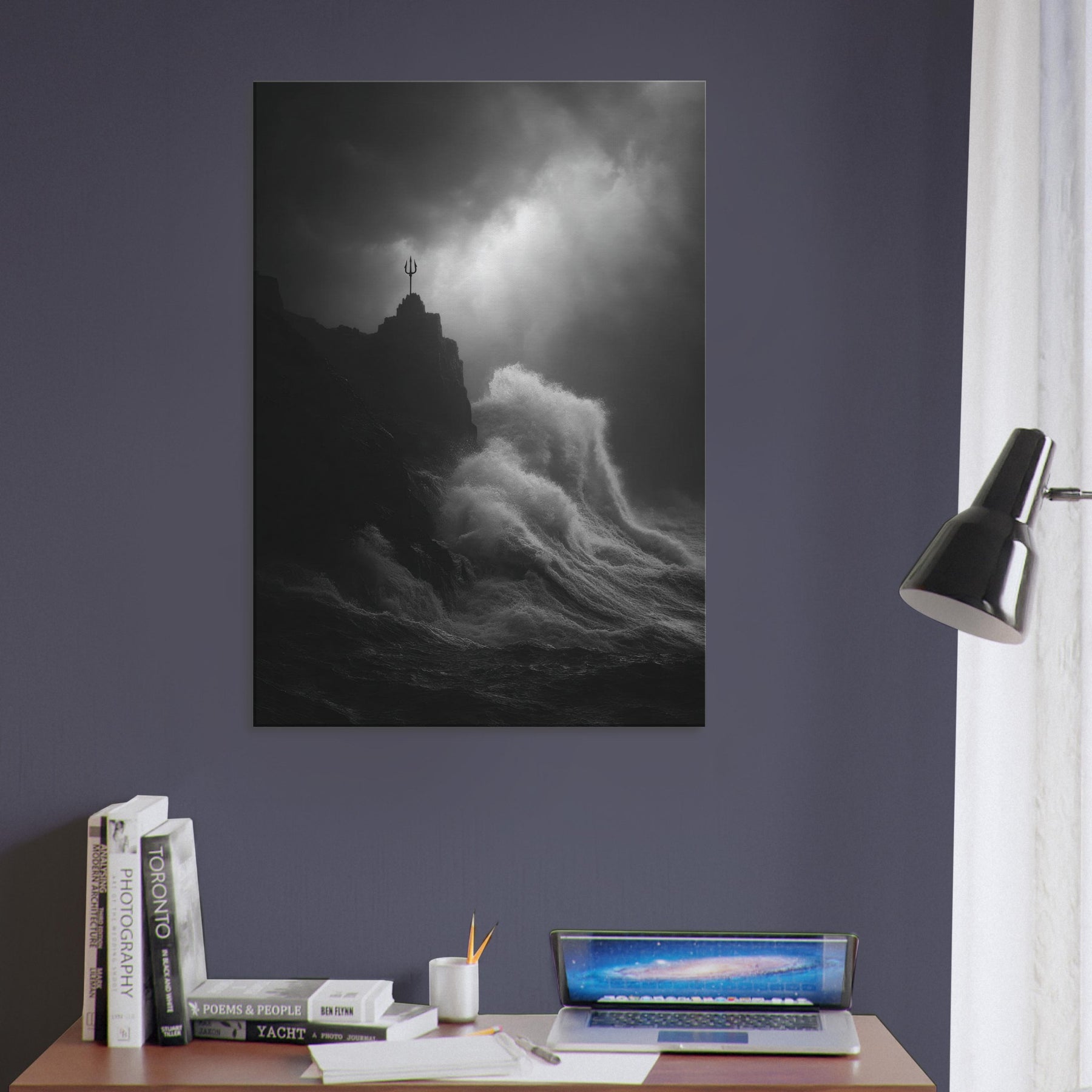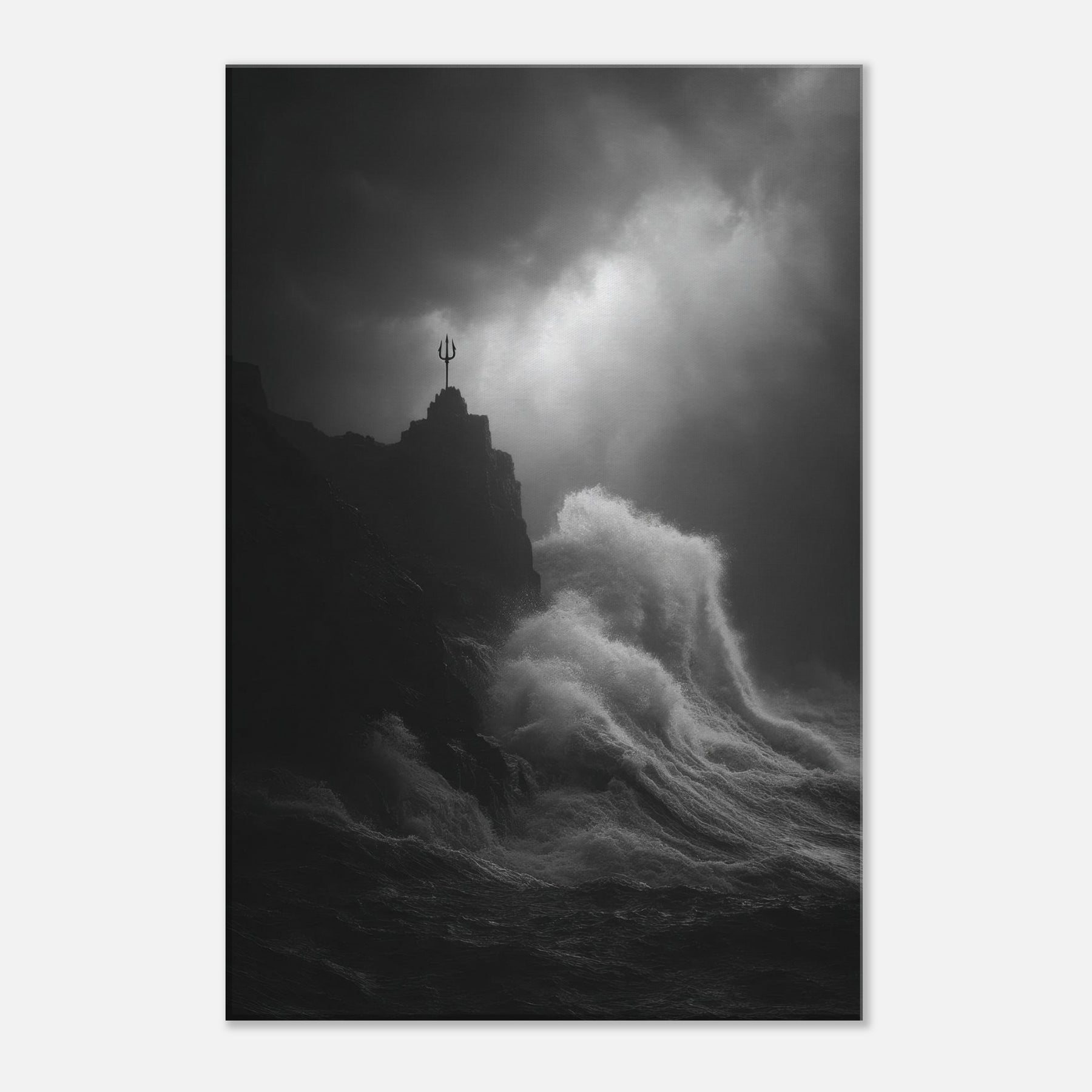 Poseidon rises from storm tossed darkness, a solitary silhouette on a jagged cliff, trident raised as thunder rips across the black and white sea. The piece hums with the deep pulse of the ocean salt spray, wind, and the hush of ancient legends inviting reflection and awe.