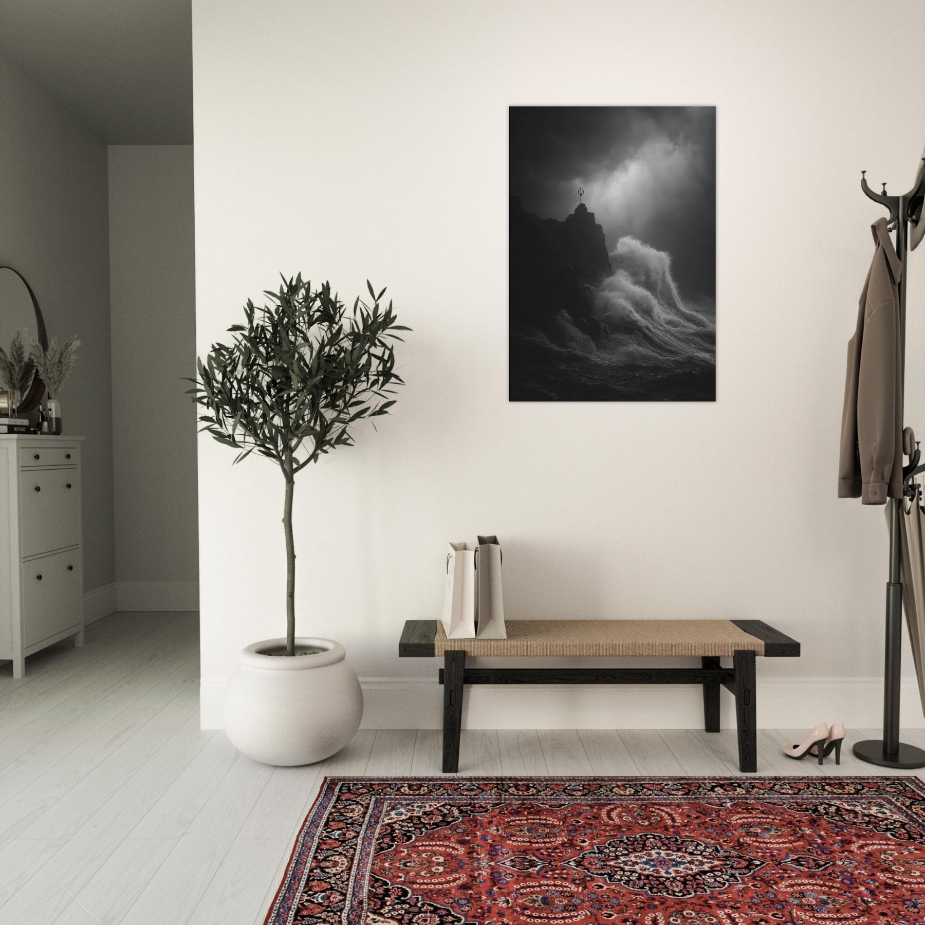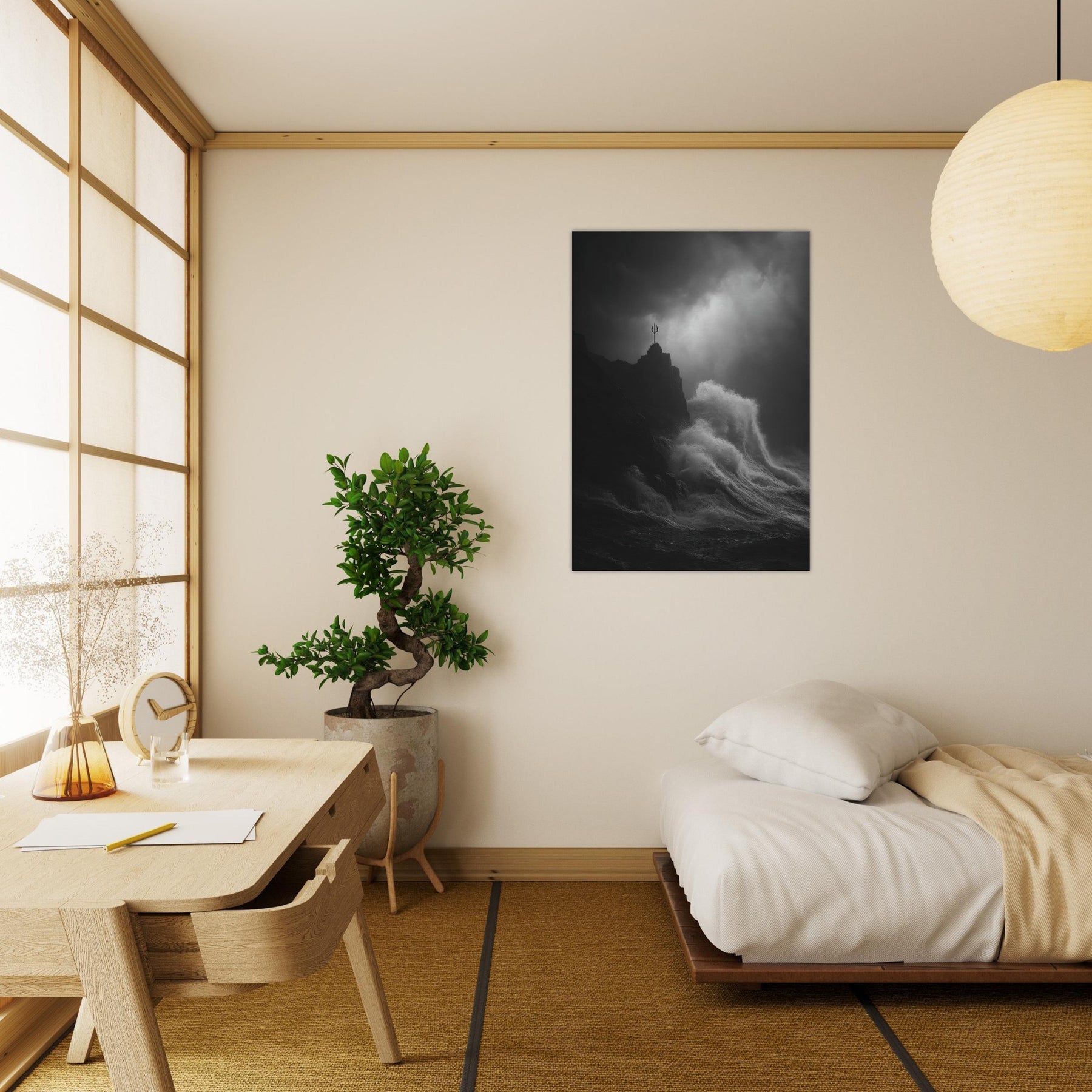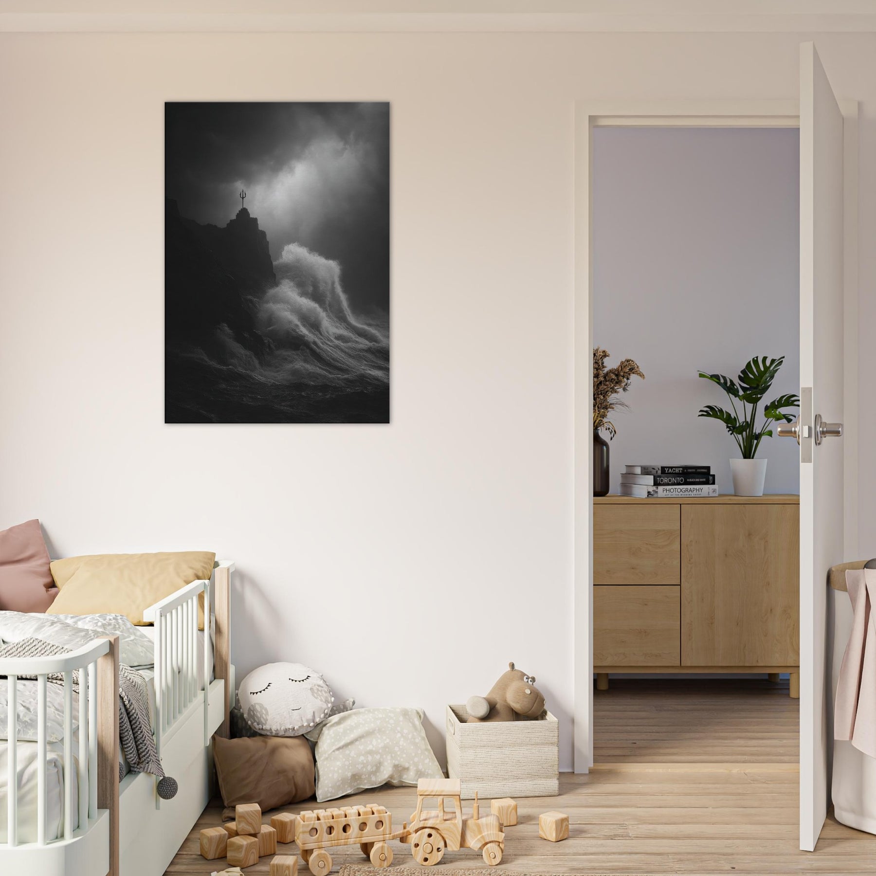Poseidon rises from storm tossed darkness, a solitary silhouette on a jagged cliff, trident raised as thunder rips across the black and white sea. The piece hums with the deep pulse of the ocean salt spray, wind, and the hush of ancient legends inviting reflection and awe.