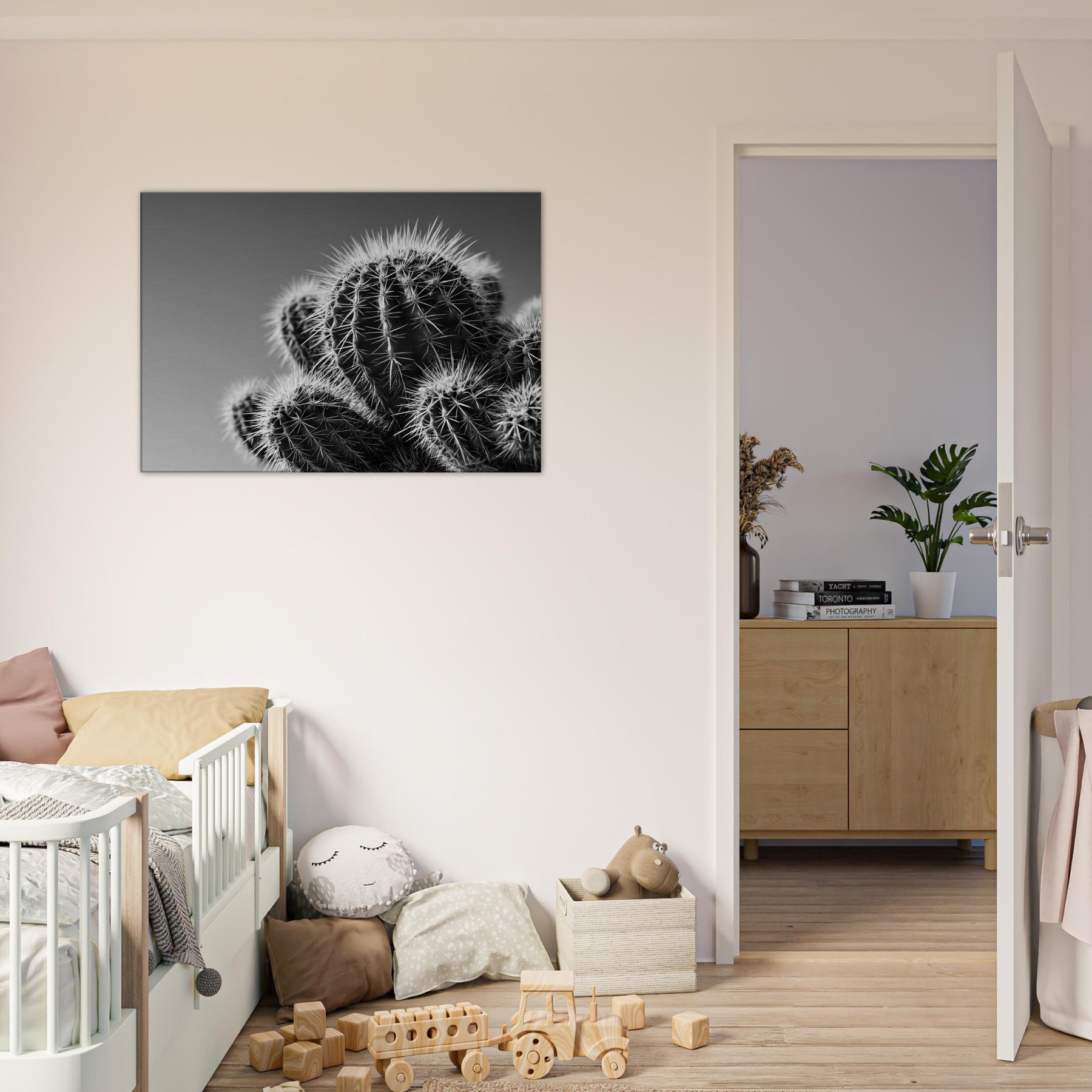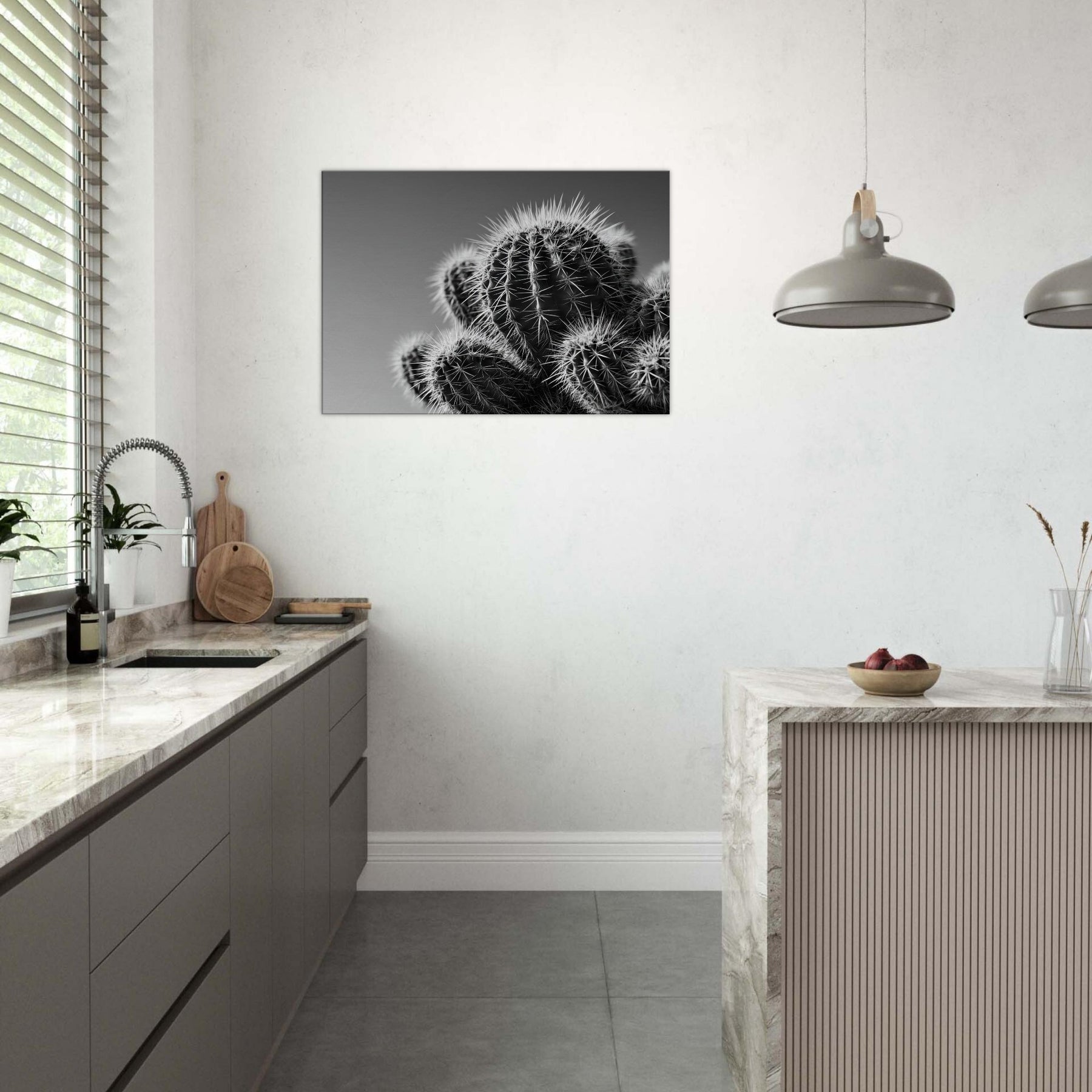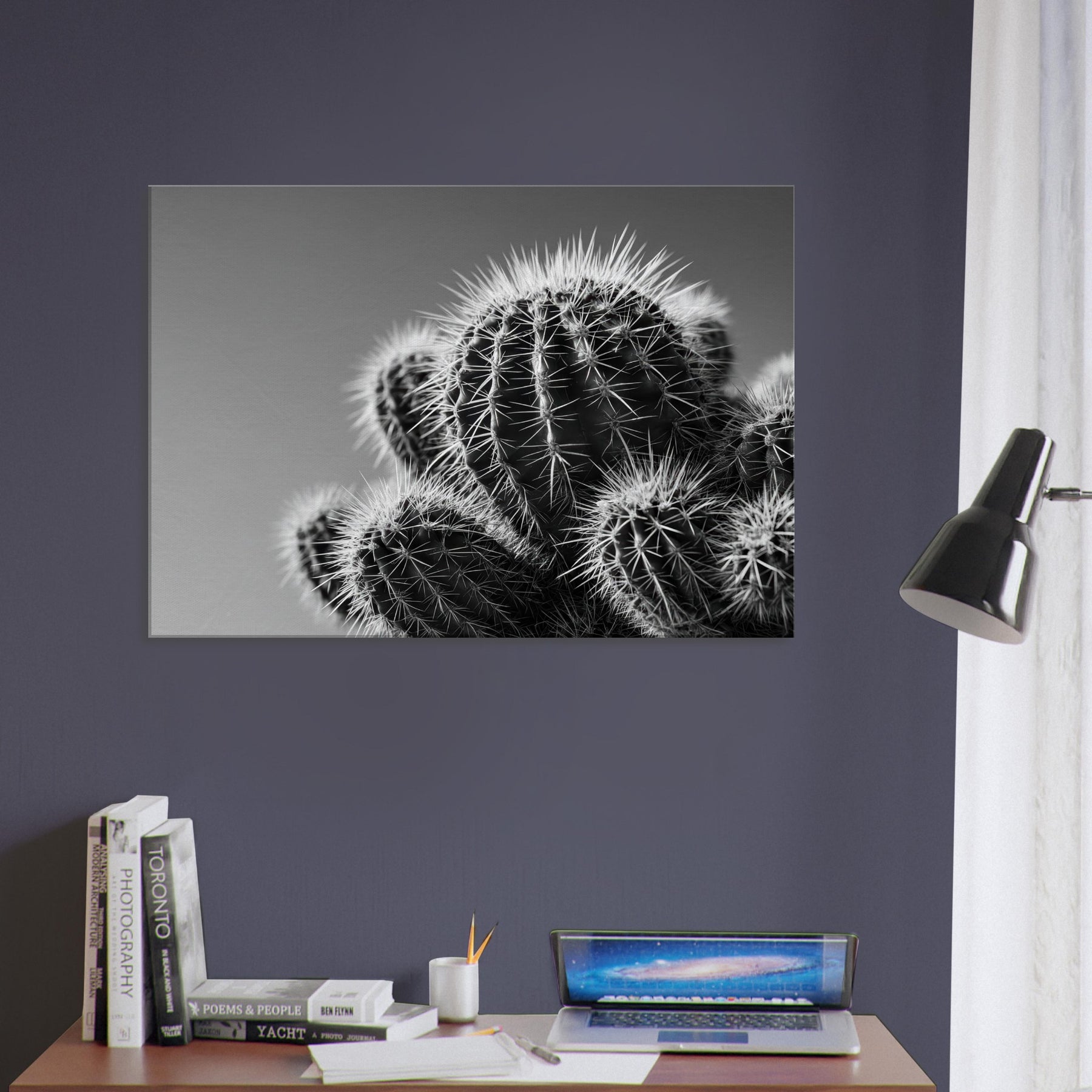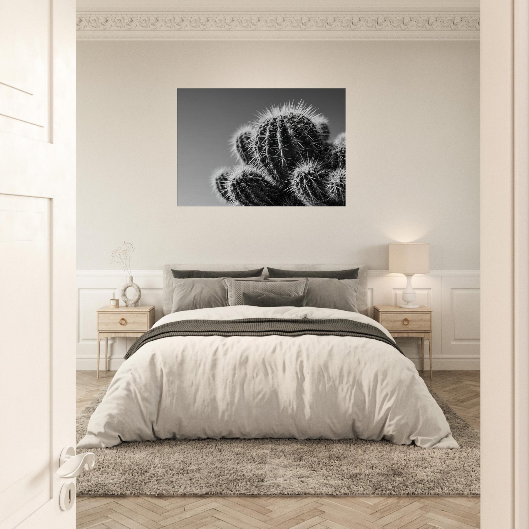 Drawn in stark black and white, this study of a Cactus invites quiet reflection in any living space. The bold contrast reveals texture the prickly crown, the slow curves, the way light folds over each spine. It exudes a calm, sculptural presence that anchors a room without shouting. Hang it where you want a touch of nature’s resilience to soften metal, wood, and fabric, turning an everyday wall into a contemplative vignette of stillness and nocturnal grace.