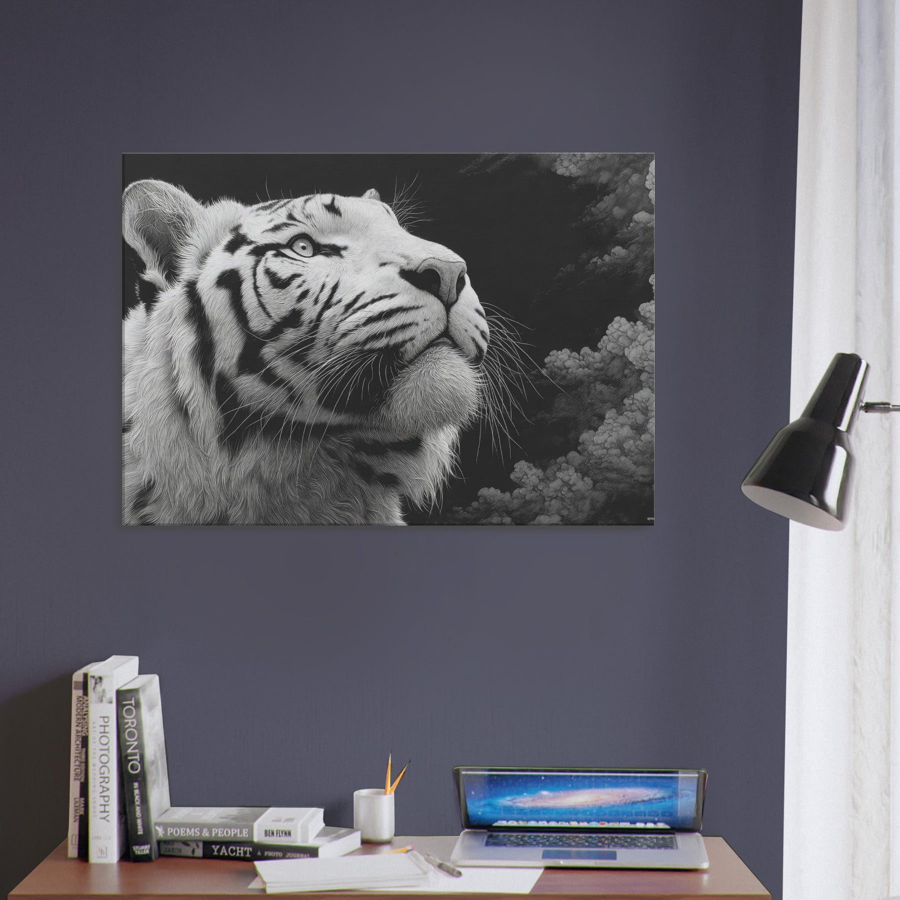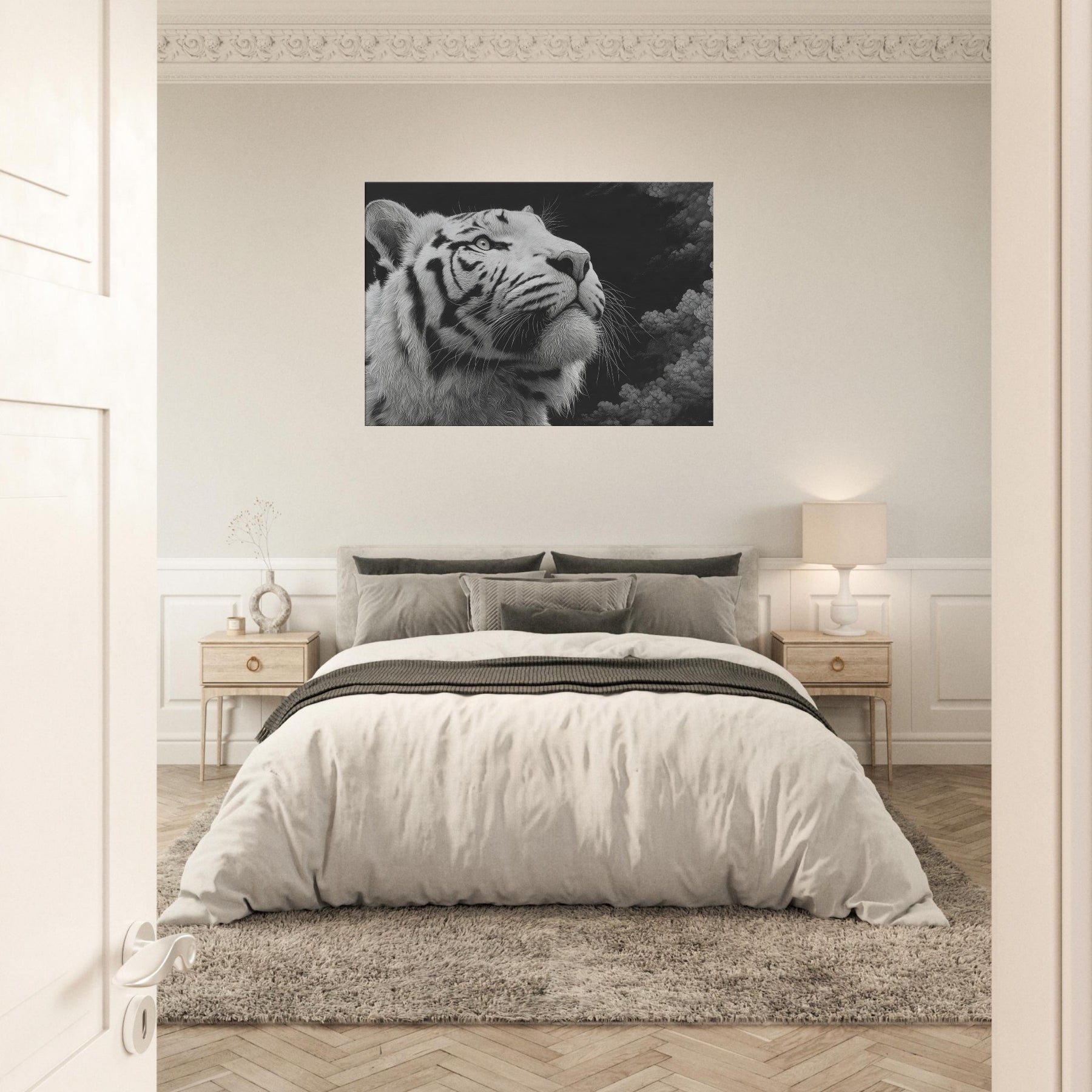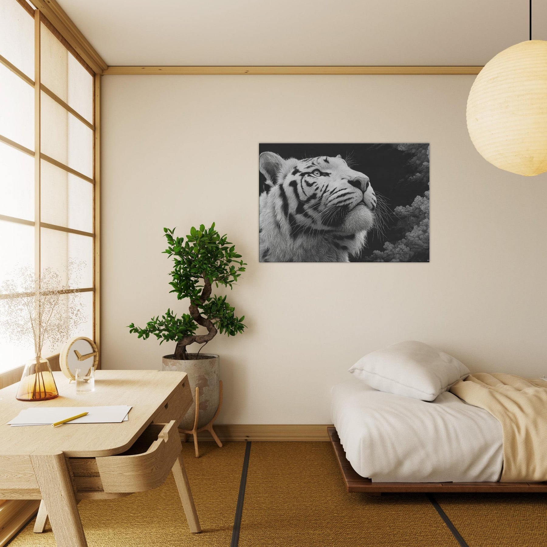 White Tiger of the West emerges in bold, quiet contrast, a celestial guardian whose gaze threads the room with ancient resolve. In black and white lines, the creature seems to drift between myth and room, inviting contemplation and quiet courage. This art feels like a moonlit threshold, turning a hallway, living room, or study into a shrine of focus and wonder. With its tactile fur and ink brushed atmosphere, it elevates space with timeless gravity while inviting guests to slow down and listen to the mythic breath of the West.