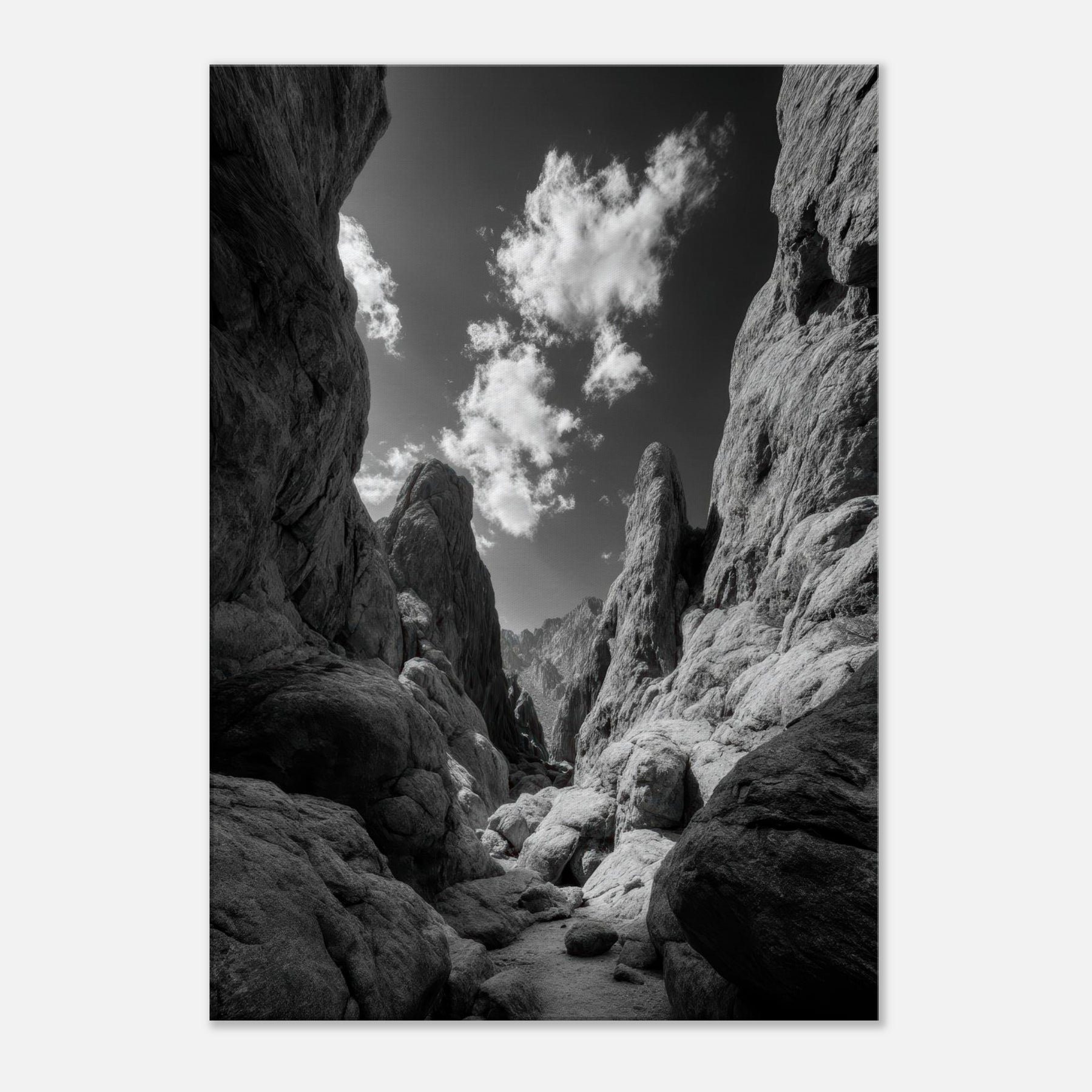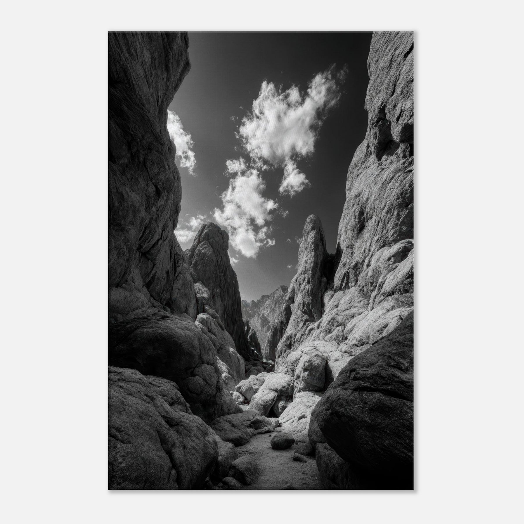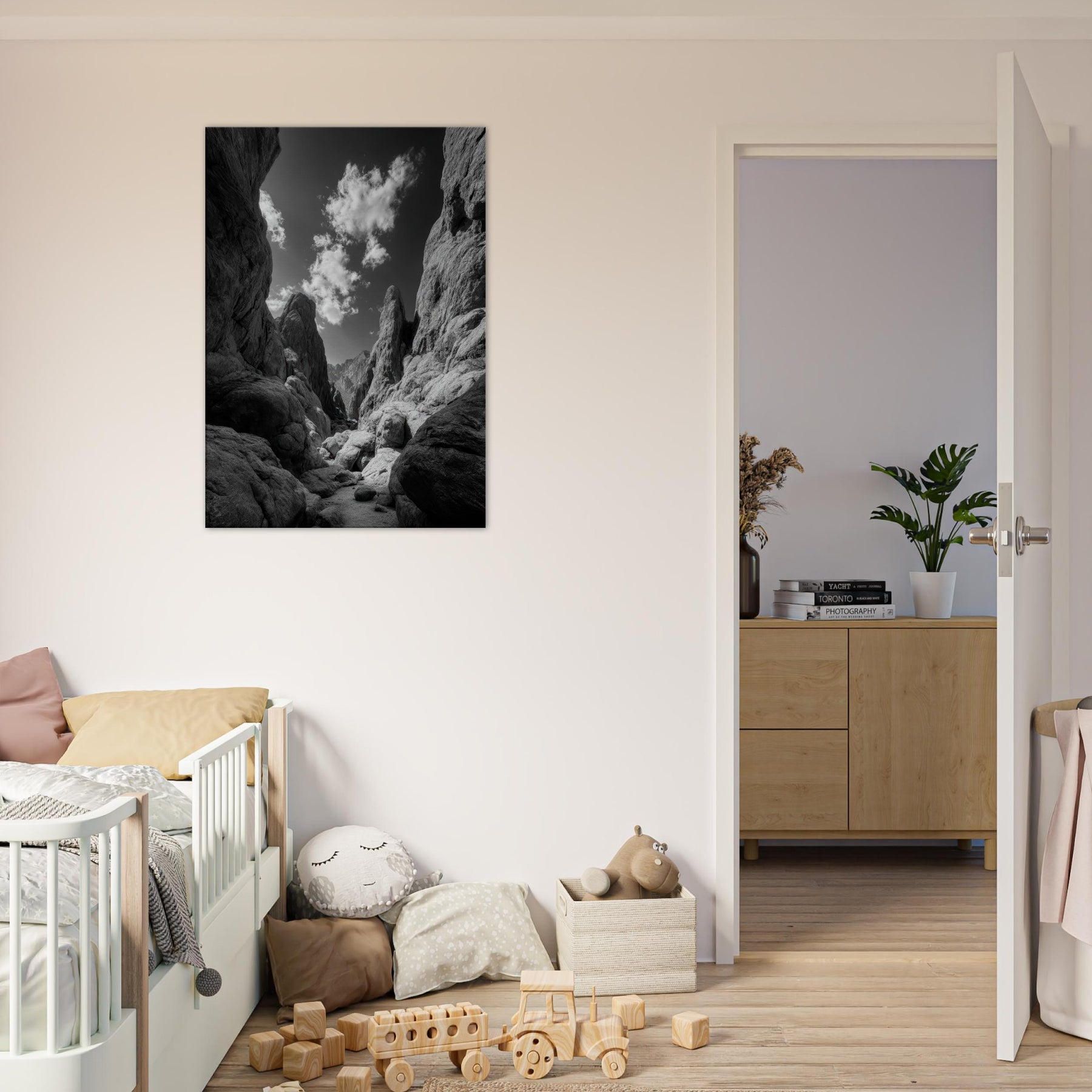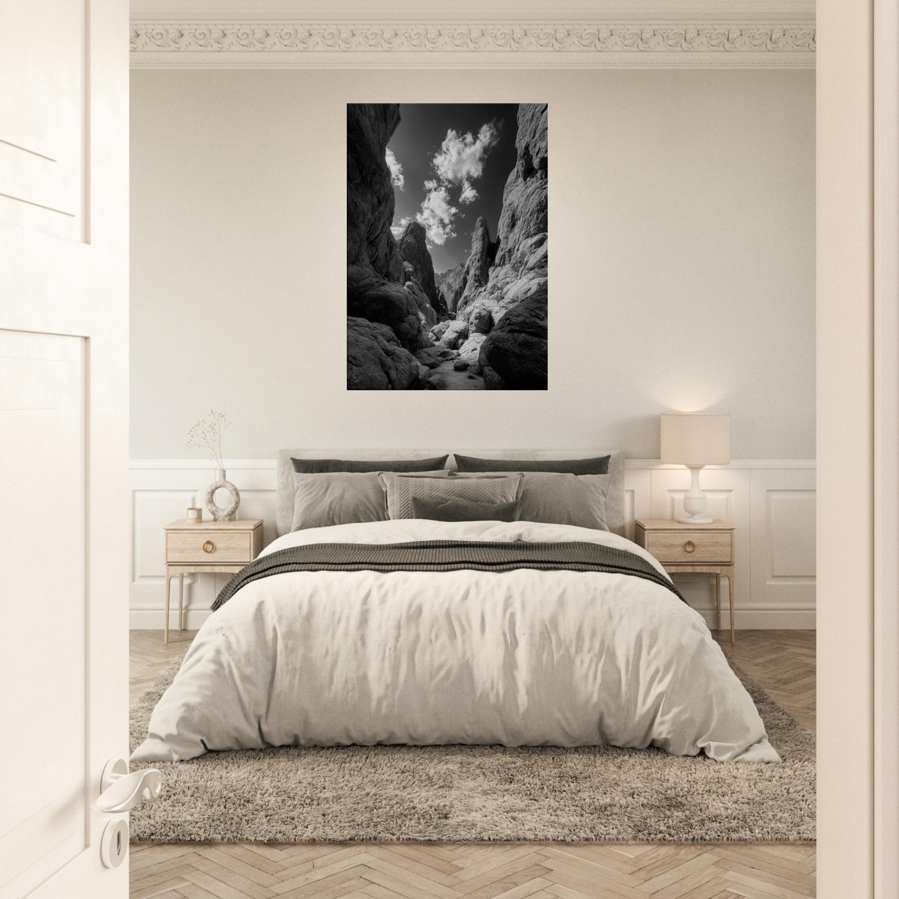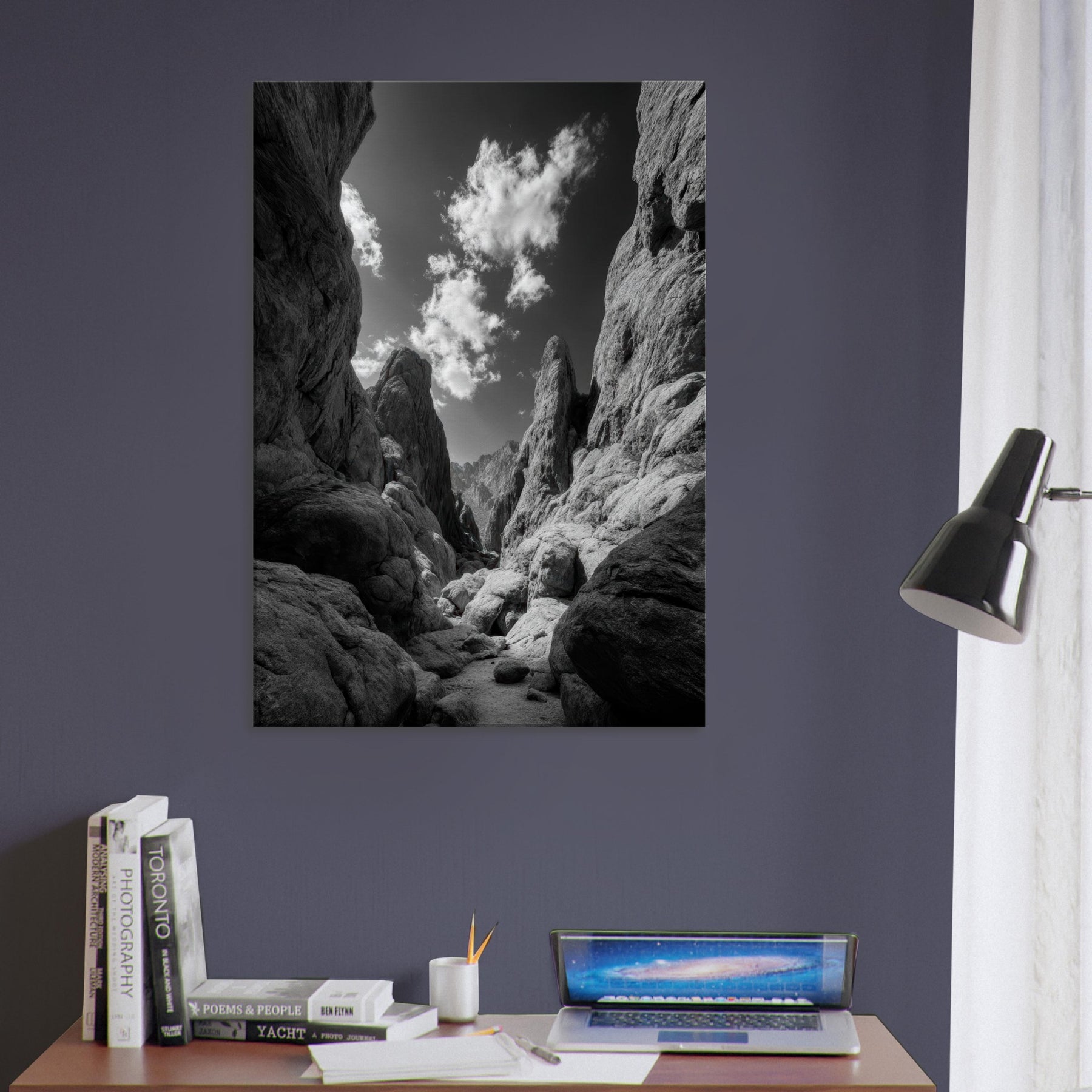 Streamlined in stark black and white, this Canyon captures the quiet drama of a sun worn gorge. The jagged rock textures, slender light, and open sky fuse into a timeless moment you can nearly hear the whisper of wind through crevices and the soft crunch of gravel beneath footfalls. Perfect above a sofa or in a serene entry, it brings nature's vast calm into your living space, inviting reflection, focus, and a refined sense of scale.