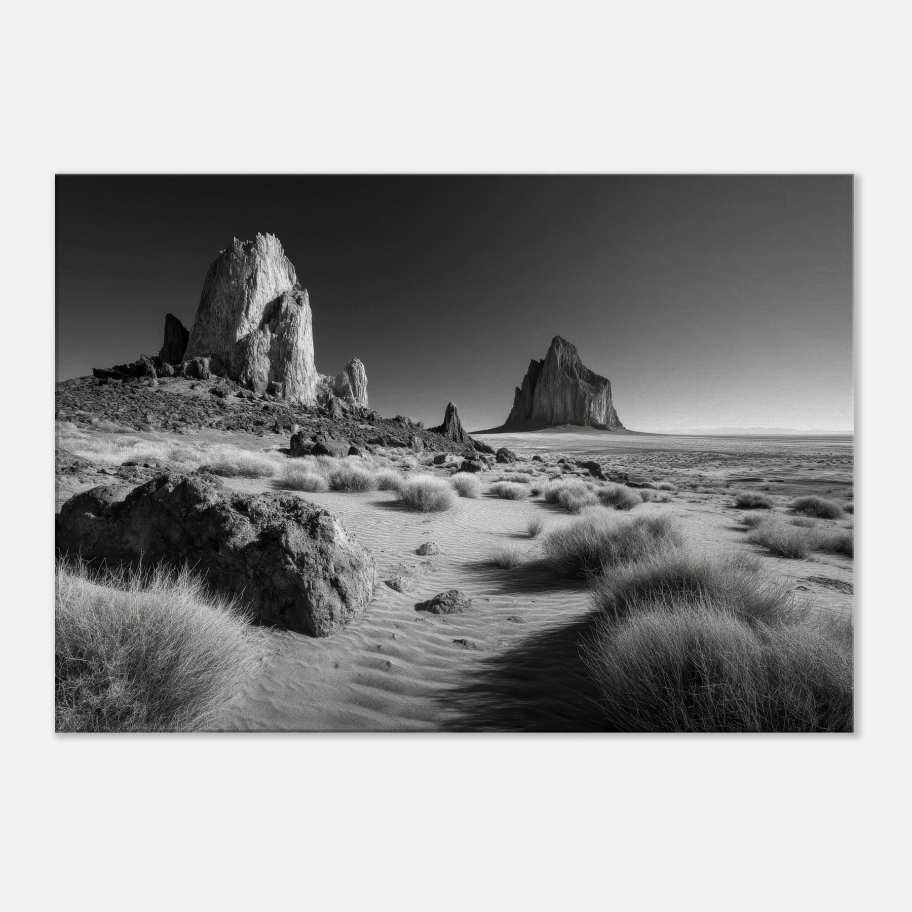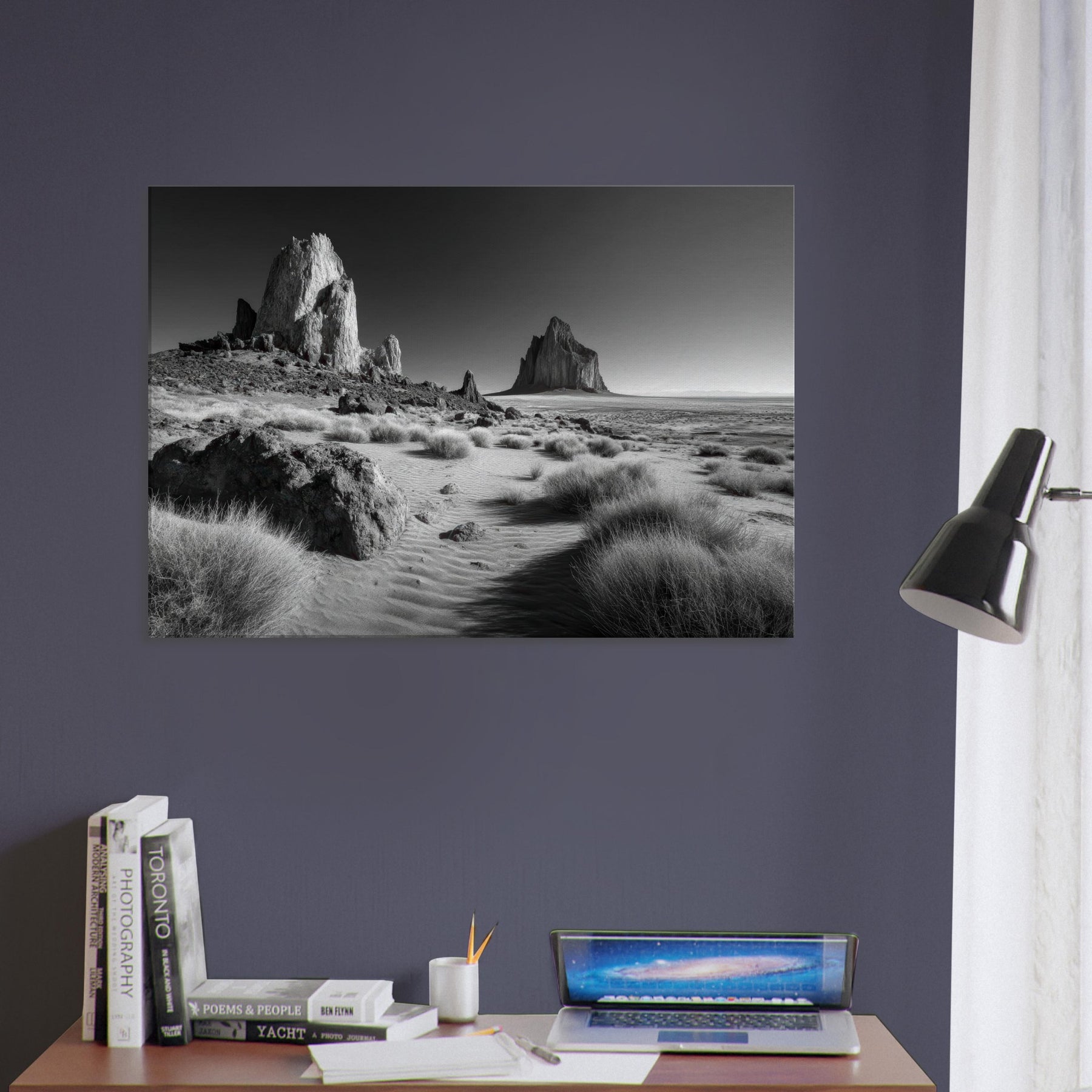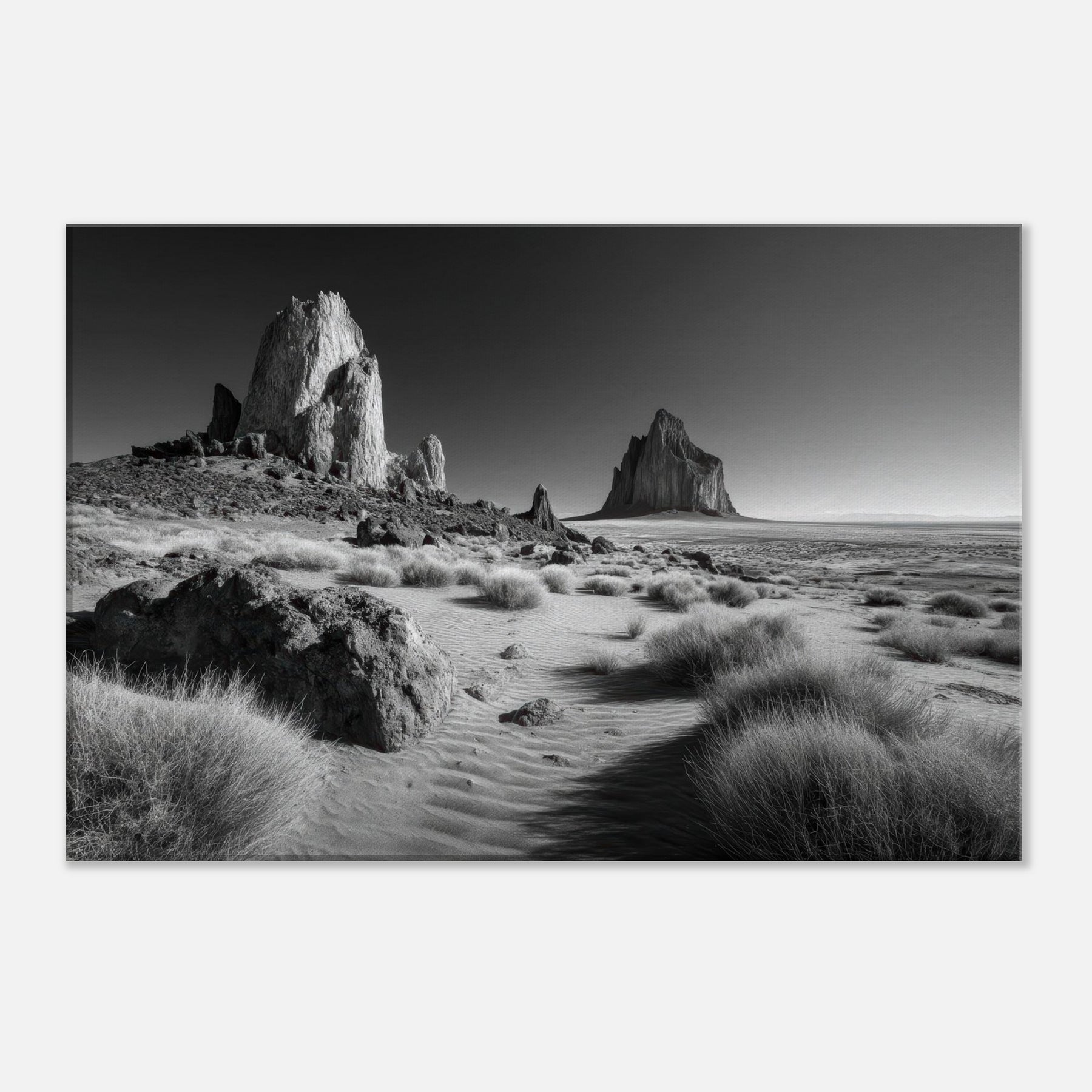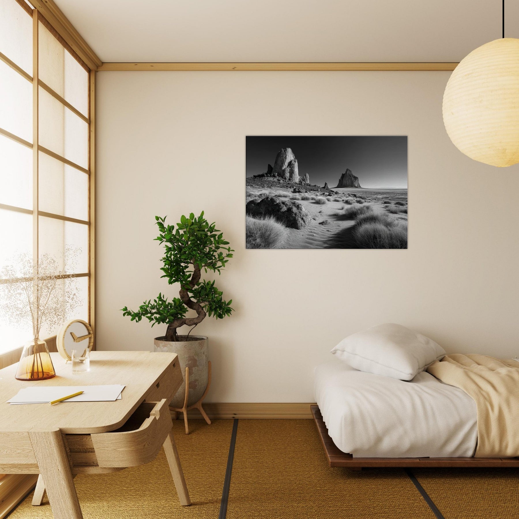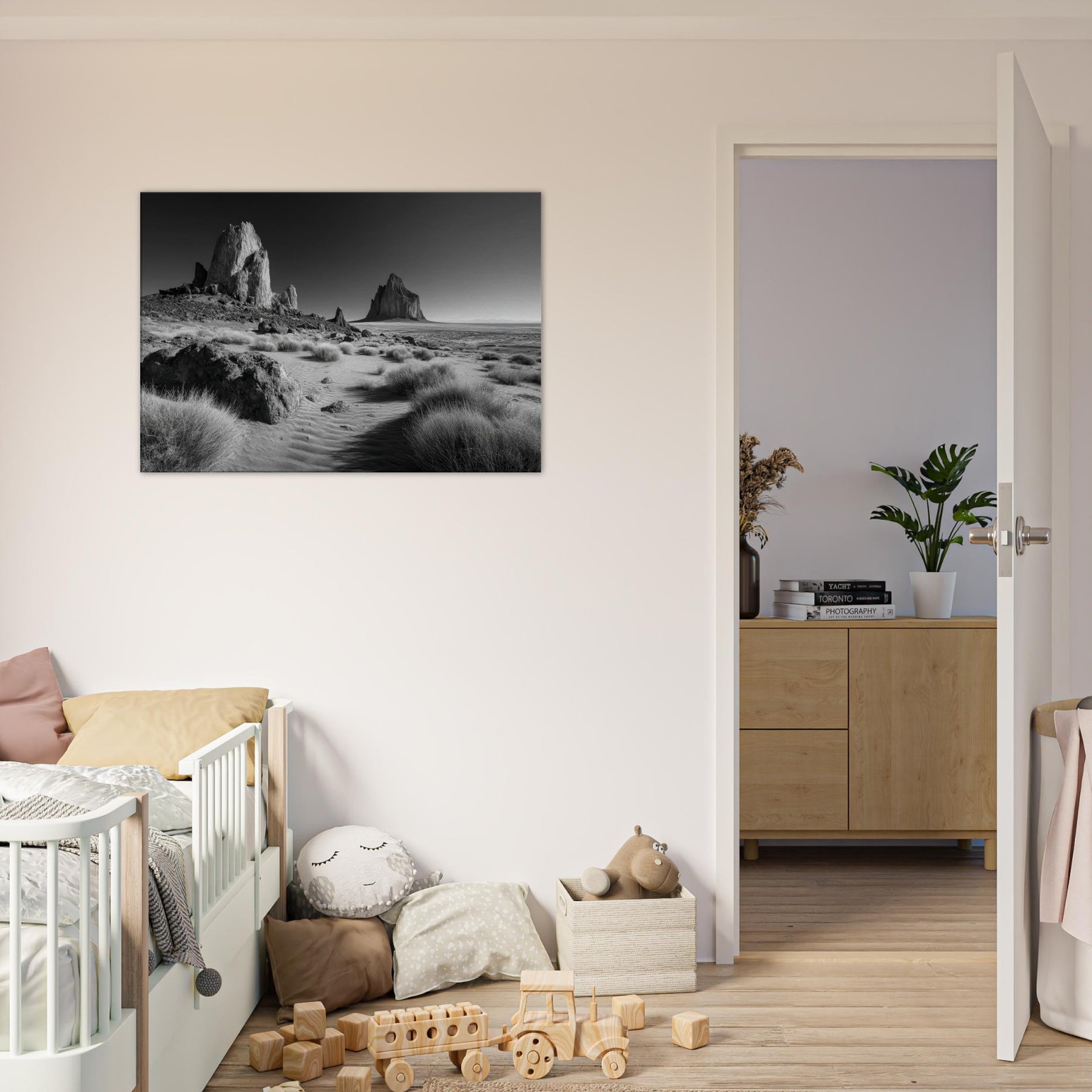 An arresting monochrome study of wind and stone, this Desert scene renders the not as heat but as memory crystal towers rise from a quiet plain, and grasses sculpt delicate shadows across the sand. The black and white palette heightens texture from weathered rocks to wind carved dunes inviting the room to breathe with stillness and depth. In a living space, it becomes a calm focal point a horizon you can walk into, a moment of solitude rendered into art.