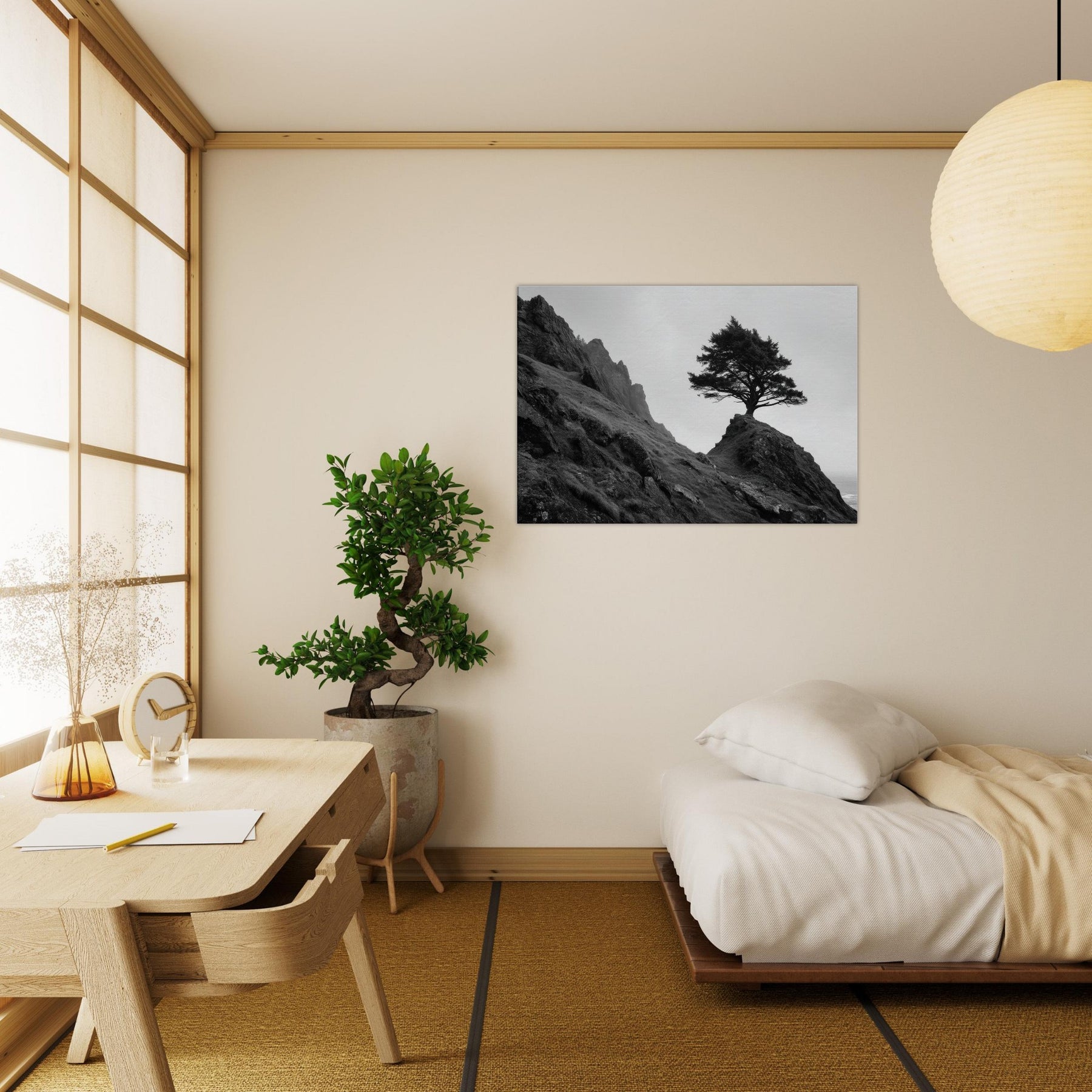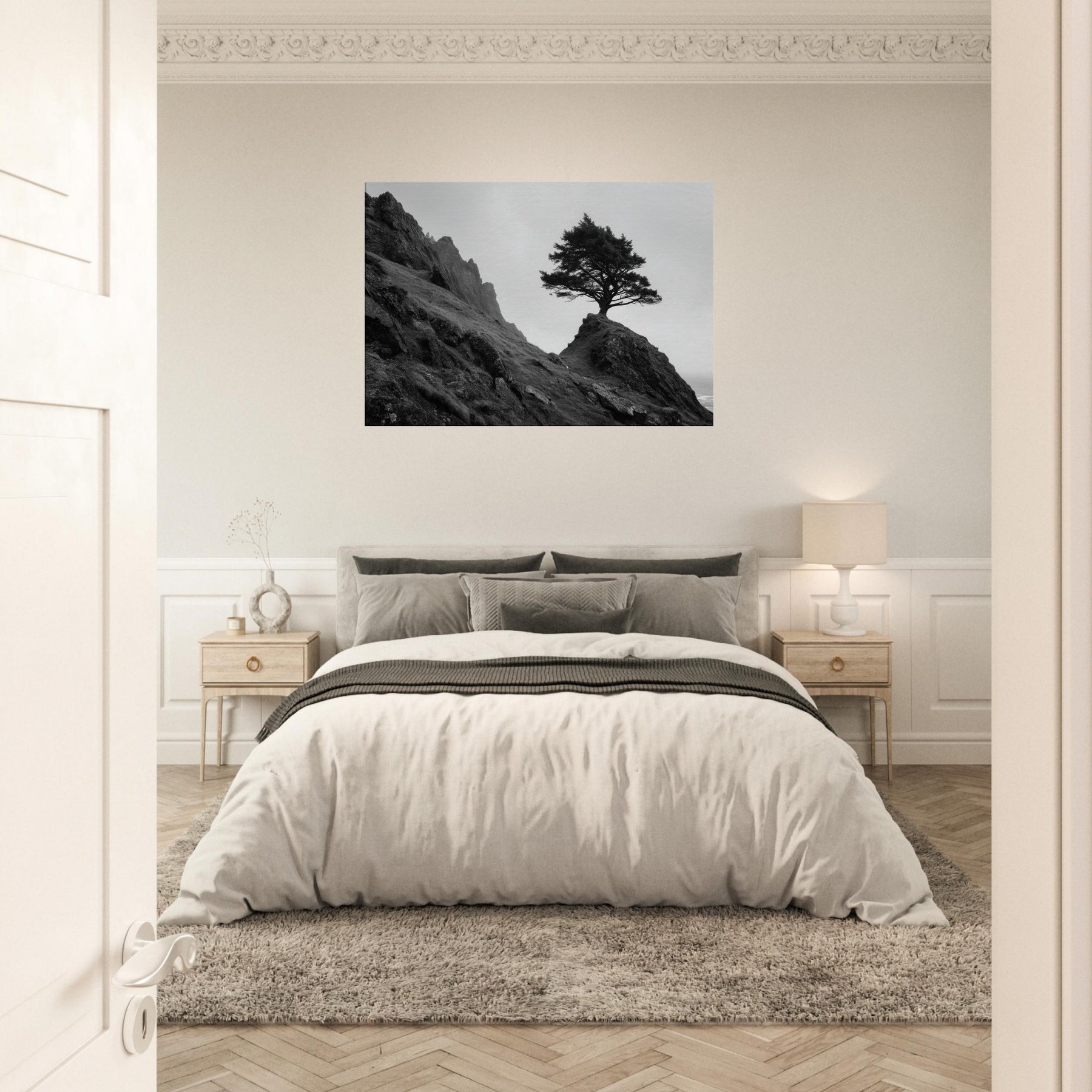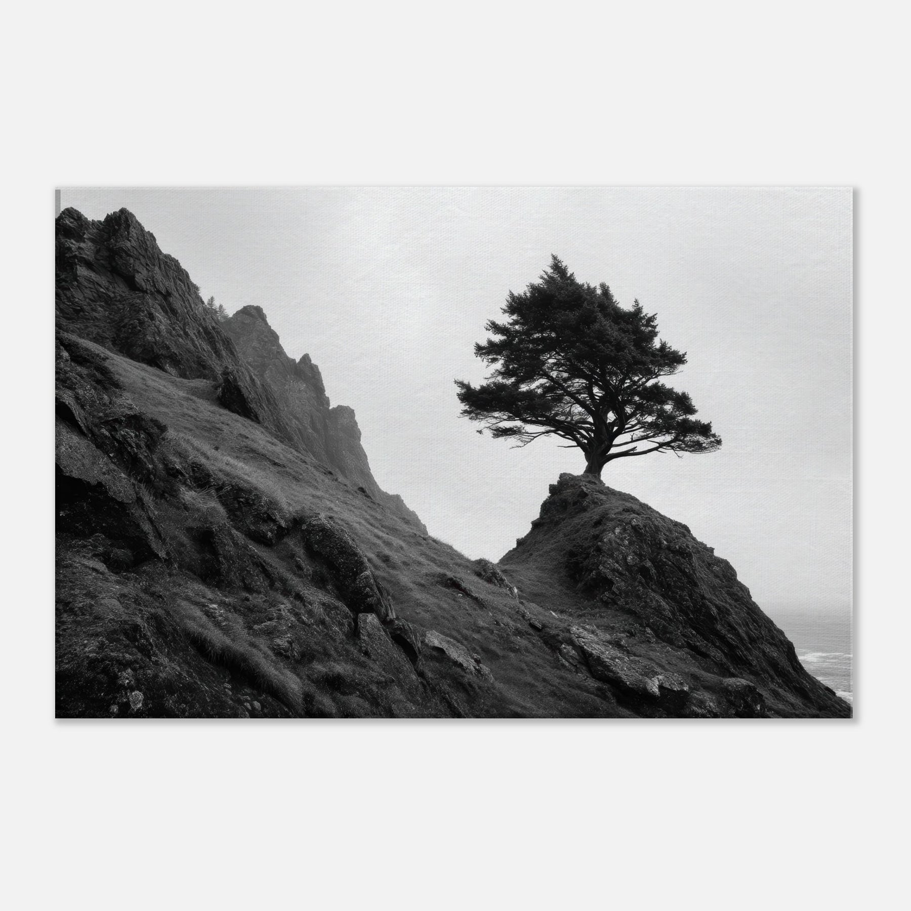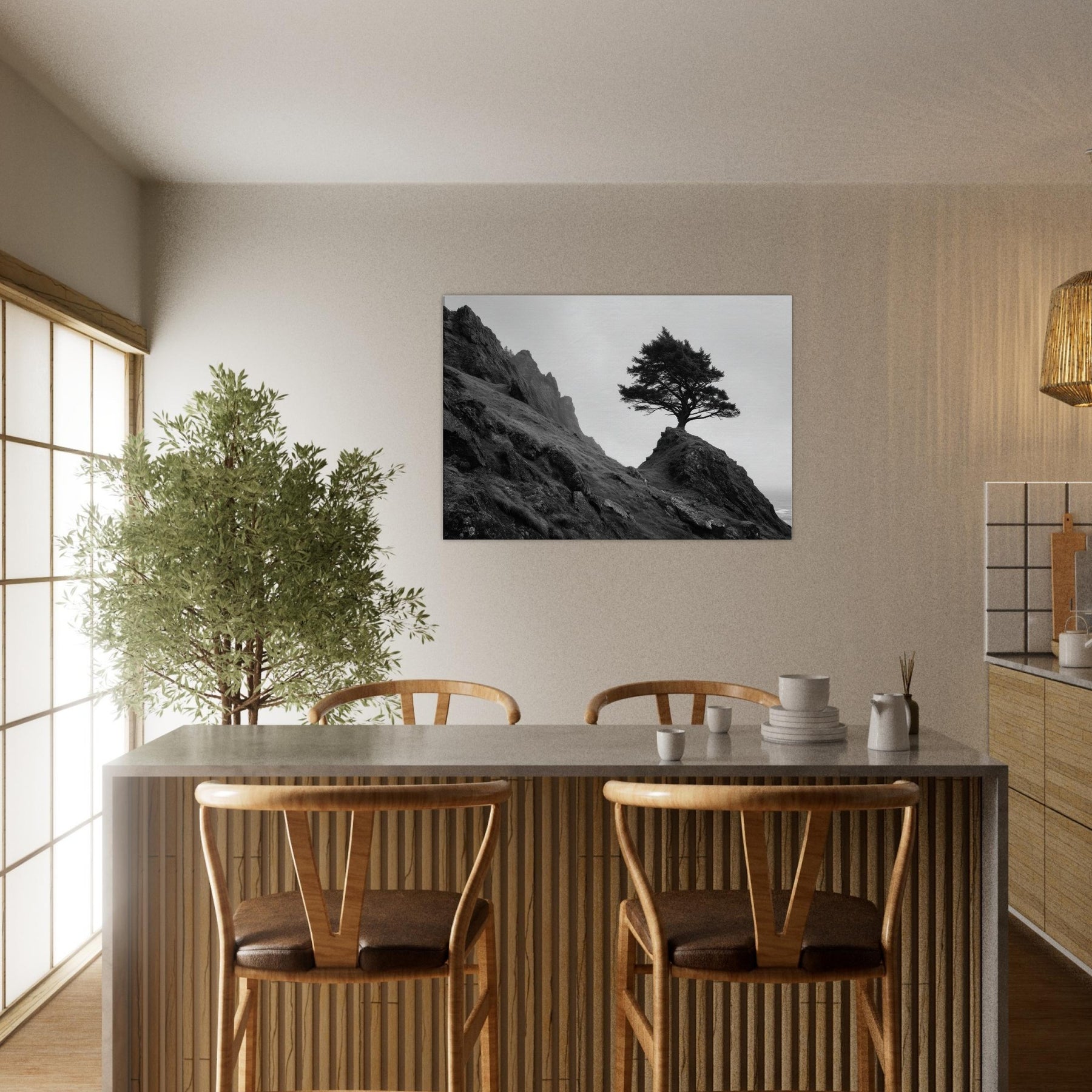 In monochrome, the cliffs loom with weathered grace, and a solitary tree clings to a windswept ridge. The composition invites pause, with tonal gradations from deep shadow to pale light, like breath across stone. This wall art lends a calm, dramatic focal point to living spaces, pairing modern simplicity with rugged nature. It conjures coastal wind, salt, and silence, transforming any room into a contemplative retreat.