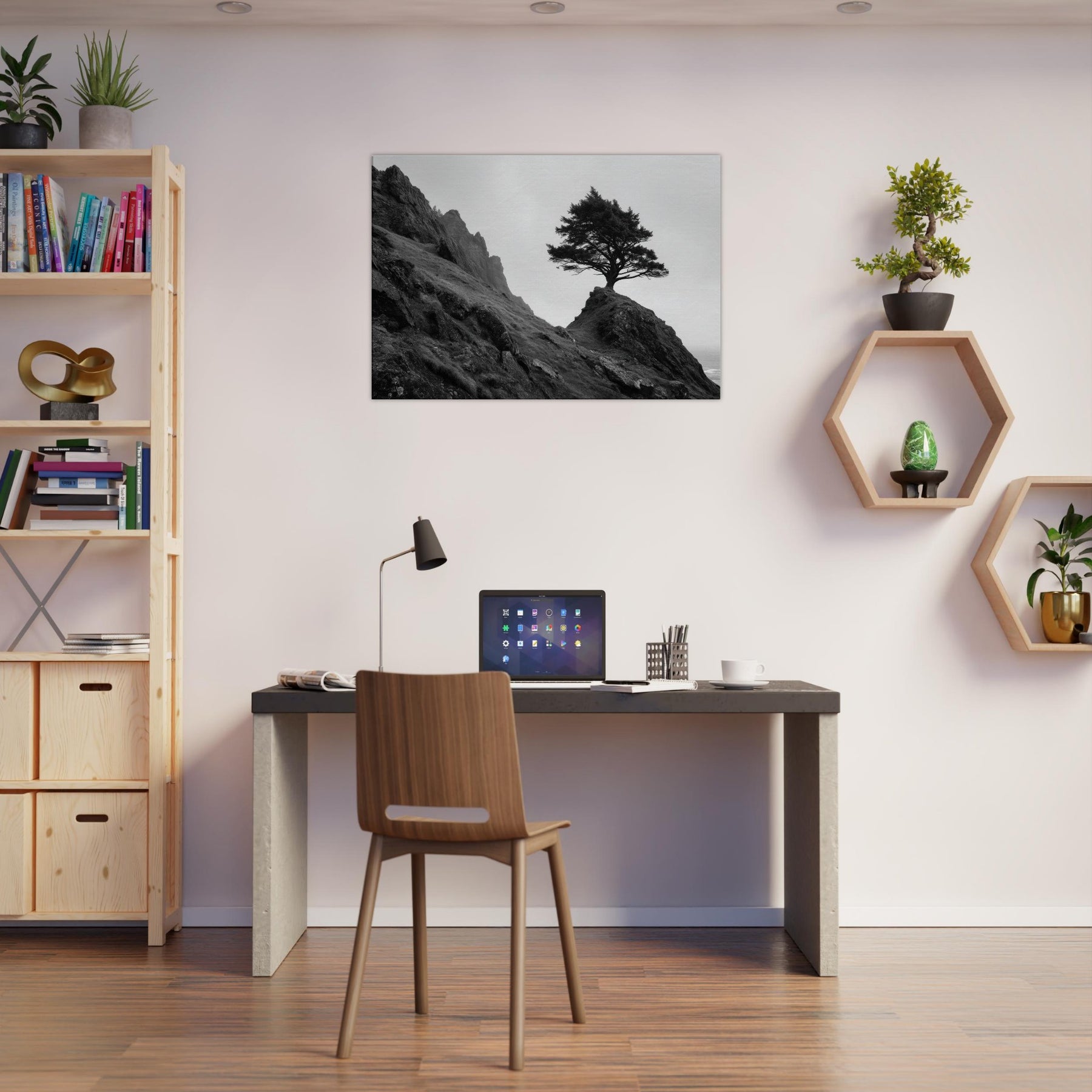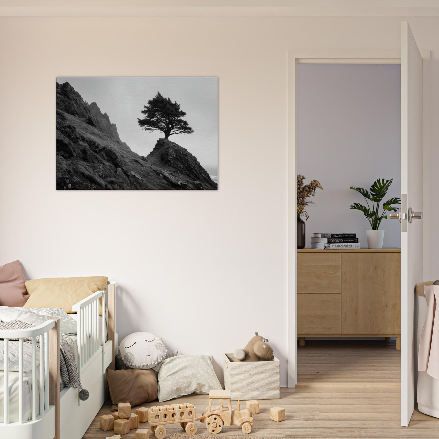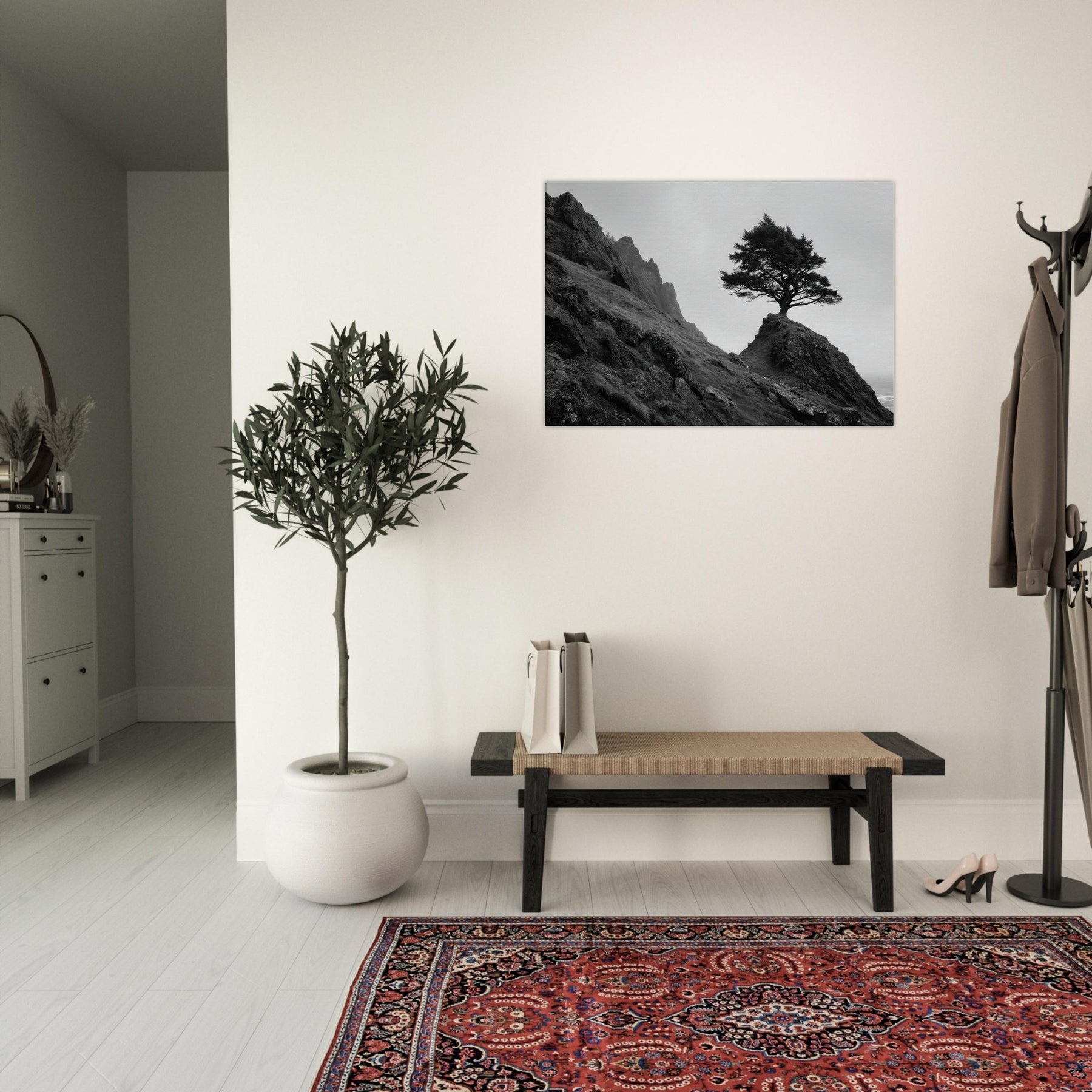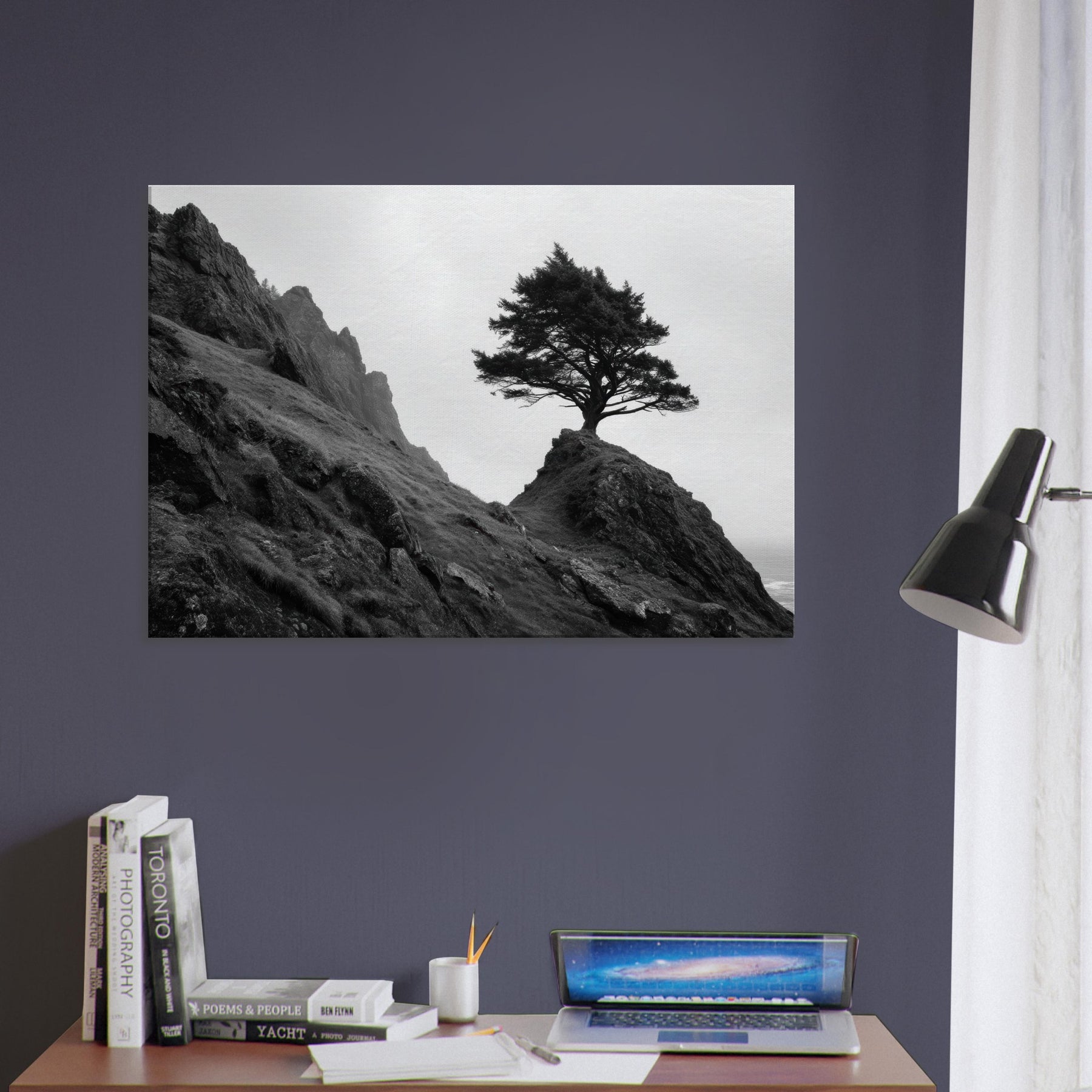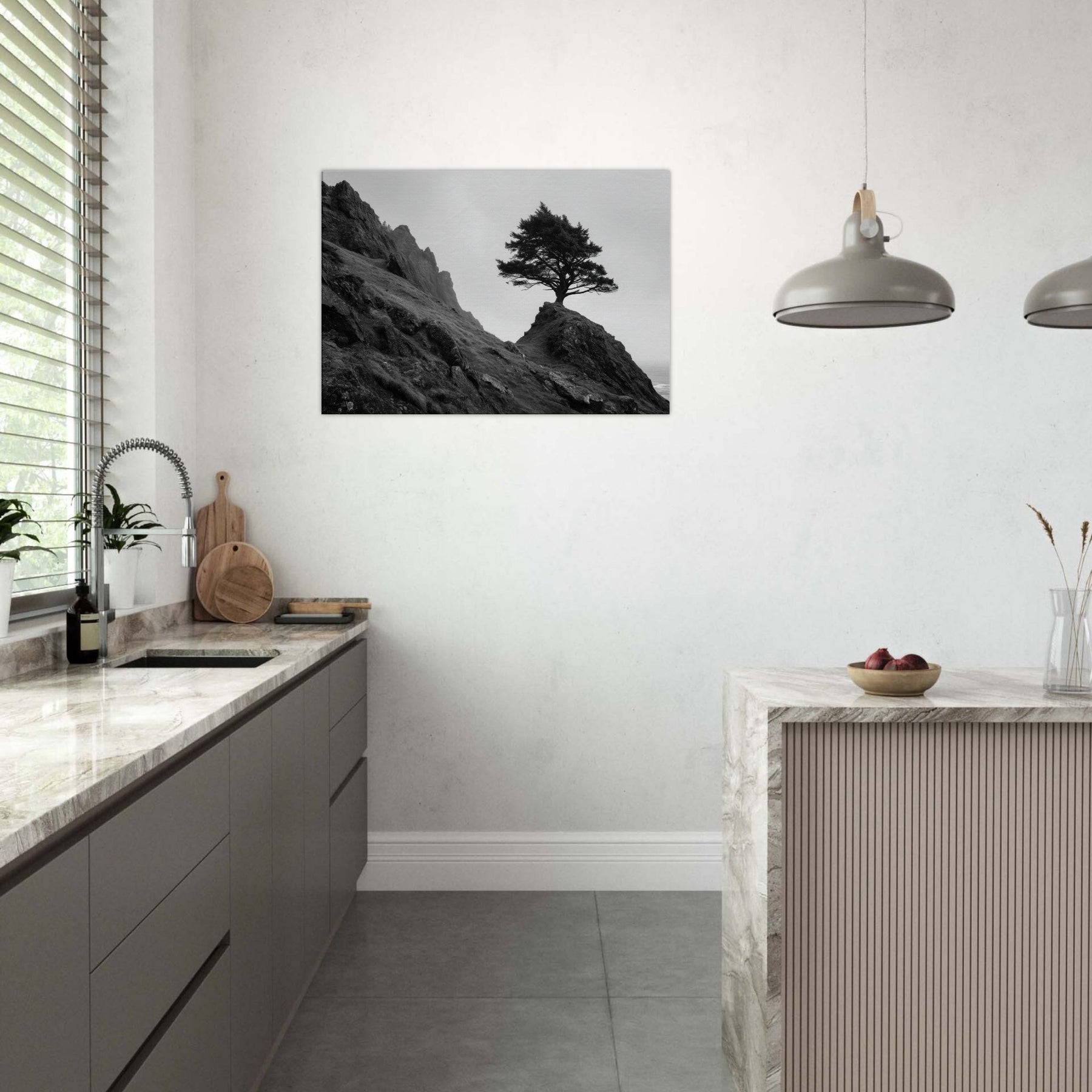 In monochrome, the cliffs loom with weathered grace, and a solitary tree clings to a windswept ridge. The composition invites pause, with tonal gradations from deep shadow to pale light, like breath across stone. This wall art lends a calm, dramatic focal point to living spaces, pairing modern simplicity with rugged nature. It conjures coastal wind, salt, and silence, transforming any room into a contemplative retreat.