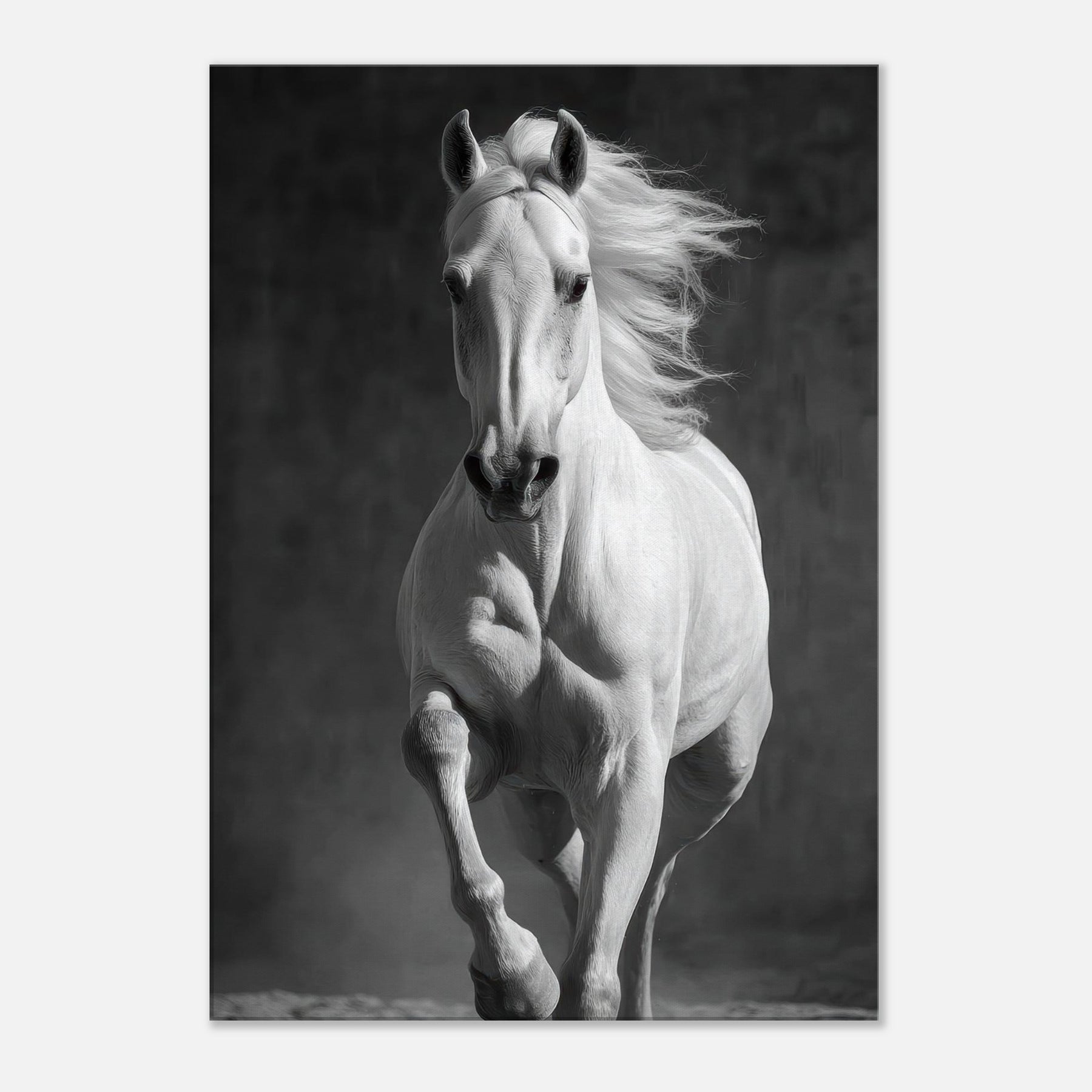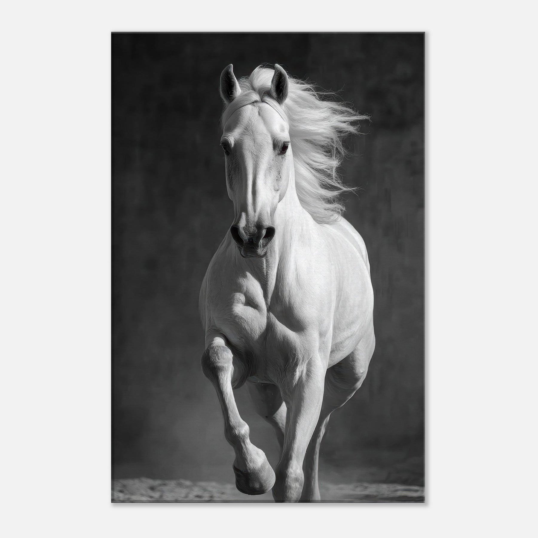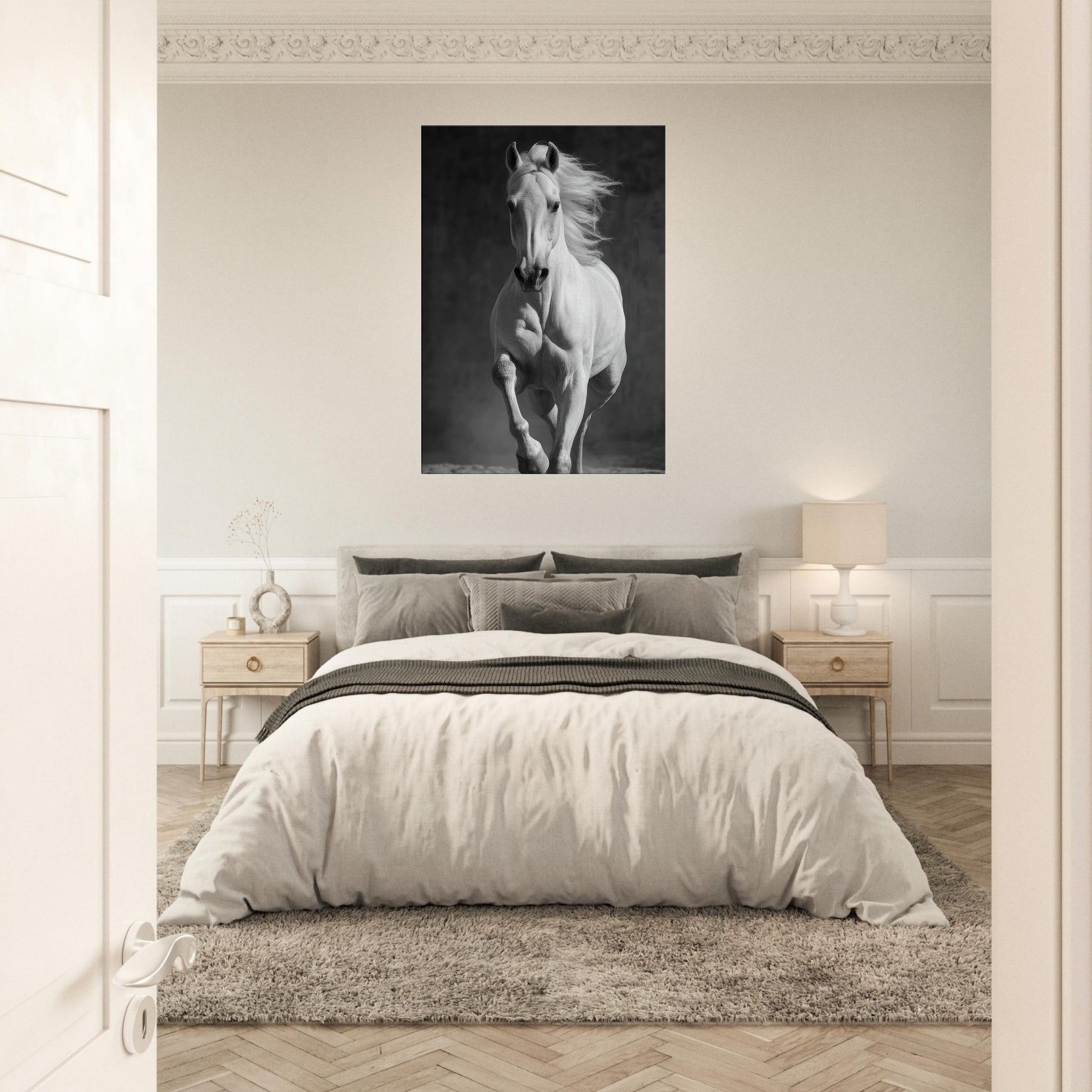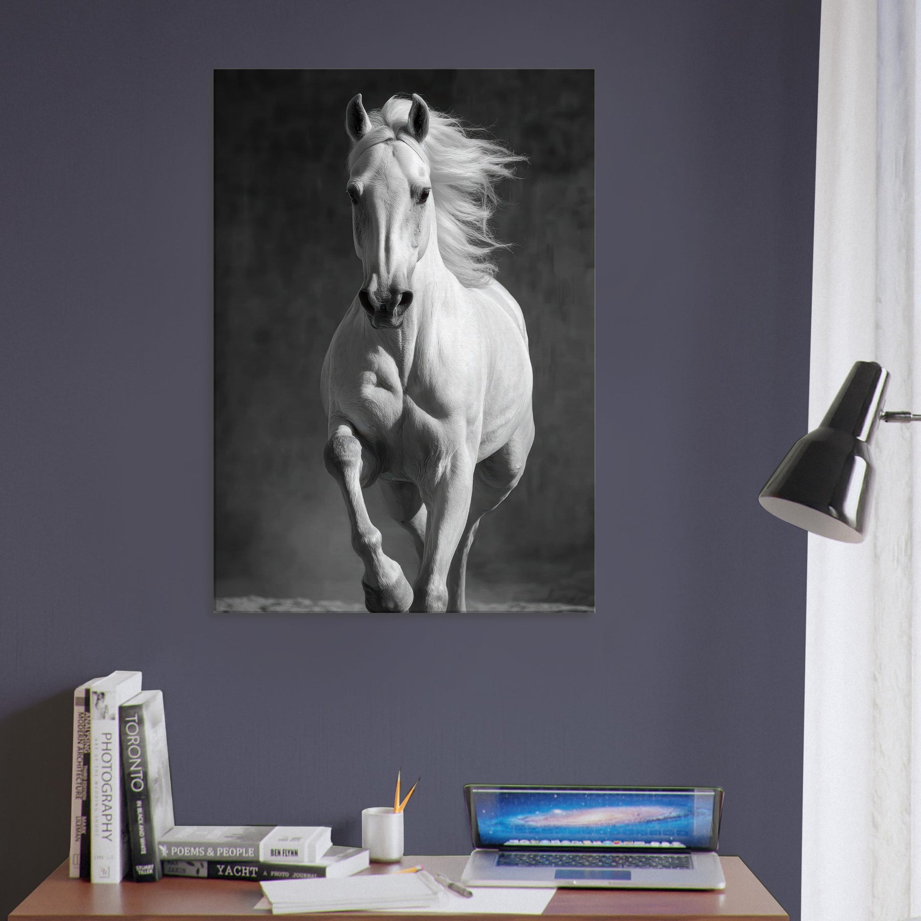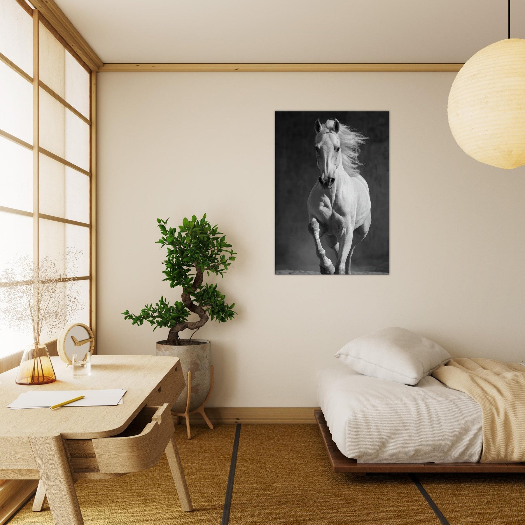 A living room centerpiece that moves with quiet power, this black and white horse captures speed and grace in a single, delicate line. The horse charges forward with wind tossed mane, every contour etched in luminous shadow, inviting warmth and reflection. In monochrome, the image feels timeless and poised, pairing bold texture with serene minimalism. Hang it to frame conversations, anchor a seating area, or elevate a hallway with a breath of wild, refined energy. The horse anchors the room with quiet majesty.