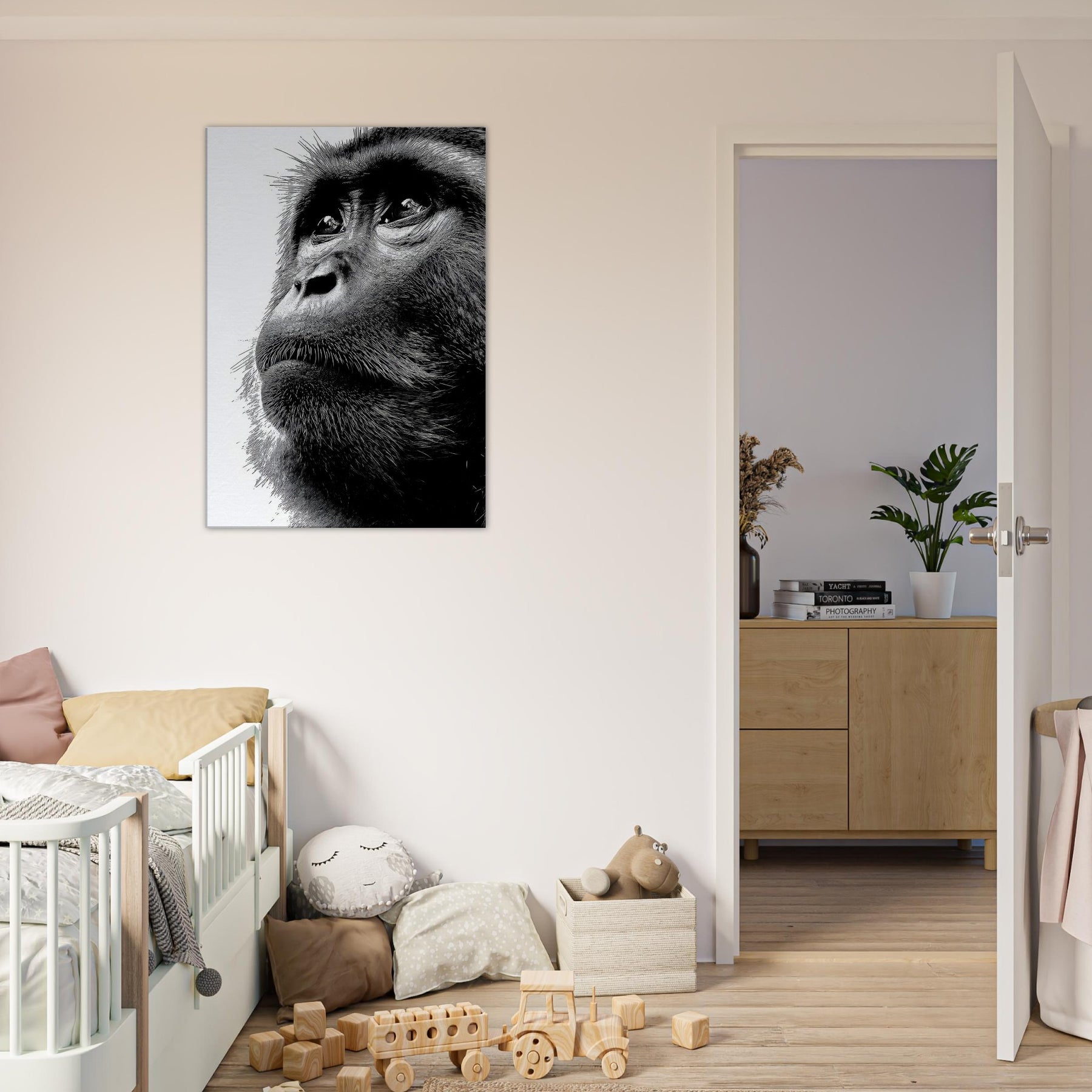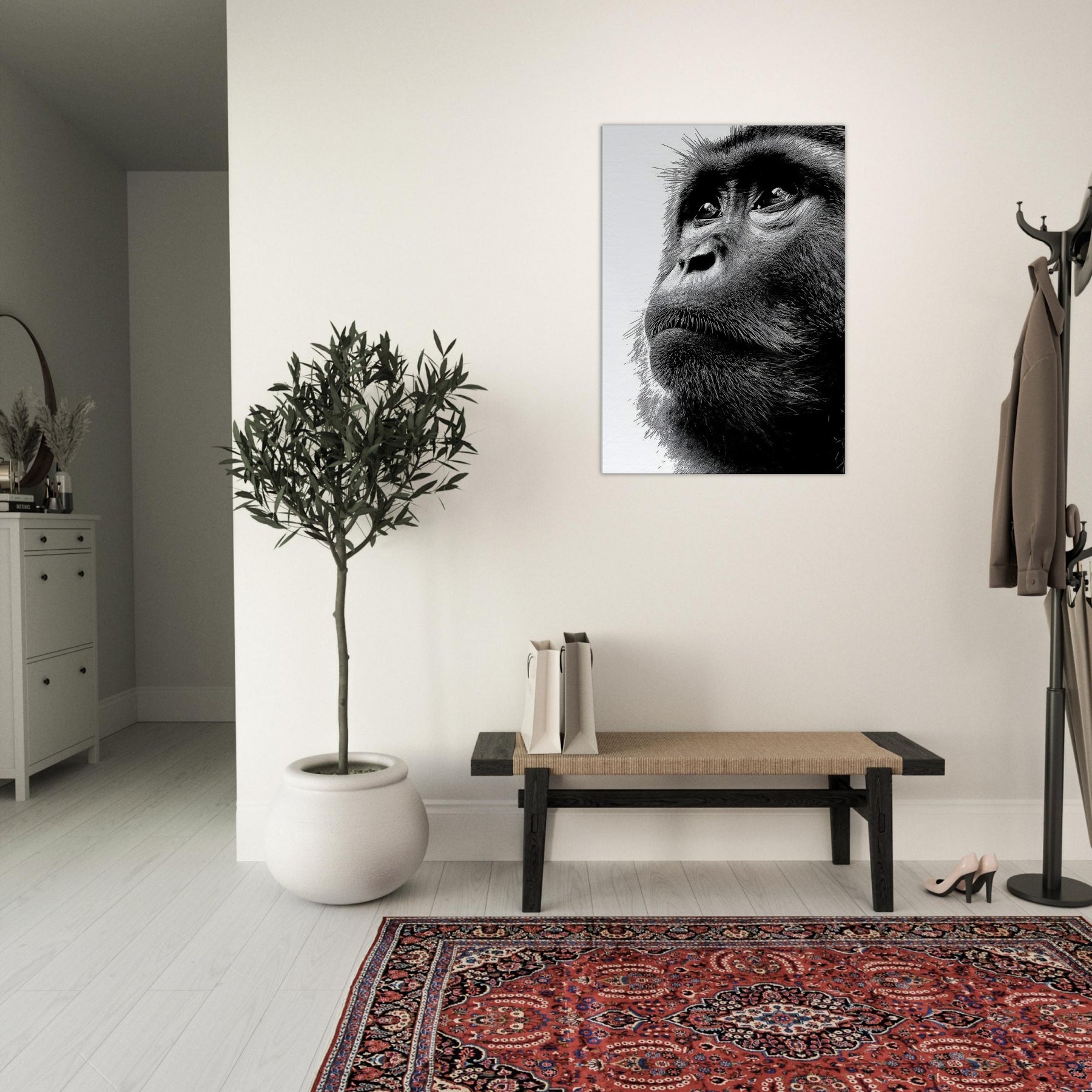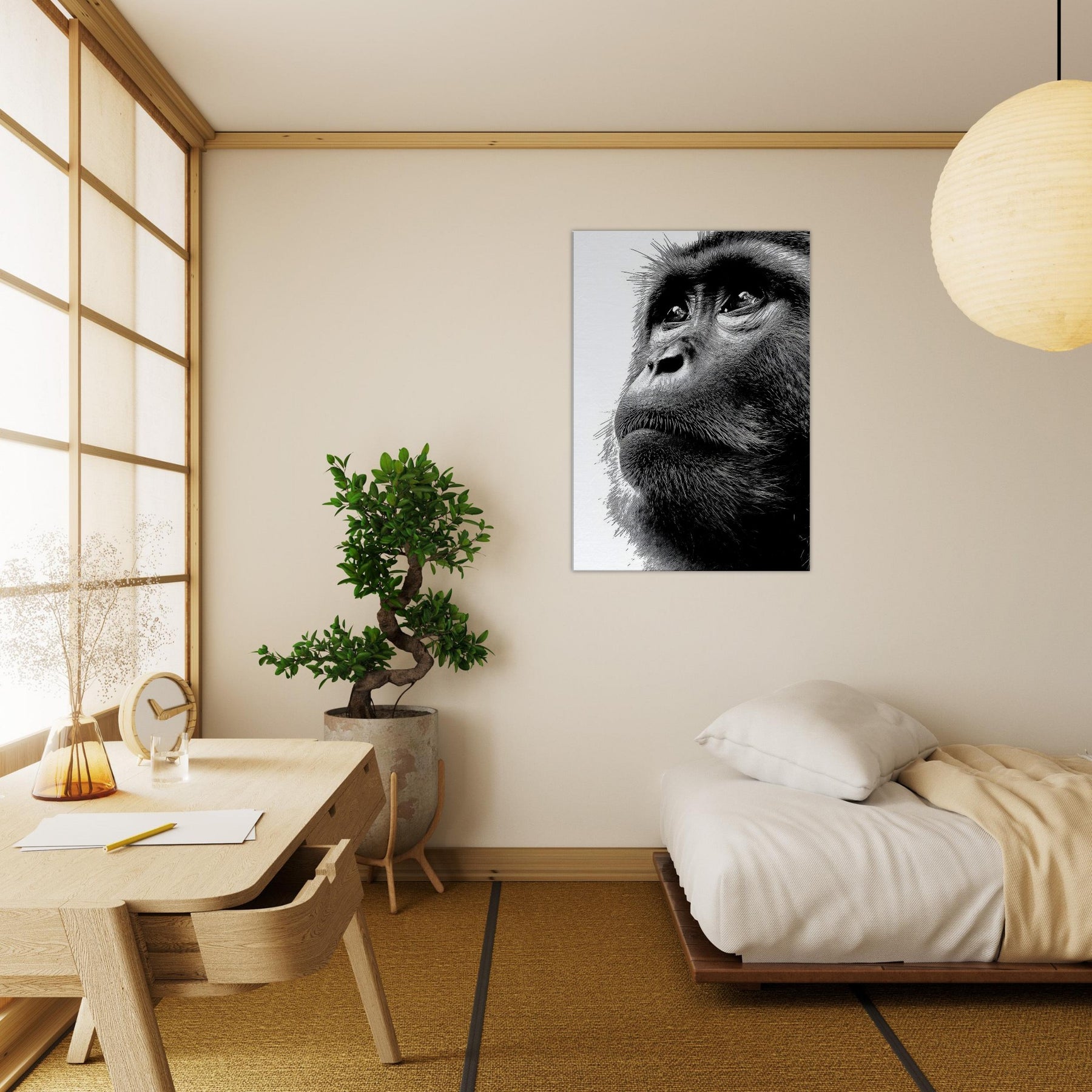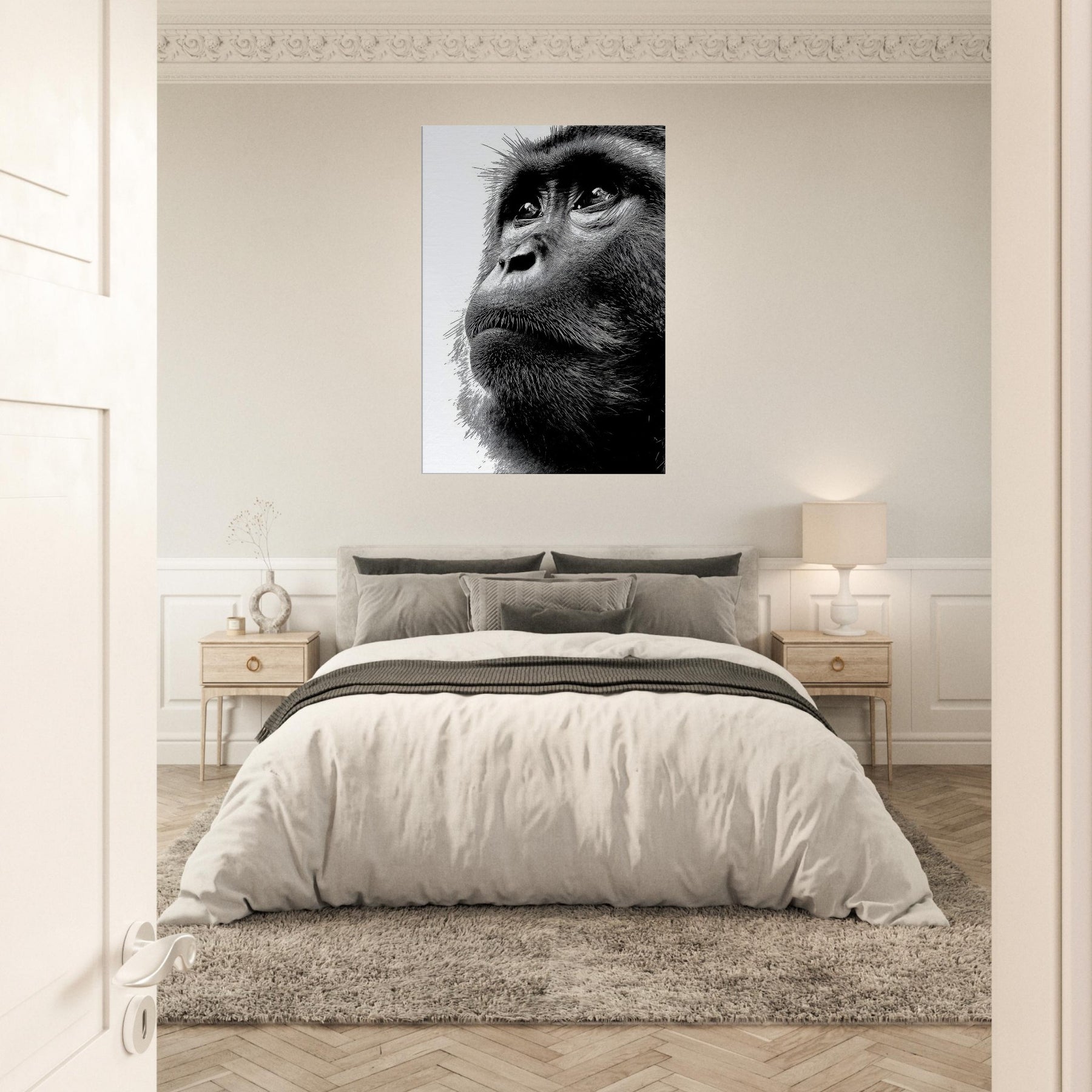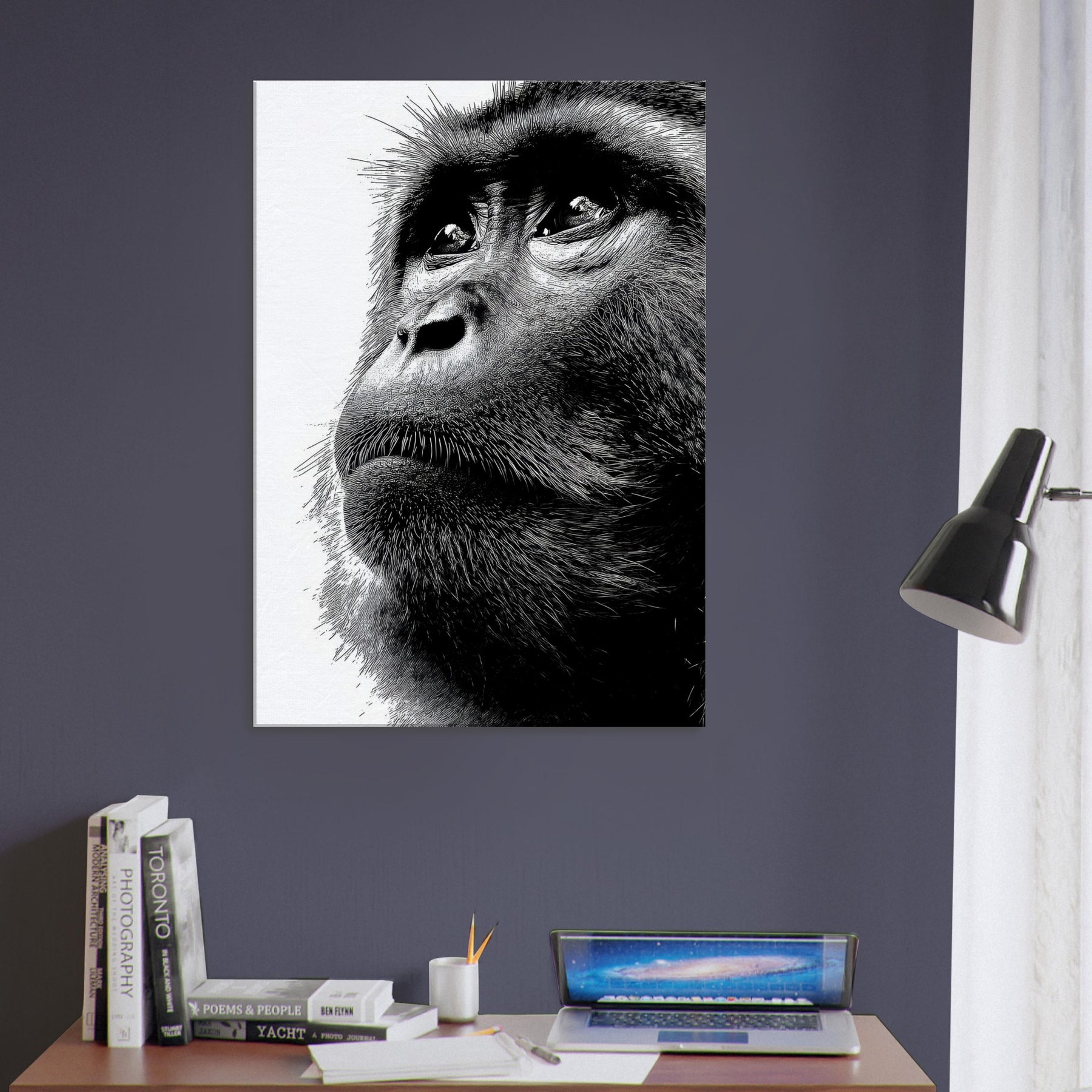Immersed in stark contrast, this close up captures a contemplative monkey in a sweep of ink black lines and negative space. The image breathes with quiet, nocturnal presence, inviting the viewer to slow down and study every tendril of fur and glint of eye. Hung in a living room or study, it casts a refined, cinematic atmosphere, an elegant reminder of wit and wonder. The piece pairs well with mid century wood tones or cool neutrals, turning walls into a contemplative focal point.