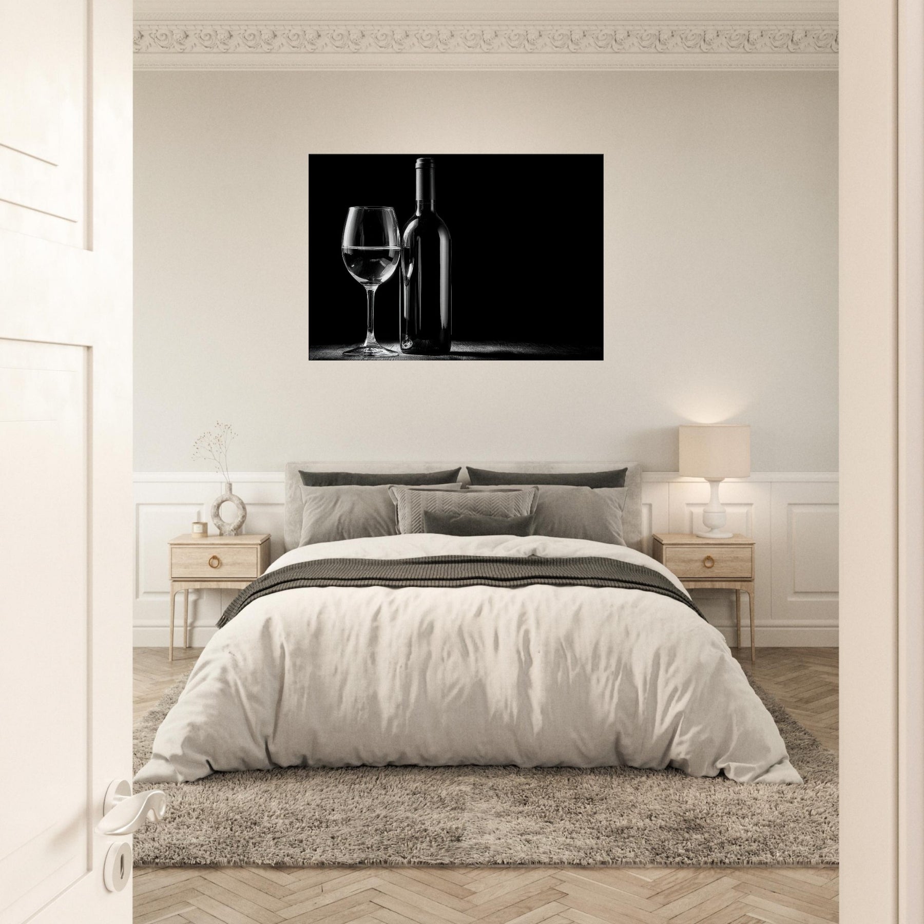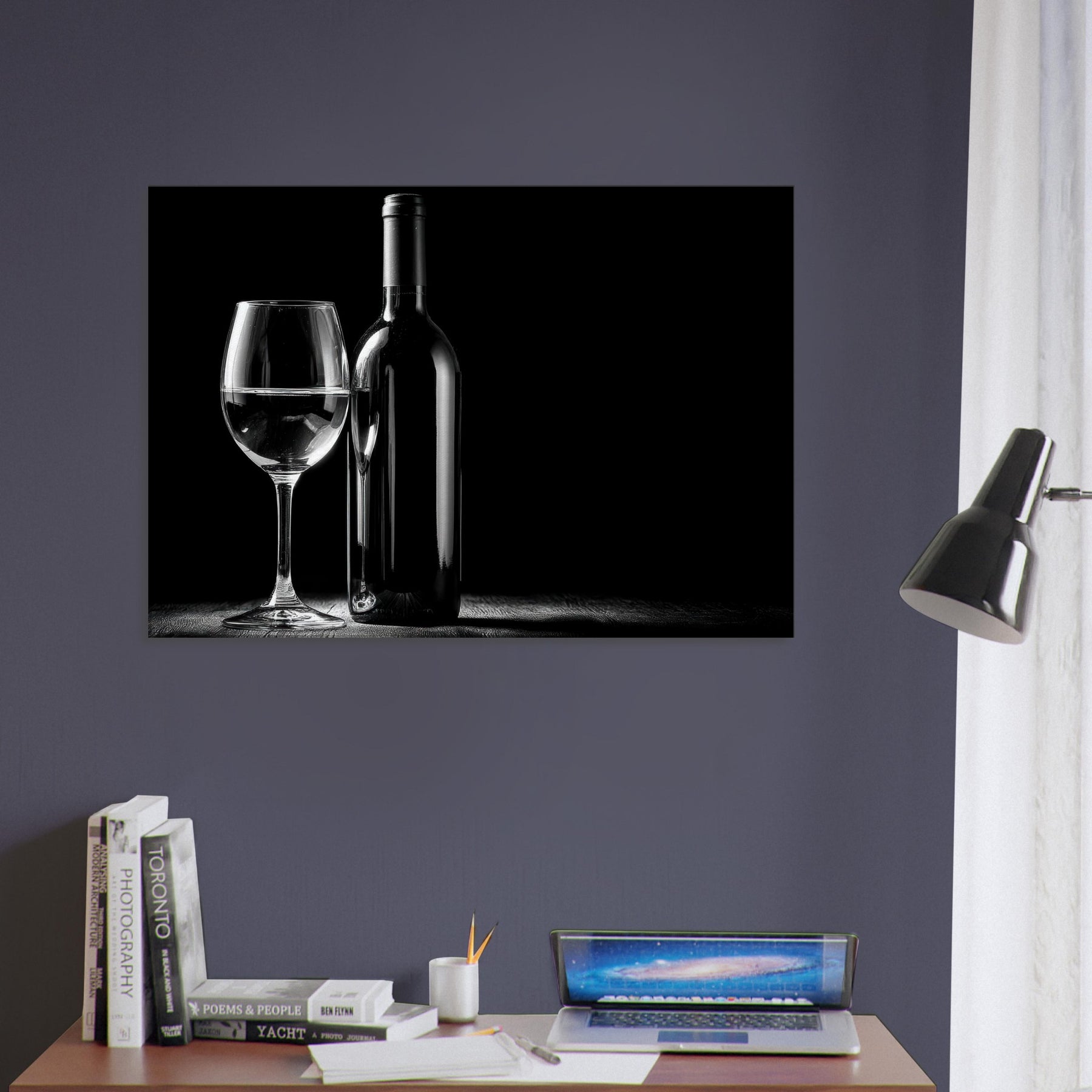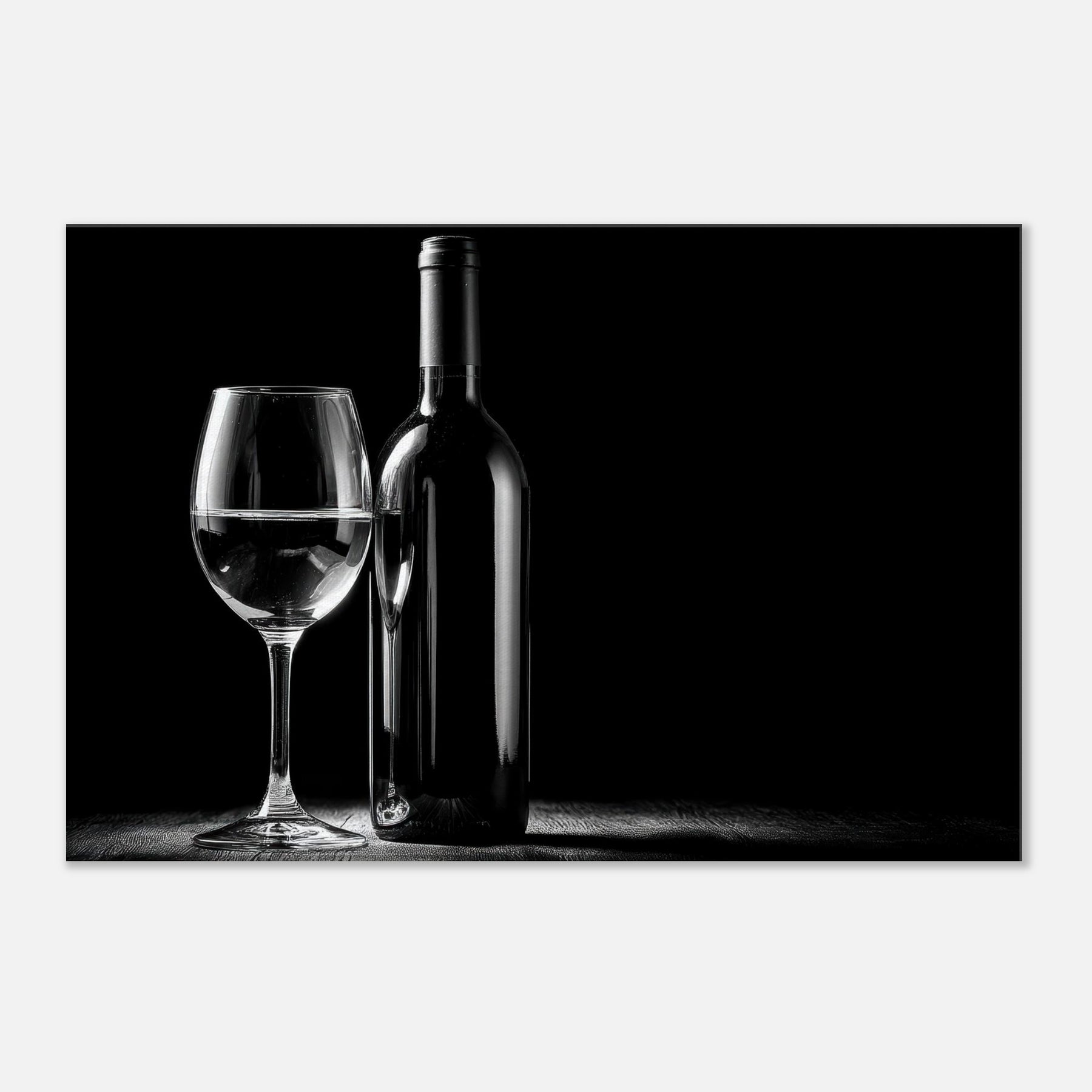 An intimate study in contrast, this black and white composition centers a Wine Bottle And Glass, a quiet toast captured in a single, unhurried moment. The gleam of the glass and the bottle’s poised silhouette invite a slower mood into any living space. It evokes evenings of candlelight and conversation, where every detail the slender neck, the weight of the stem is savored. Place it near a window or above a sofa to mirror sophistication, simplicity, and timeless elegance.
