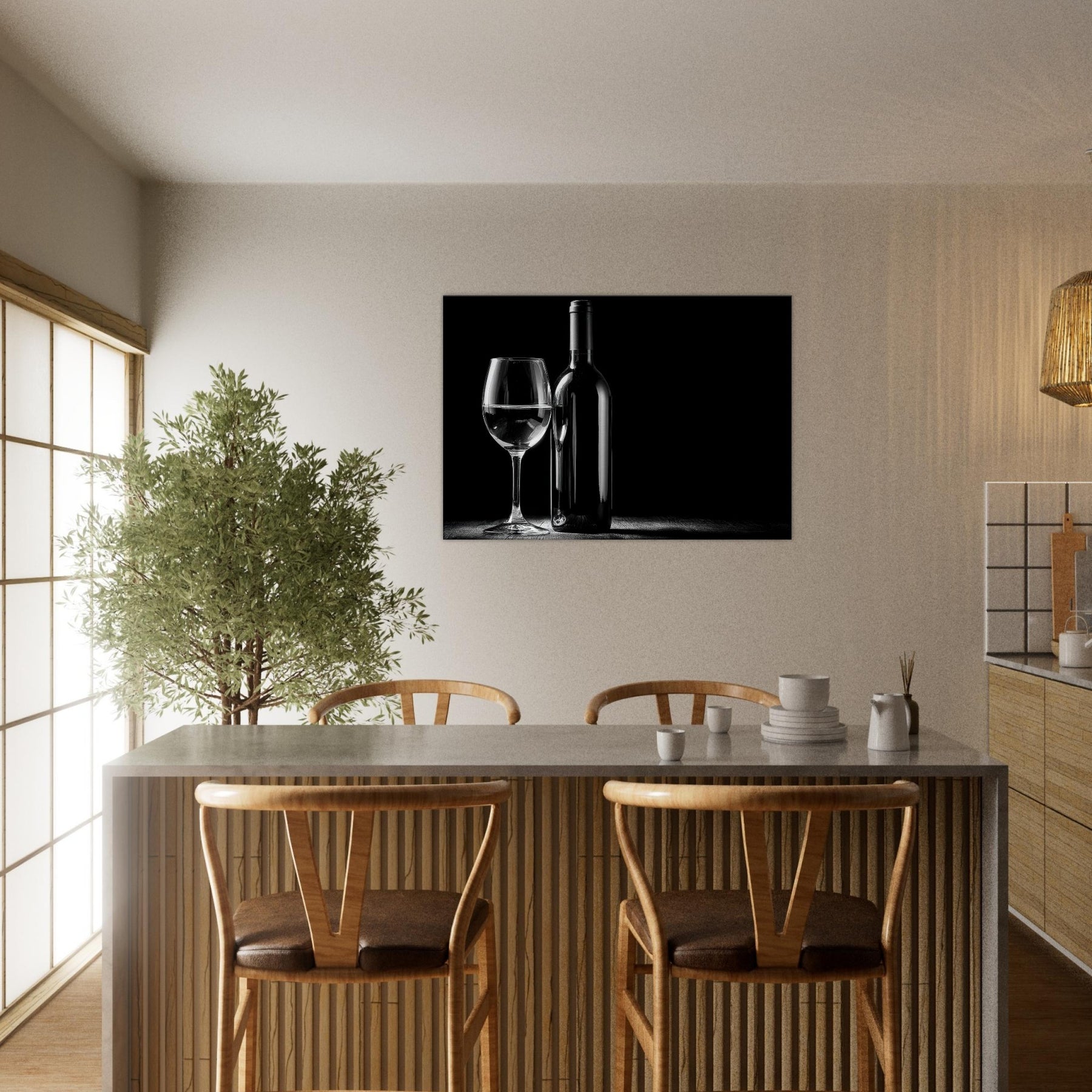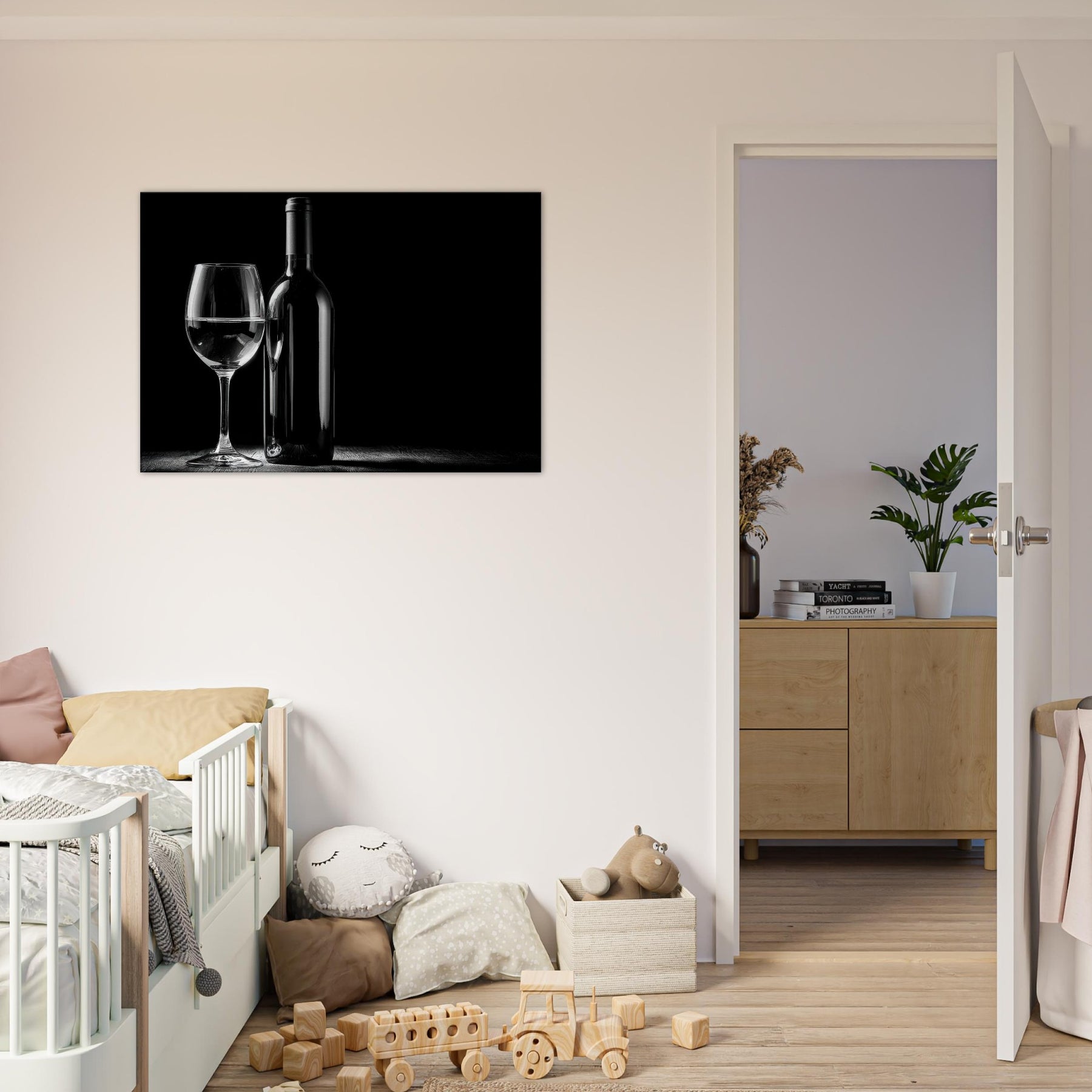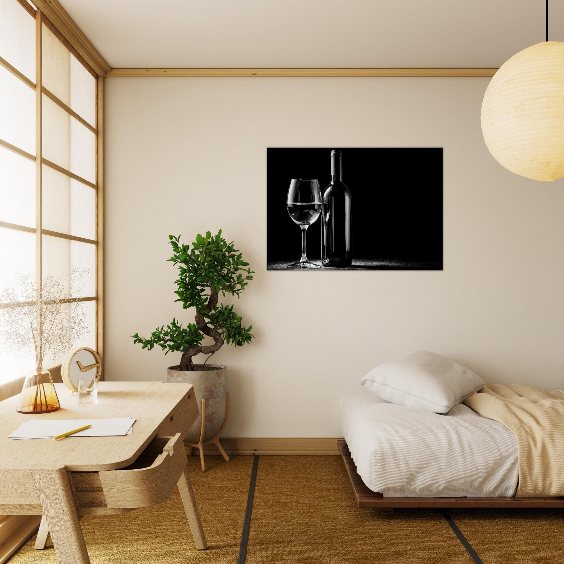 An intimate study in contrast, this black and white composition centers a Wine Bottle And Glass, a quiet toast captured in a single, unhurried moment. The gleam of the glass and the bottle’s poised silhouette invite a slower mood into any living space. It evokes evenings of candlelight and conversation, where every detail the slender neck, the weight of the stem is savored. Place it near a window or above a sofa to mirror sophistication, simplicity, and timeless elegance.