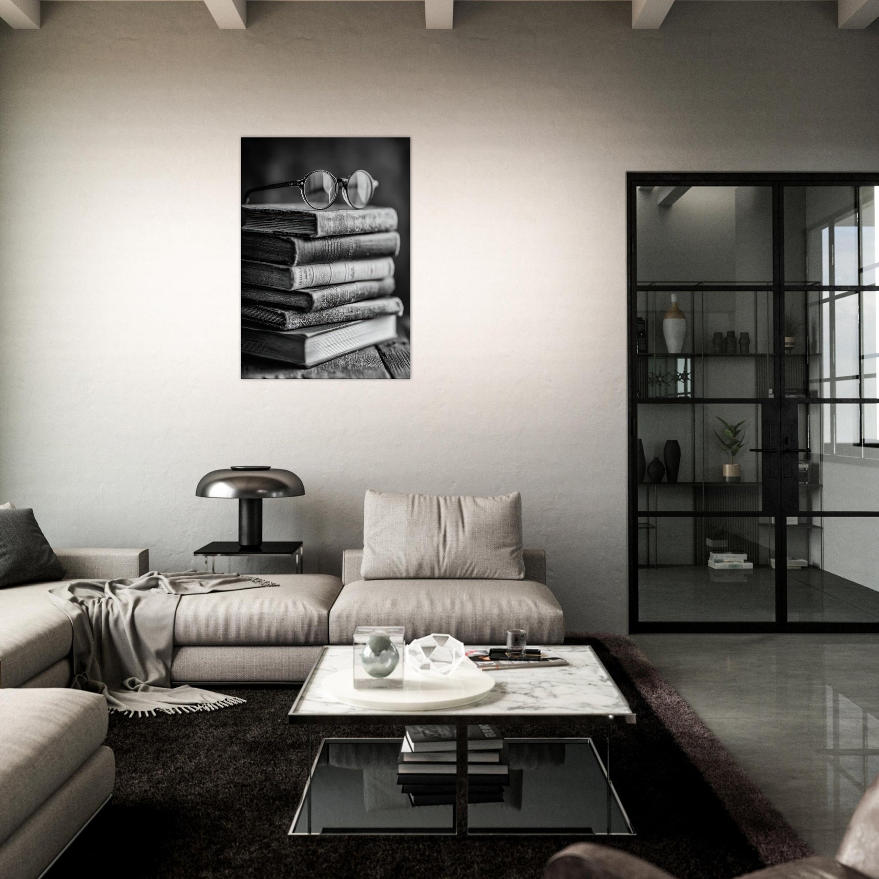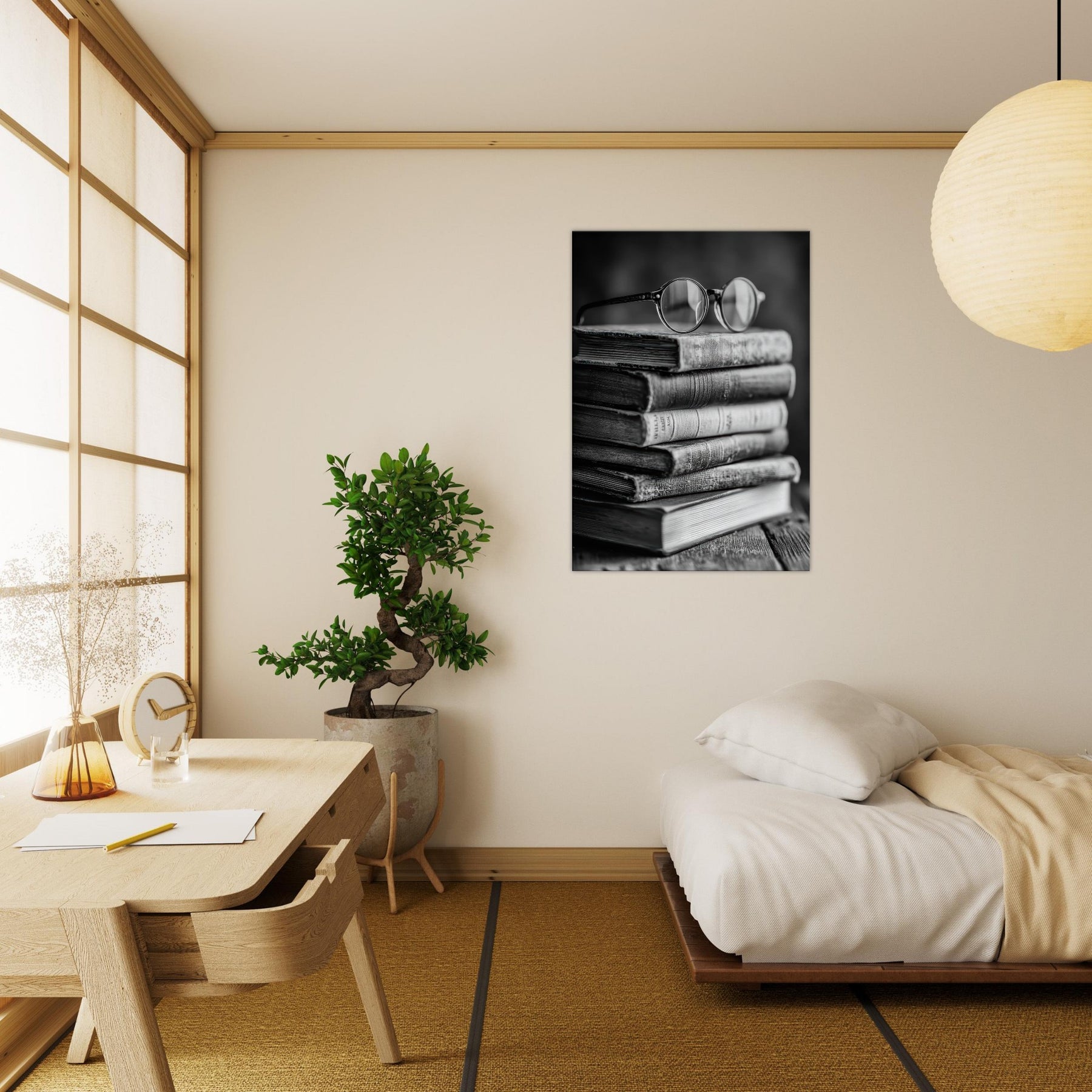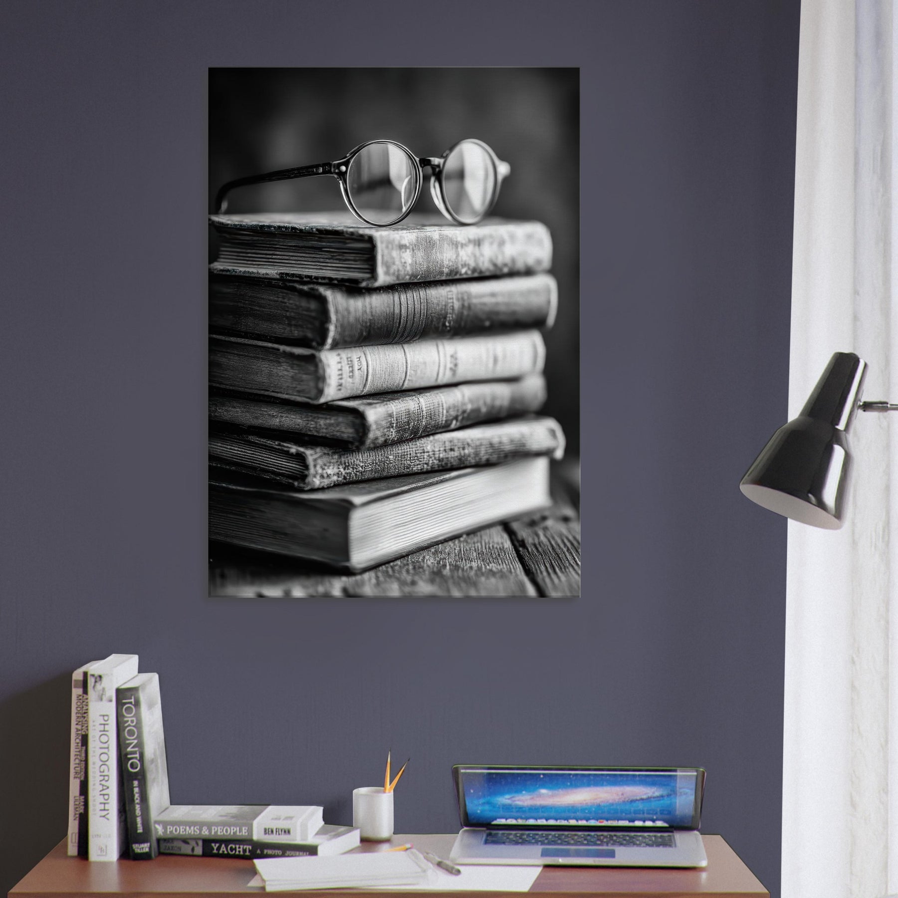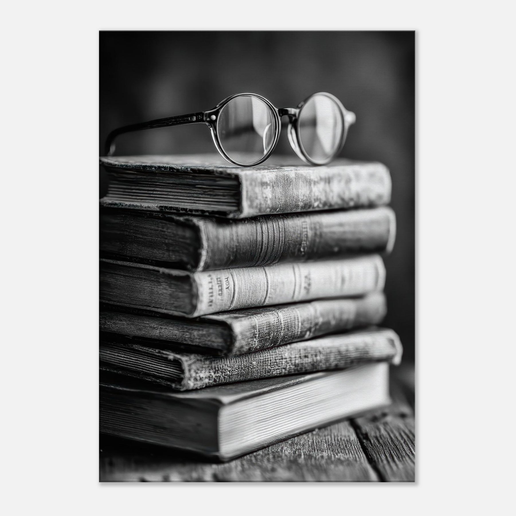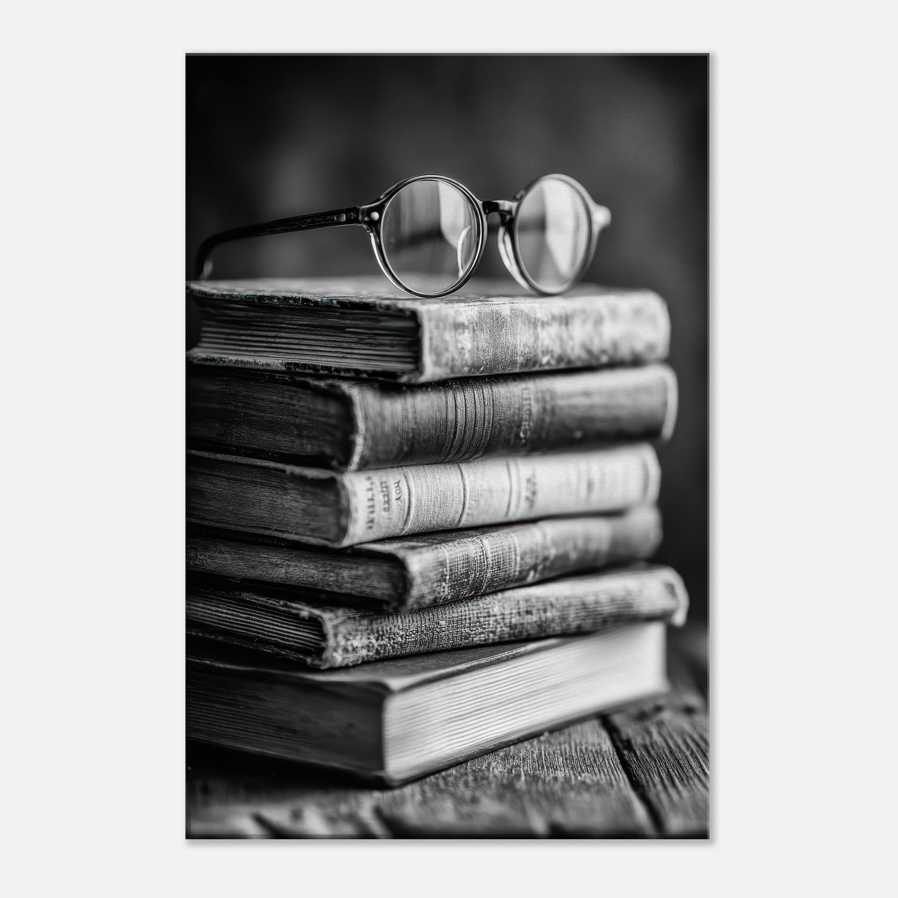 Enter a quiet study where a Book Stack With Glasses rests in timeless monochrome. The matte textures of weathered spines, the soft glare on rounded lenses, and the subtle grain of the wood invite touch and memory. This black and white composition radiates calm, turning a shelf into a contemplative vignette that anchors a living room or library nook. It pairs with warm woods and linen, inviting lingering moments of reading, reflection, and effortless sophistication.