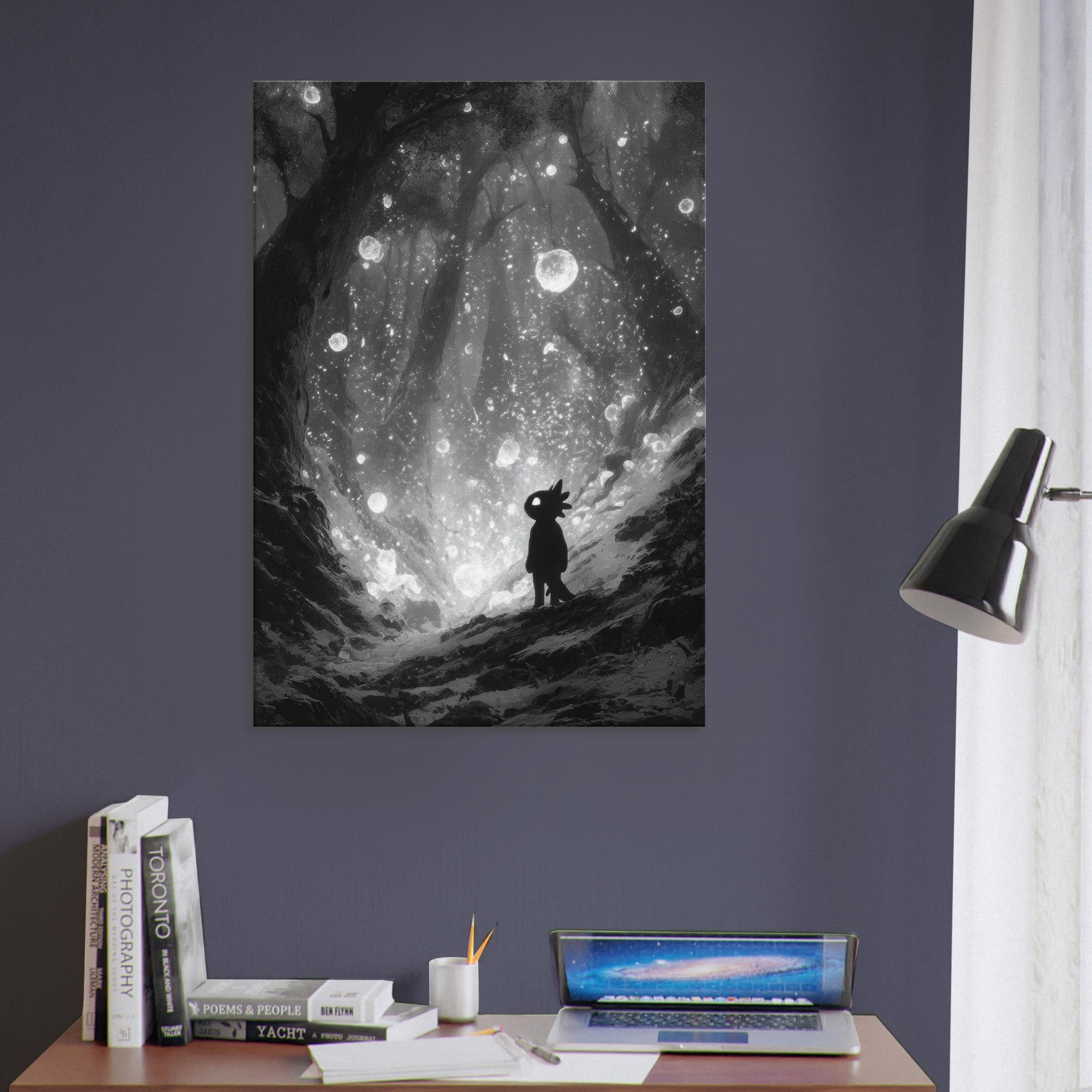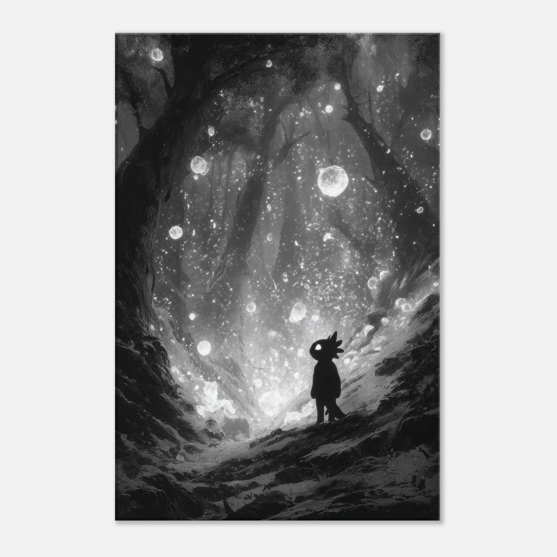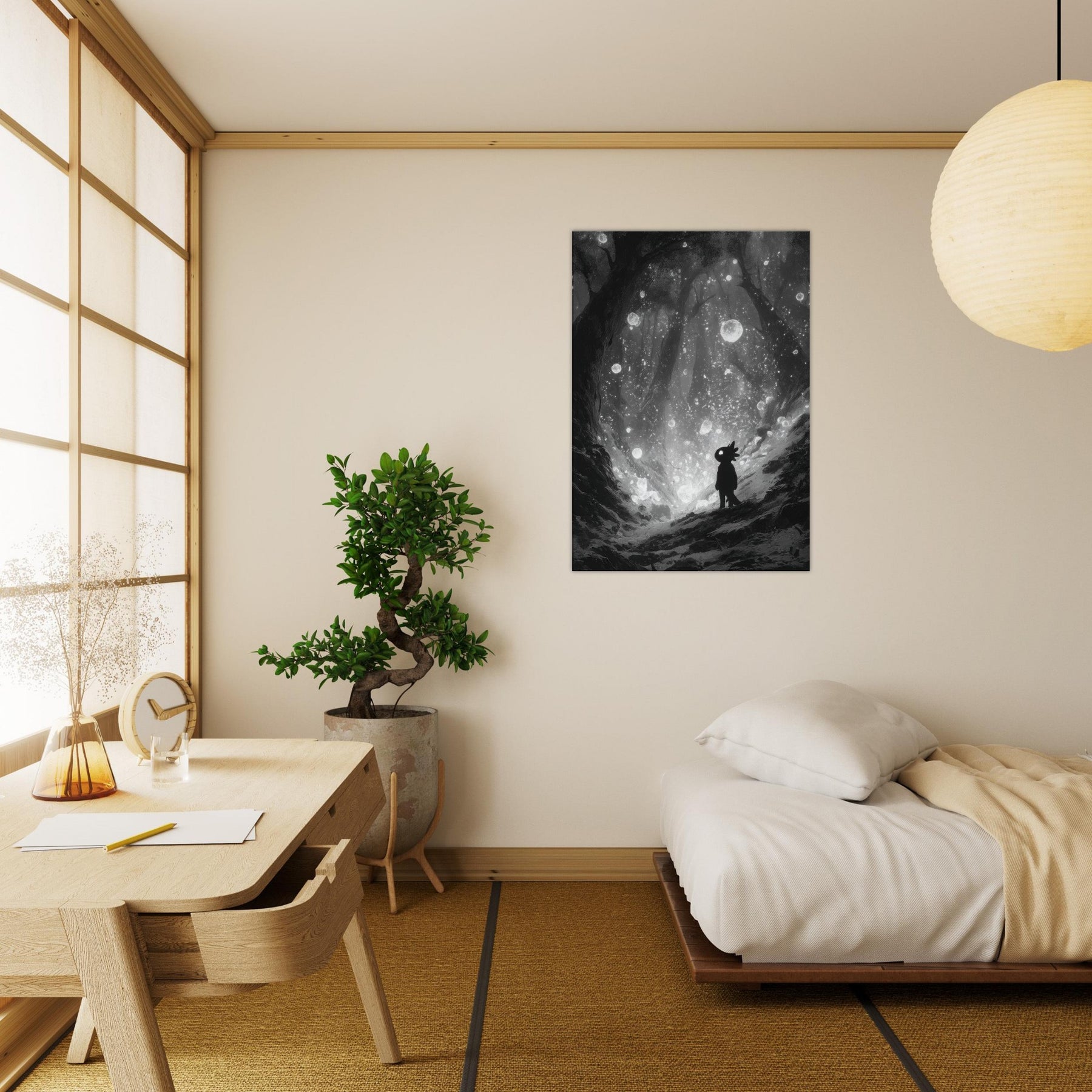 Centered on the Primary Subject: Enchanted Forest filled with glowing lights and spirits, this black and white scene blooms into your room with quiet majesty. A lone figure stands at the forest's edge, while orbs drift like memories through shadowed trees, creating a dance of light and darkness. The monochrome palette heightens texture and breathes a dreamlike stillness into any living space, inviting calm focus in a study, or a serene focal point in the living room. Let wonder illuminate your everyday moments.