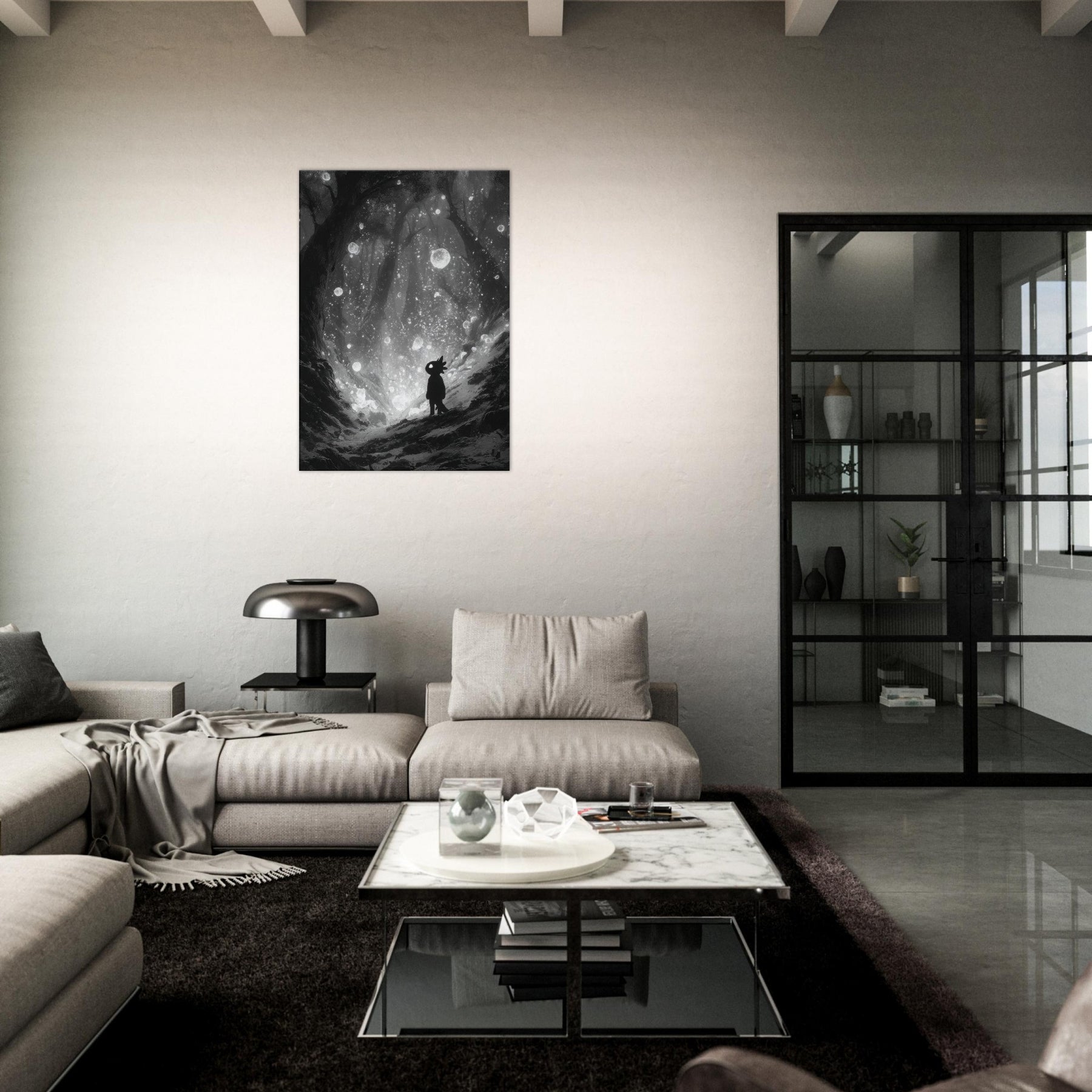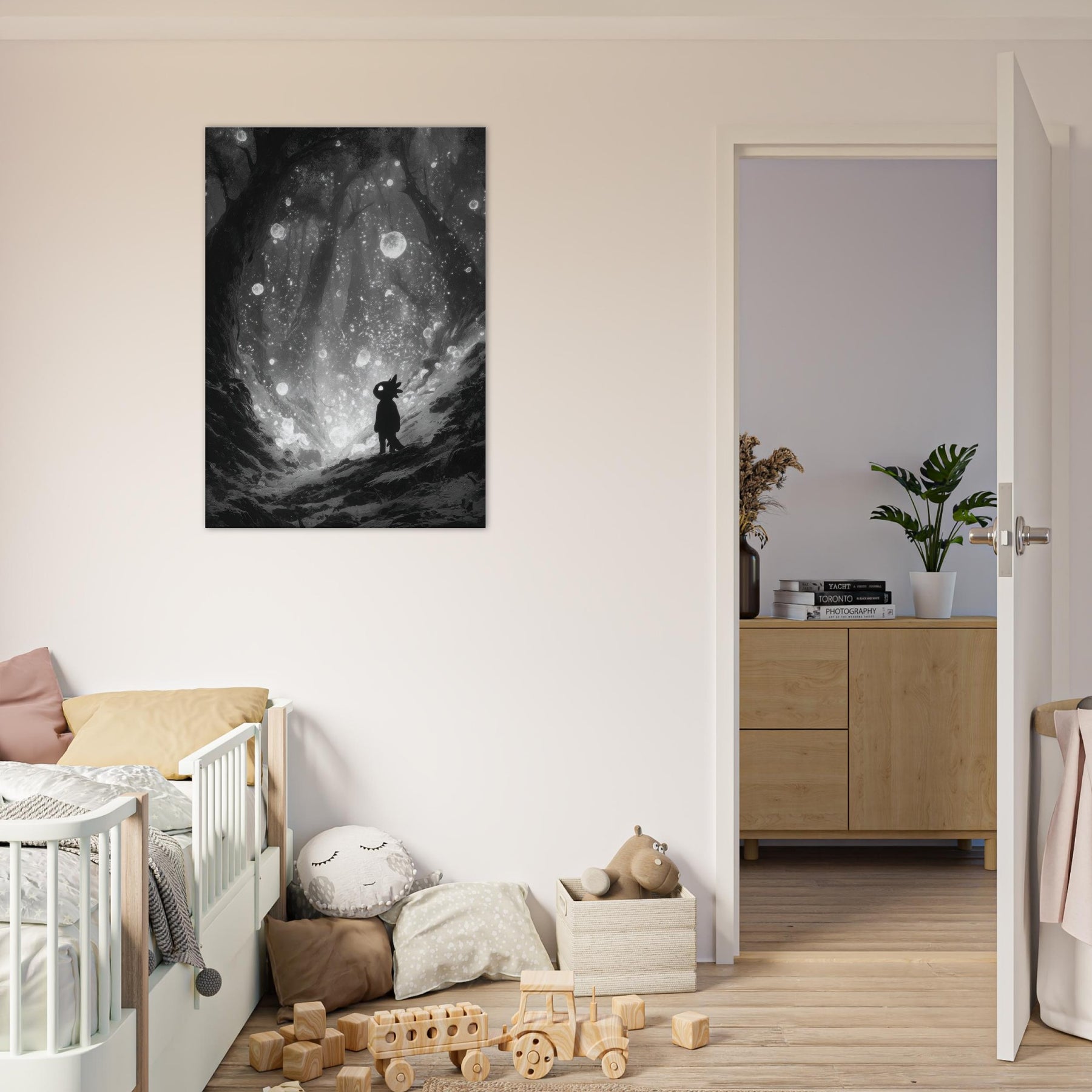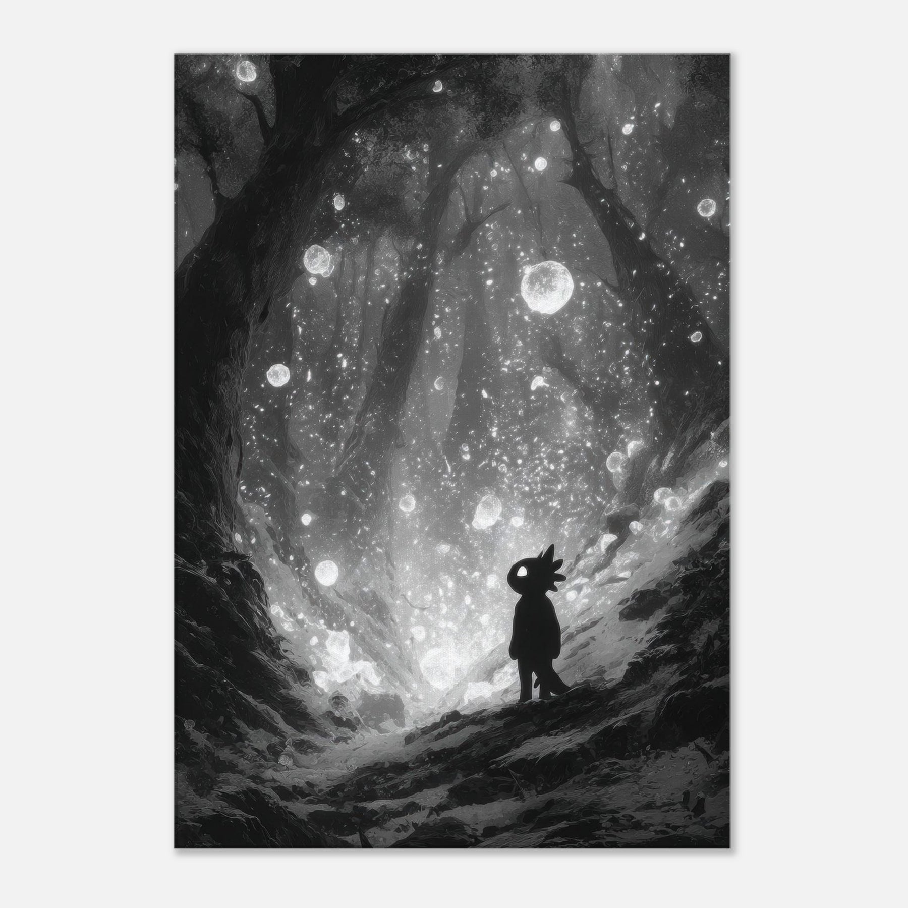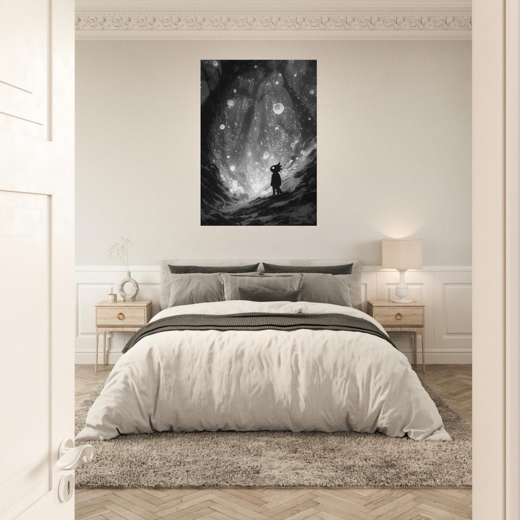 Centered on the Primary Subject: Enchanted Forest filled with glowing lights and spirits, this black and white scene blooms into your room with quiet majesty. A lone figure stands at the forest's edge, while orbs drift like memories through shadowed trees, creating a dance of light and darkness. The monochrome palette heightens texture and breathes a dreamlike stillness into any living space, inviting calm focus in a study, or a serene focal point in the living room. Let wonder illuminate your everyday moments.