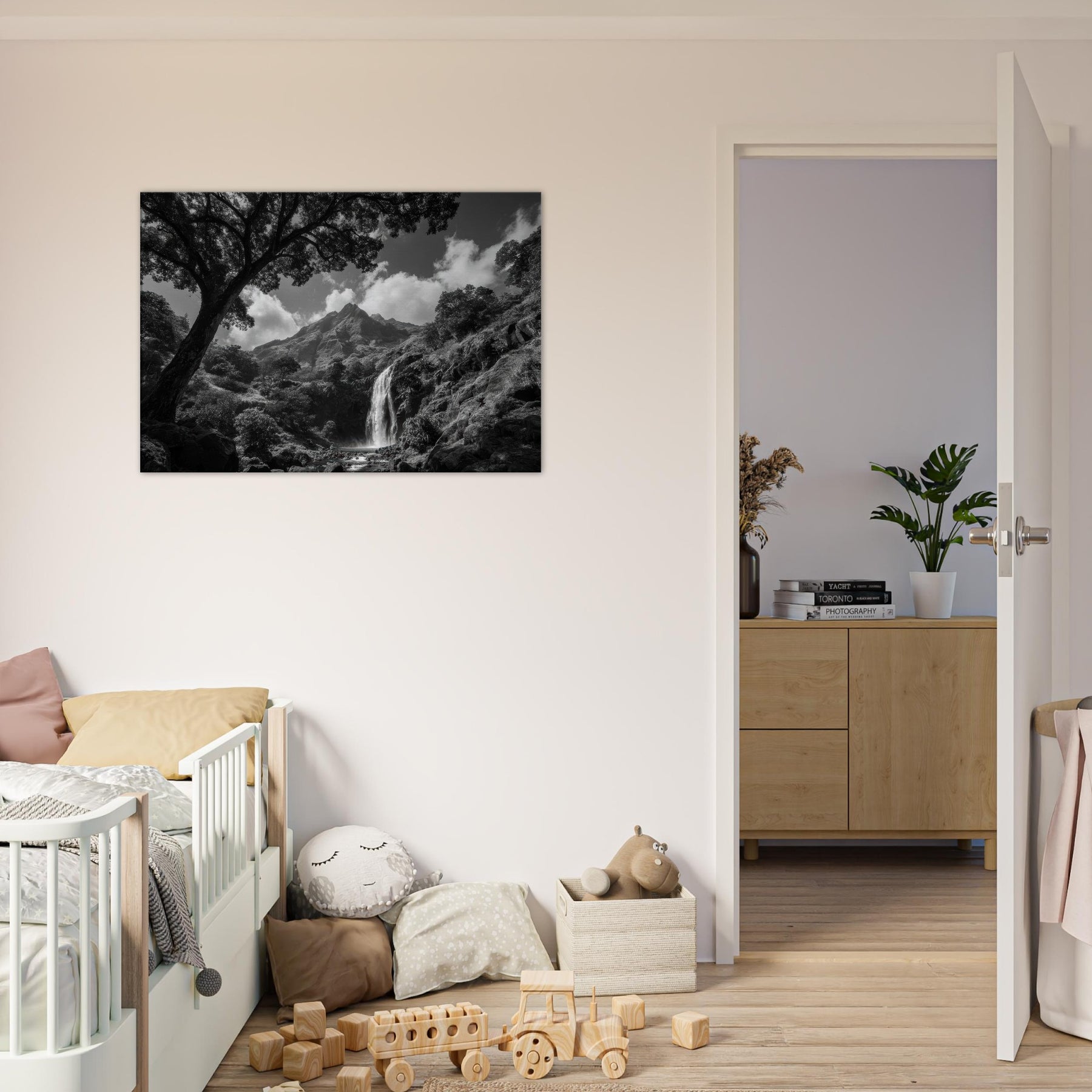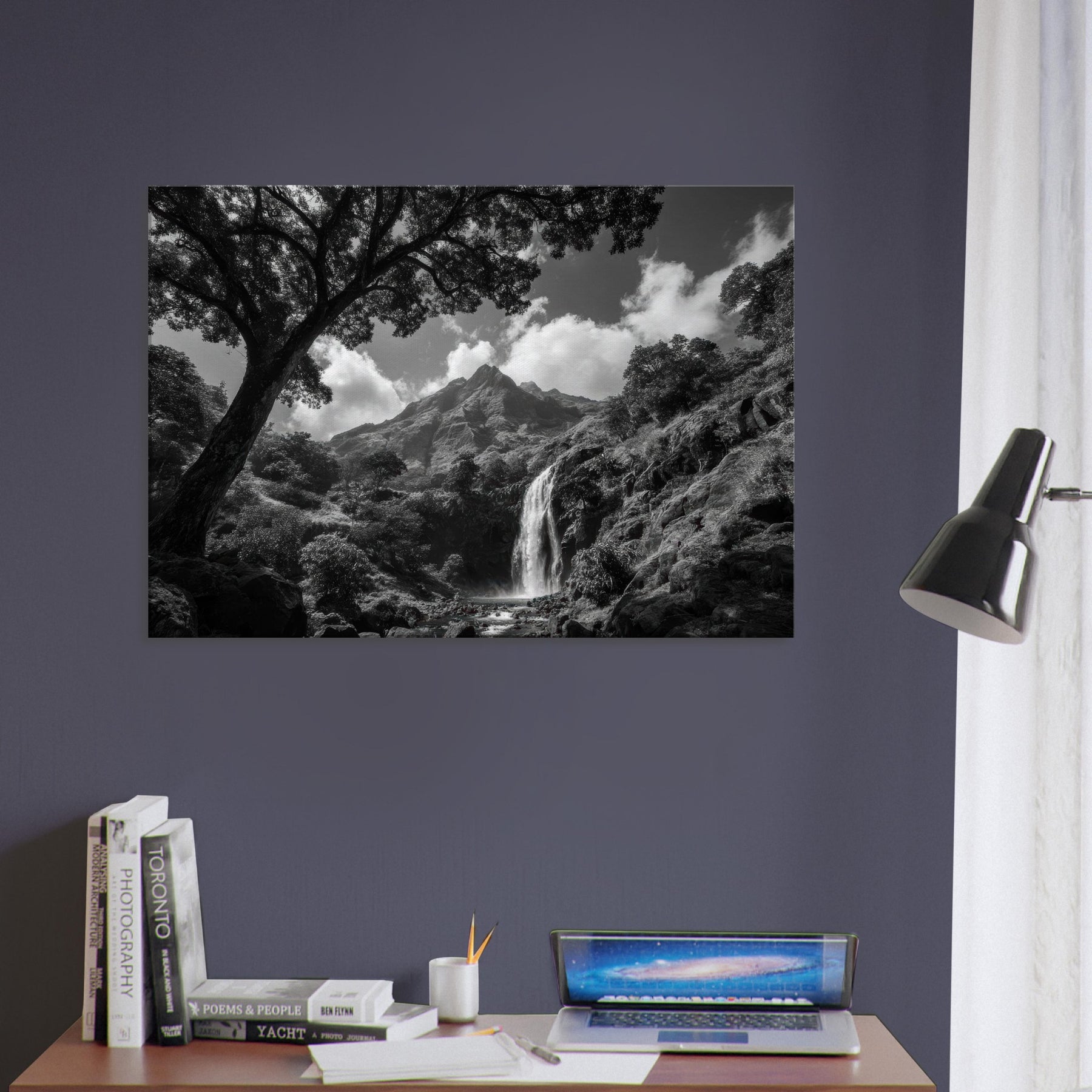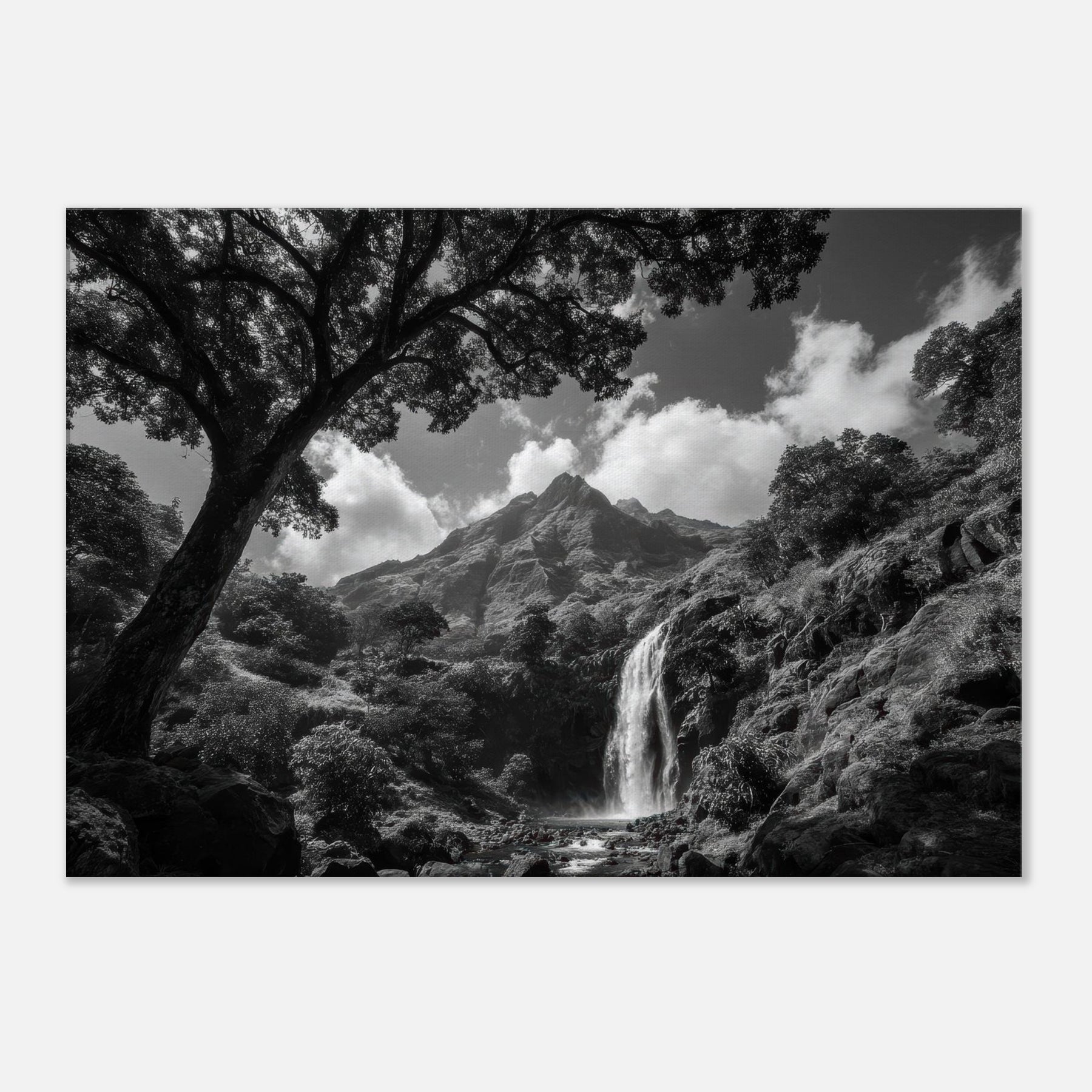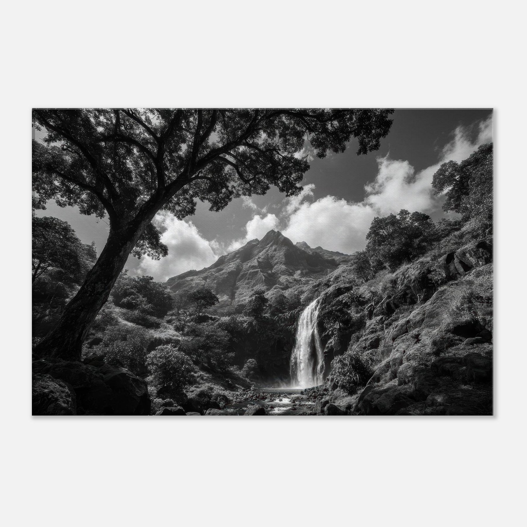 This piece invites you to linger on a Tropical Island rendered in stark black and white, where the forest's edges blur into mist and a waterfall threads light through dark rock. The absence of color heightens texture the craggy cliffs, the curling leaves, the ripples at water's edge to create a calm, immersive mood. Hang it in a living space to add timeless drama, a natural focal point that whispers sophistication and nourishes quiet retreats.