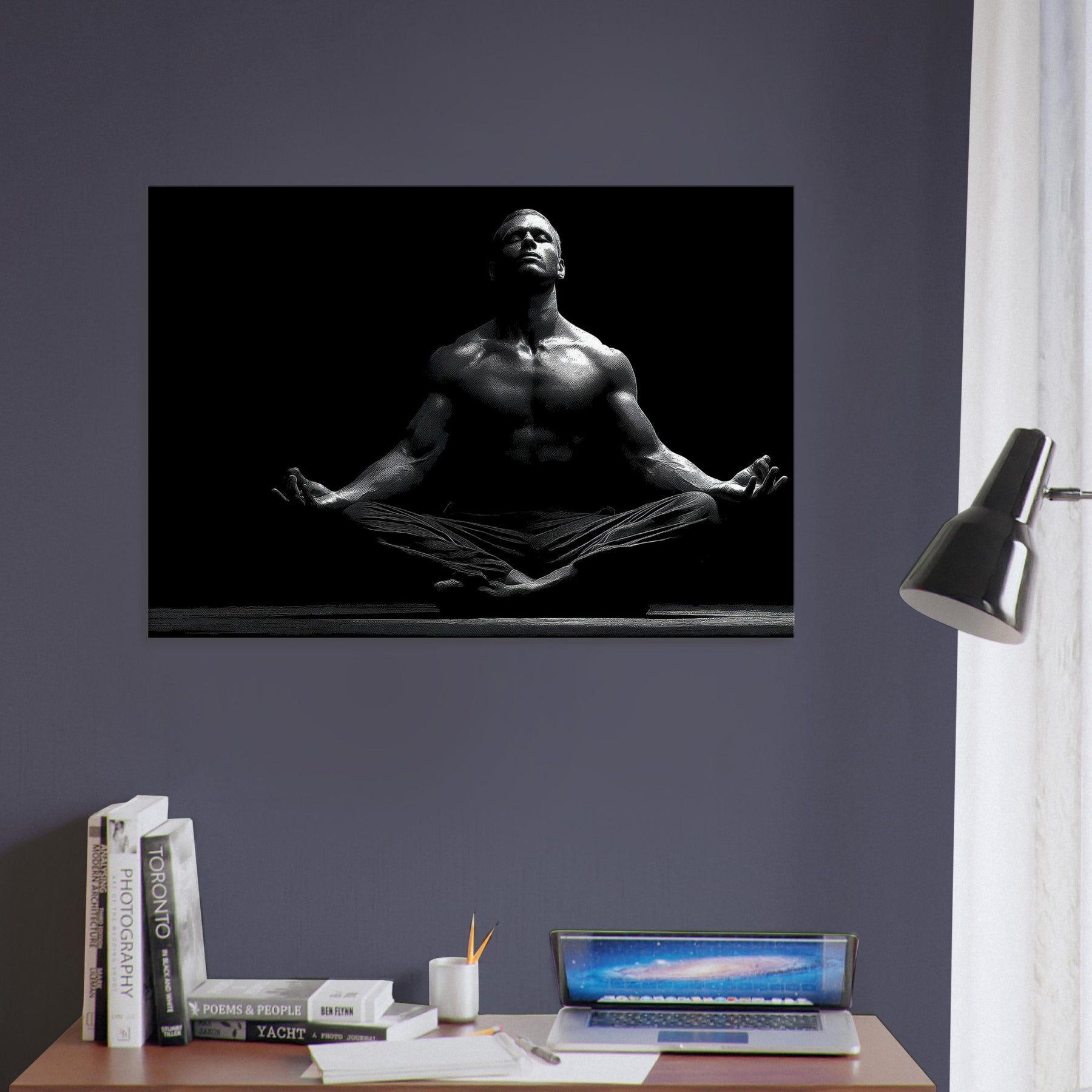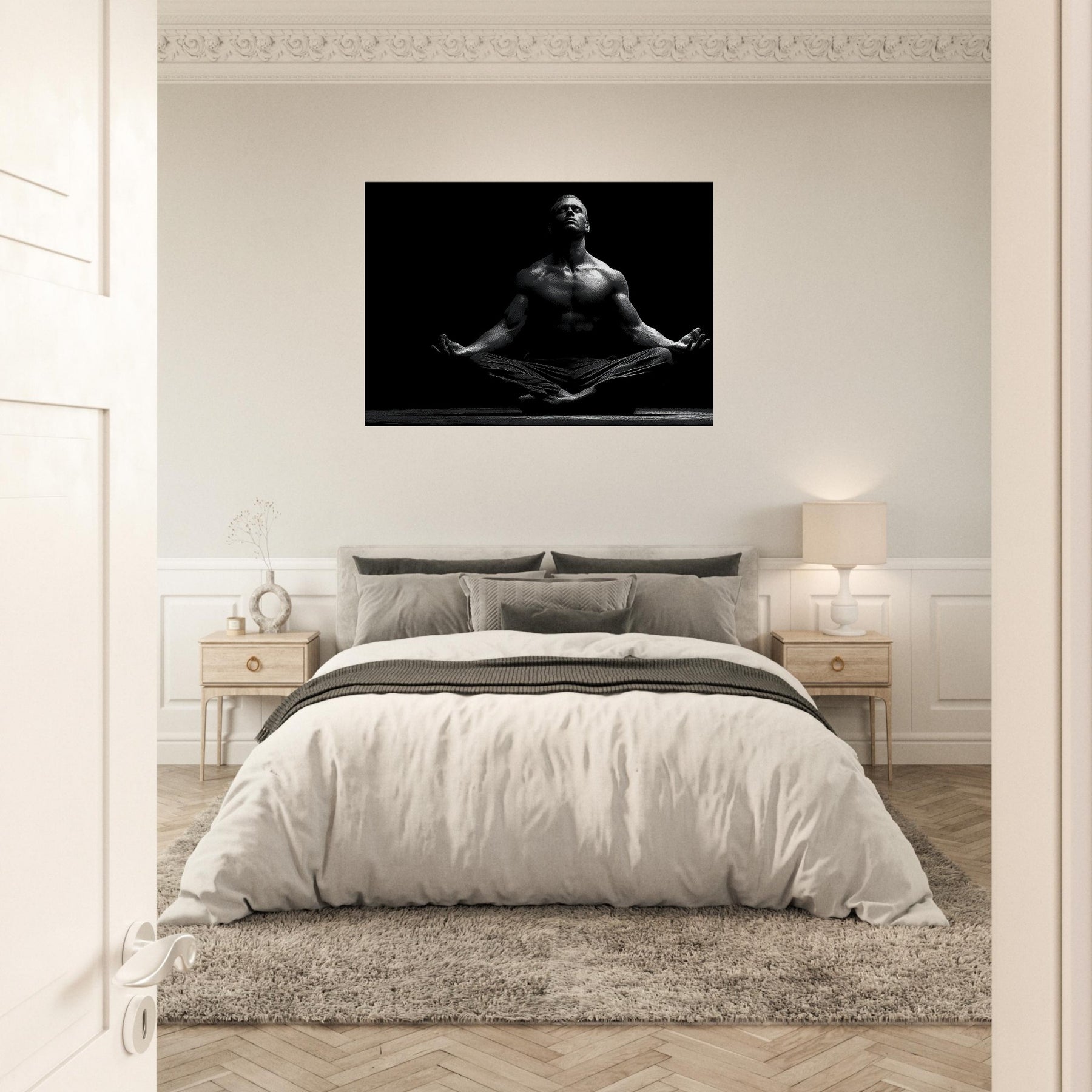 Yoga Lotus Pose rises from a velvet black field, a study in balance and breath. The stark black and white lines sculpt the body into a quiet, meditative sculpture every curve and shoulder line a whisper of stillness. This image invites you to slow the pace of a room, to let light and shadow carry your thoughts. In a living space, it becomes a focal breath, a reminder to pause, center, and inhale with intention. A timeless addition for calm, contemplative interiors.