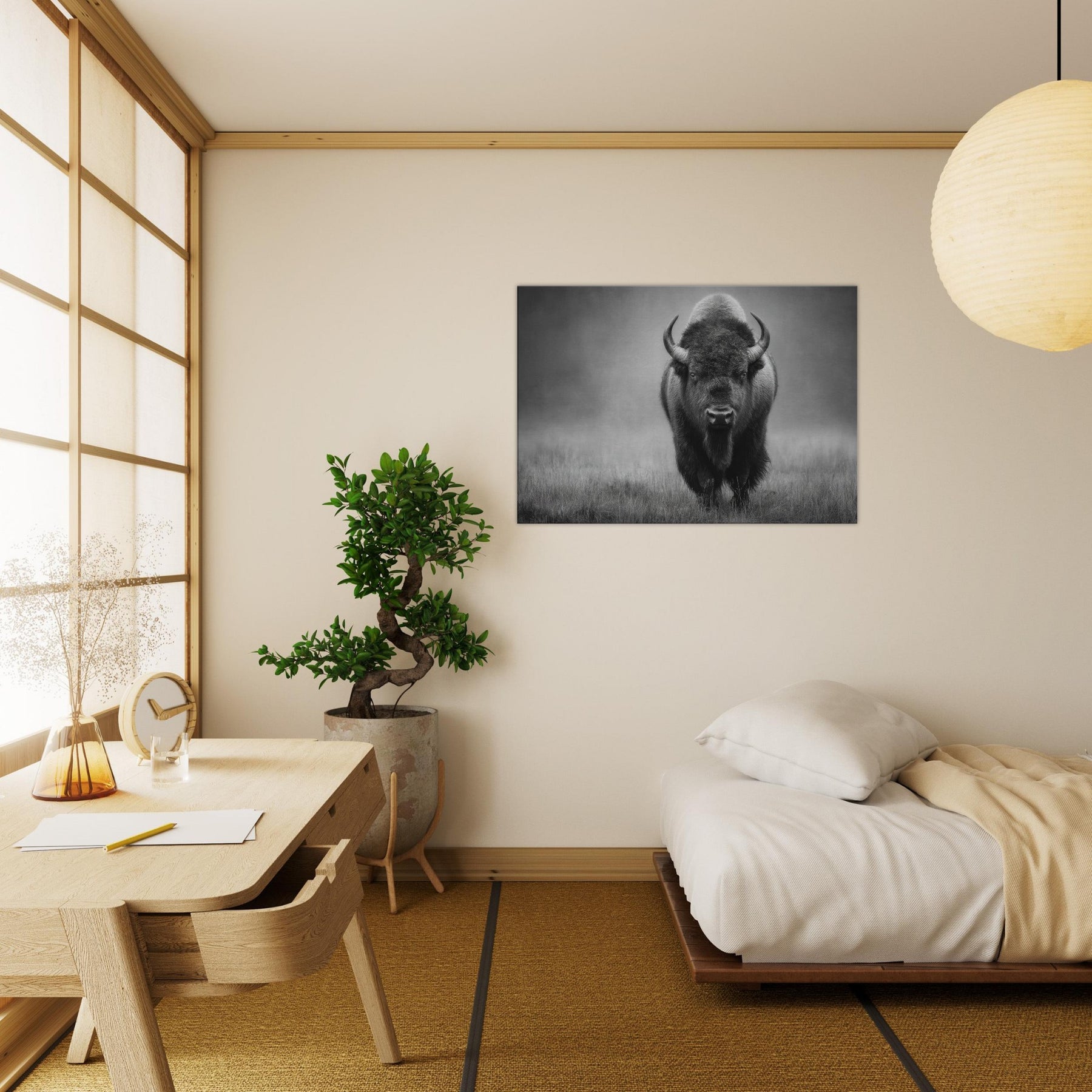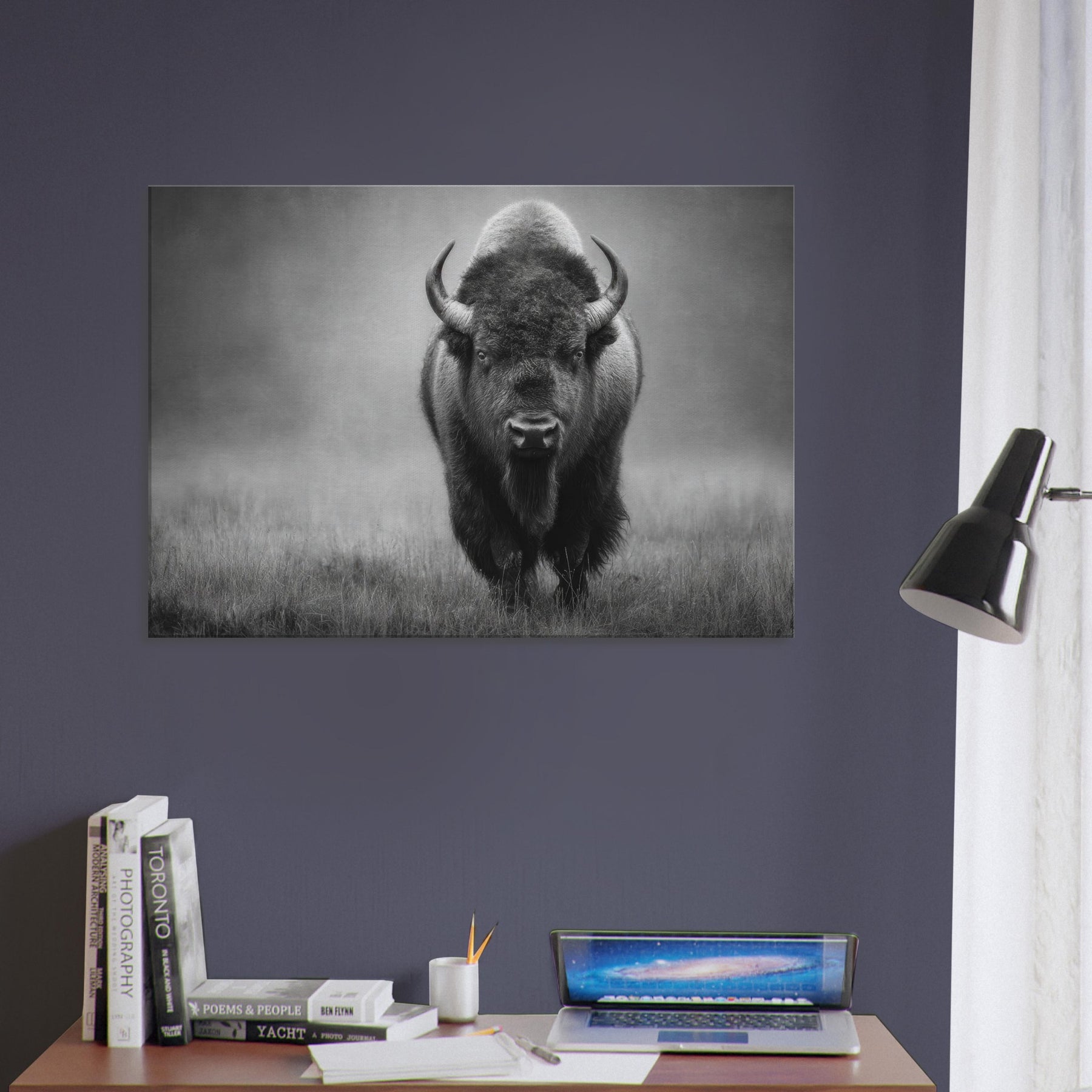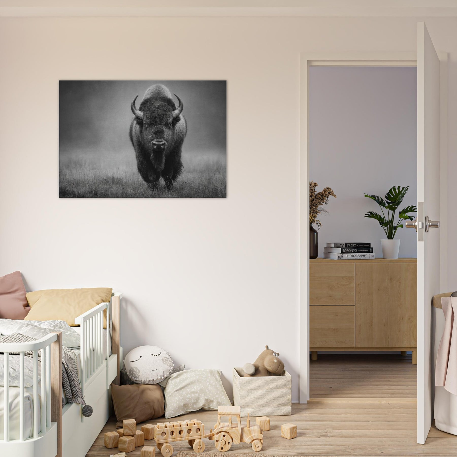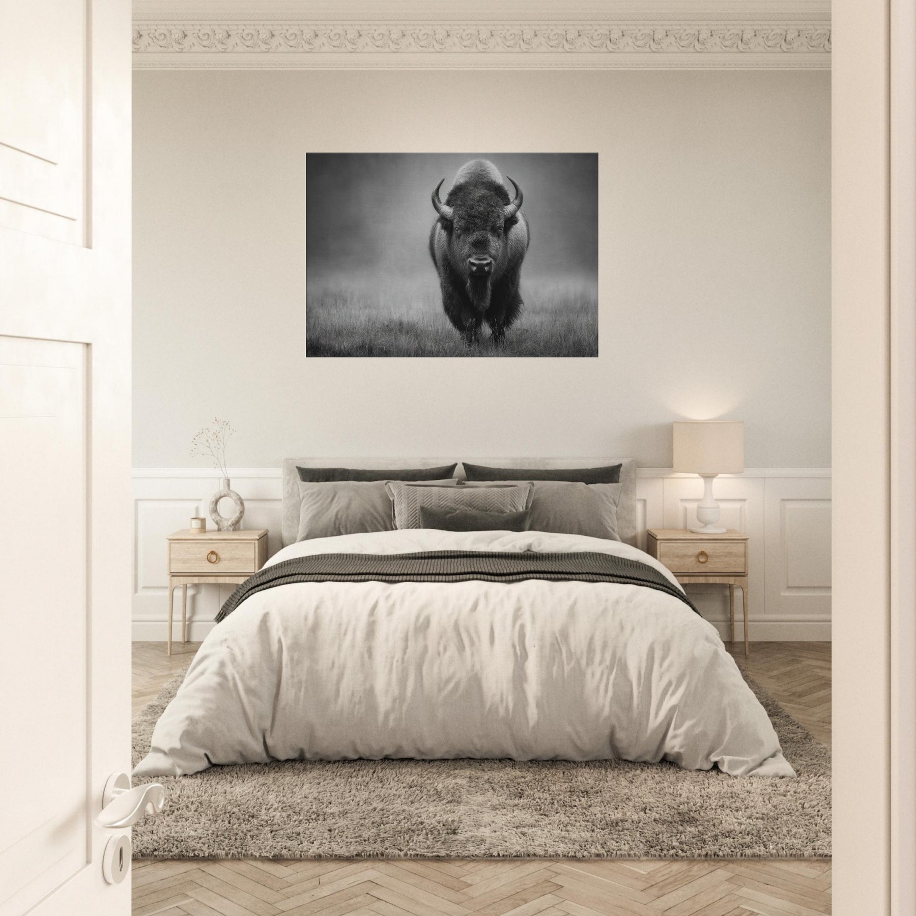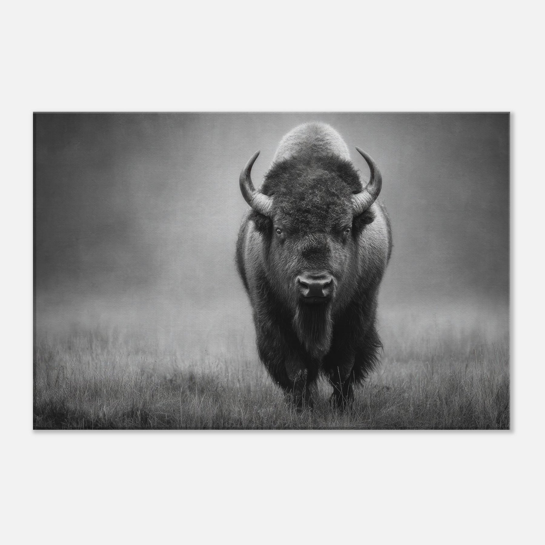 In this striking monochrome study, a solitary Bison strides toward the viewer, its muscular frame and woolly mane rendered in velvet blacks and cool grays. The high contrast lighting and soft, misty backdrop evoke dawn on the prairie, inviting quiet reflection and a sense of spacious calm. Place it where light meets shadow beside a sofa, above a console, or in a gallery hall of your living space and let the scene ground modern décor with timeless grit and presence. It speaks of endurance, solitude, and quiet power.