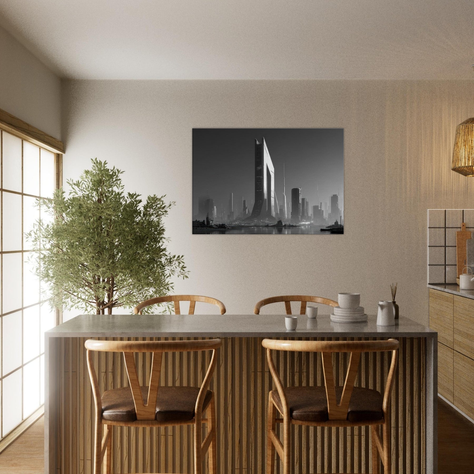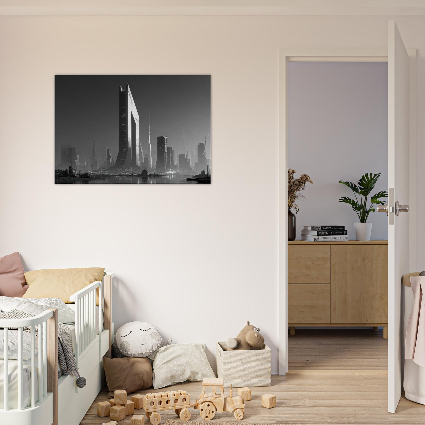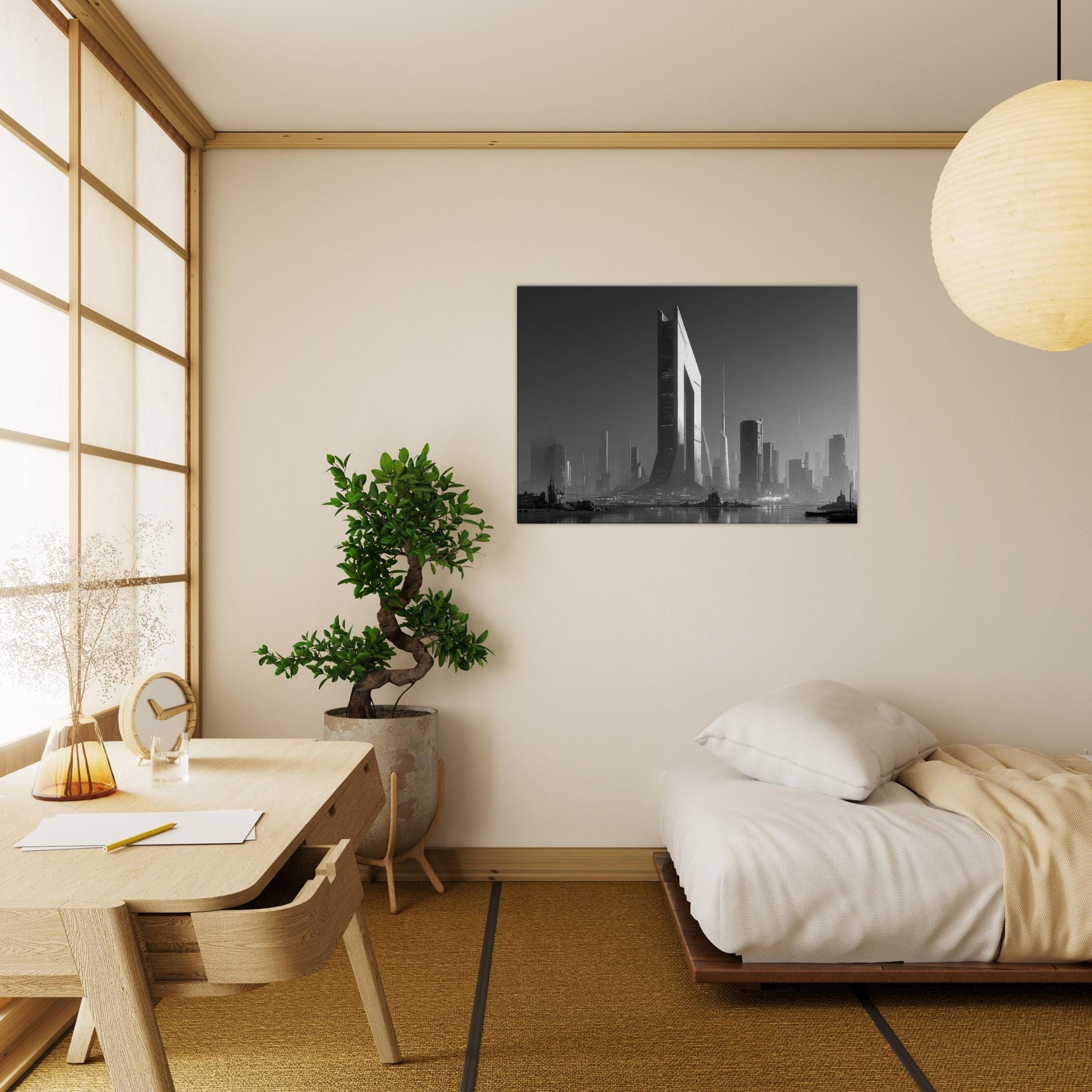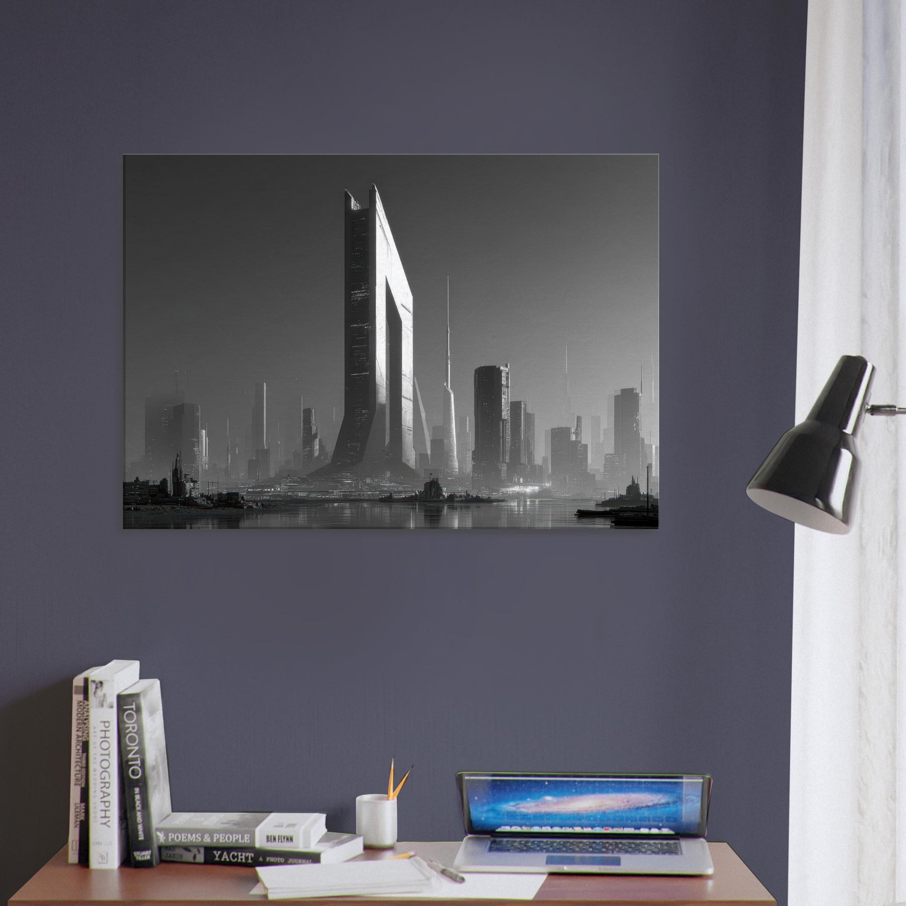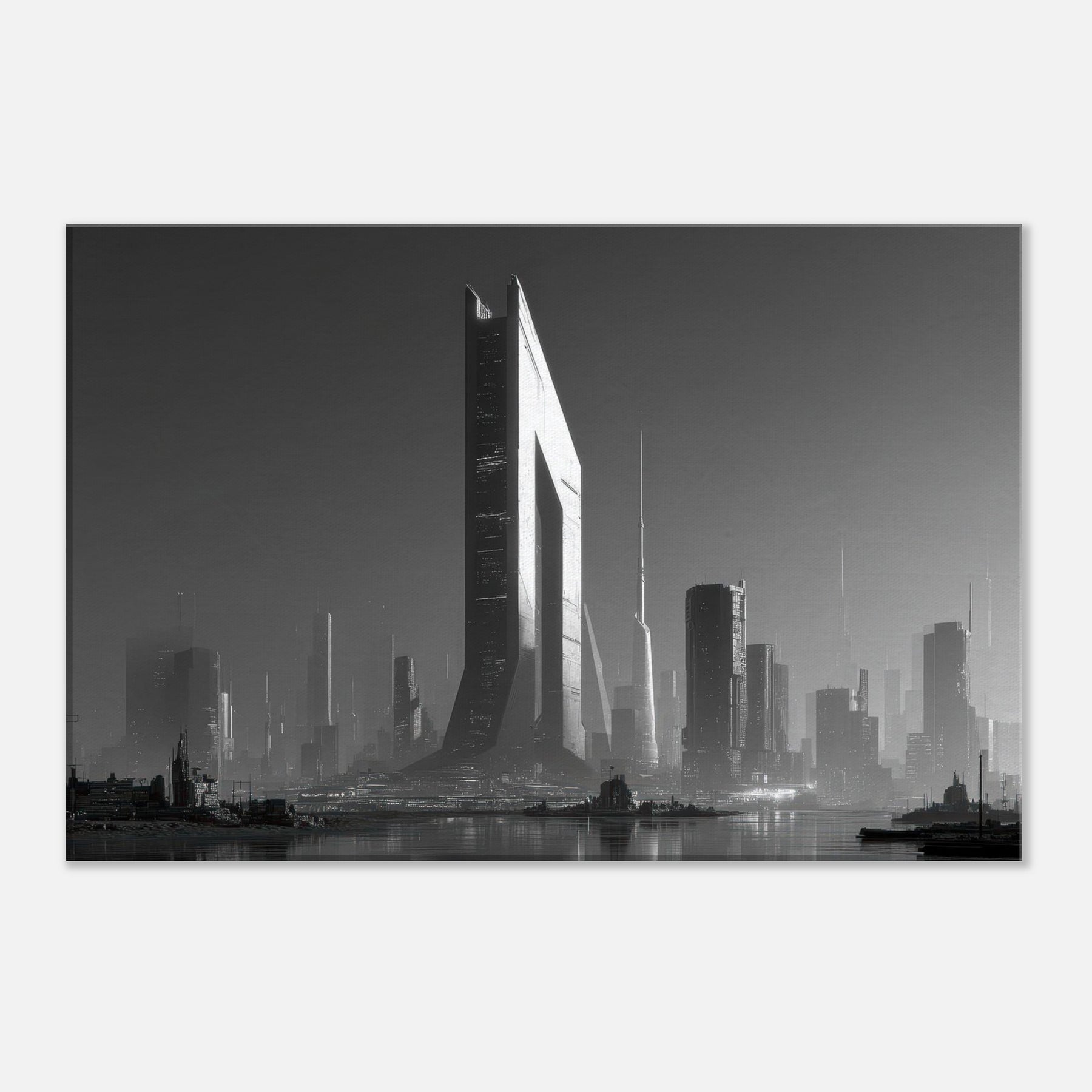 Step into a Cyberpunk City where black and white light cuts through fog like a blade. Skyscrapers glide upward in sculpted shadows, rain stitching the streets with silver threads, and distant horizons hum with neon memory. This image bathes your space in a cinematic, nocturnal pulse cool, precise, endlessly expansive. Hang it to invite quiet reflection, to anchor a modern living room with structure and soul. The artwork’s stark contrast and architectural cadence awaken conversation and elevate every corner with an urban, futuristic mood.