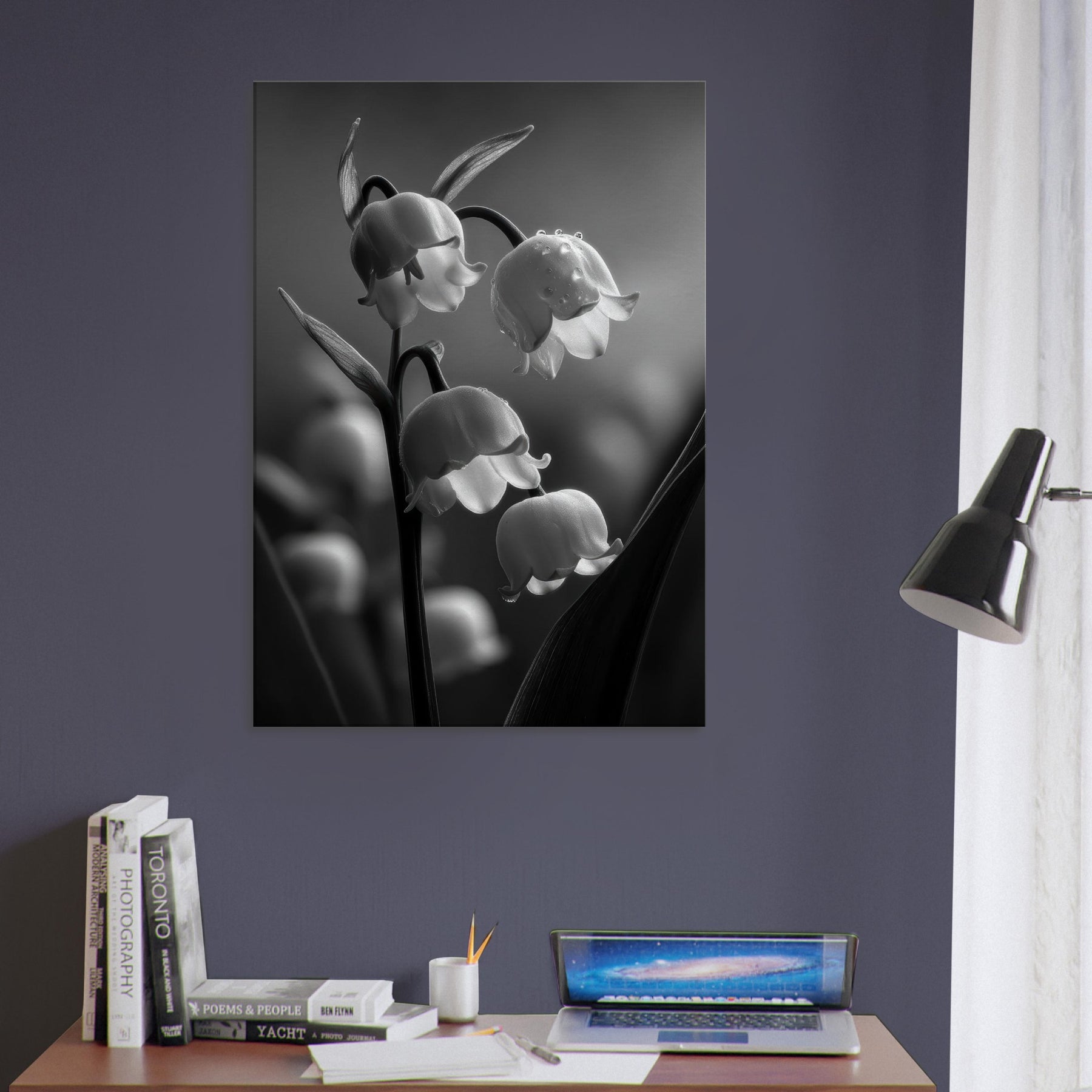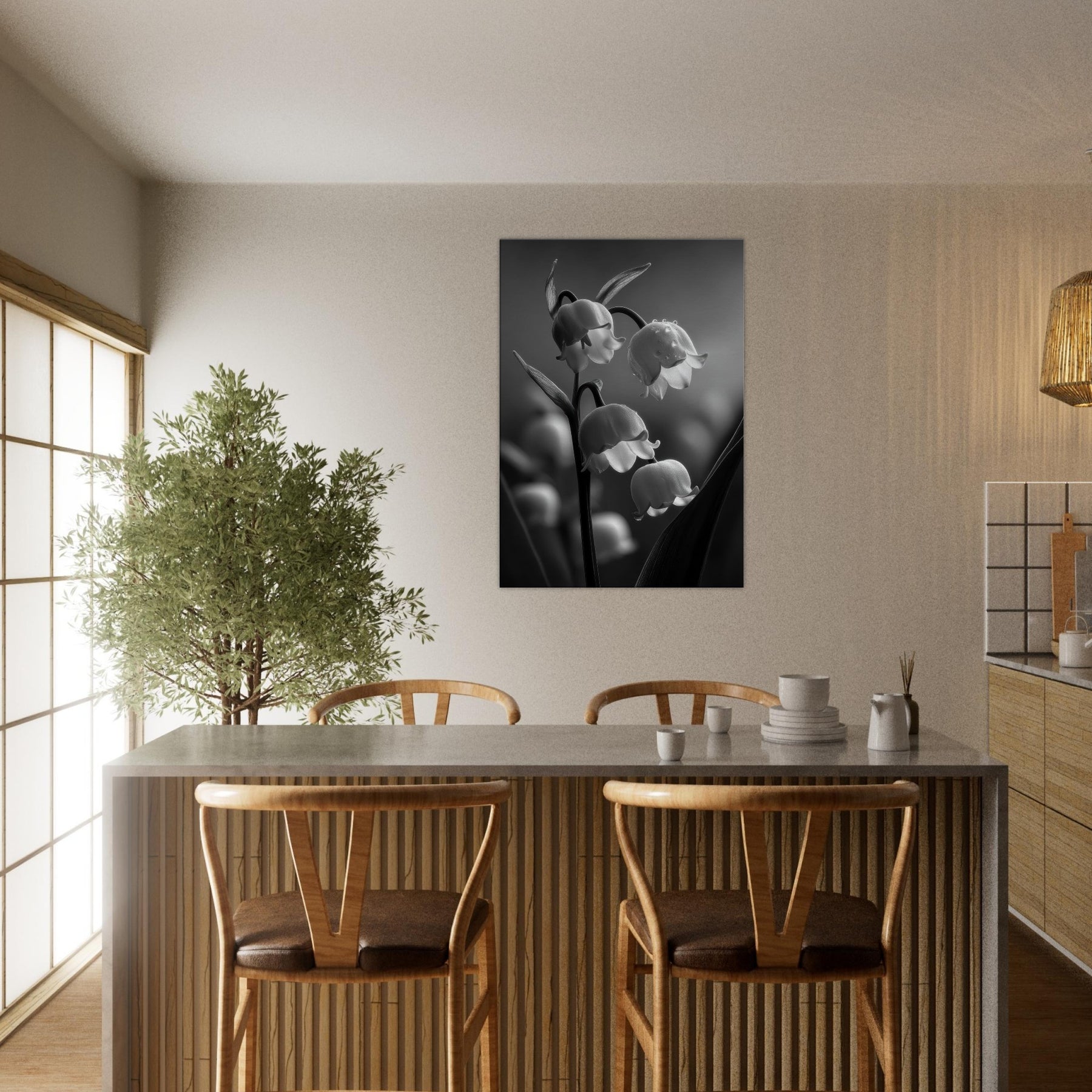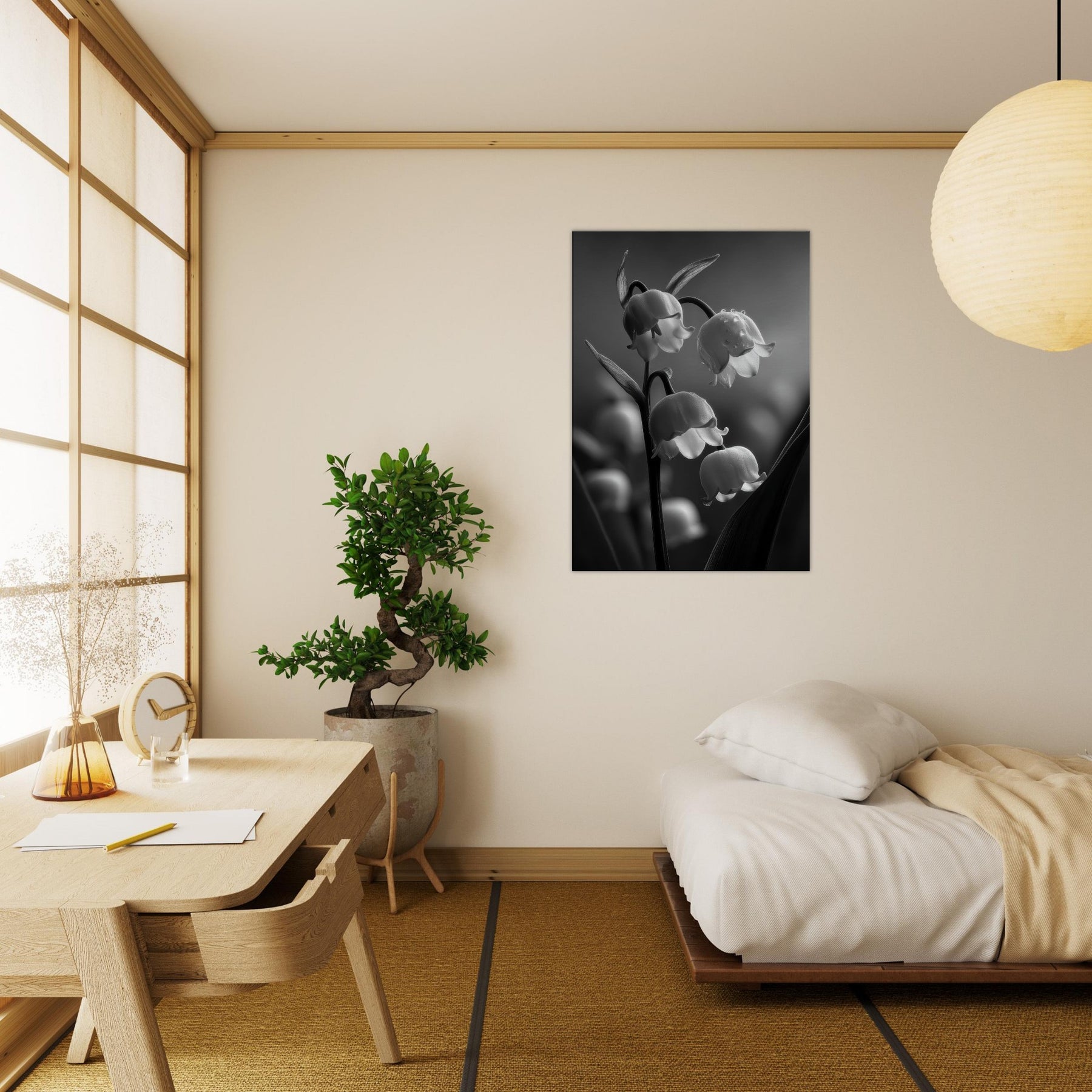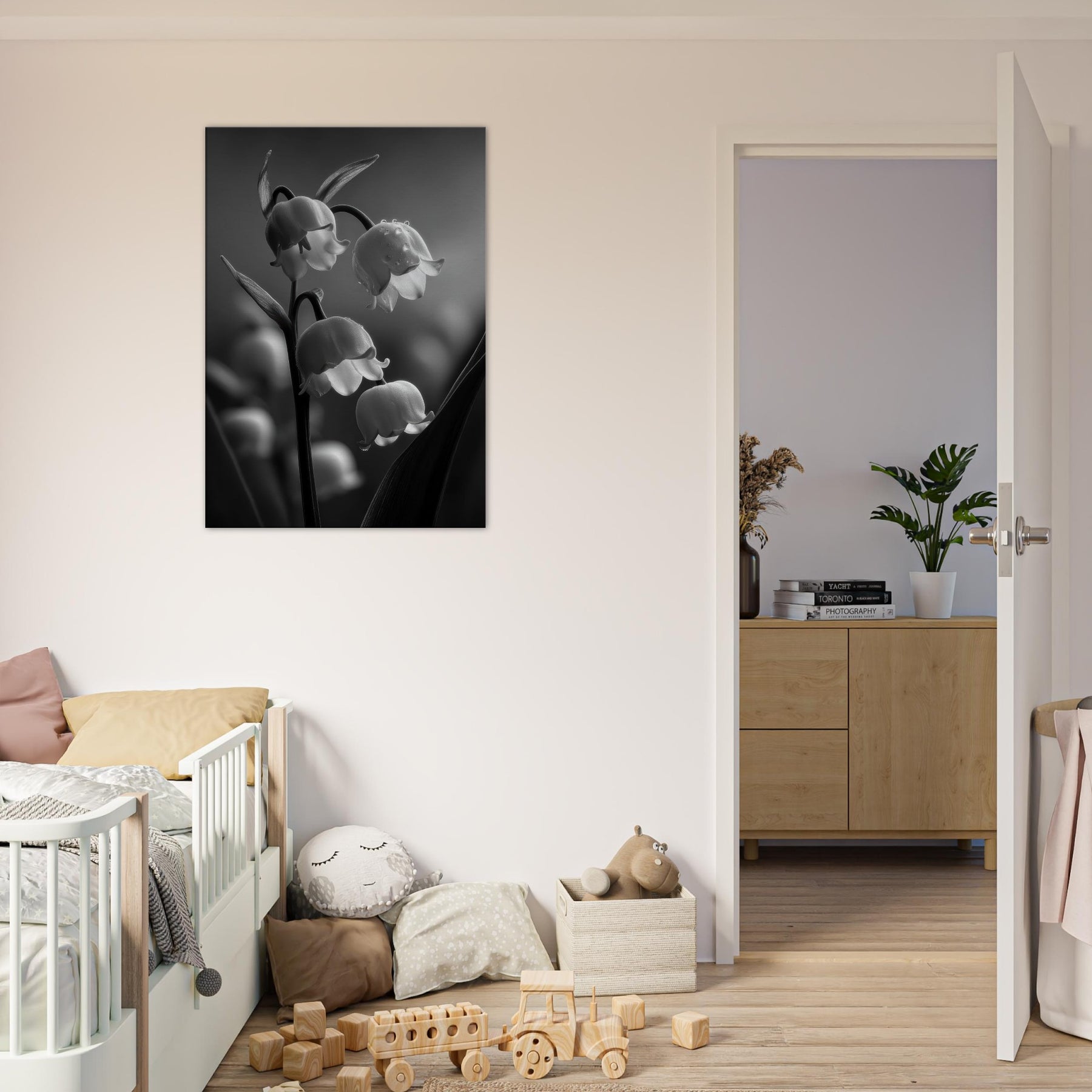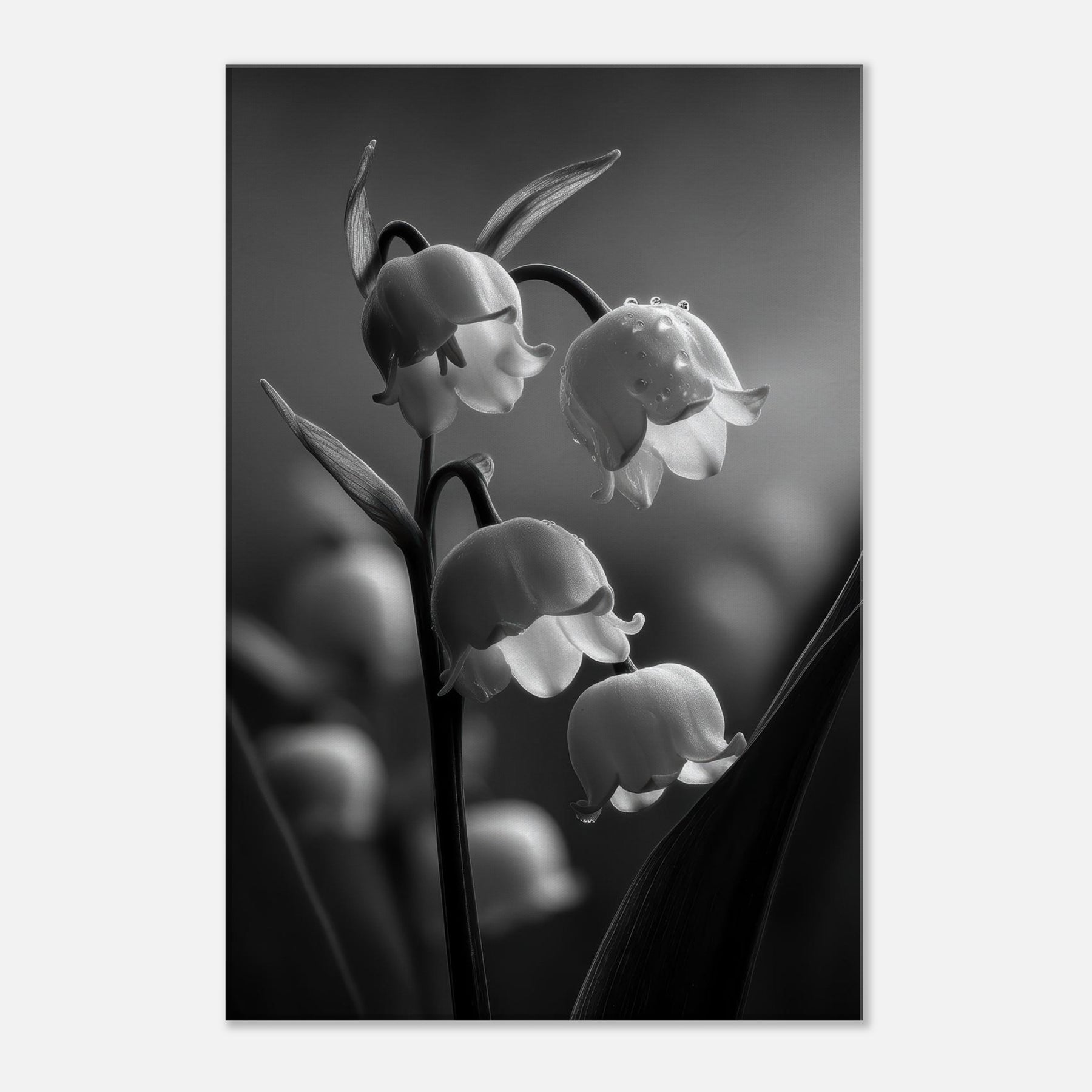 Step into a quiet courtyard where light threads through pine scented air and settles on Lily of the Valley in a quiet, monochrome bloom. This black and white study captures the lily's bell shaped blossoms with silvery detail and shadowed stems, inviting a serene, cathedral like calm into any room. It pairs effortlessly with modern furnishings, adding a touch of timeless grace to living spaces, bedrooms, or hallways. The absence of color heightens texture and line, turning everyday walls into a contemplative vignette.