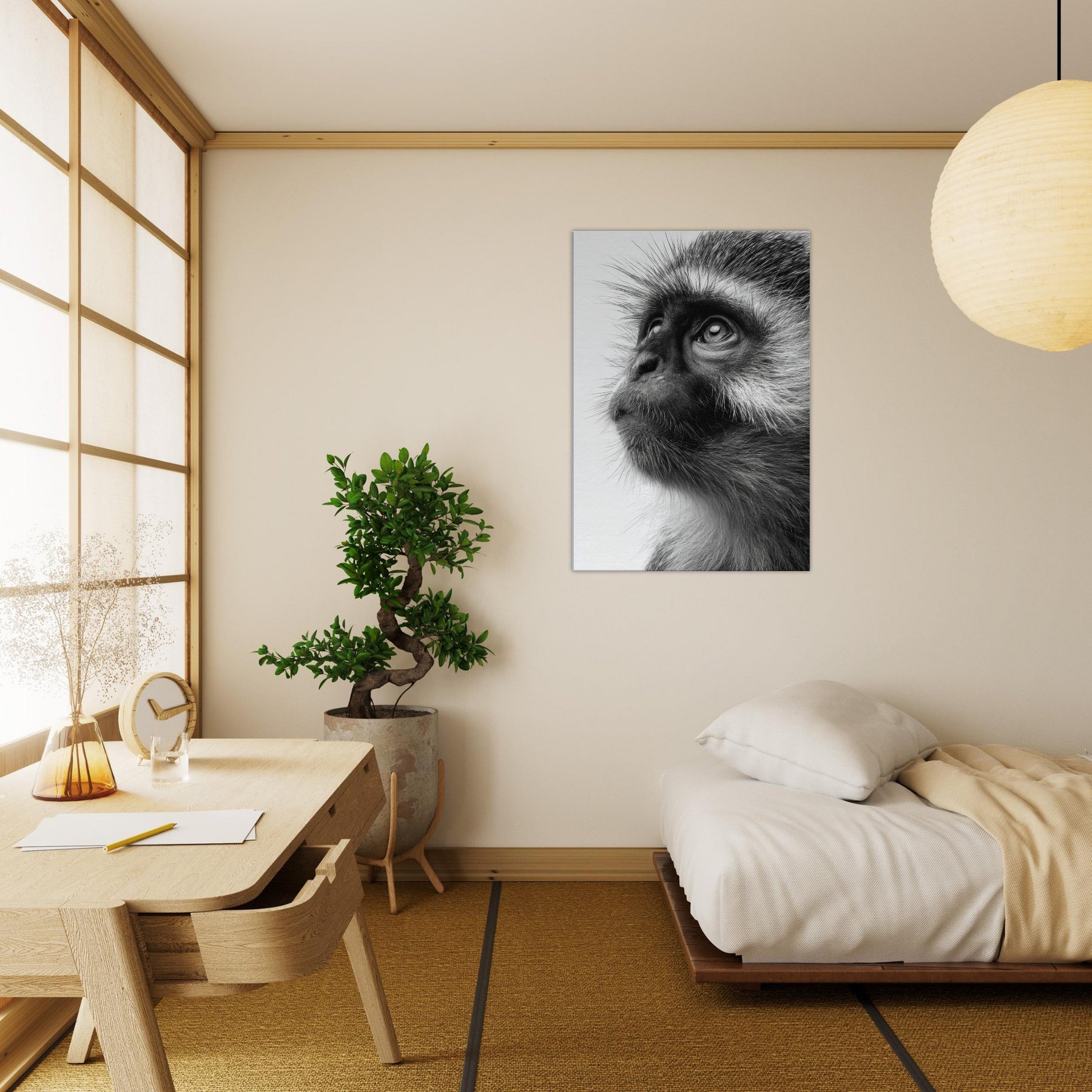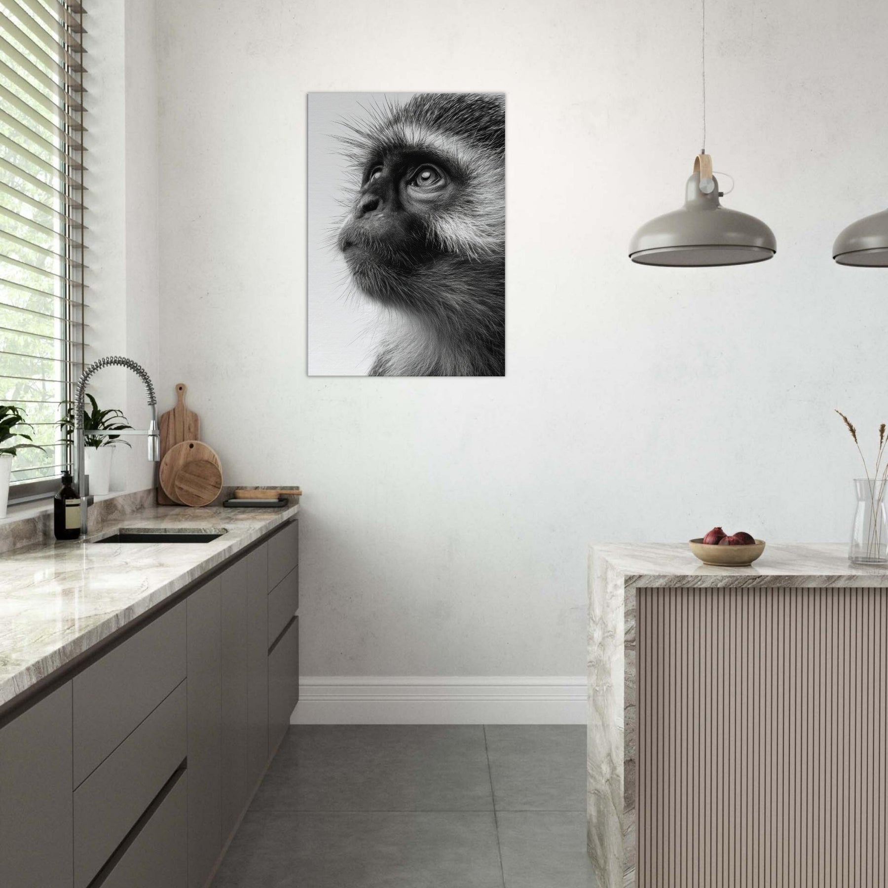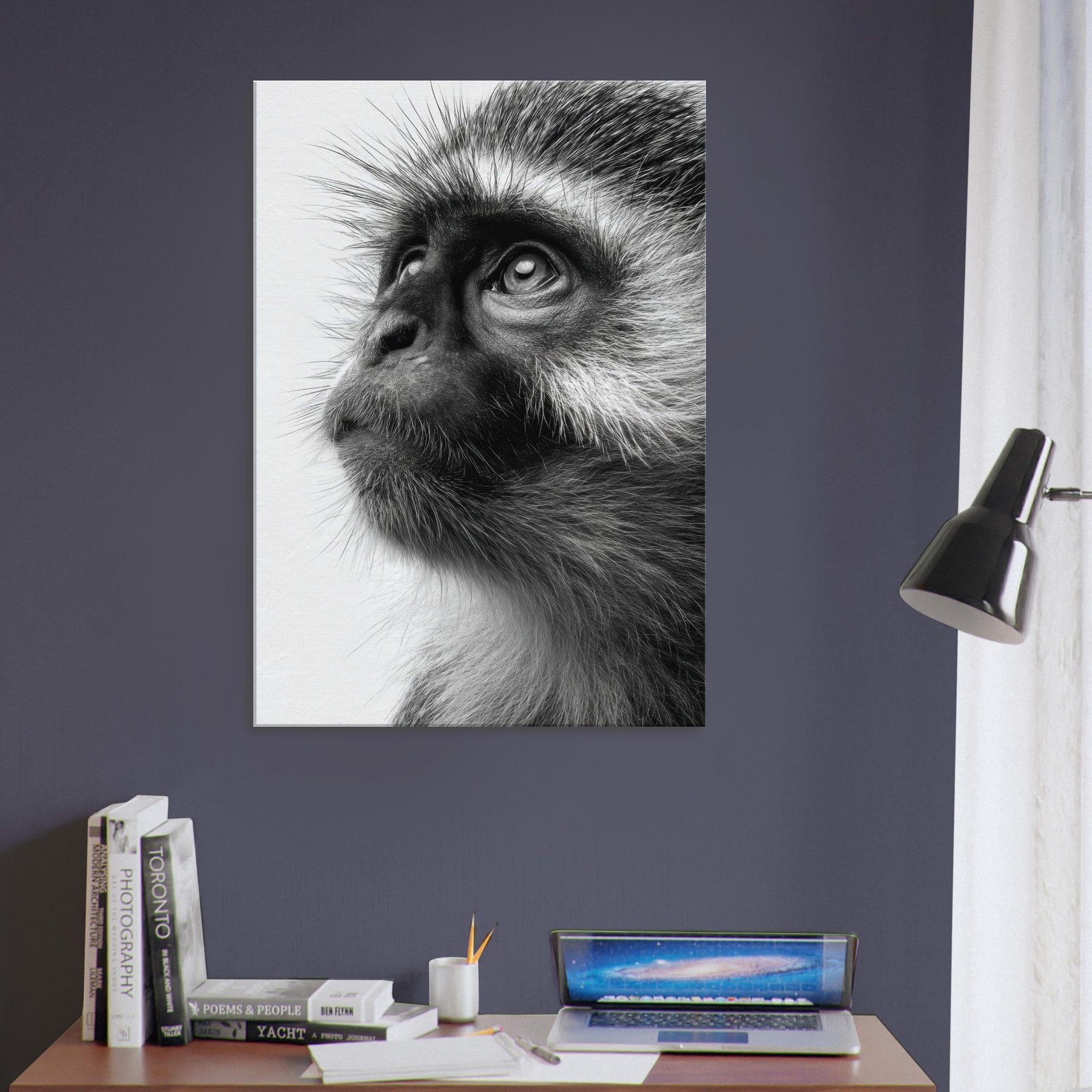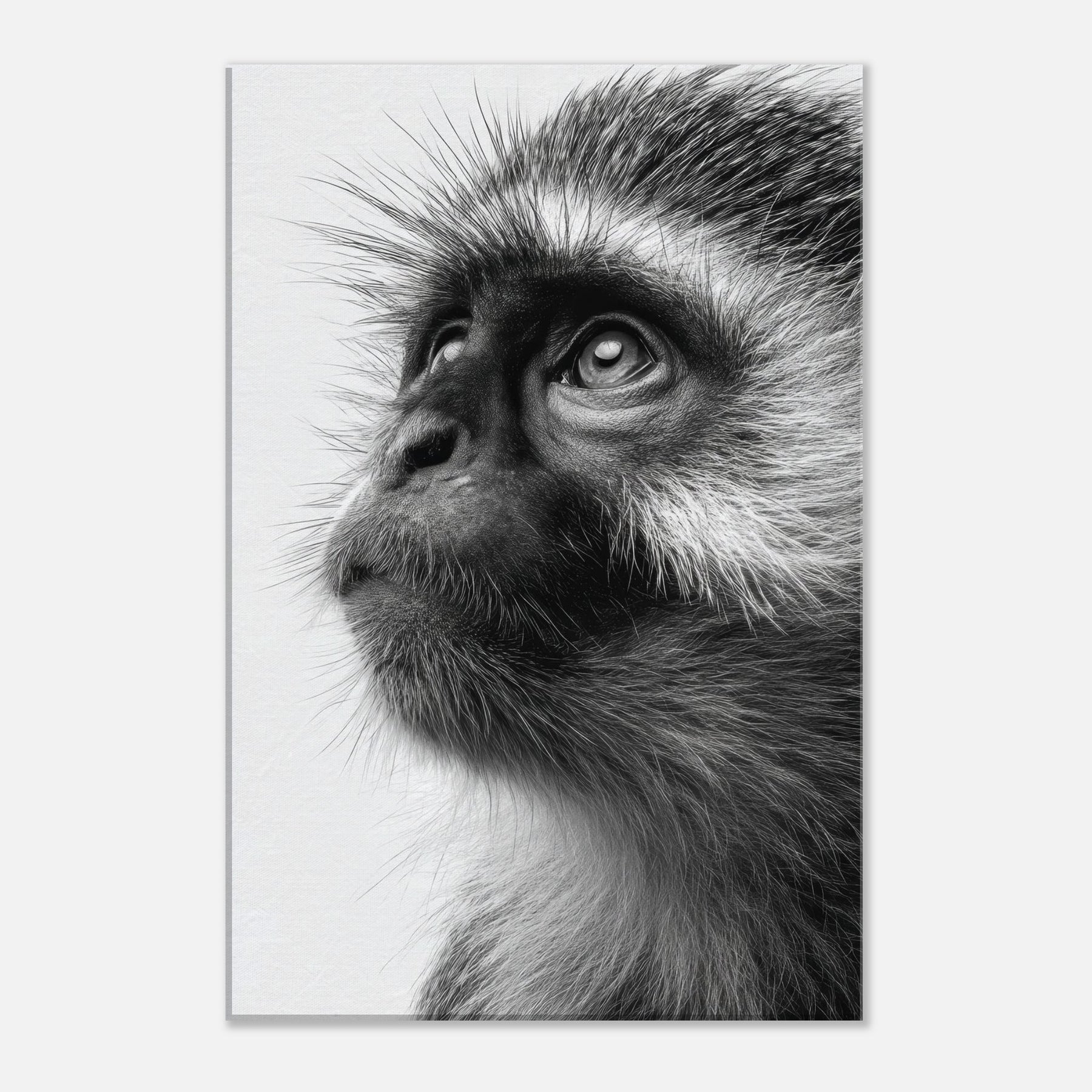 Precise, intimate, and quietly powerful, this black and white study centers a Monkey whose gaze invites you to pause. The contrast of fur texture and shadow creates a sculpture like presence, turning a wall into a contemplative moment. In living spaces, its restrained elegance pairs with clean lines and neutral palettes, adding depth without shouting. This piece invites reflection, making a room feel more sure, more alive as if a moment of wild wonder could live on your wall.