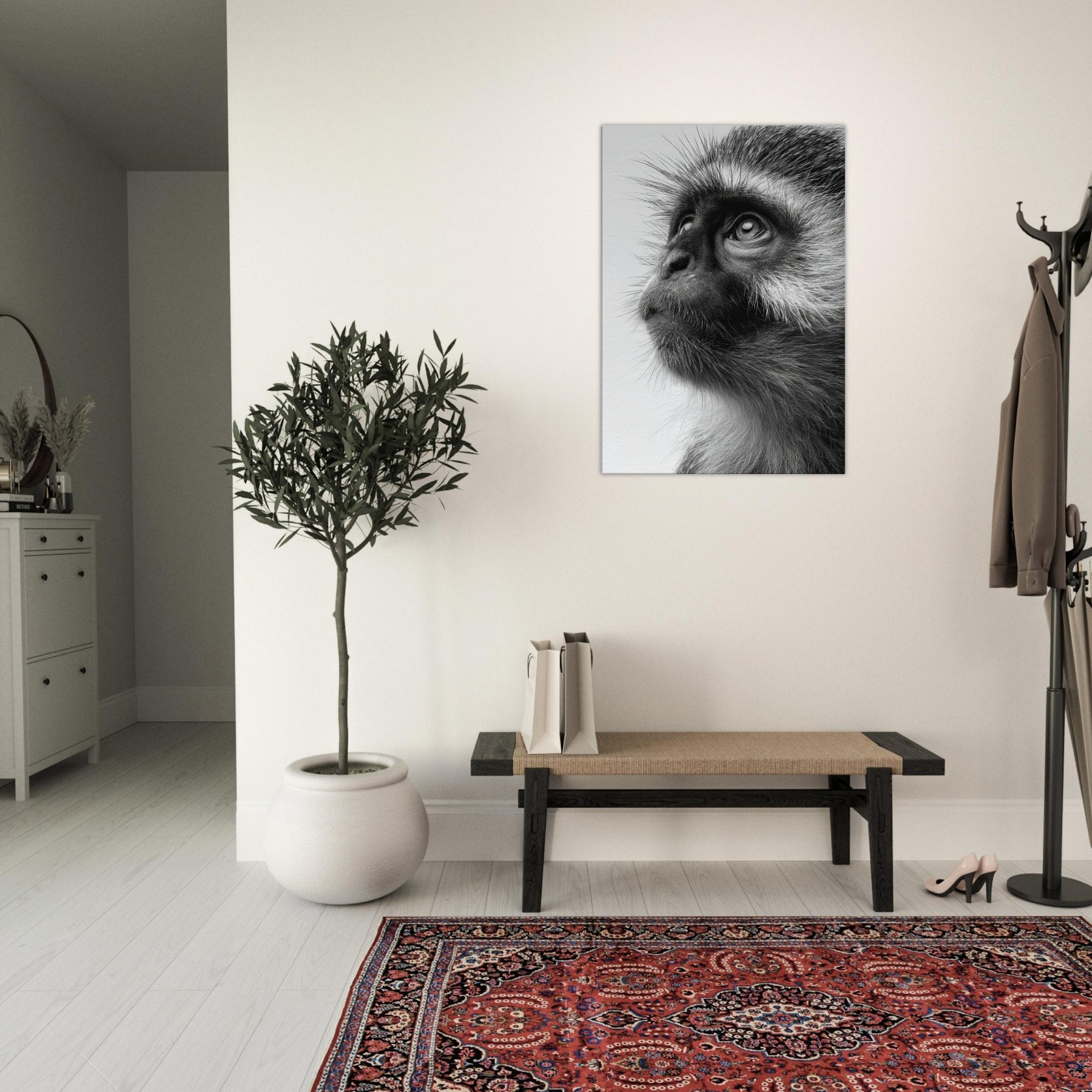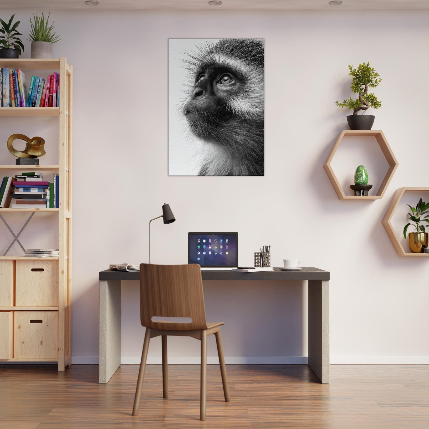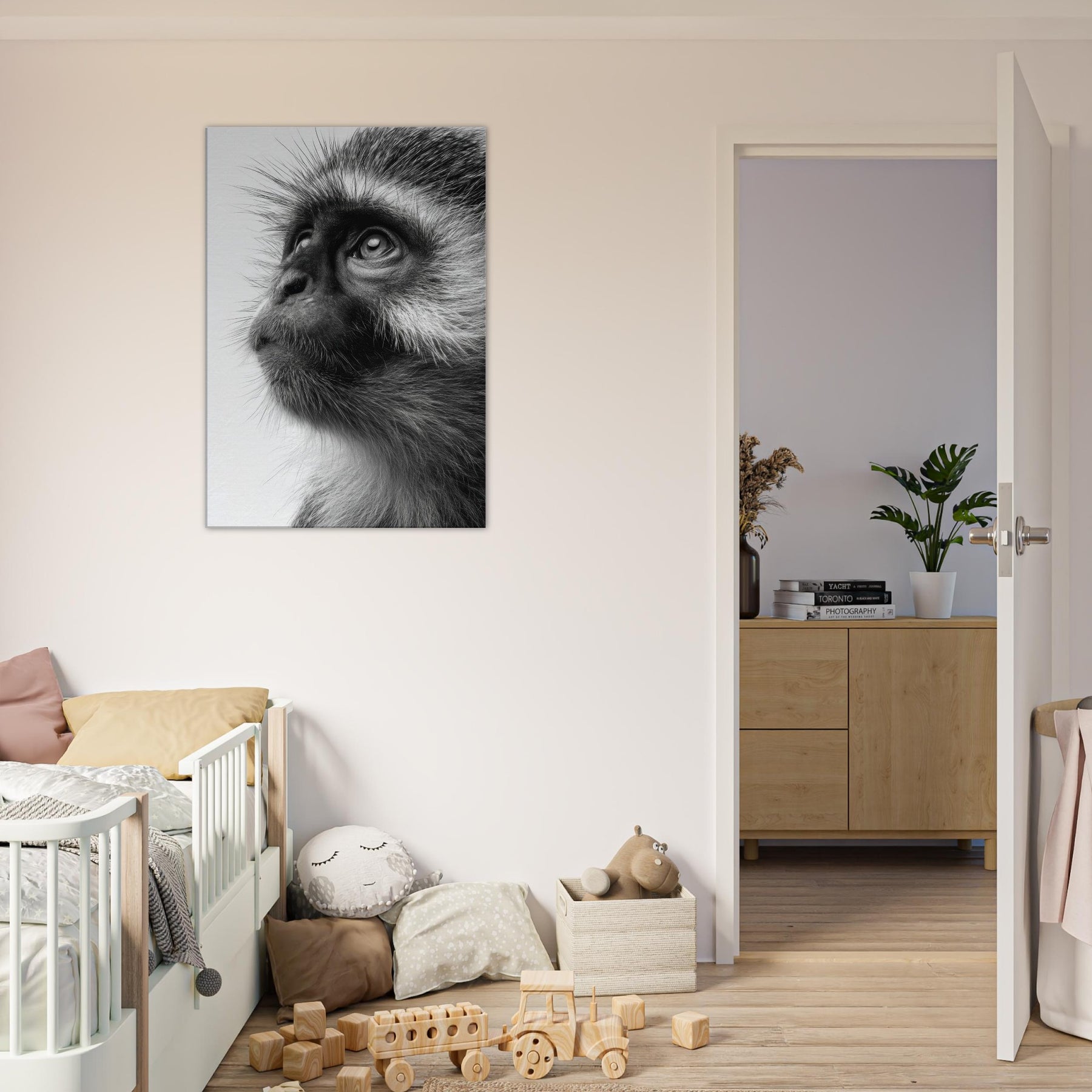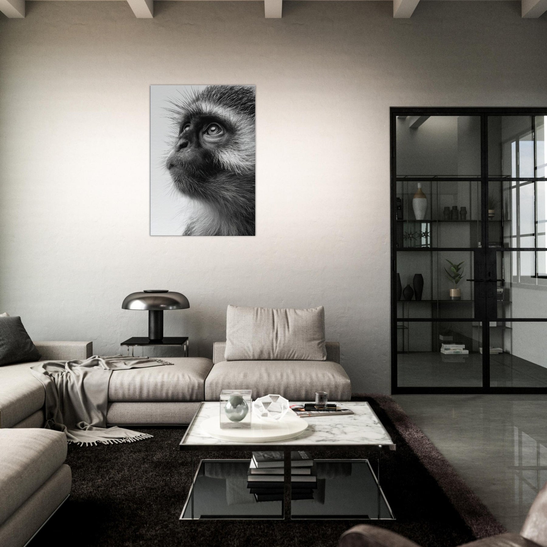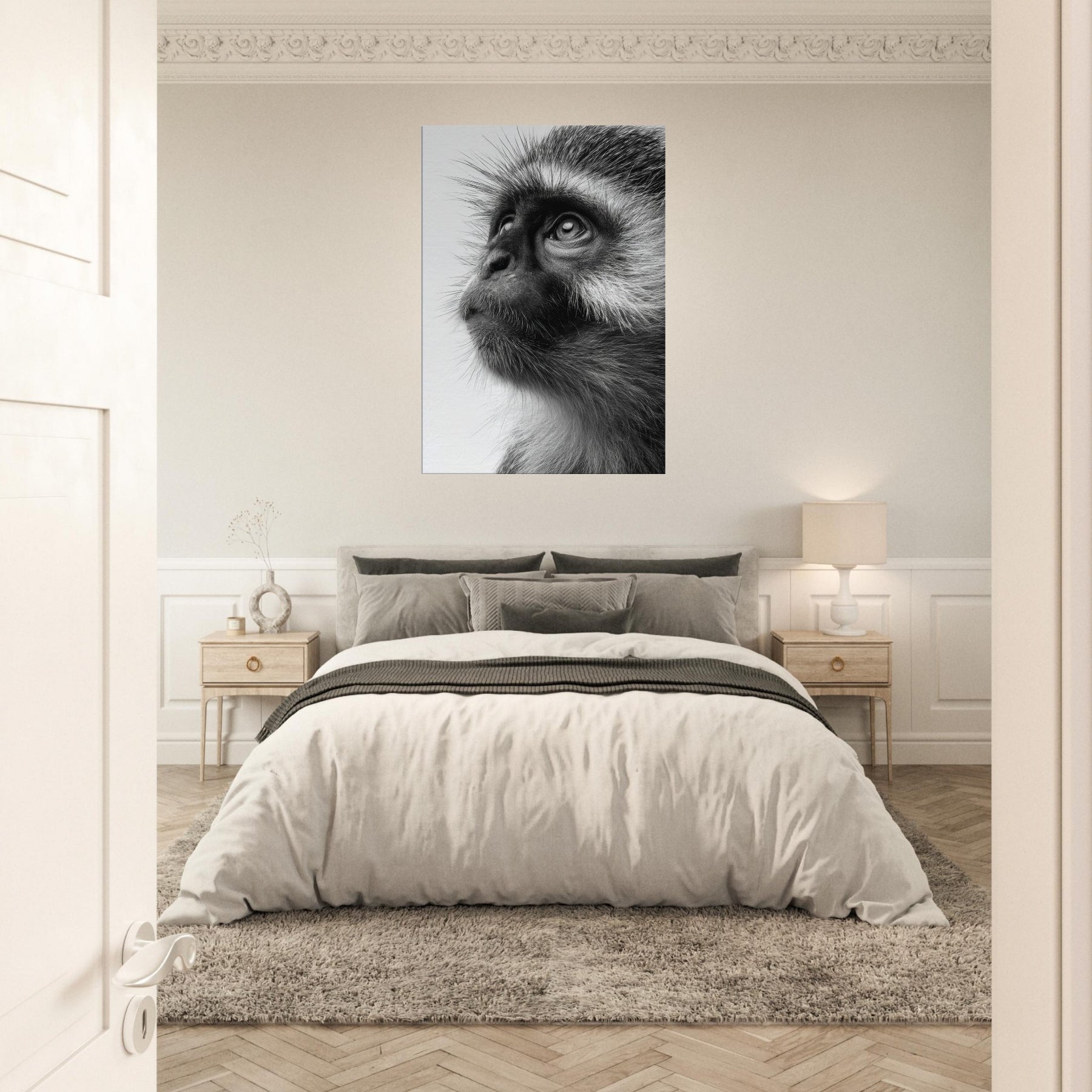 Precise, intimate, and quietly powerful, this black and white study centers a Monkey whose gaze invites you to pause. The contrast of fur texture and shadow creates a sculpture like presence, turning a wall into a contemplative moment. In living spaces, its restrained elegance pairs with clean lines and neutral palettes, adding depth without shouting. This piece invites reflection, making a room feel more sure, more alive as if a moment of wild wonder could live on your wall.