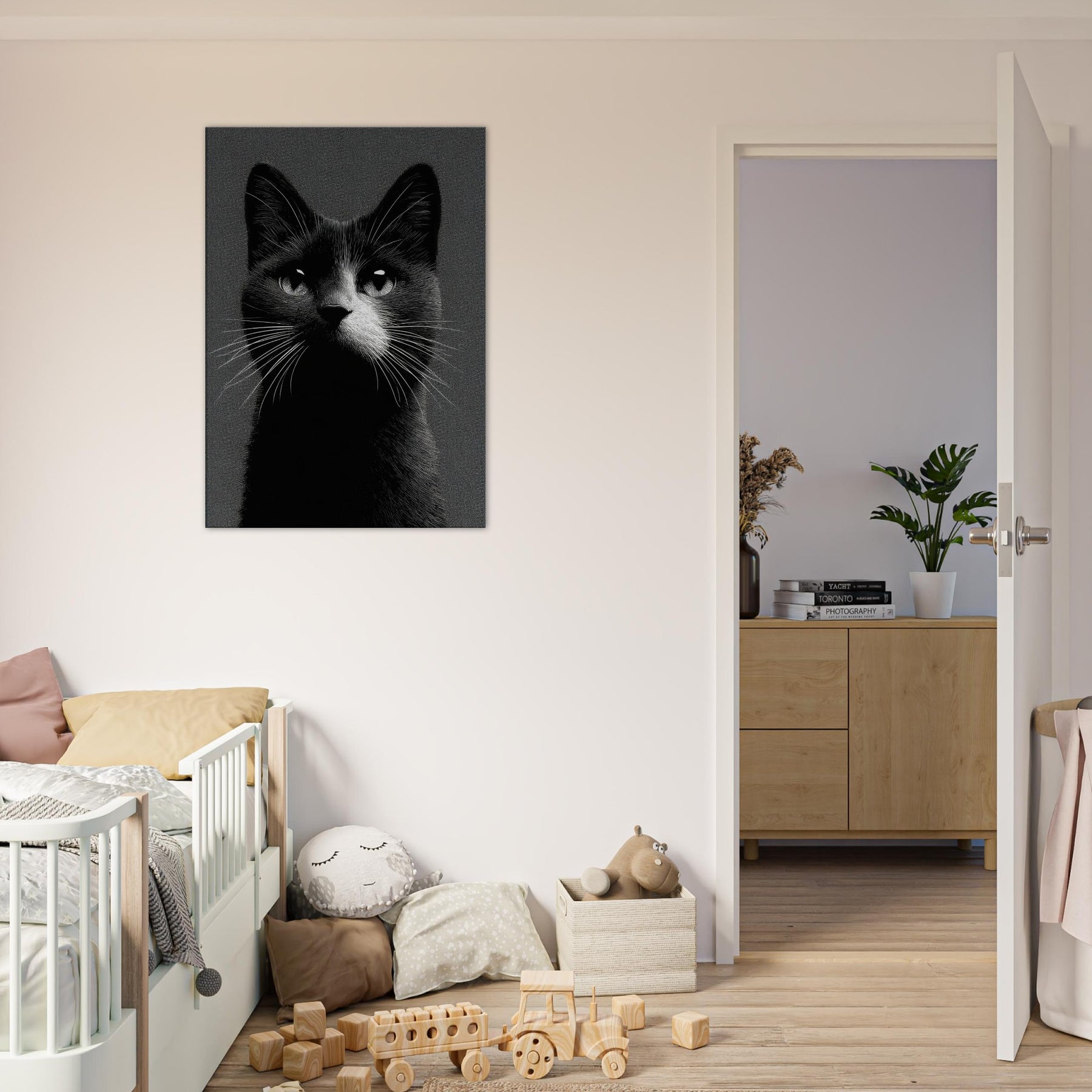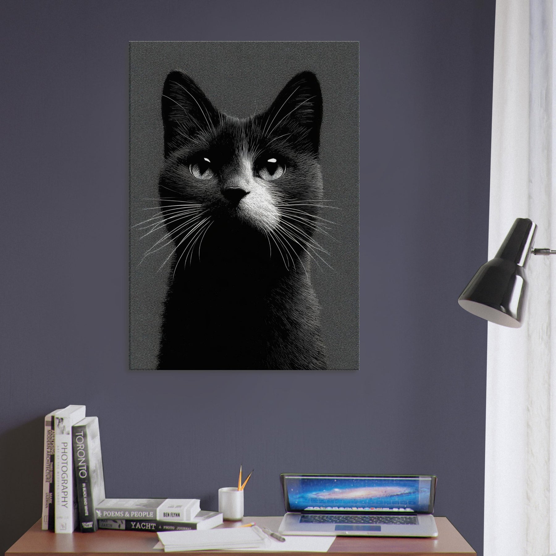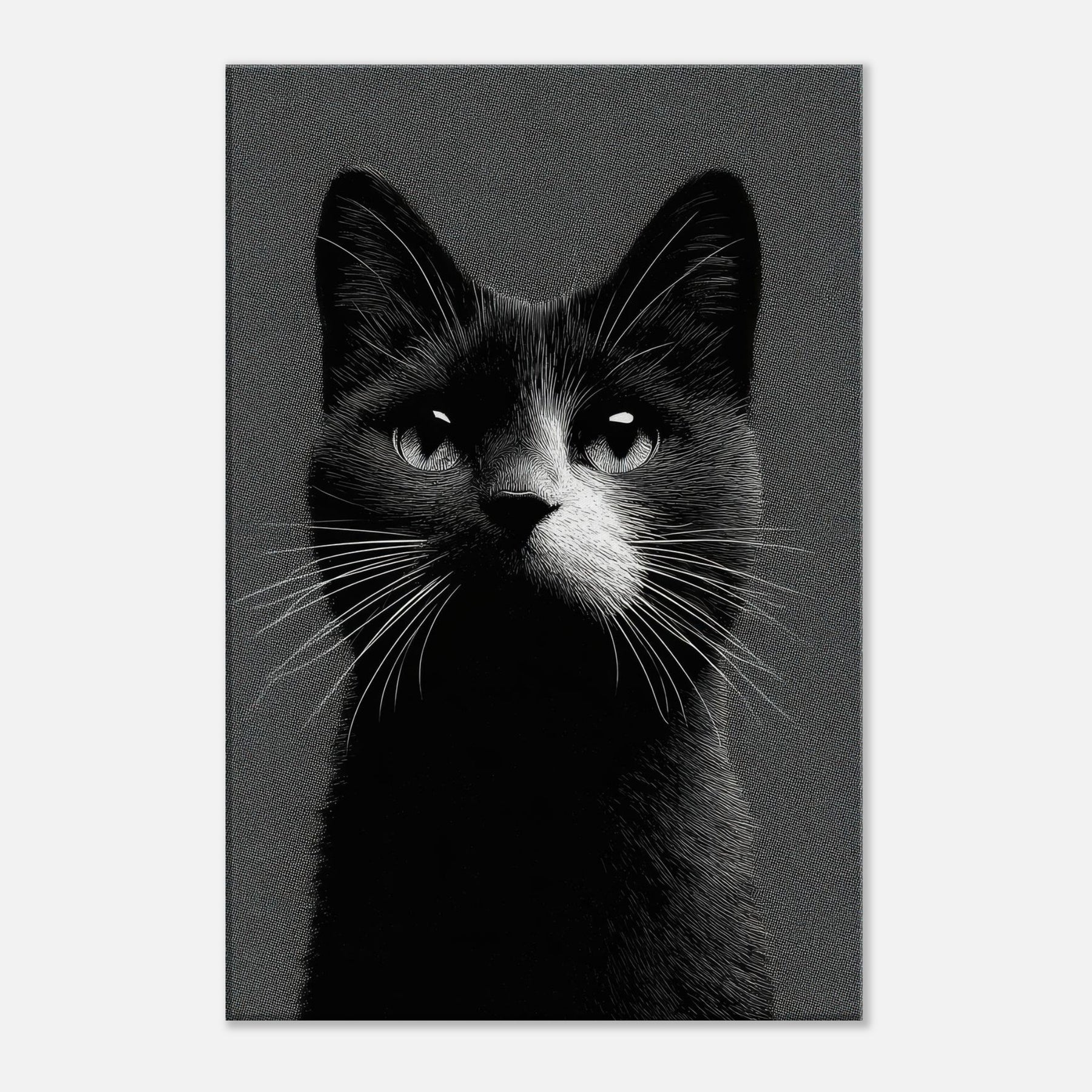 In this striking black and white study, the cat emerges with quiet authority, its gaze both intimate and vast. The negative space and fine line work invite a moment of pause, turning any wall into a gallery corner. The tactile grain and high contrast create a tactile atmosphere cool, serene, and timeless perfect for a living room, hallway, or study. Let this monochrome feline evoke curiosity, grace, and a touch of nocturnal poetry in your space.