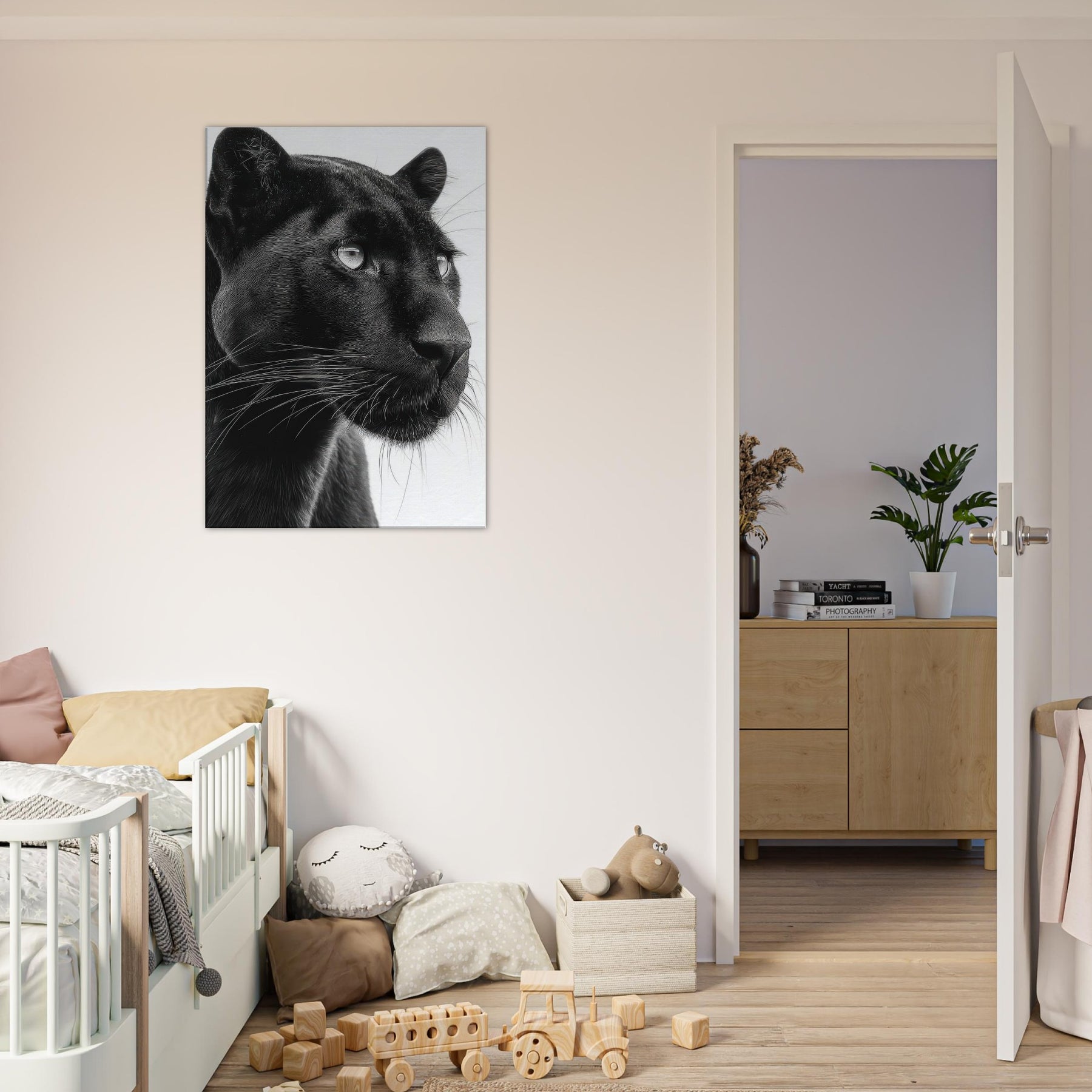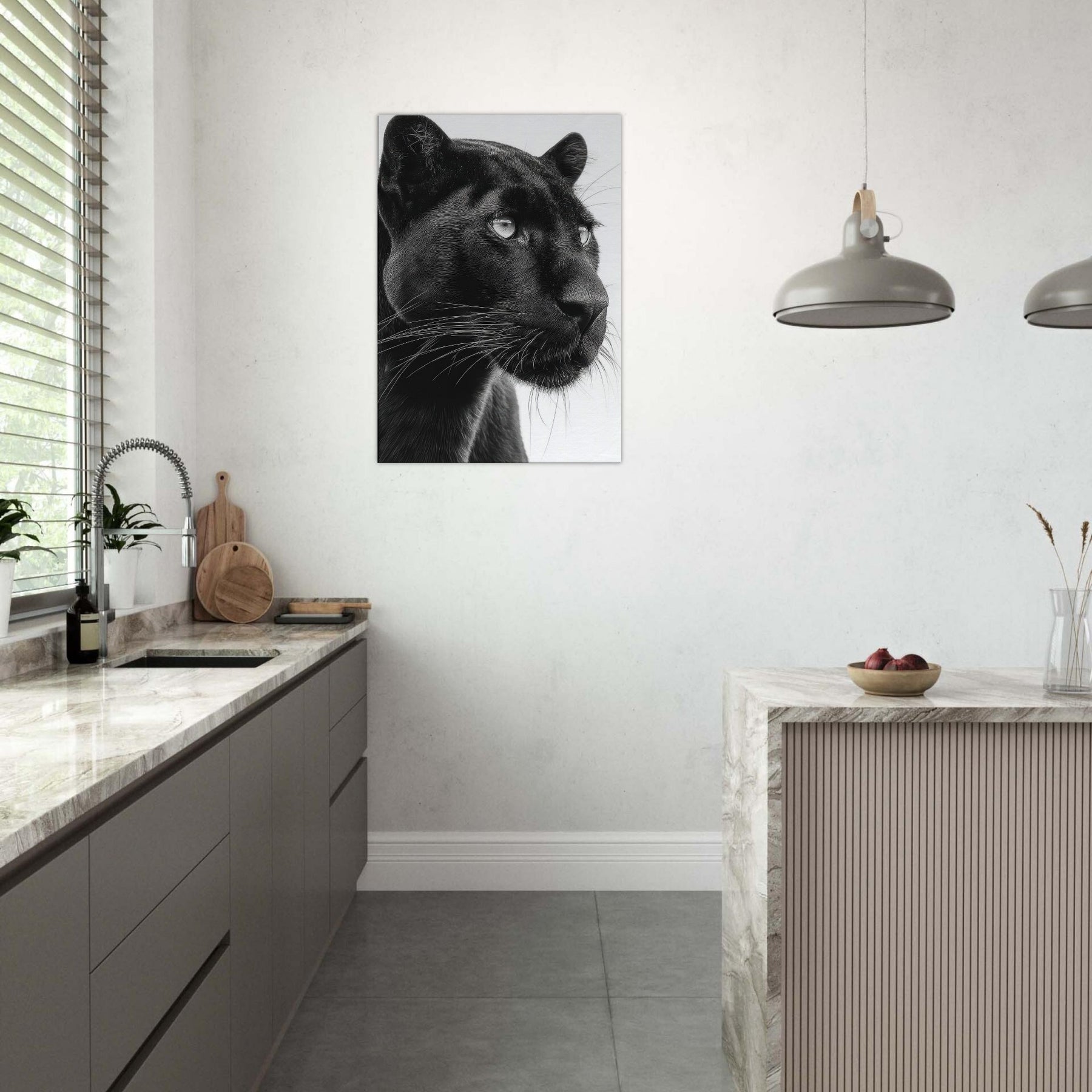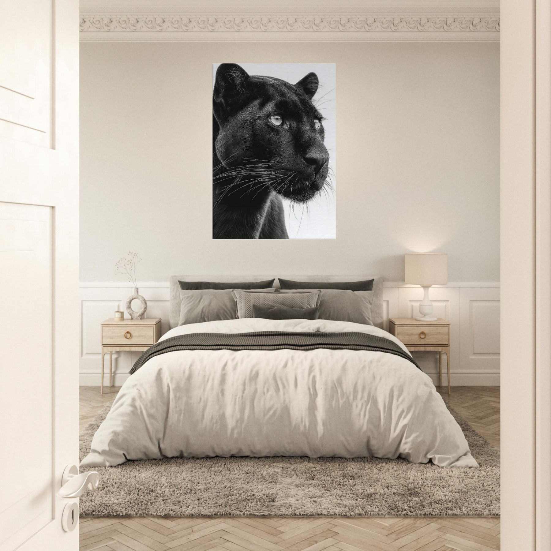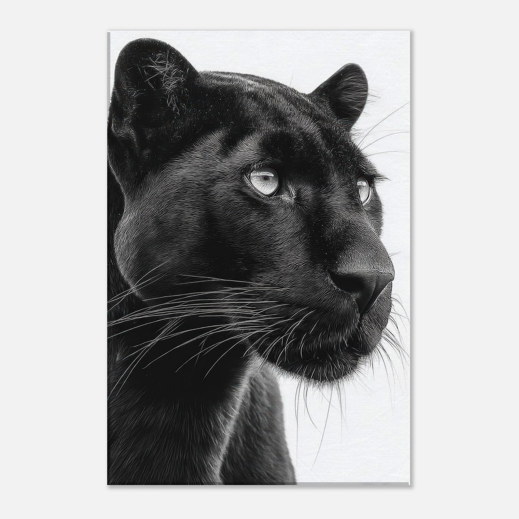 Overhead, a Panther steps into a hush of light and shadow a luxurious study in contrasts. This black and white invites the gaze to linger on the animal's liquid eyes and the sleek plume of whiskers, capturing a moment of alert grace. Printed in rich monochrome, it adds drama without shouting, pairing beautifully with modern neutrals or bold accents. Hang it to anchor a living room or study, where its quiet intensity awakens texture, mood, and a sense of quiet, wild presence.