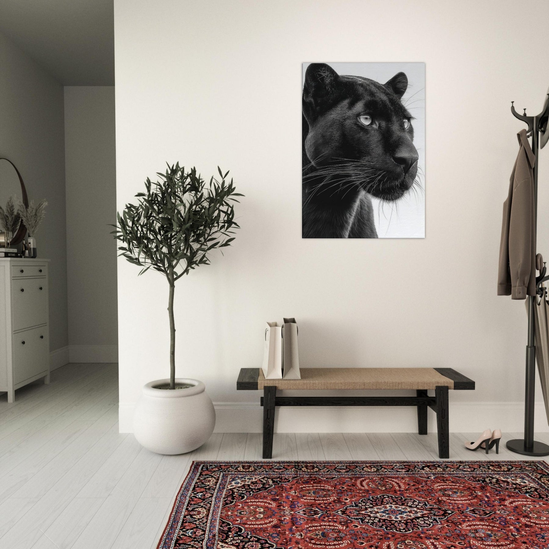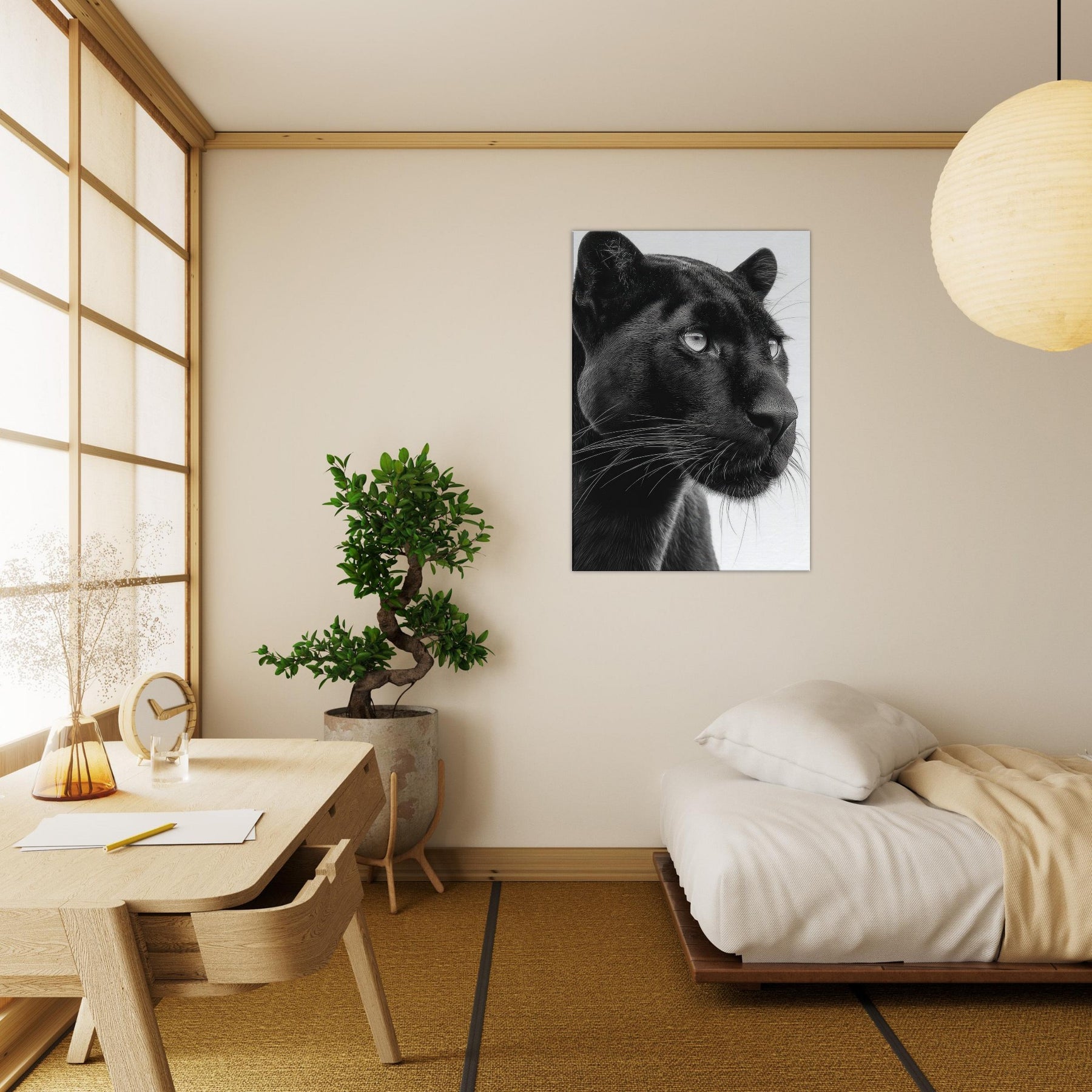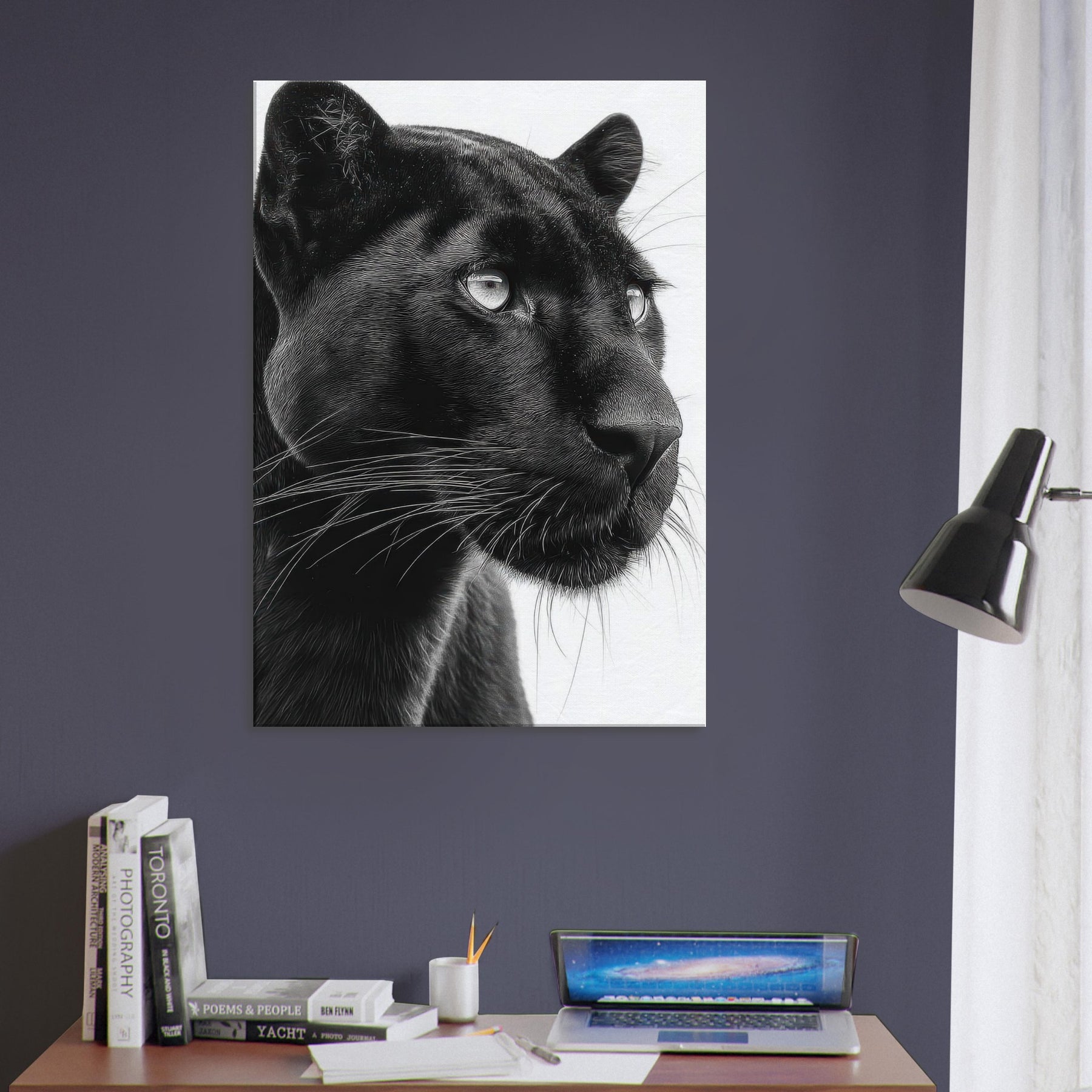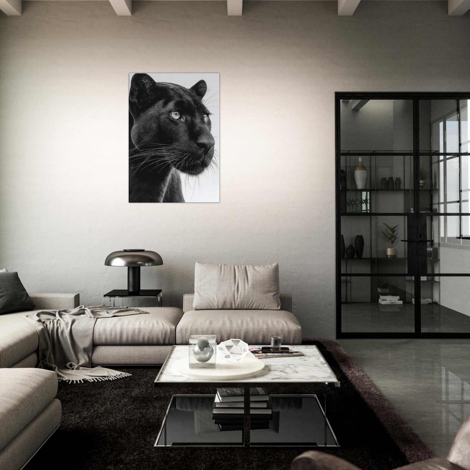 Overhead, a Panther steps into a hush of light and shadow a luxurious study in contrasts. This black and white invites the gaze to linger on the animal's liquid eyes and the sleek plume of whiskers, capturing a moment of alert grace. Printed in rich monochrome, it adds drama without shouting, pairing beautifully with modern neutrals or bold accents. Hang it to anchor a living room or study, where its quiet intensity awakens texture, mood, and a sense of quiet, wild presence.