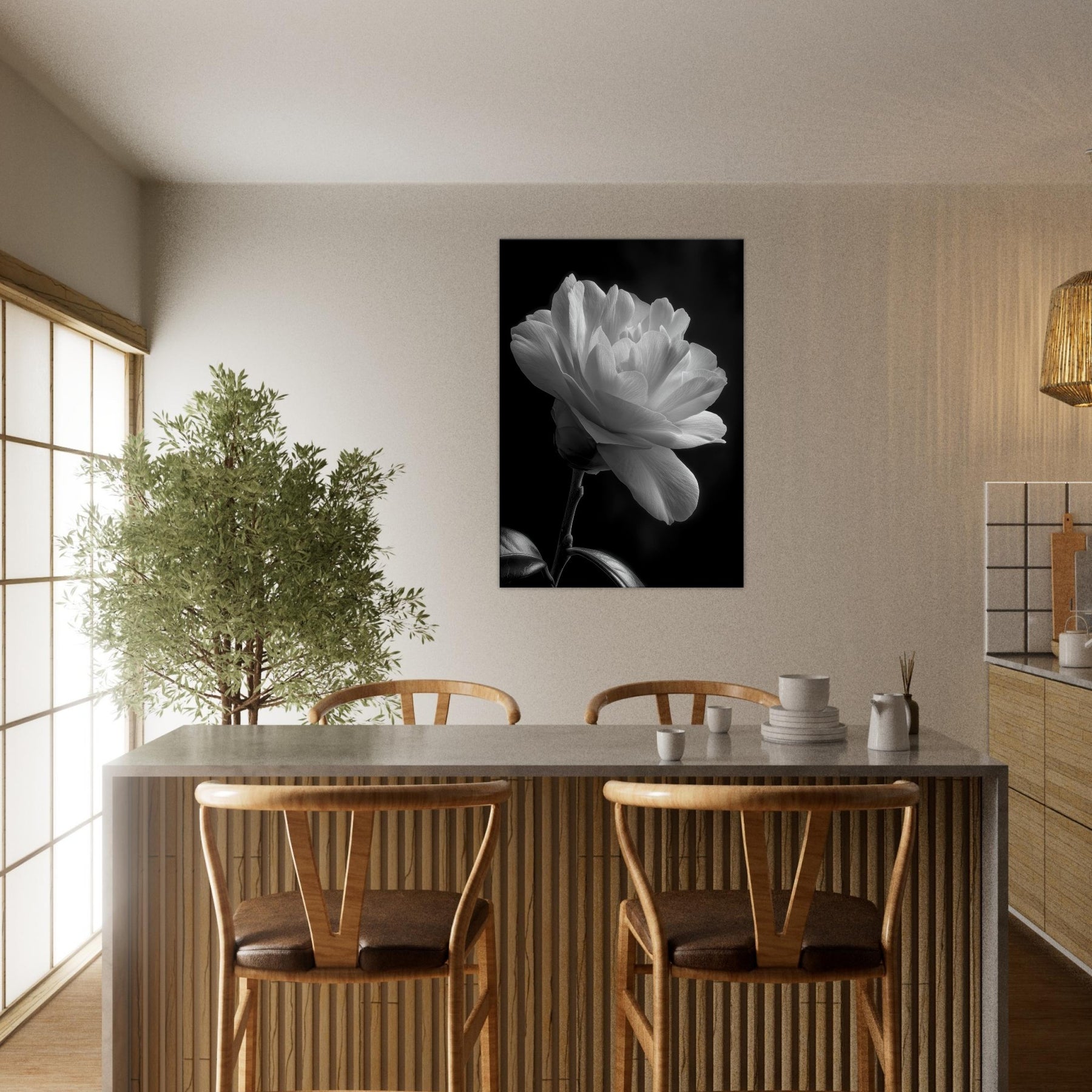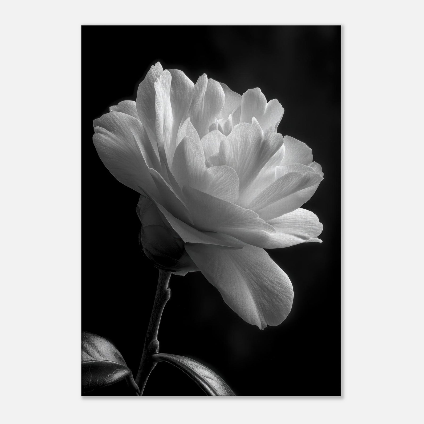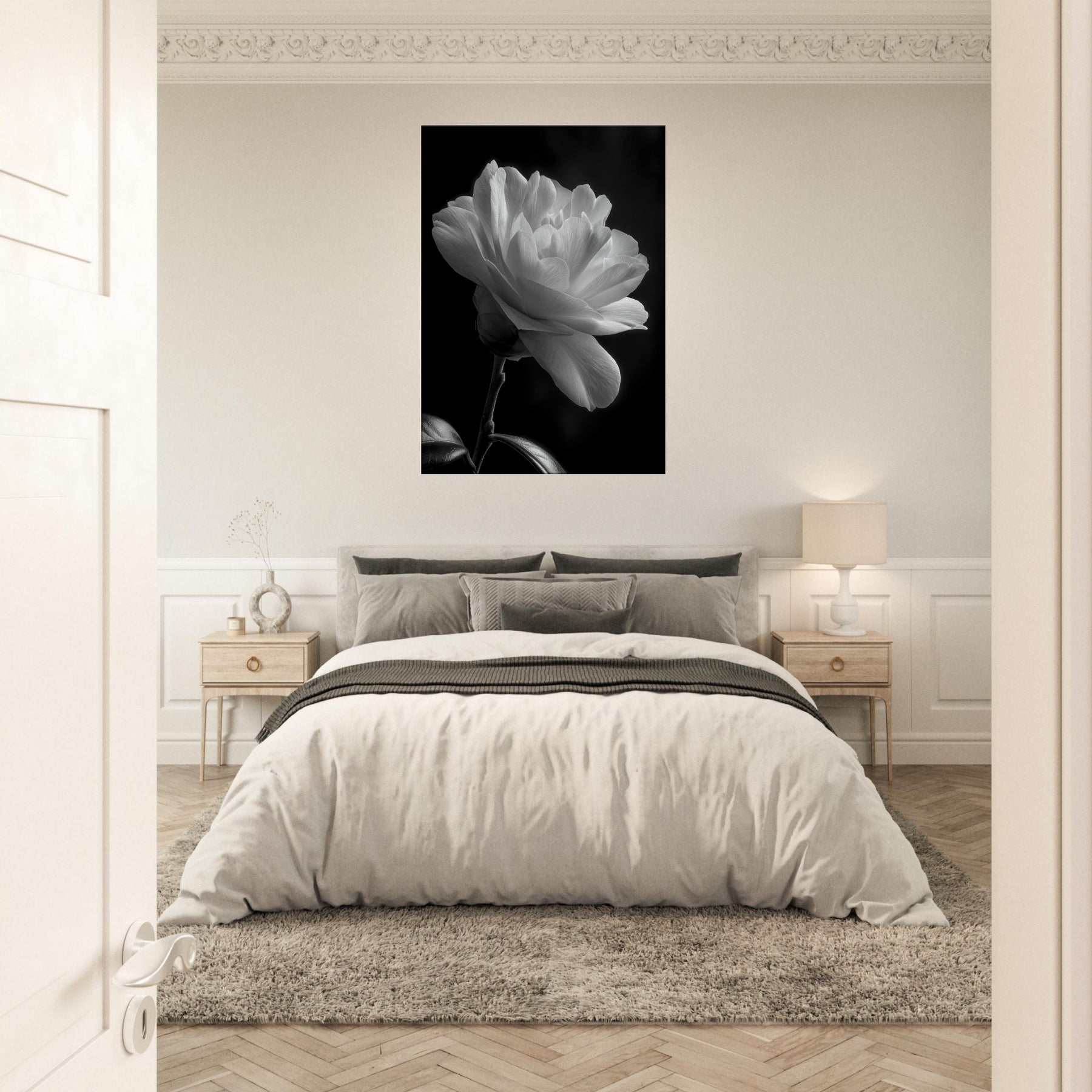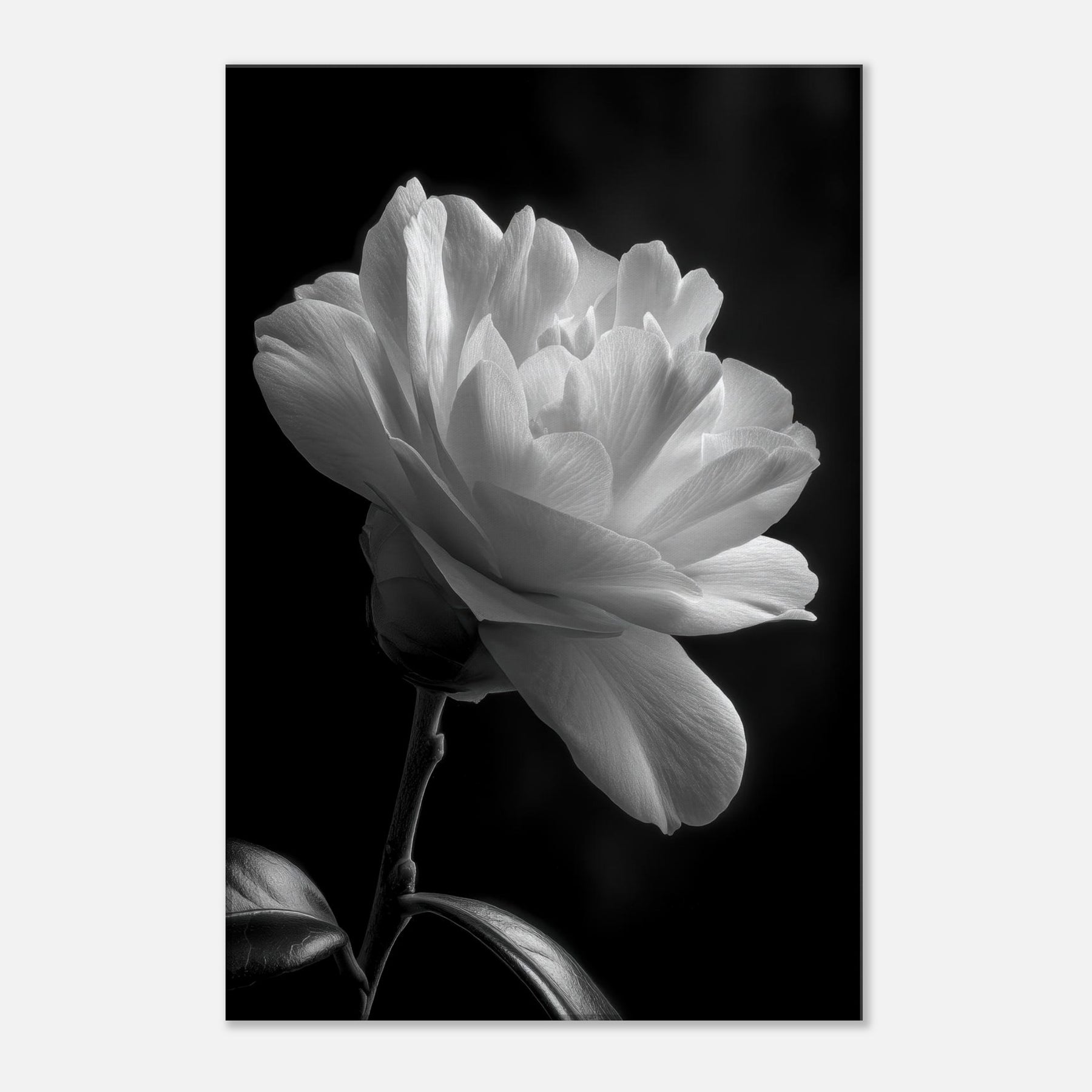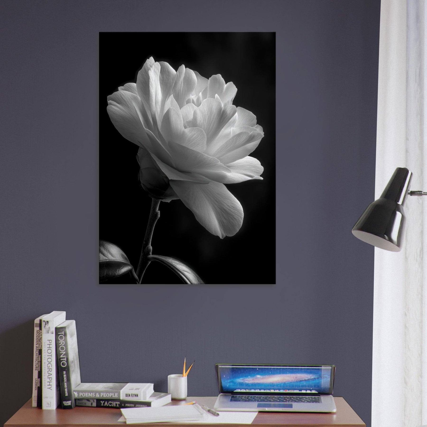 In monochrome poetry, the Camellia unfurls with delicate precision, its petals catching the light as if whispered by a quiet breeze. This black and white study invites stillness into the room, where contrast and curve sculpt a timeless silhouette. Hang it above a sofa or nightstand to cast a calm, contemplative glow; the absence of color heightens texture the velvet sheen of petals, the gentle veins in the leaf making every moment spent in its presence feel intimate, refined, and infinitely serene.