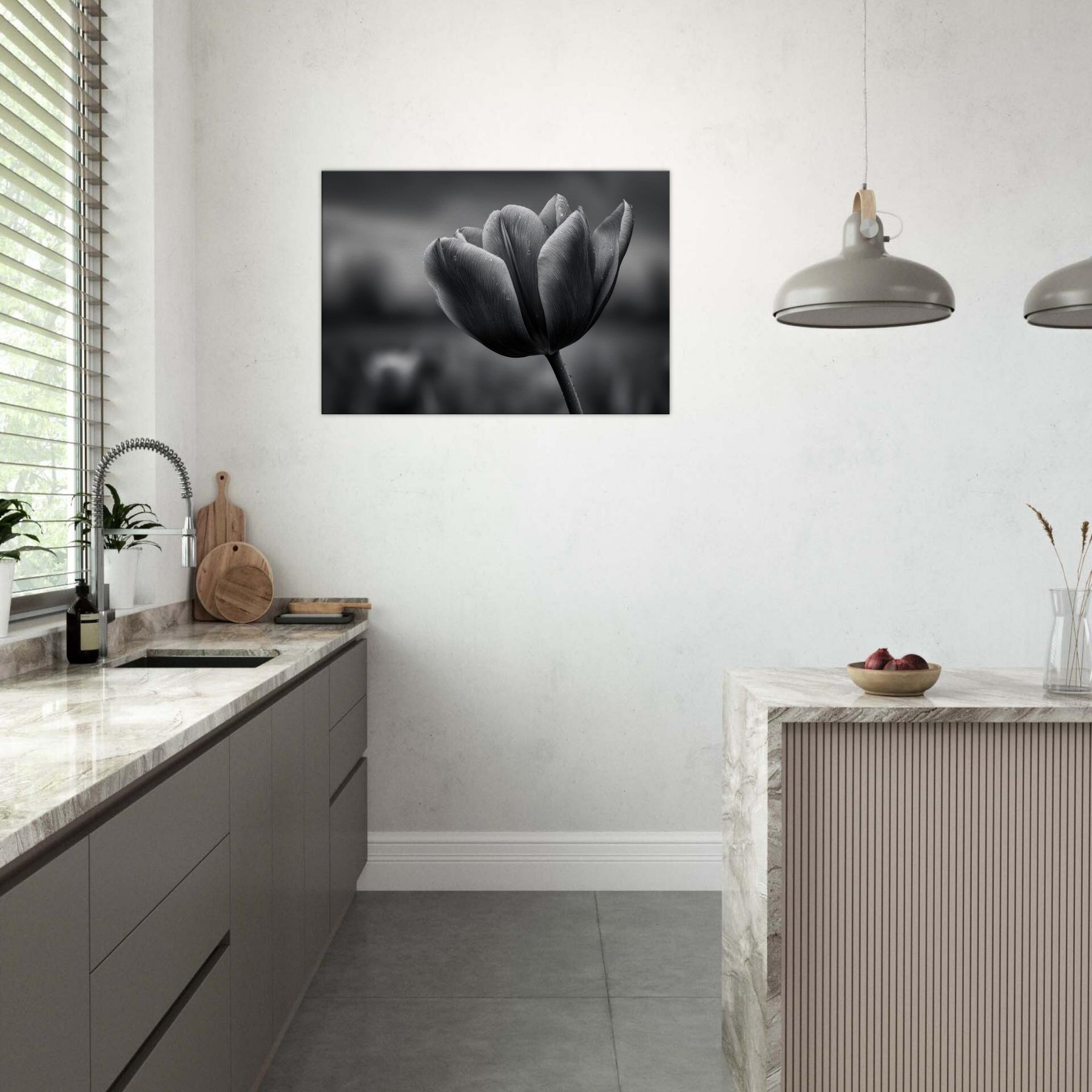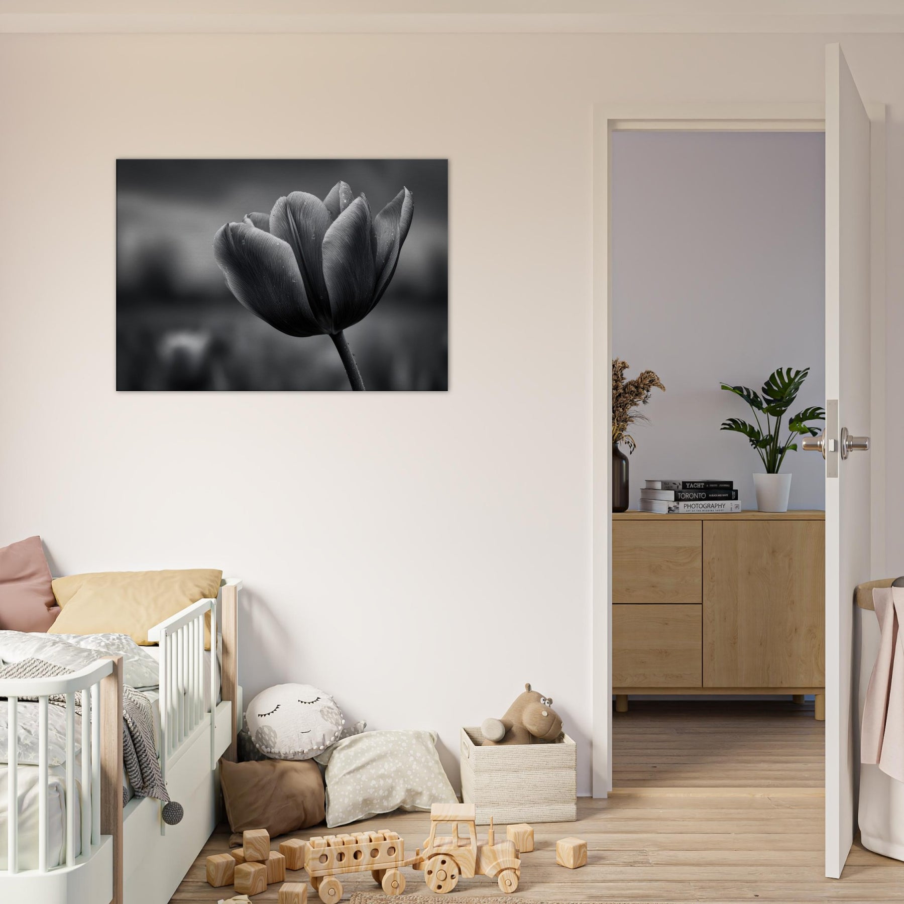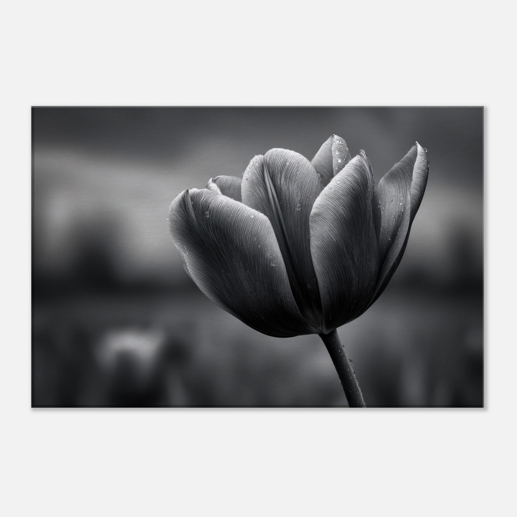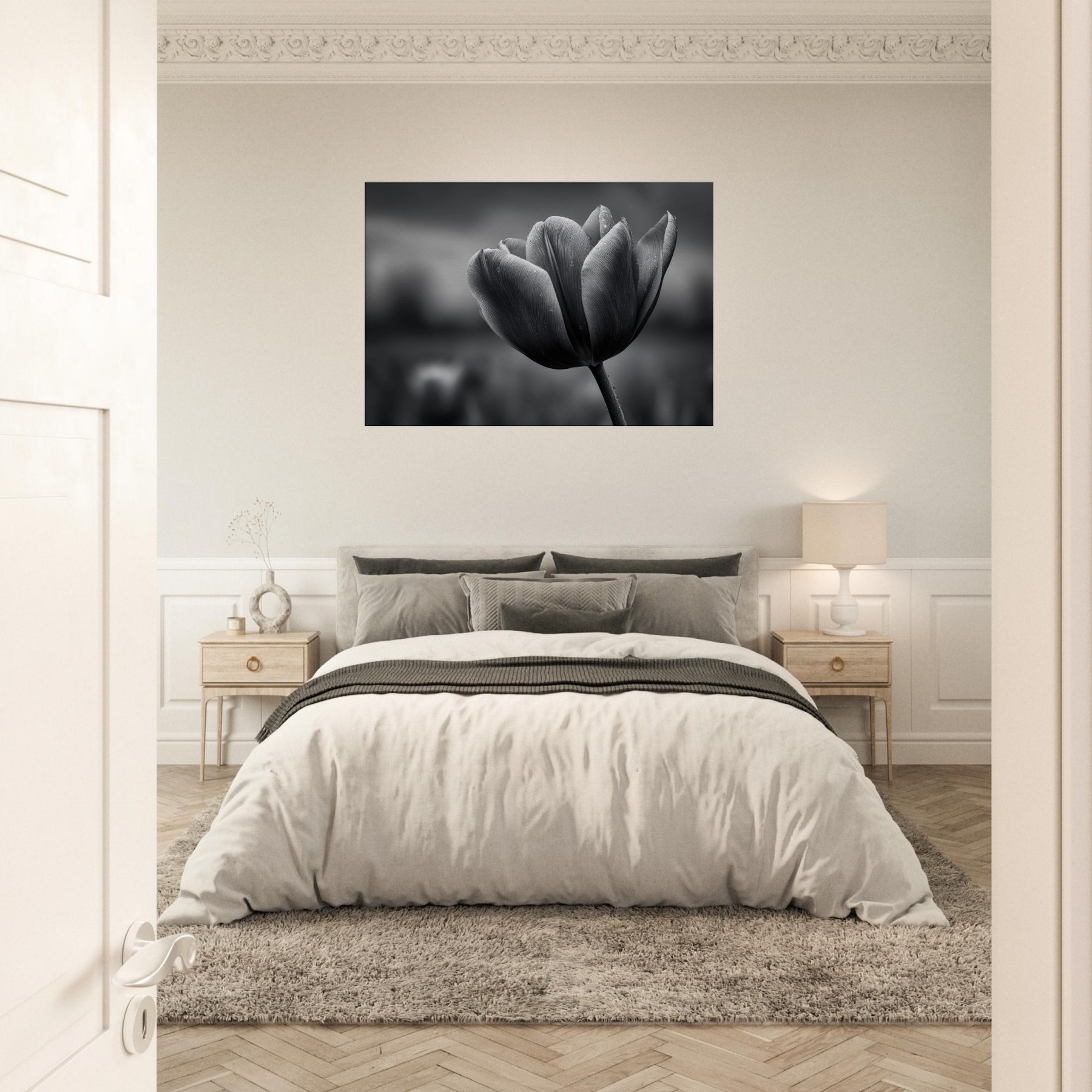 An intimate study of a single tulip, rendered in tonal blacks and grays that hush the room with quiet drama. The petals hold dew like tiny prisms, catching light and memory in their curves. This black and white stillness invites slow breathing, turning a hallway or living area into a contemplative sanctuary. Balanced, elegant, and endlessly versatile, it pairs with crisp furnishings and soft textures alike, letting the tulip become a focal whisper for reflection and refined, everyday beauty.
