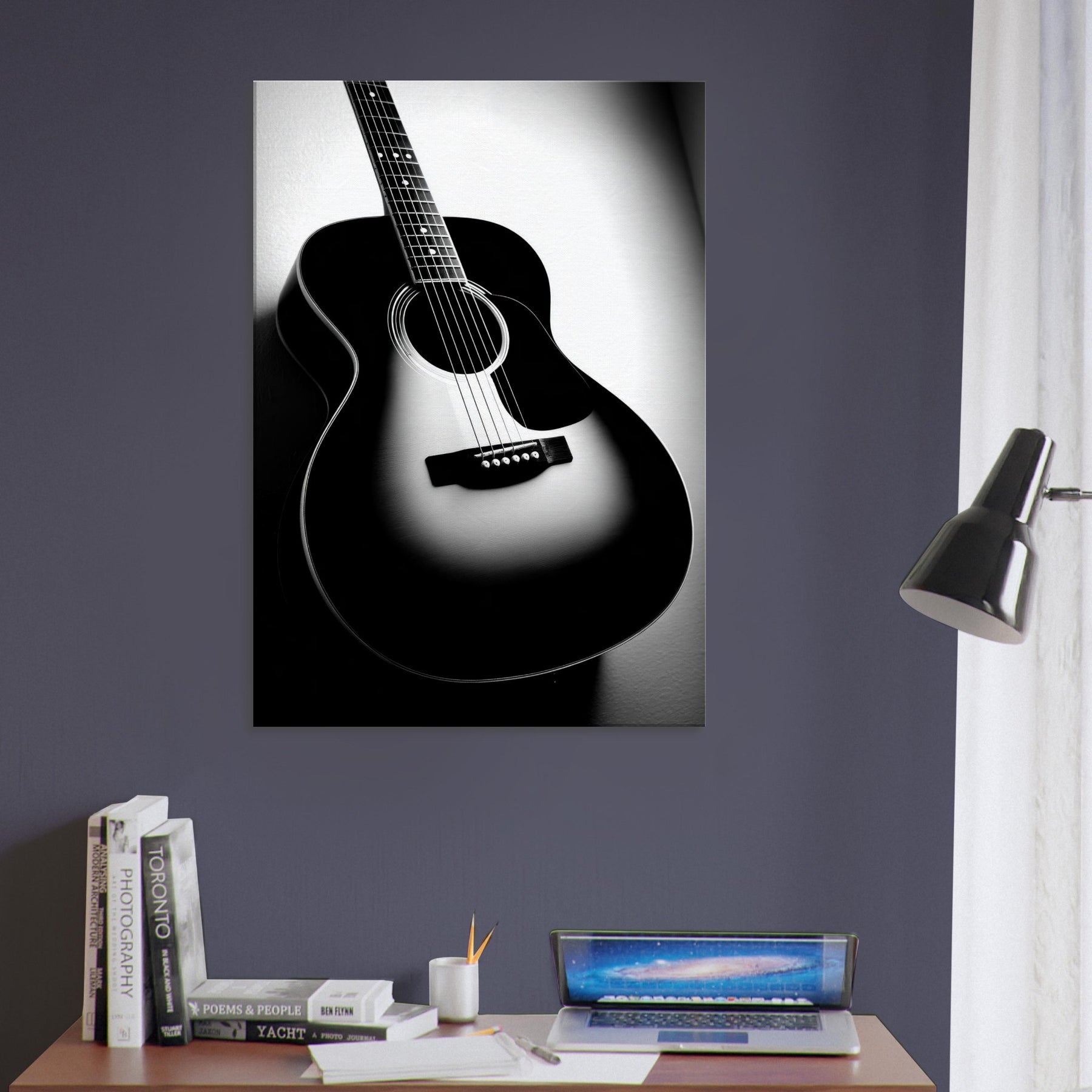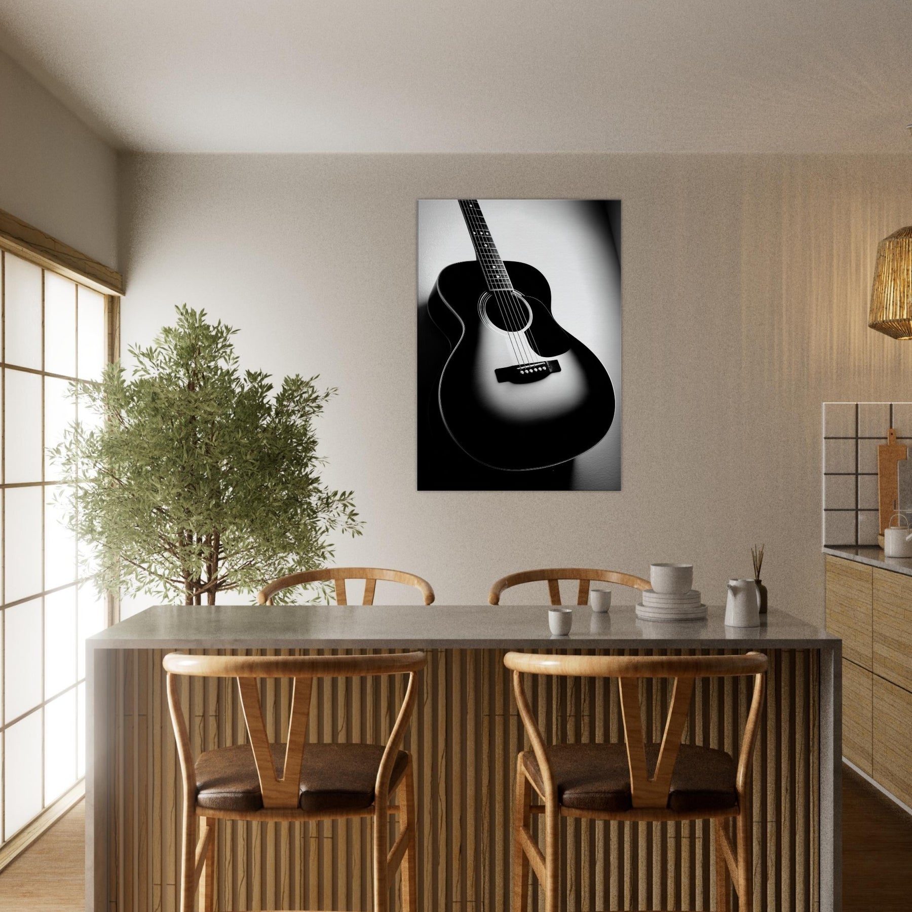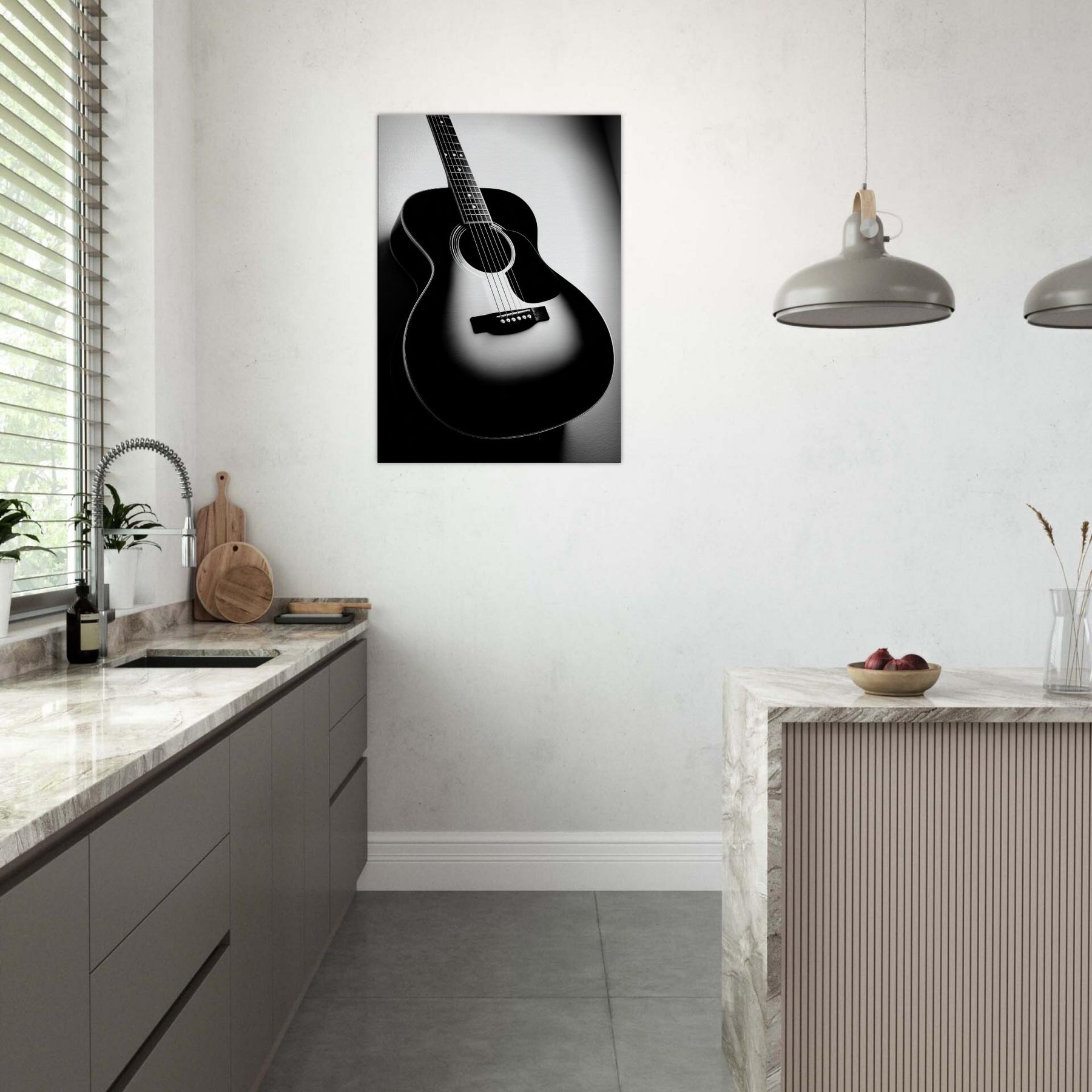 In stark contrast, the Guitar becomes a sculptural silhouette, its curves catching light and shadow as if memories are carved into the grain. This black and white study invites a hush of resonance into any room, turning a wall into a quiet stage. Let the instrument’s solitary presence anchor a living space, offering craft, rhythm, and timeless focus. Perfect above a sofa or desk, it brings refined mood, quiet drama, and everyday music to the home.