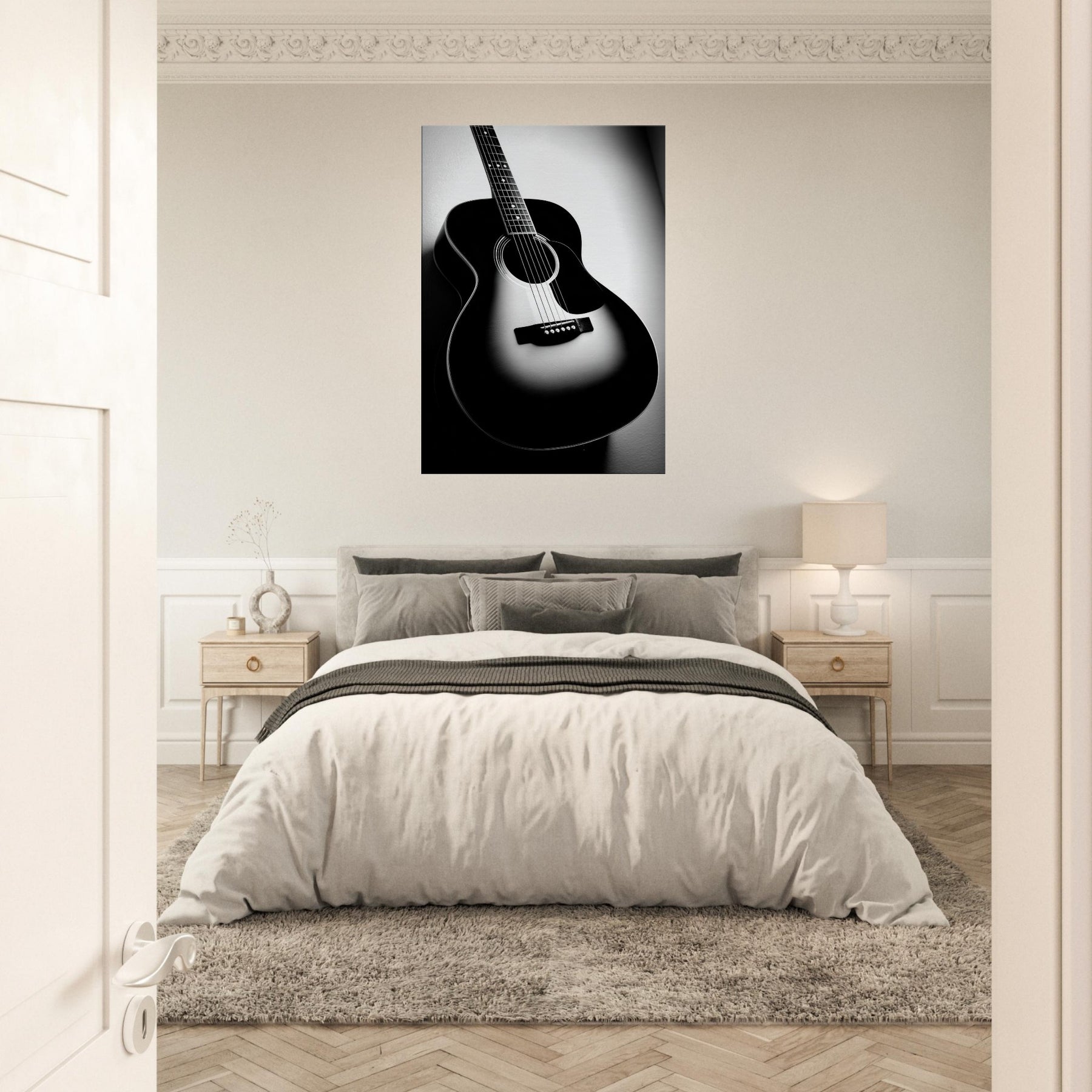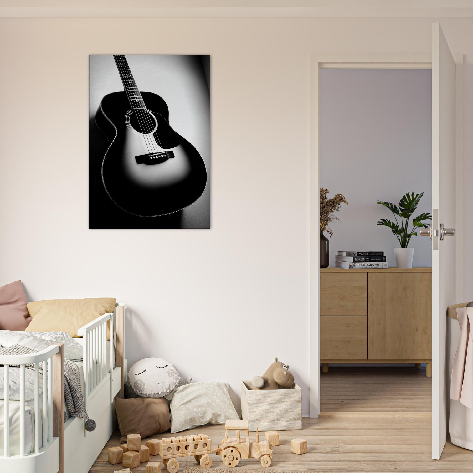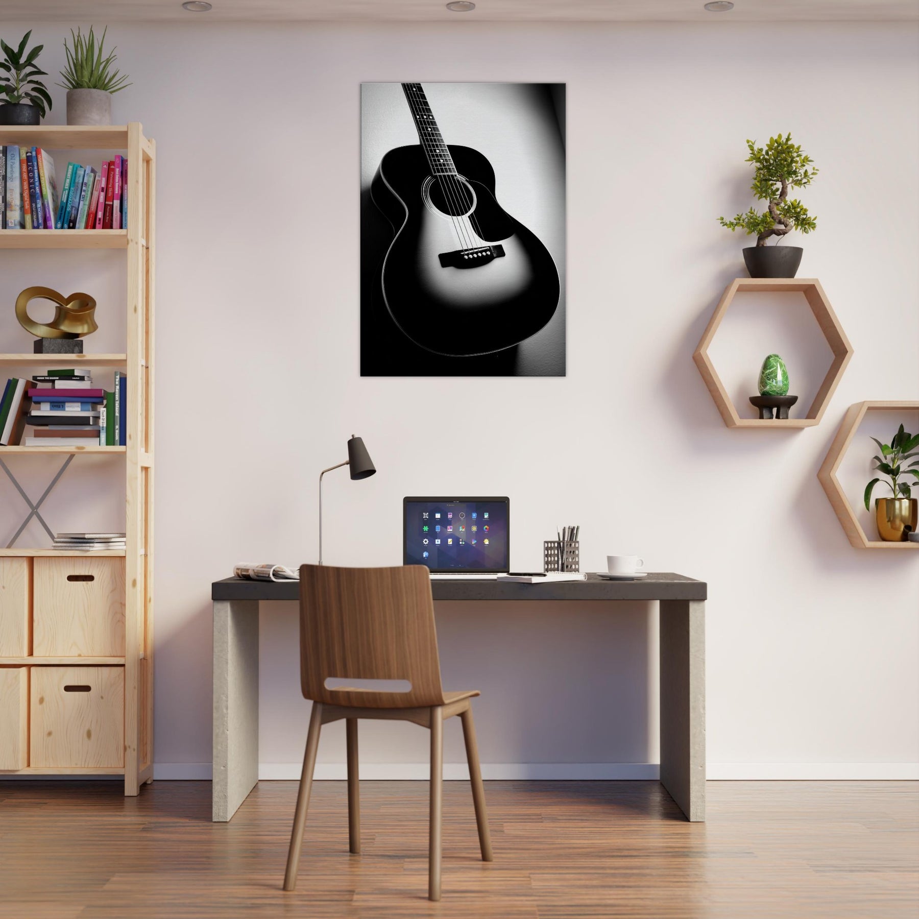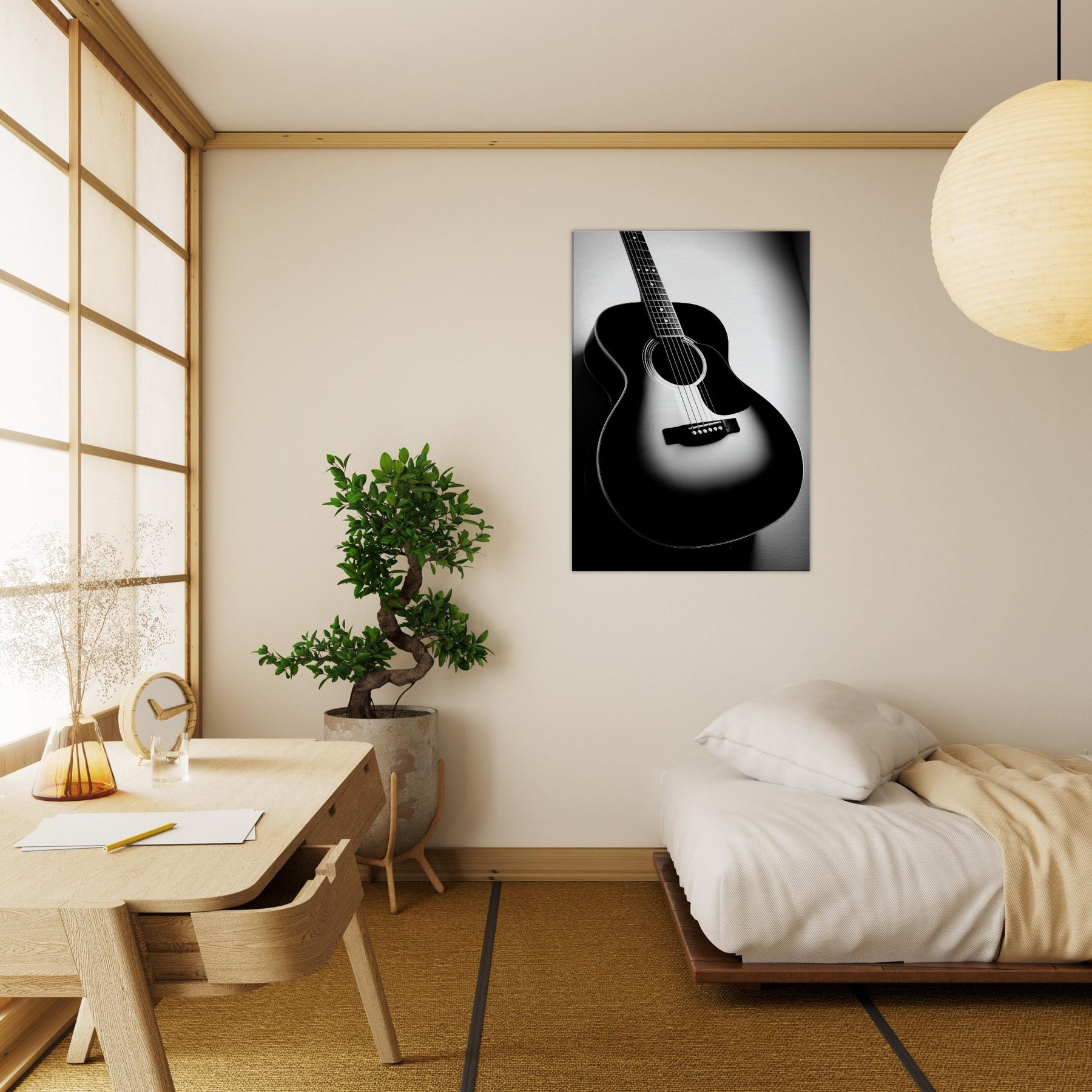 In stark contrast, the Guitar becomes a sculptural silhouette, its curves catching light and shadow as if memories are carved into the grain. This black and white study invites a hush of resonance into any room, turning a wall into a quiet stage. Let the instrument’s solitary presence anchor a living space, offering craft, rhythm, and timeless focus. Perfect above a sofa or desk, it brings refined mood, quiet drama, and everyday music to the home.