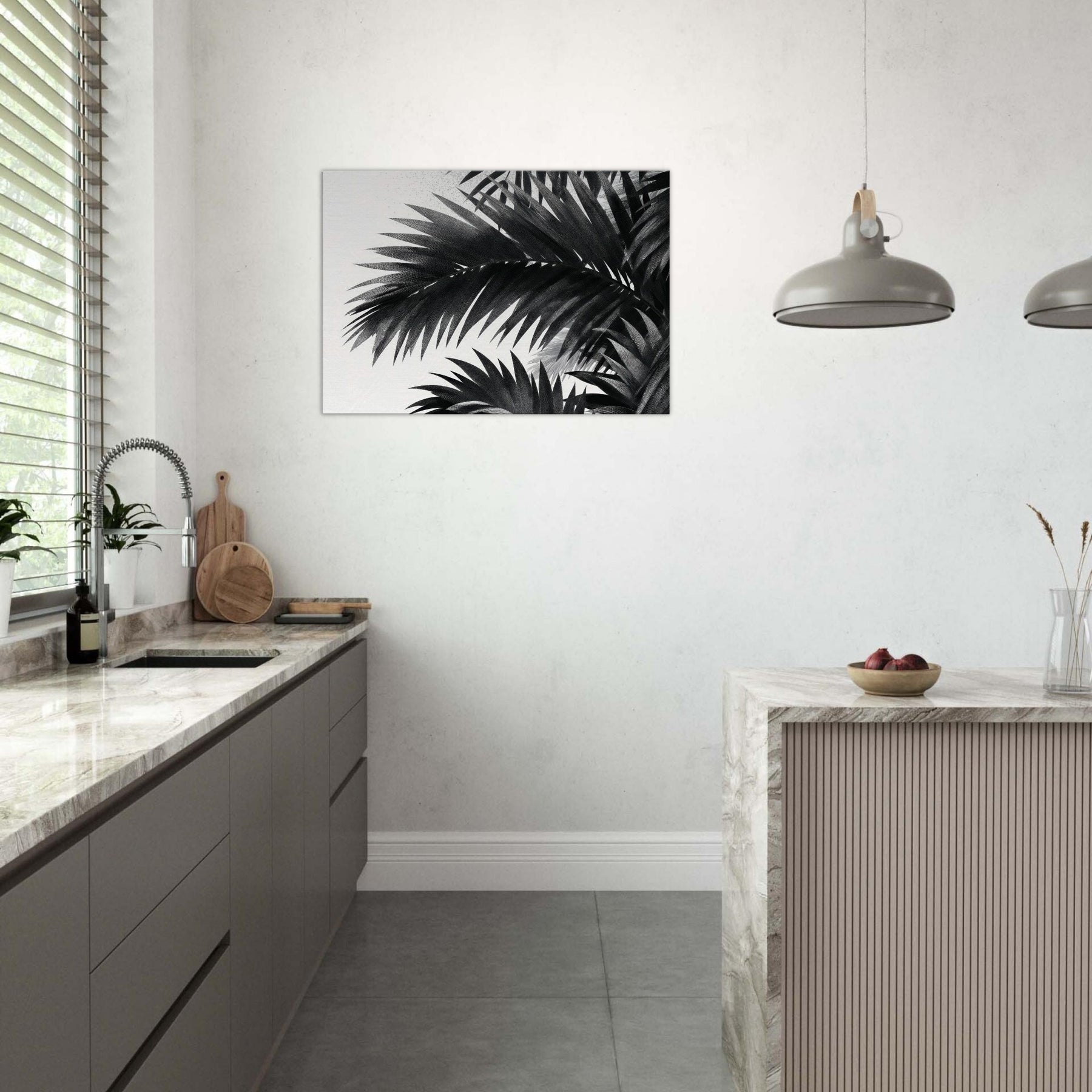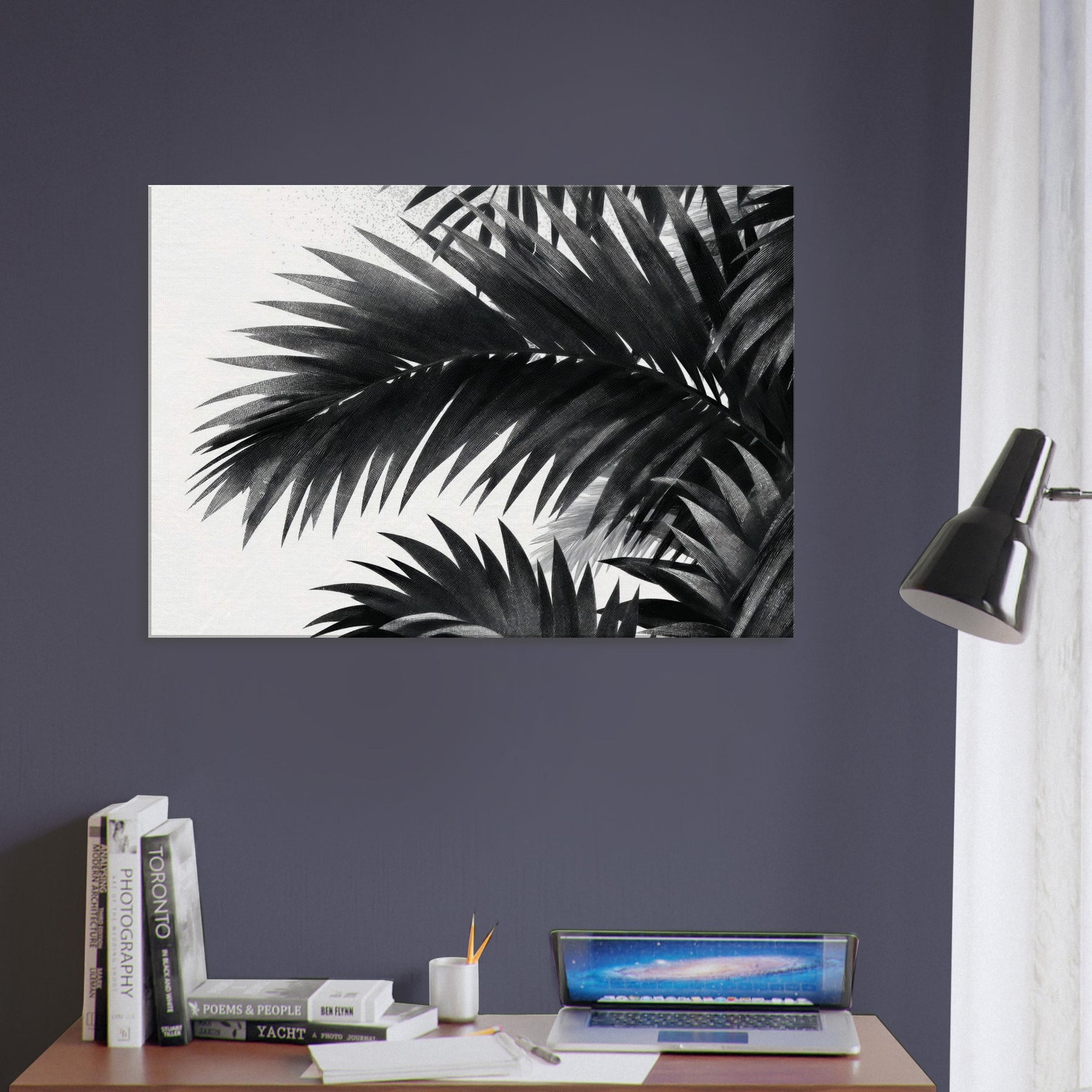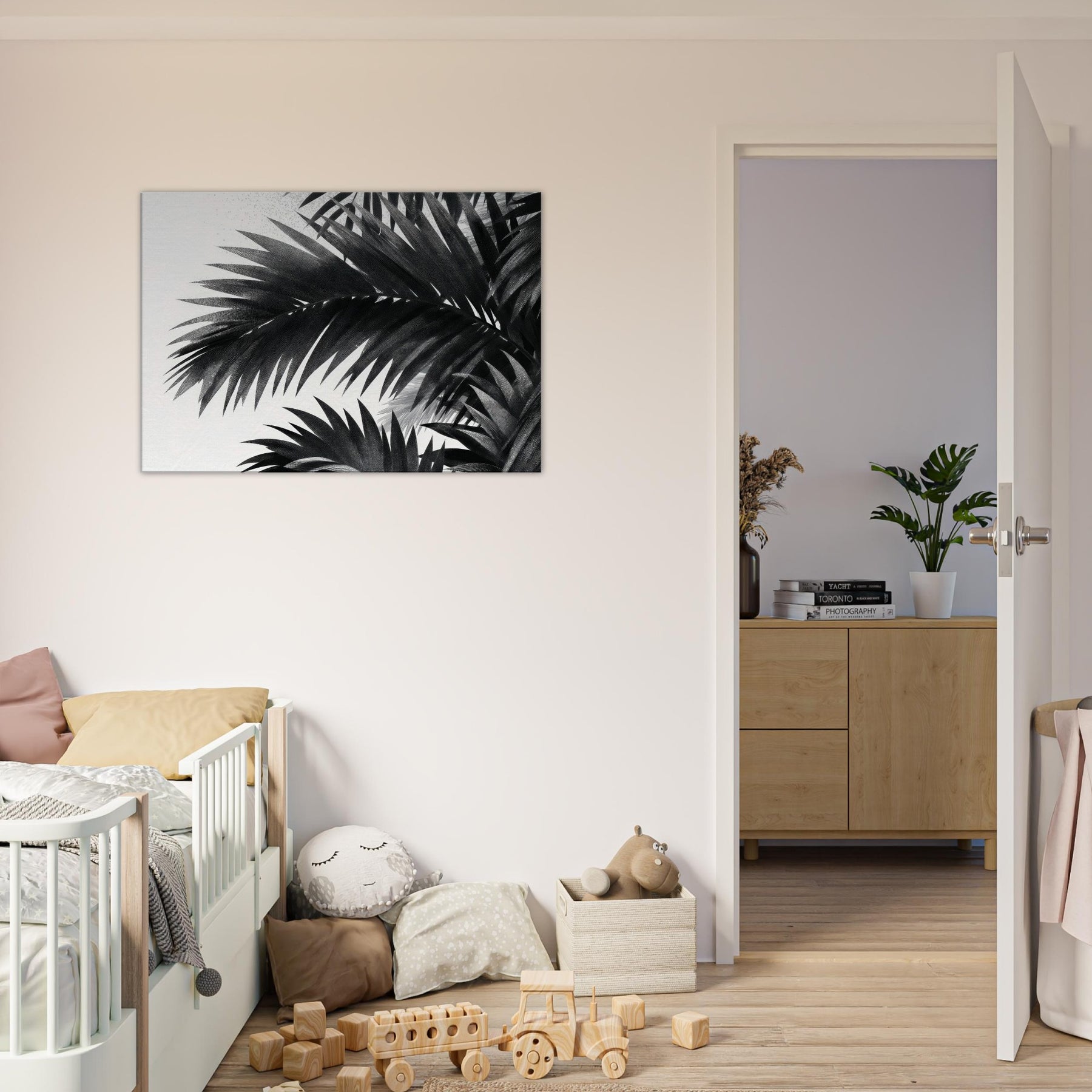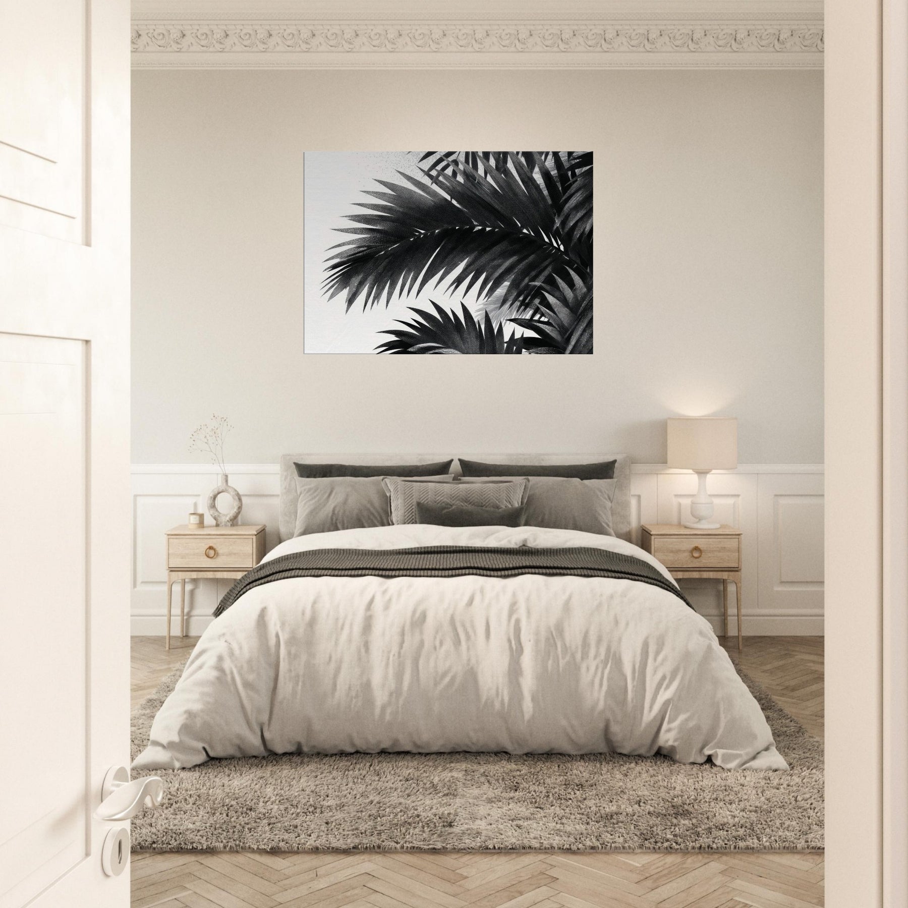 Palm Leaves drift in monochrome against a quiet field of white, a restrained ode to nature that calms the mind and sharpens the room’s atmosphere. This study of Palm Leaves feels modern yet timeless, offering high contrast detail that reveals texture in every leaf and a gentle rhythm that guides the eye. Hang it where light changes through the day to create shifting shadows, letting the artwork breathe with your space. It elevates living rooms, bedrooms, and foyers with elegant, cinematic presence.