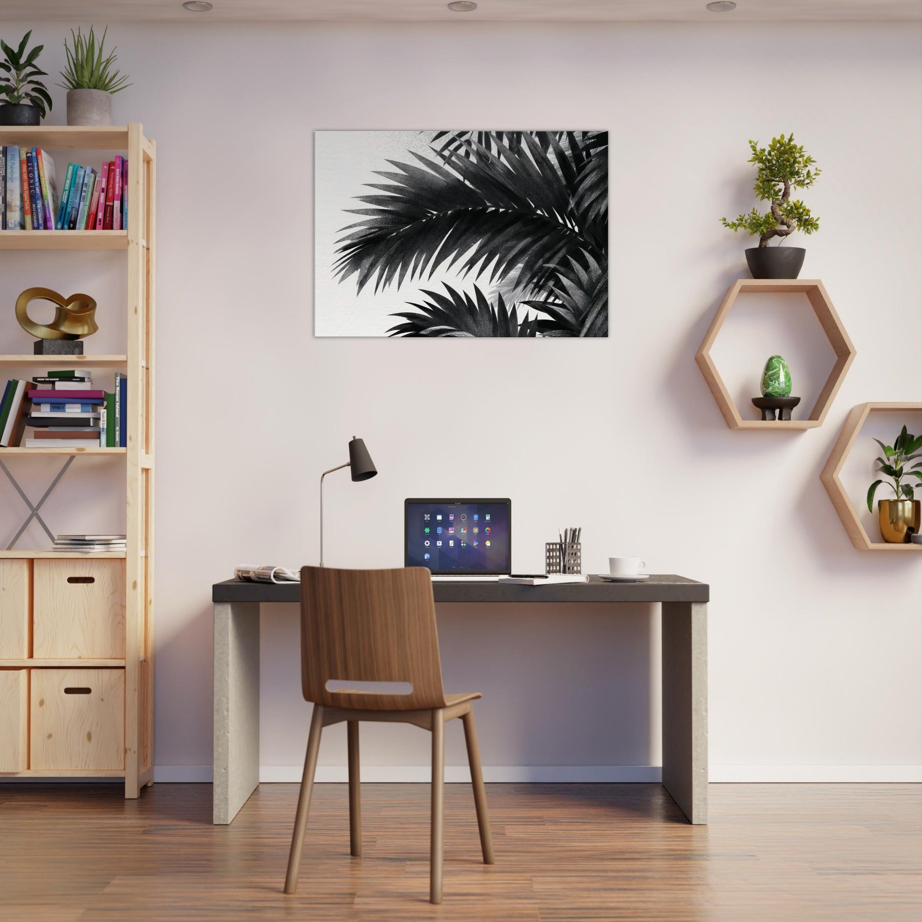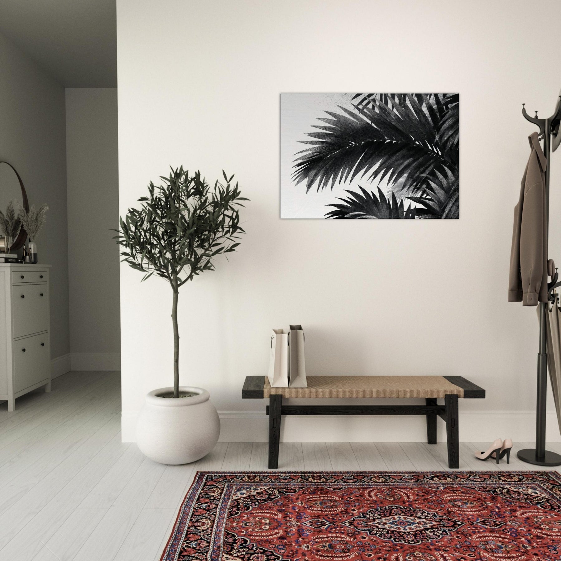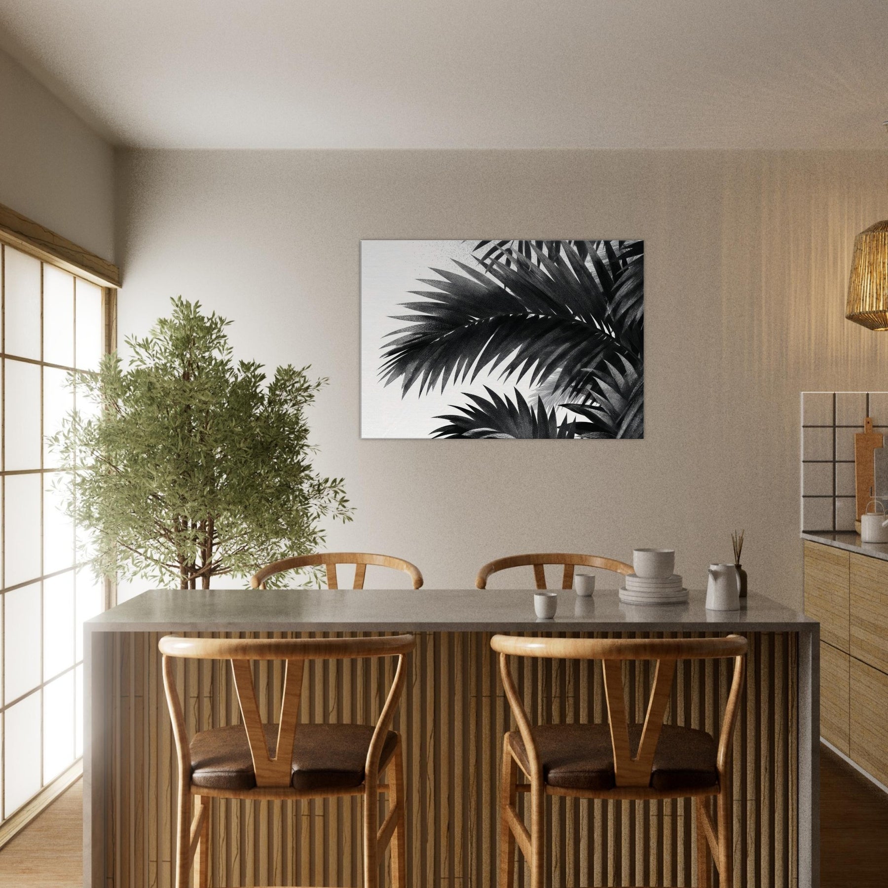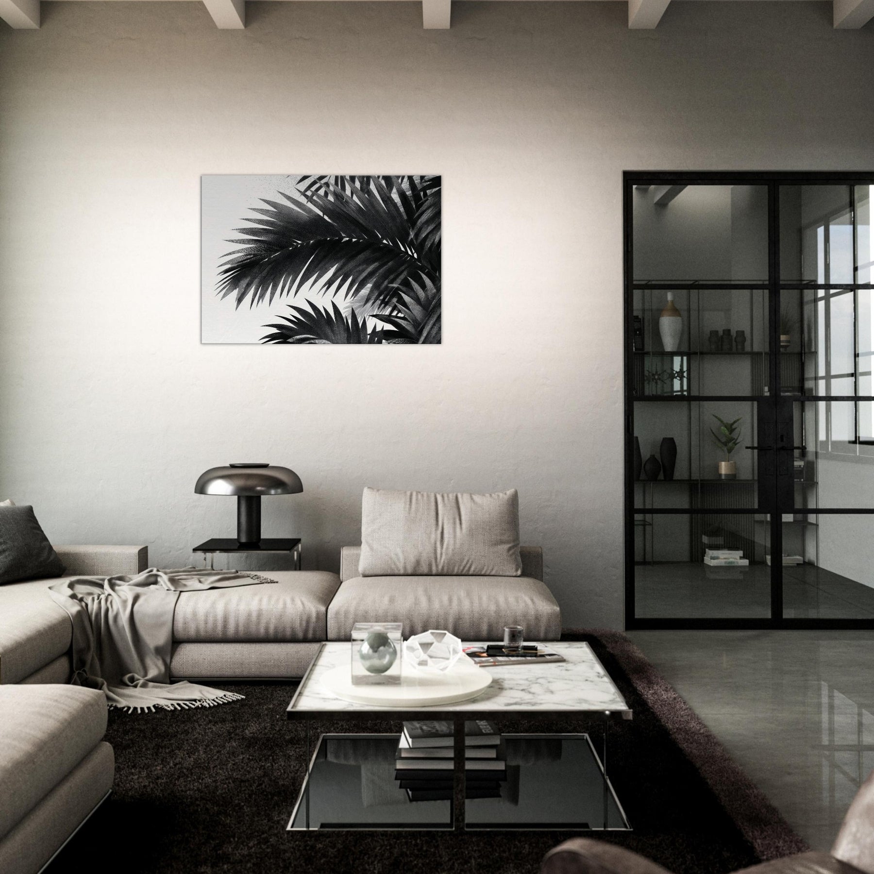 Palm Leaves drift in monochrome against a quiet field of white, a restrained ode to nature that calms the mind and sharpens the room’s atmosphere. This study of Palm Leaves feels modern yet timeless, offering high contrast detail that reveals texture in every leaf and a gentle rhythm that guides the eye. Hang it where light changes through the day to create shifting shadows, letting the artwork breathe with your space. It elevates living rooms, bedrooms, and foyers with elegant, cinematic presence.
