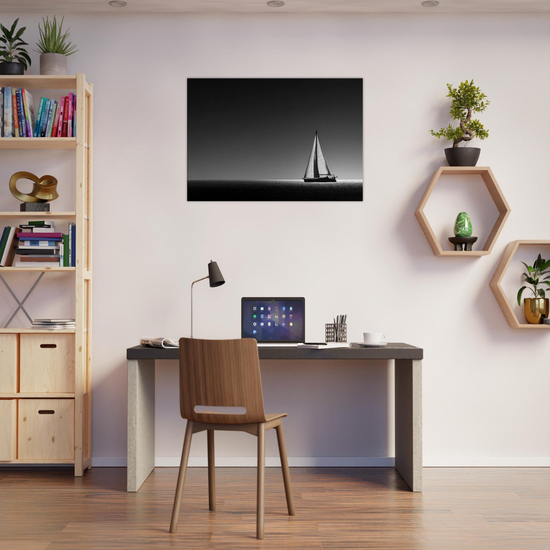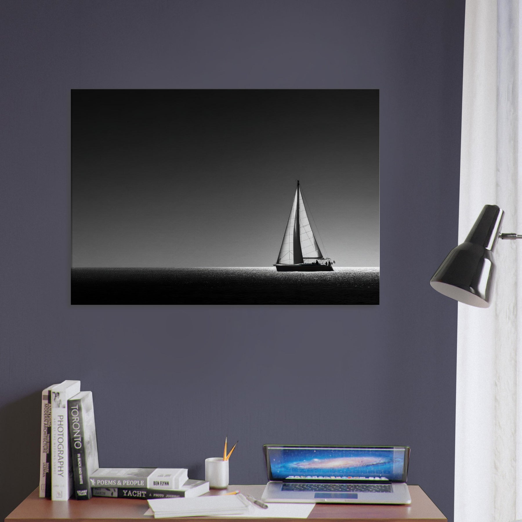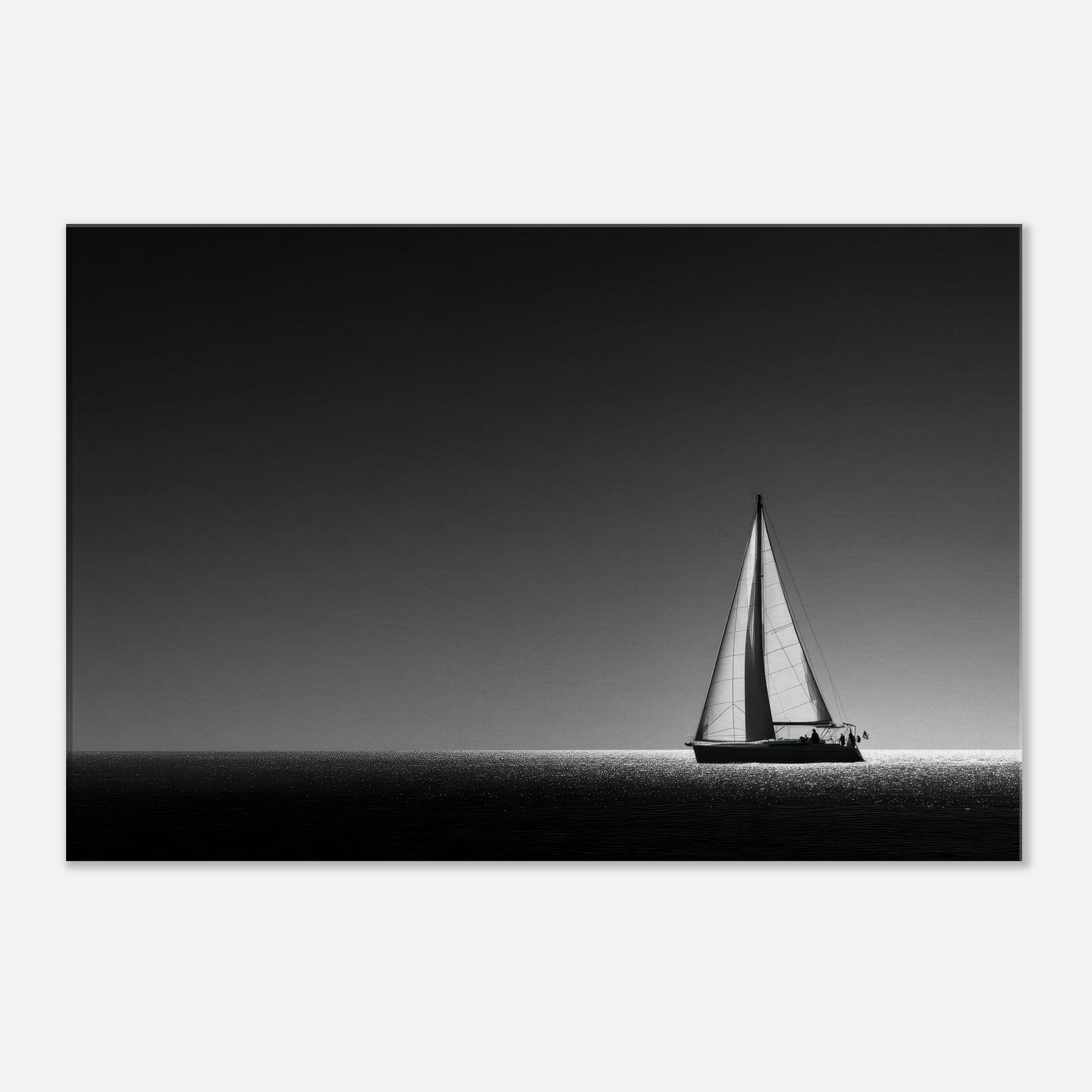 Bathed in black and white, this Sailboat Silhouette glides across a luminous horizon, a quiet ode to solitude and timeless evenings. The stark contrast of sail and sea invites the eye to drift where water catches light like a mosaic of diamonds. Hang it in a living room or bedroom to soften sharp angles with maritime calm, letting the scene anchor conversations and slow your breath with the gentleness of wind and water.