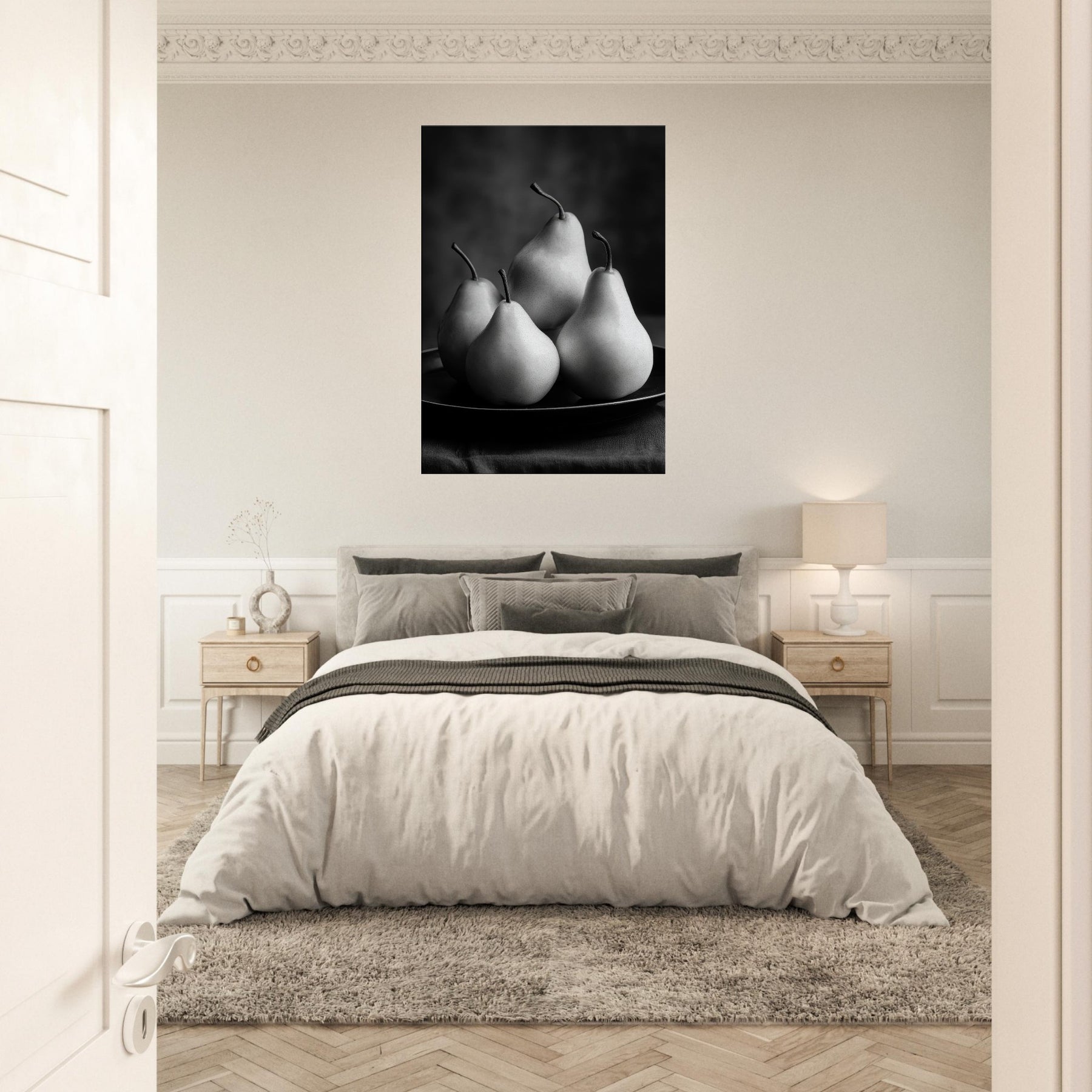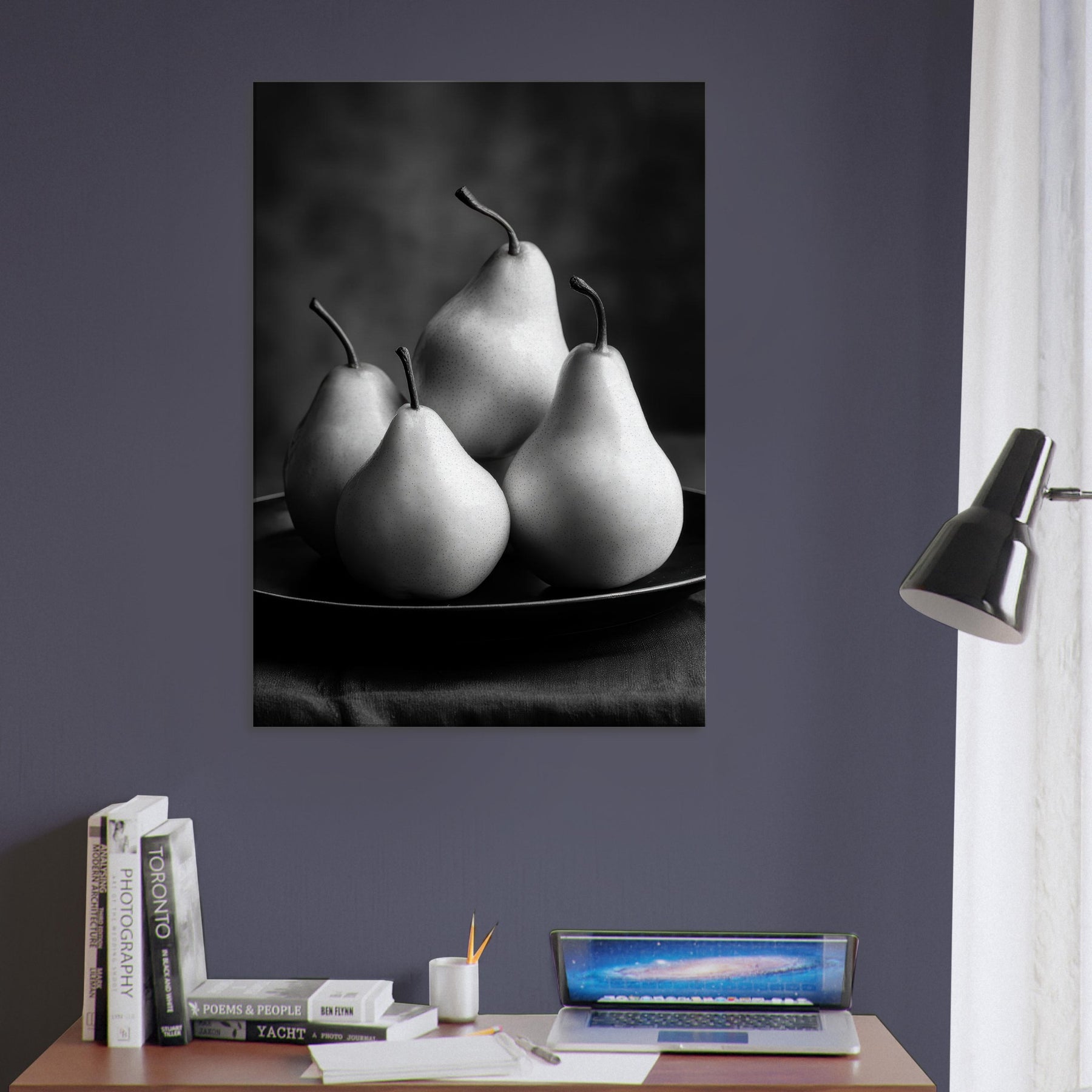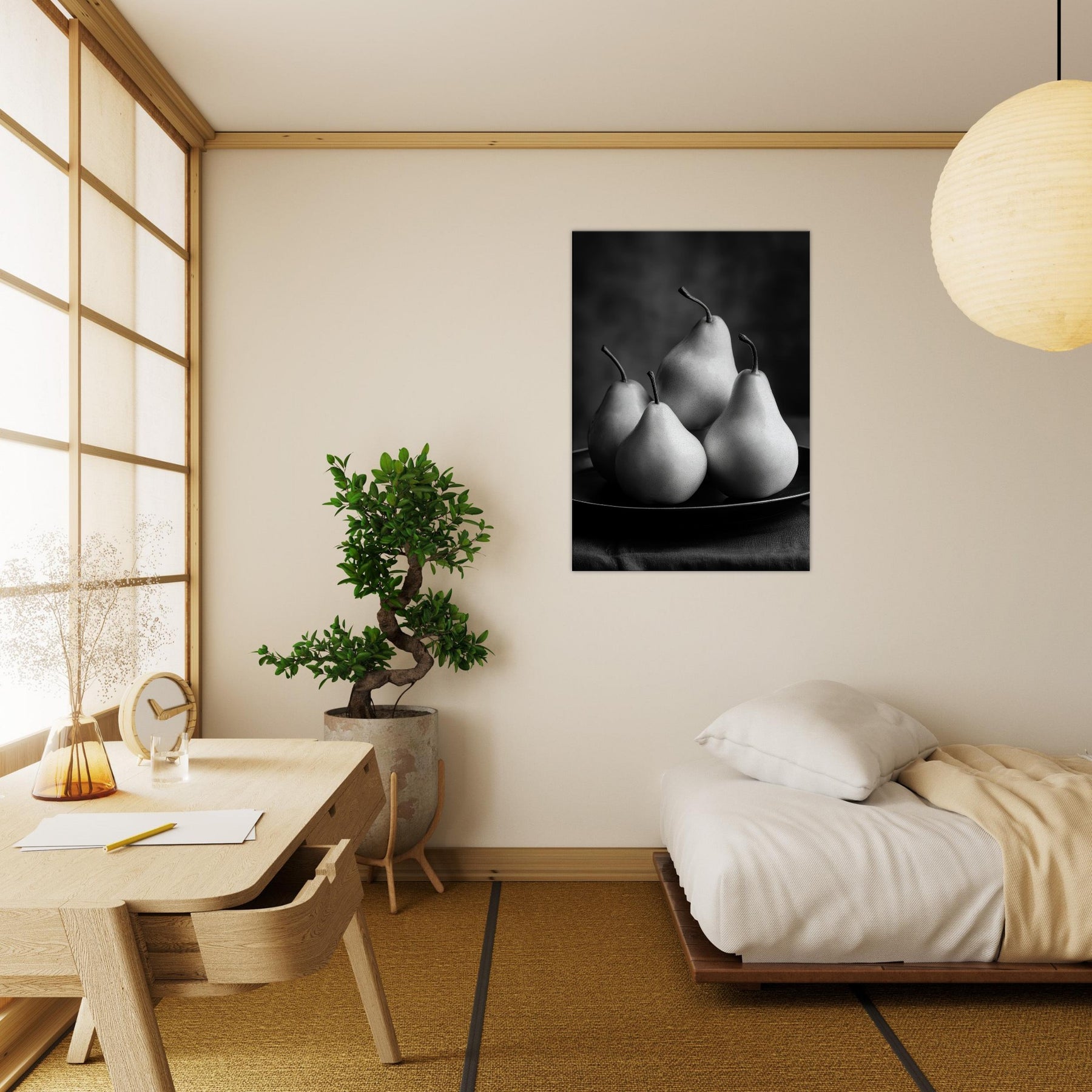 Shaded in black and white, these Pears On Plate rise with quiet presence, a still life that breathes restraint and refinement. The curved forms and subtle speckling invite touch, while the plate anchors the scene in calm symmetry. This artwork brings a sense of everyday poetry to a living room or dining nook, its shadow play and tactile textures lending warmth without color. Perfect for modern interiors seeking timeless grace, it pairs with minimal furniture and soft lighting to create a serene, gallery like atmosphere.