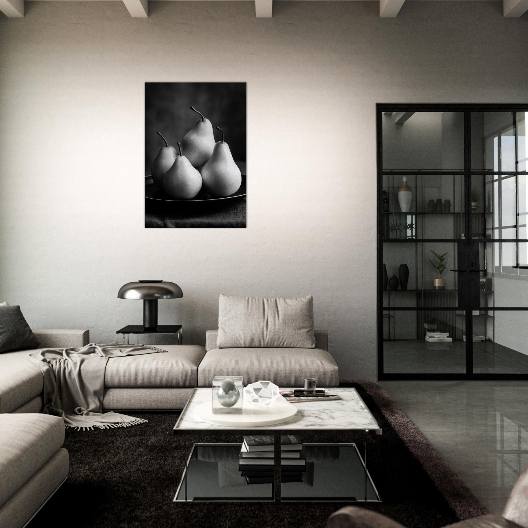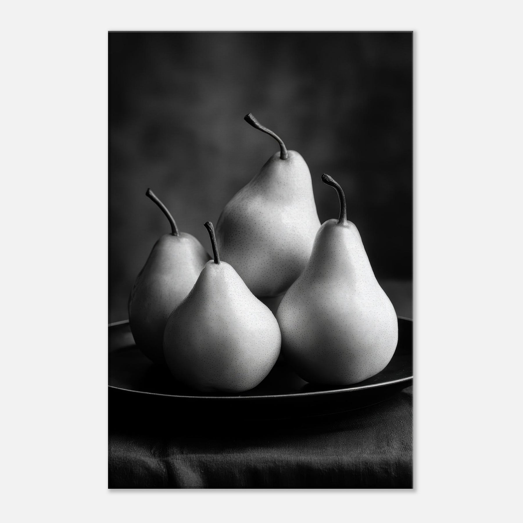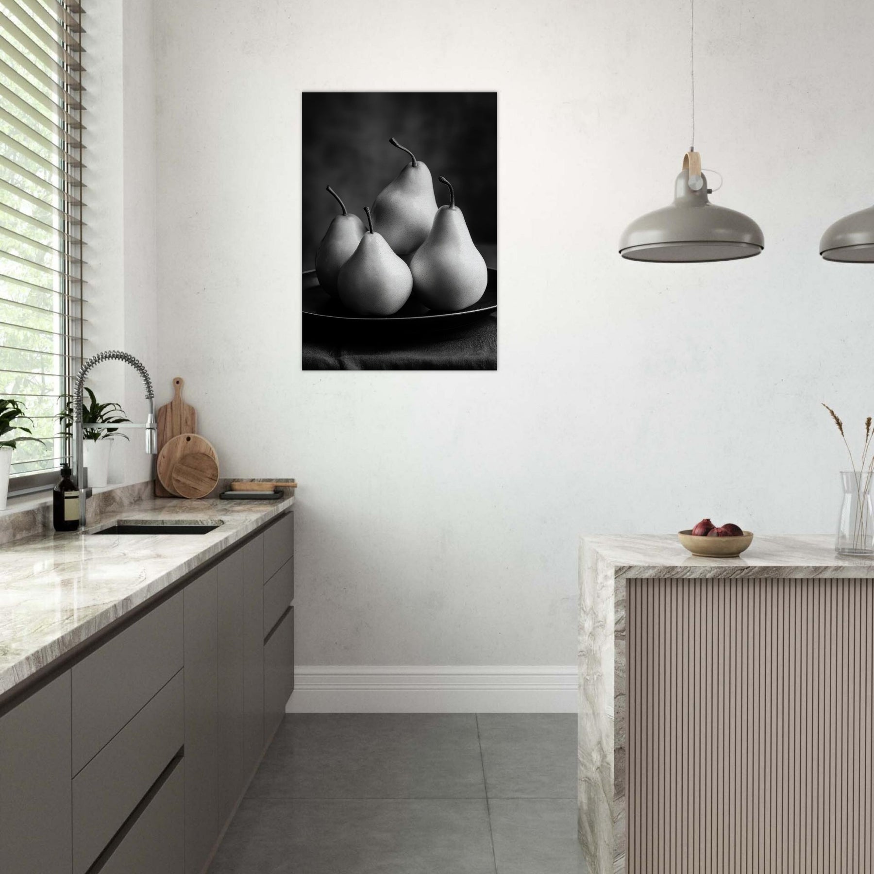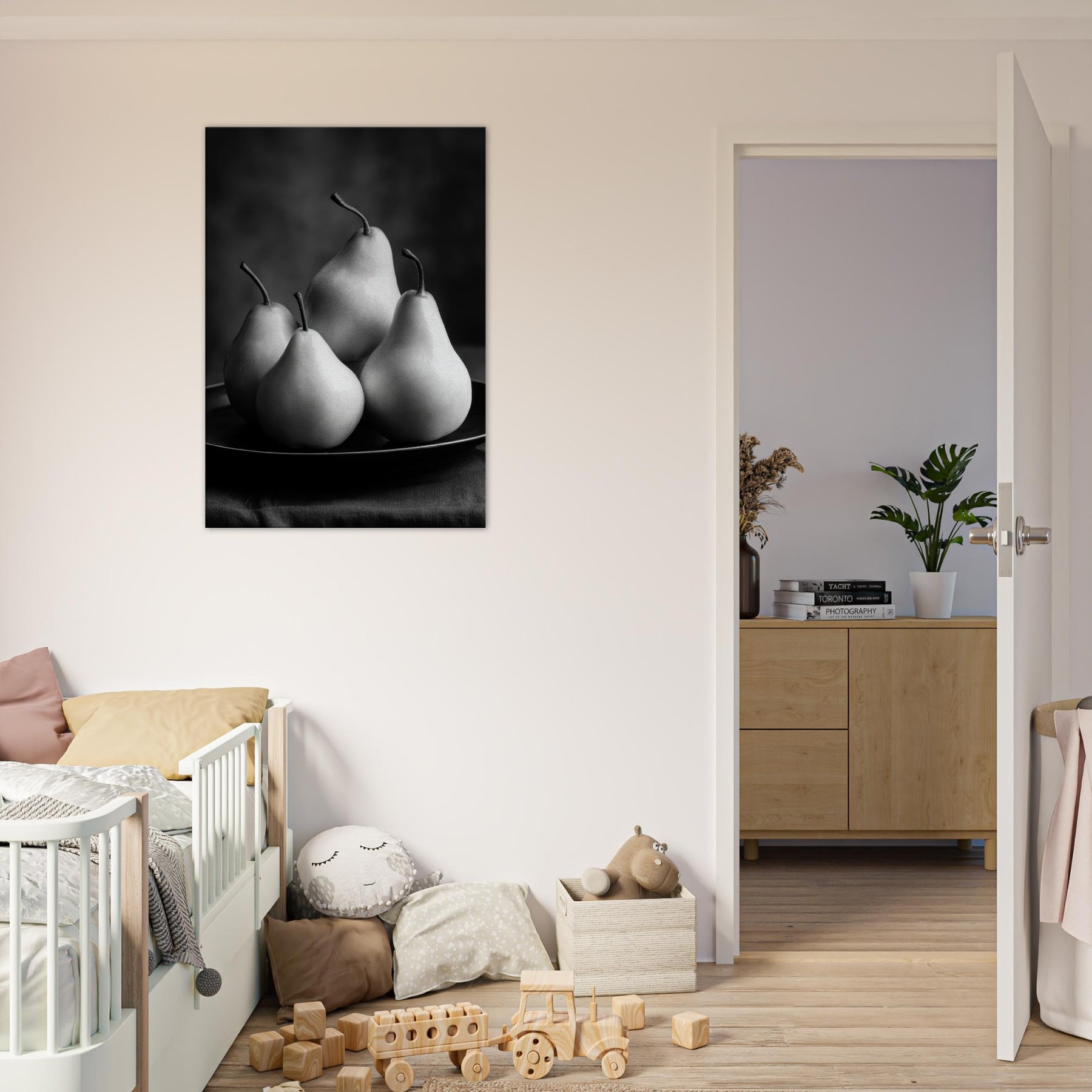 Shaded in black and white, these Pears On Plate rise with quiet presence, a still life that breathes restraint and refinement. The curved forms and subtle speckling invite touch, while the plate anchors the scene in calm symmetry. This artwork brings a sense of everyday poetry to a living room or dining nook, its shadow play and tactile textures lending warmth without color. Perfect for modern interiors seeking timeless grace, it pairs with minimal furniture and soft lighting to create a serene, gallery like atmosphere.